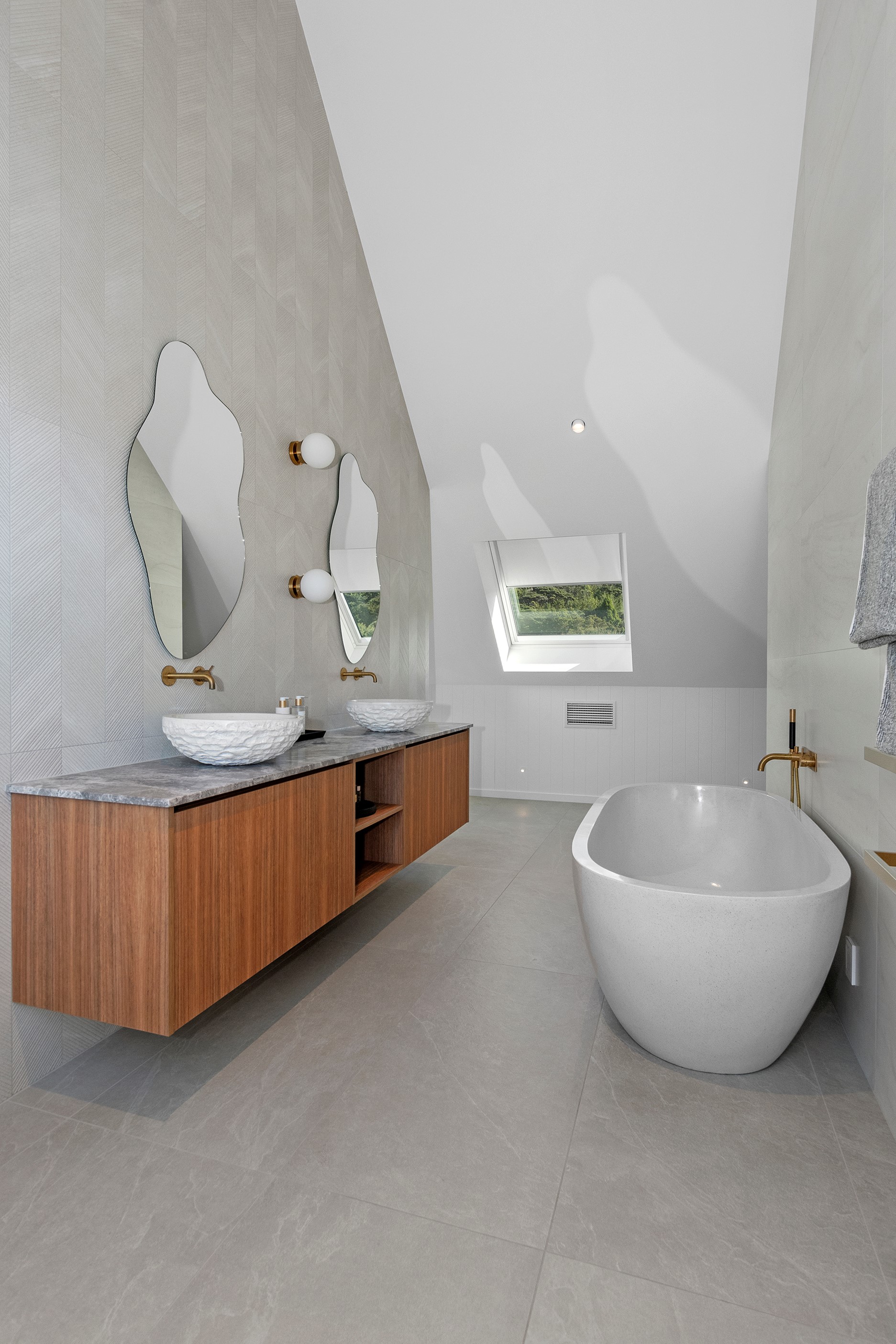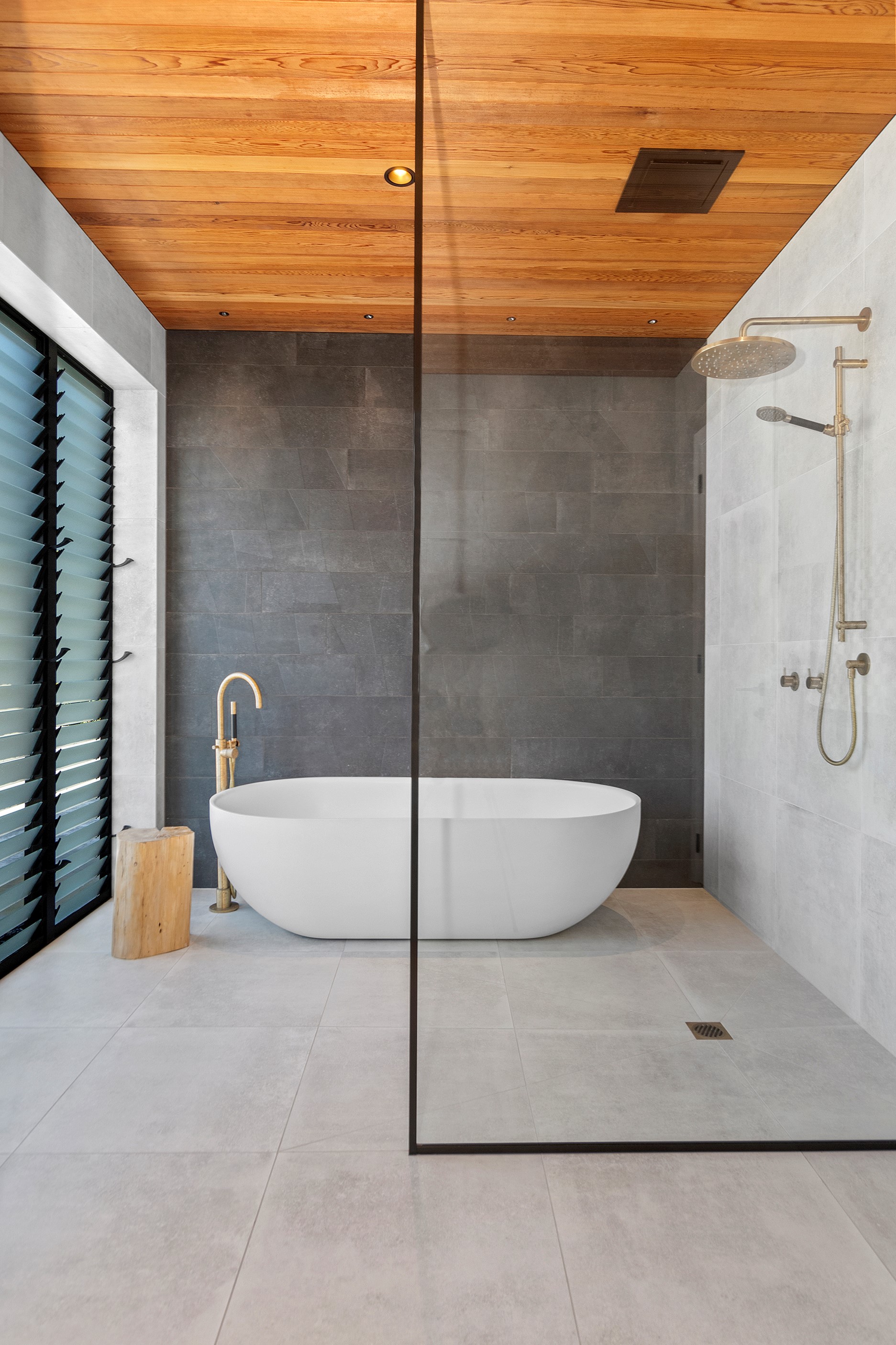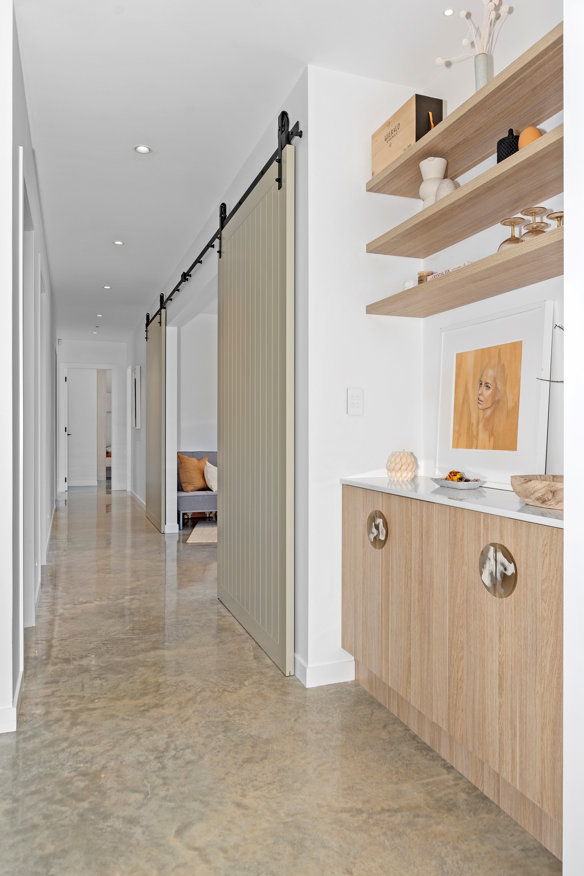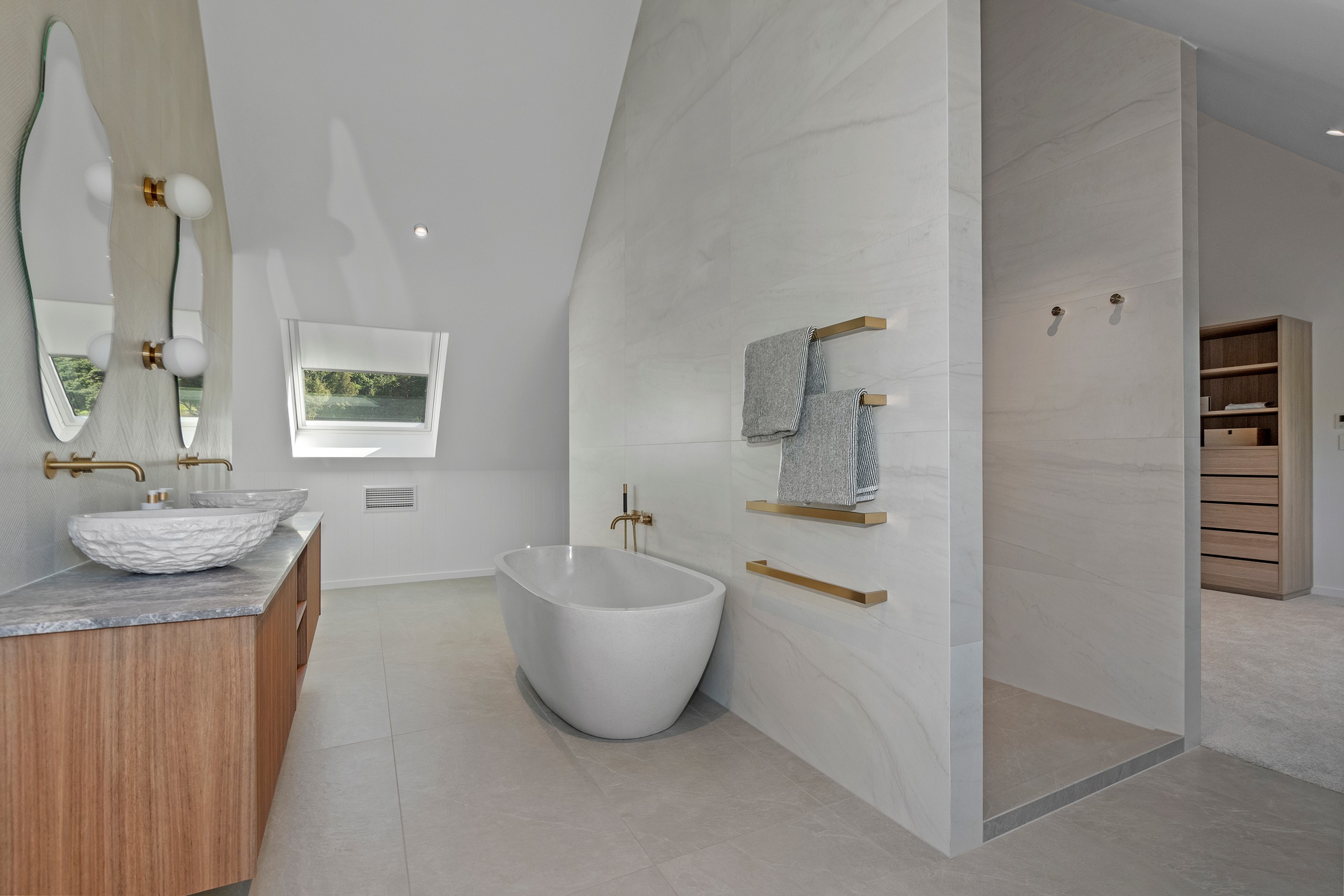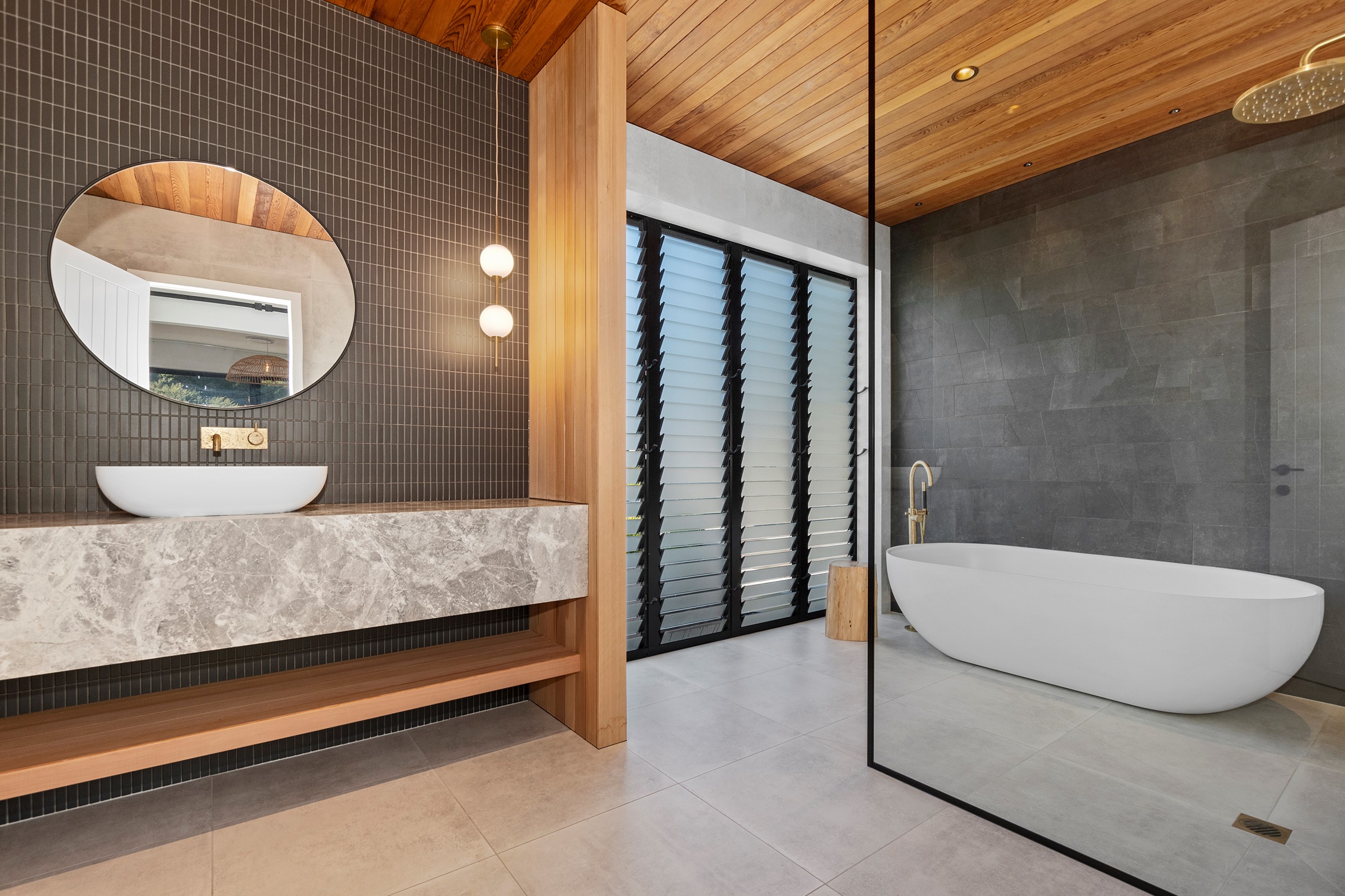 If ever a home demonstrated spare, restrained elegance this is it. A pure form and clean lines are hallmarks of this contemporary barn-style home. Stretching out long on a semi-rural site, the 400sqm five-bedroom builder’s house is cutting-edge and filled with luxury comforts. Lying between the bush line and Mangawhai Heads, the house is clad in dark weatherboards and the covered entertaining area is trimmed with vertical cedar. The hardwood decking, which flanks the majority of the house, and golden cedar are wonderful counterpoints to the almost all-black structure. Skylights punctuate the dark steel roof, bringing in an abundance of natural light. On the ground floor, ceilings in the living area soar to trace the 45-degree roofline. The main-bedroom suite, which has its own balcony, occupies most of the upstairs level. It’s a lovely sanctuary. Bedrooms and bathrooms– there are four – are split between the levels. An L-shaped living space flows naturally from the kitchen to the dining and lounge areas, and then out to the covered deck. This home has everything needed for family life, and never deviates from being a showcase for craftsmanship and sublime pared-back style.