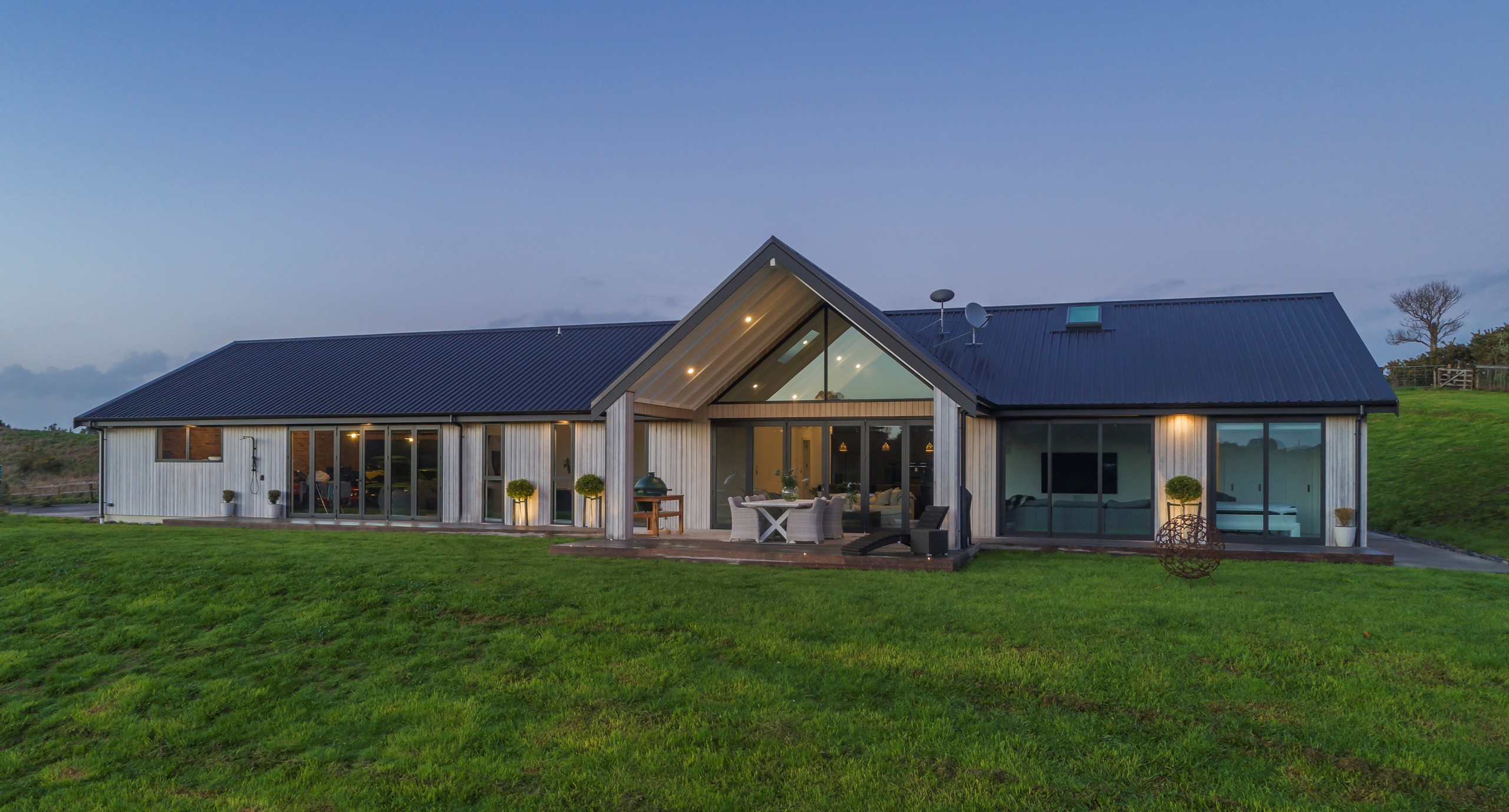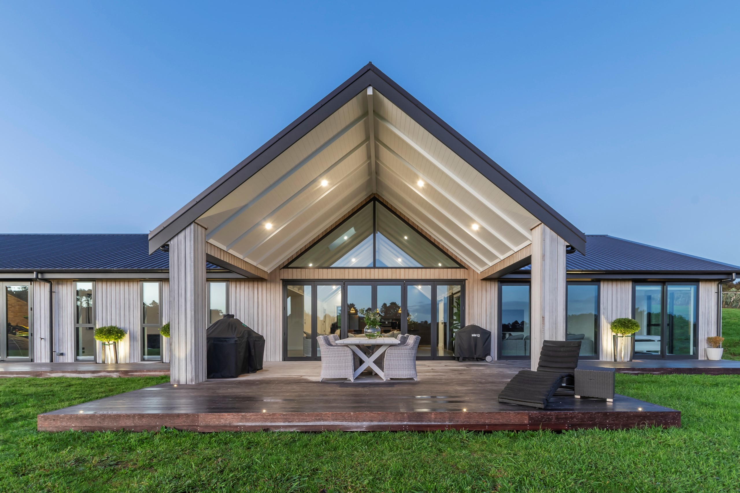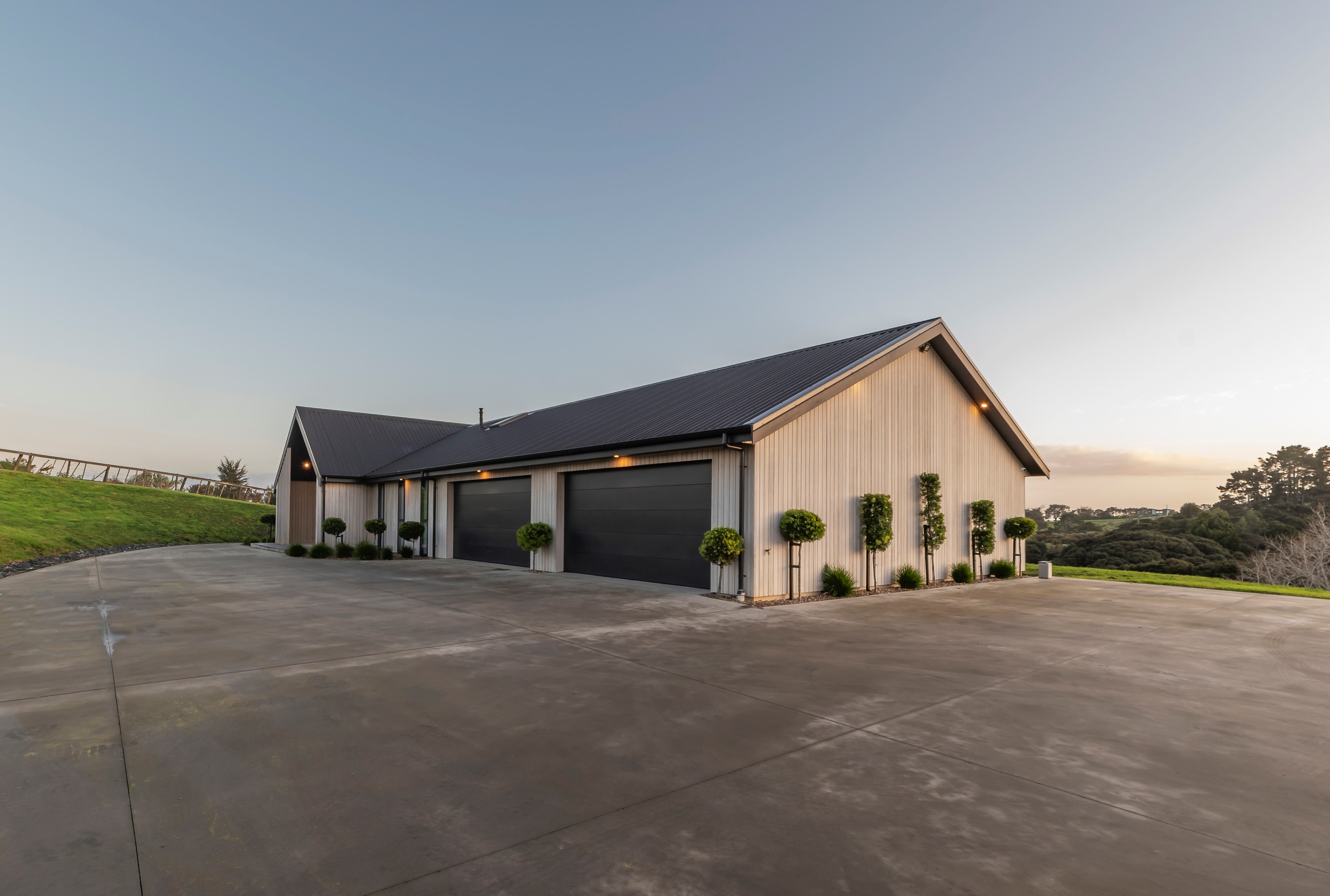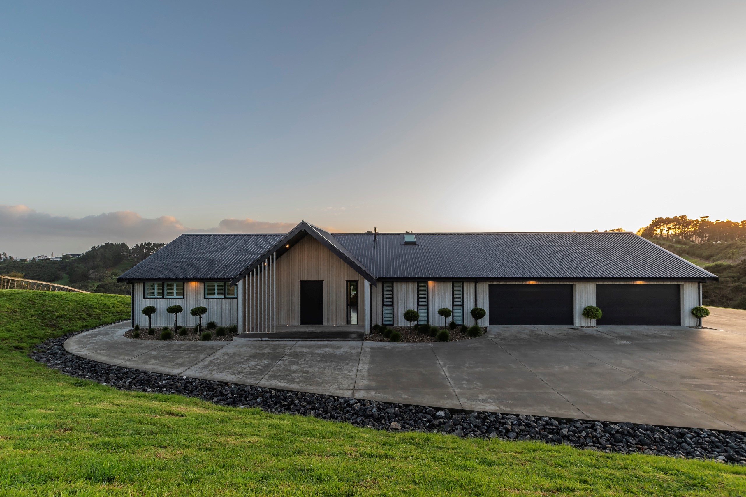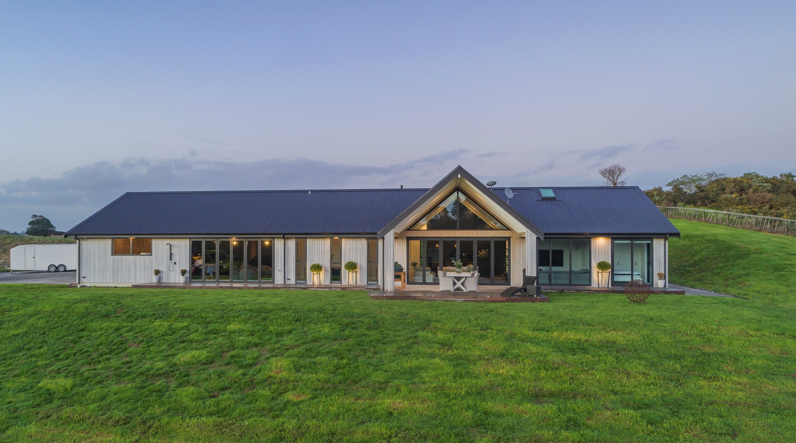 Contemporary materials are combined skillfully in this home that sprawls over its elevated rural site. Pale tones in the vertical timber are offset with black steel roofing, creating striking contrasts amid the lush, shades-of-green surrounds. The centre of the house is a showcase of impressive proportions, with a double-height living area and 2.7m stud height elsewhere. Automated skylights and feature glass enhance the feeling of light and space. Oversized custom architraves and skirting, and decorative raked ceilings add a warm and welcoming country feel to the interior. This four-bedroom, 385sqm home is designed to bring a busy family together – and to give them plenty of their own space. Each bedroom is generous and well-appointed, and the main-bedroom suite is a private escape with country-style timber detailing and a luxurious ensuite. Entertaining spaces have been created throughout the home – open-plan living flows onto a covered deck and into a separate media lounge. Four-car garaging and an impressive workshop top off this spacious, splendid country home.