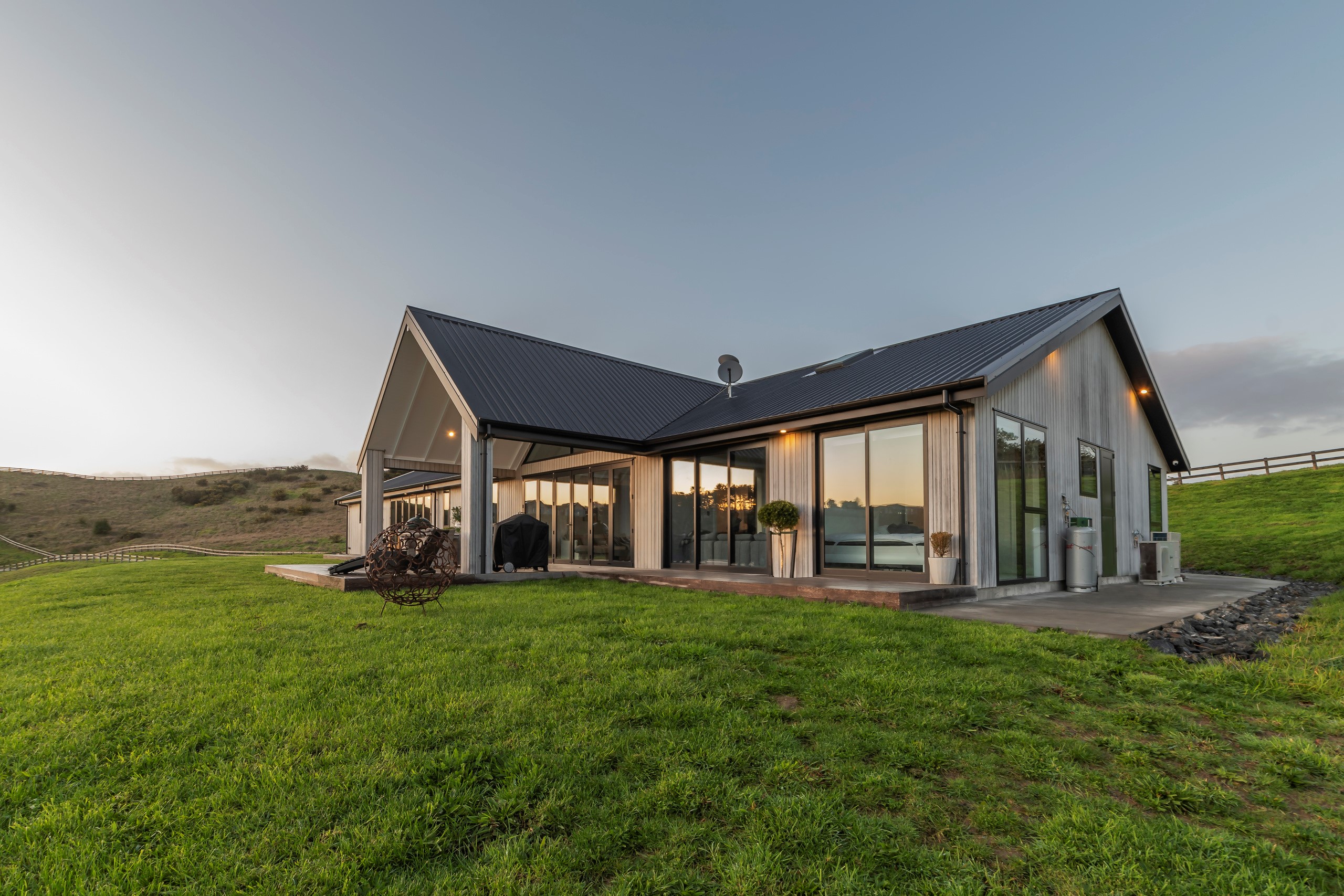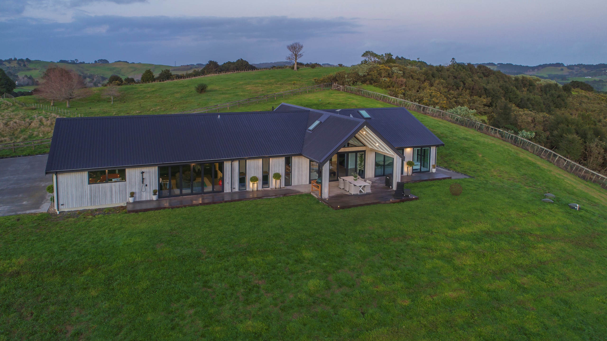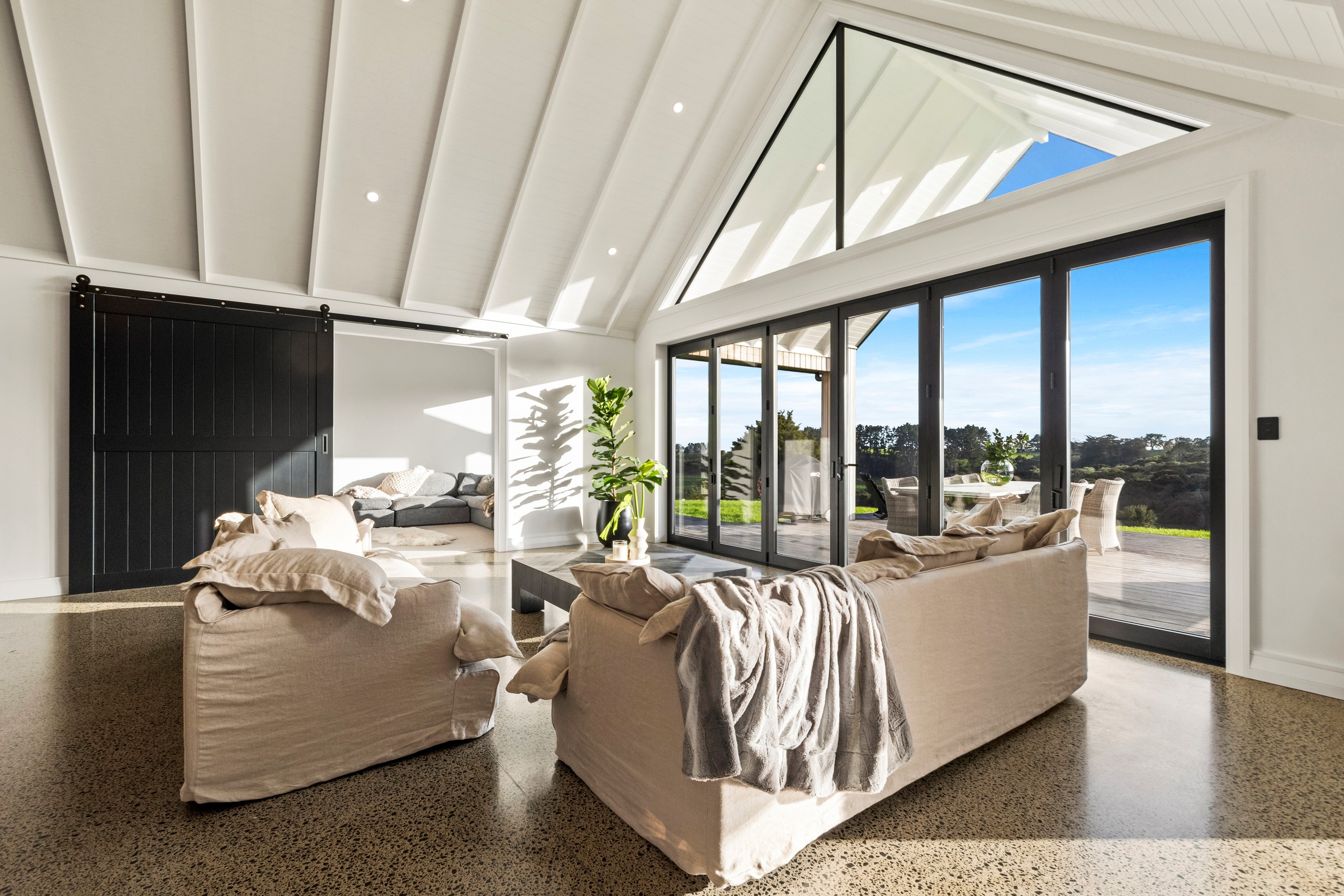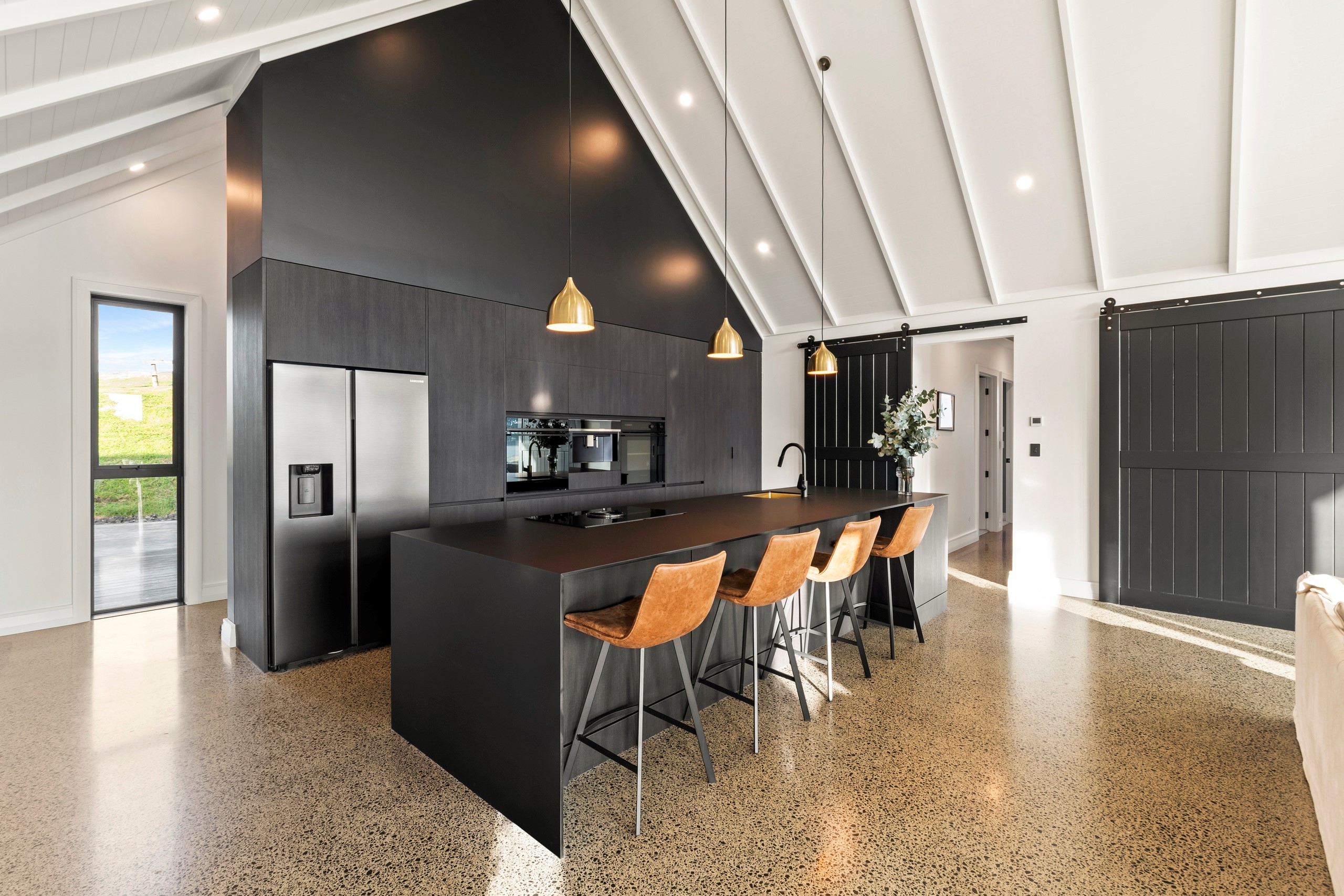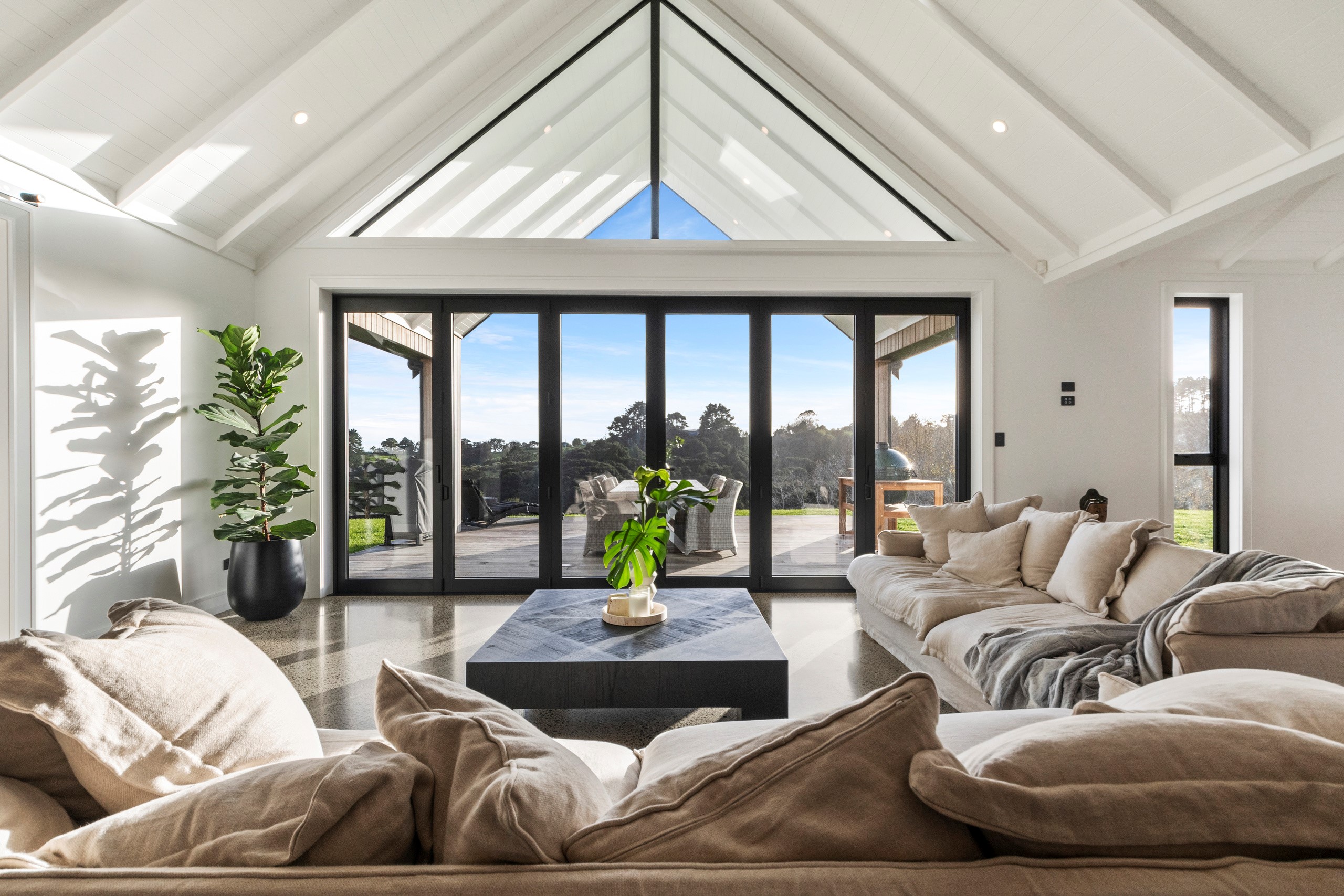 Contemporary materials are combined skillfully in this home that sprawls over its elevated rural site. Pale tones in the vertical timber are offset with black steel roofing, creating striking contrasts amid the lush, shades-of-green surrounds. The centre of the house is a showcase of impressive proportions, with a double-height living area and 2.7m stud height elsewhere. Automated skylights and feature glass enhance the feeling of light and space. Oversized custom architraves and skirting, and decorative raked ceilings add a warm and welcoming country feel to the interior. This four-bedroom, 385sqm home is designed to bring a busy family together – and to give them plenty of their own space. Each bedroom is generous and well-appointed, and the main-bedroom suite is a private escape with country-style timber detailing and a luxurious ensuite. Entertaining spaces have been created throughout the home – open-plan living flows onto a covered deck and into a separate media lounge. Four-car garaging and an impressive workshop top off this spacious, splendid country home.
