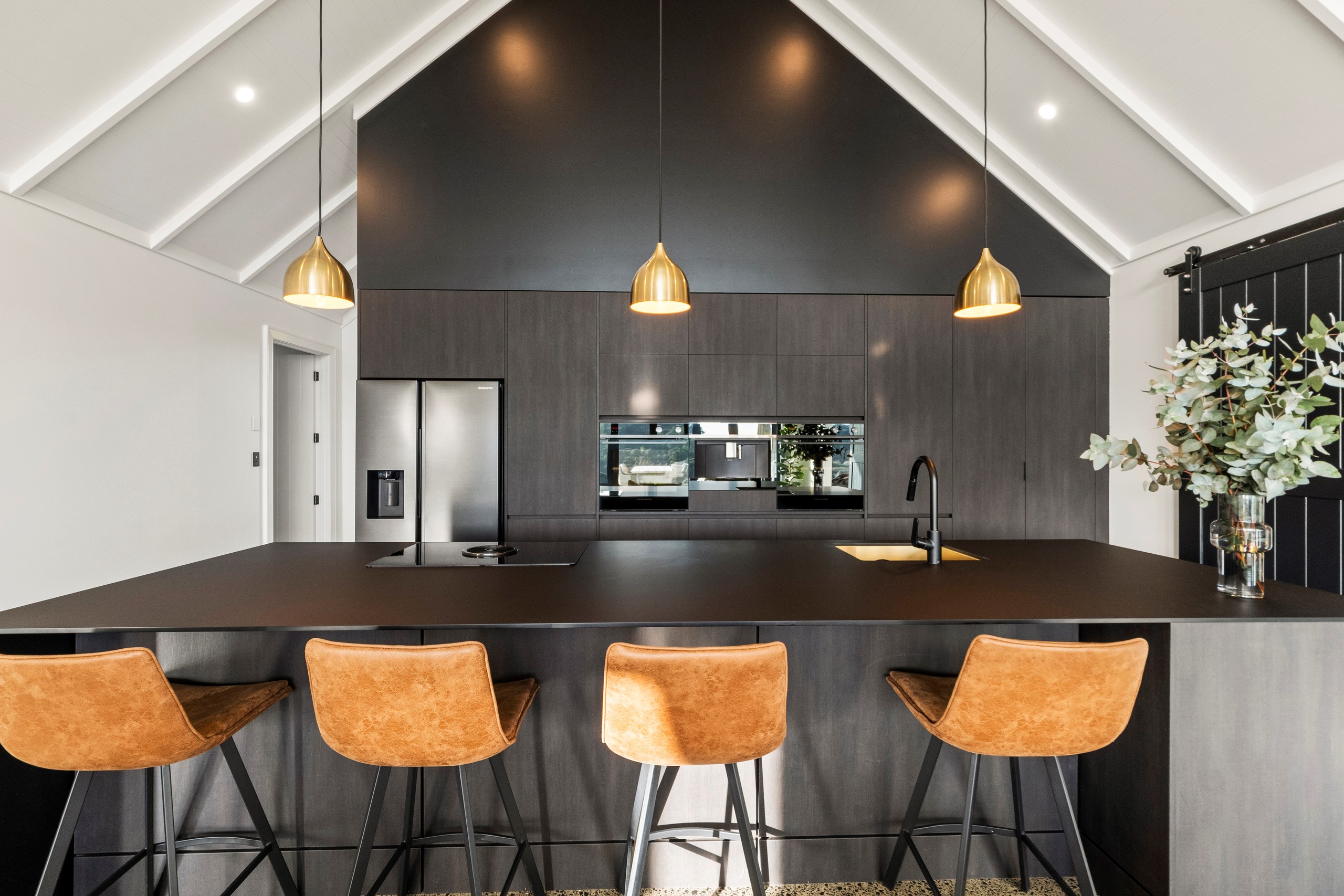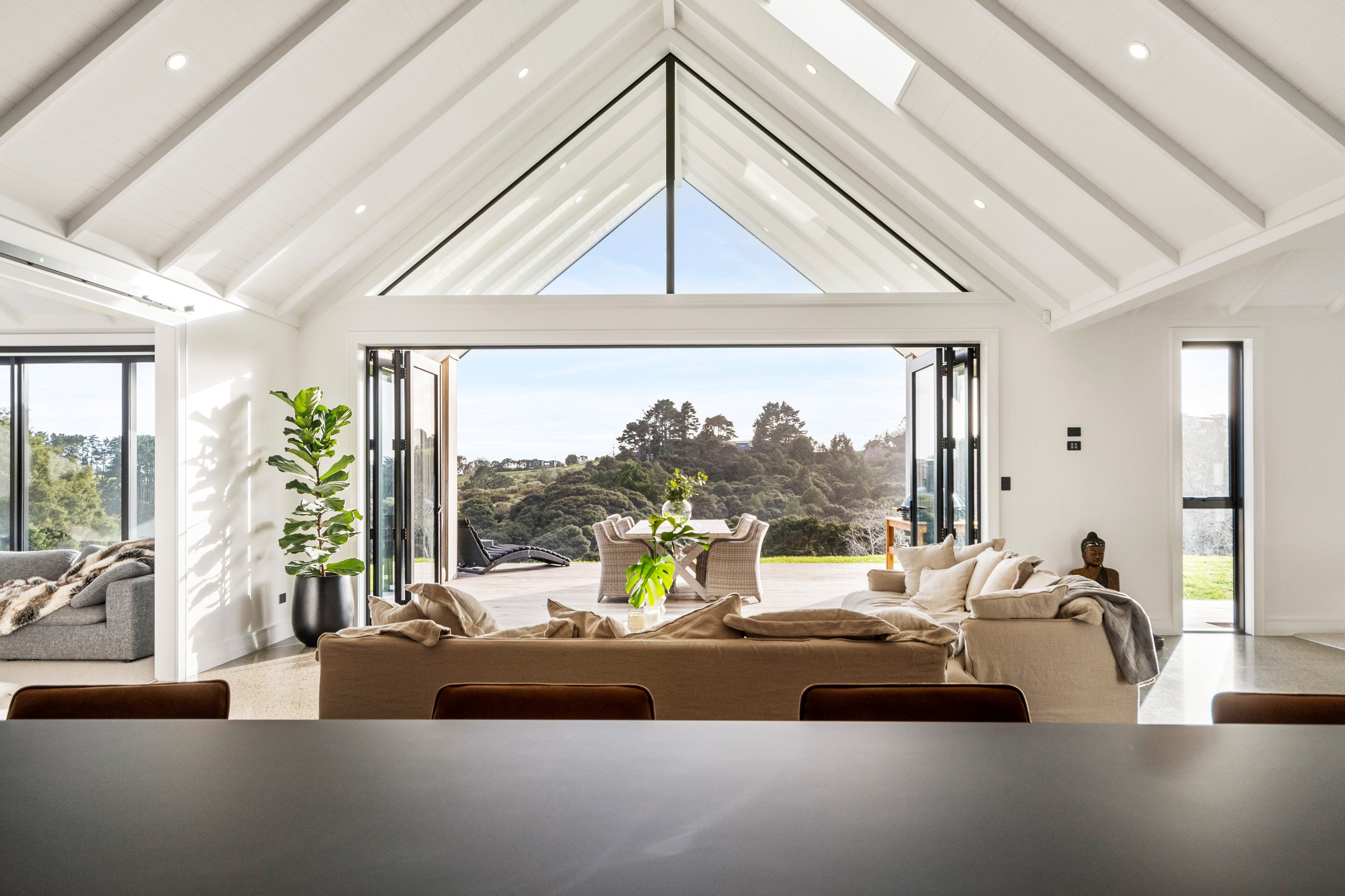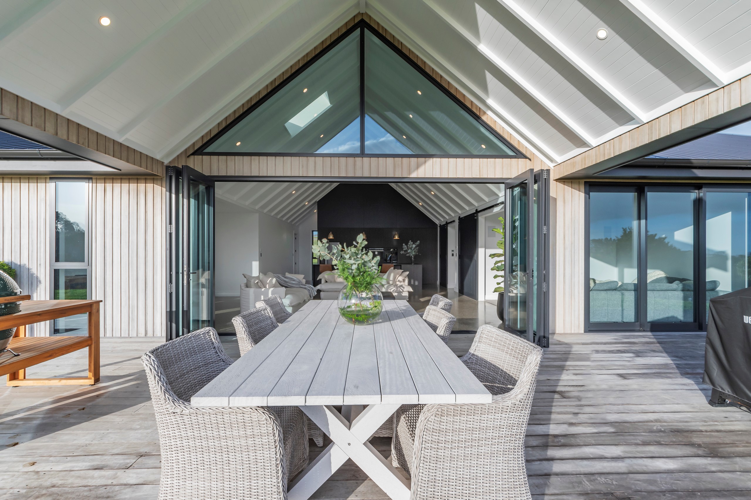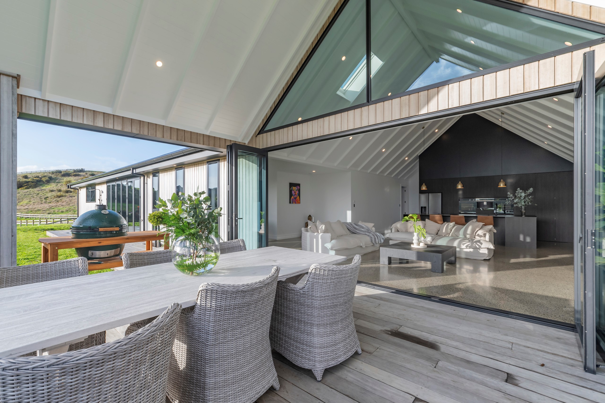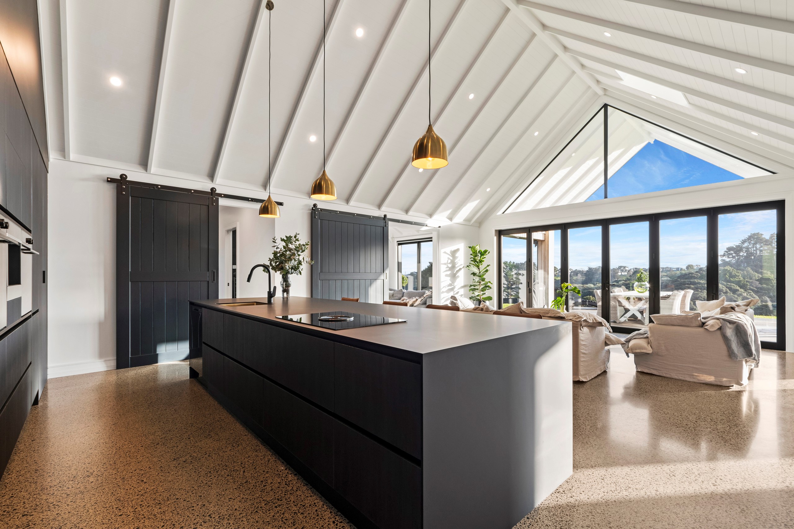 Contemporary materials are combined skillfully in this home that sprawls over its elevated rural site. Pale tones in the vertical timber are offset with black steel roofing, creating striking contrasts amid the lush, shades-of-green surrounds. The centre of the house is a showcase of impressive proportions, with a double-height living area and 2.7m stud height elsewhere. Automated skylights and feature glass enhance the feeling of light and space. Oversized custom architraves and skirting, and decorative raked ceilings add a warm and welcoming country feel to the interior. This four-bedroom, 385sqm home is designed to bring a busy family together – and to give them plenty of their own space. Each bedroom is generous and well-appointed, and the main-bedroom suite is a private escape with country-style timber detailing and a luxurious ensuite. Entertaining spaces have been created throughout the home – open-plan living flows onto a covered deck and into a separate media lounge. Four-car garaging and an impressive workshop top off this spacious, splendid country home.
