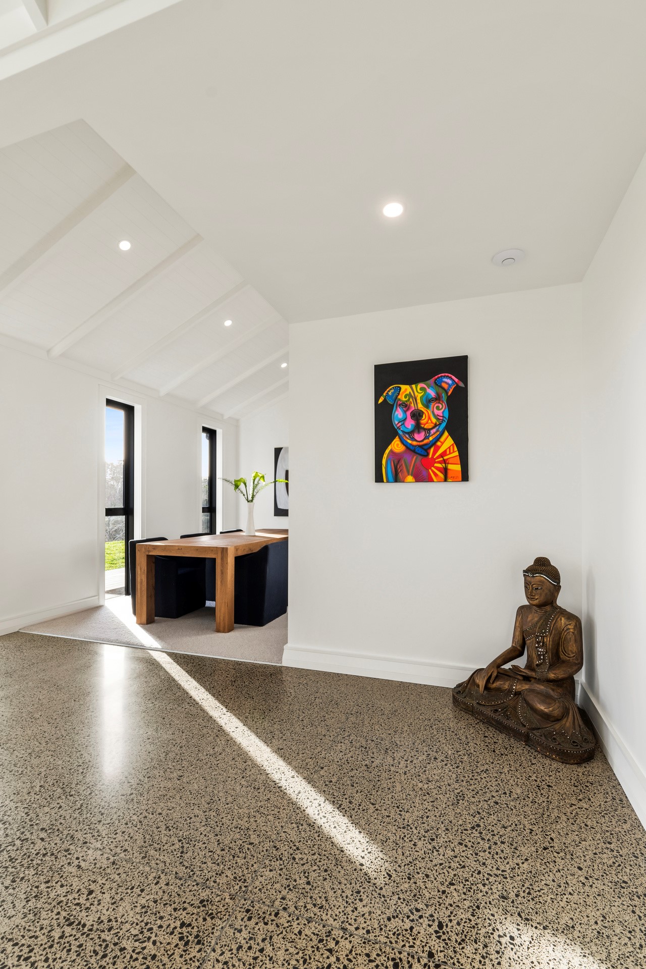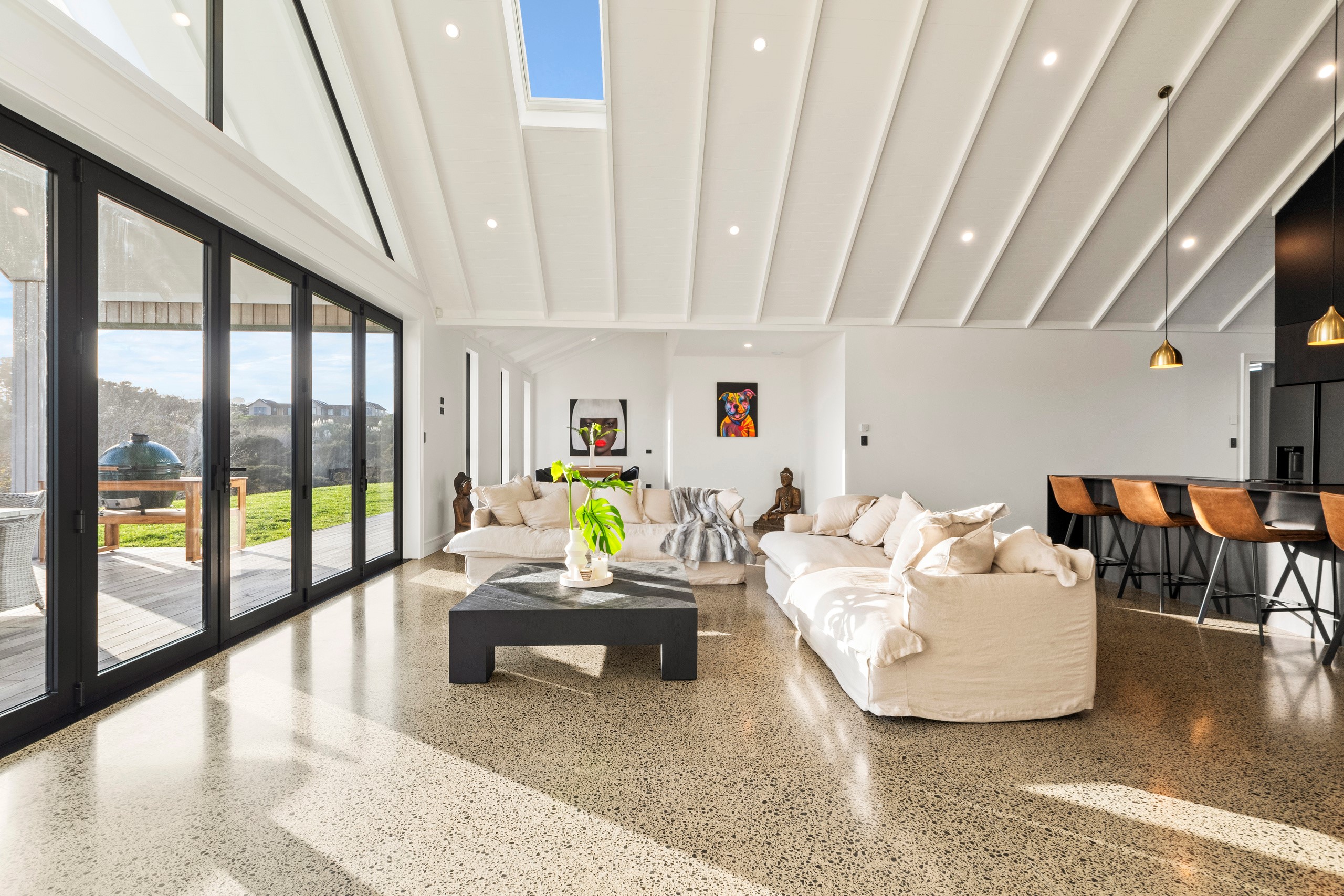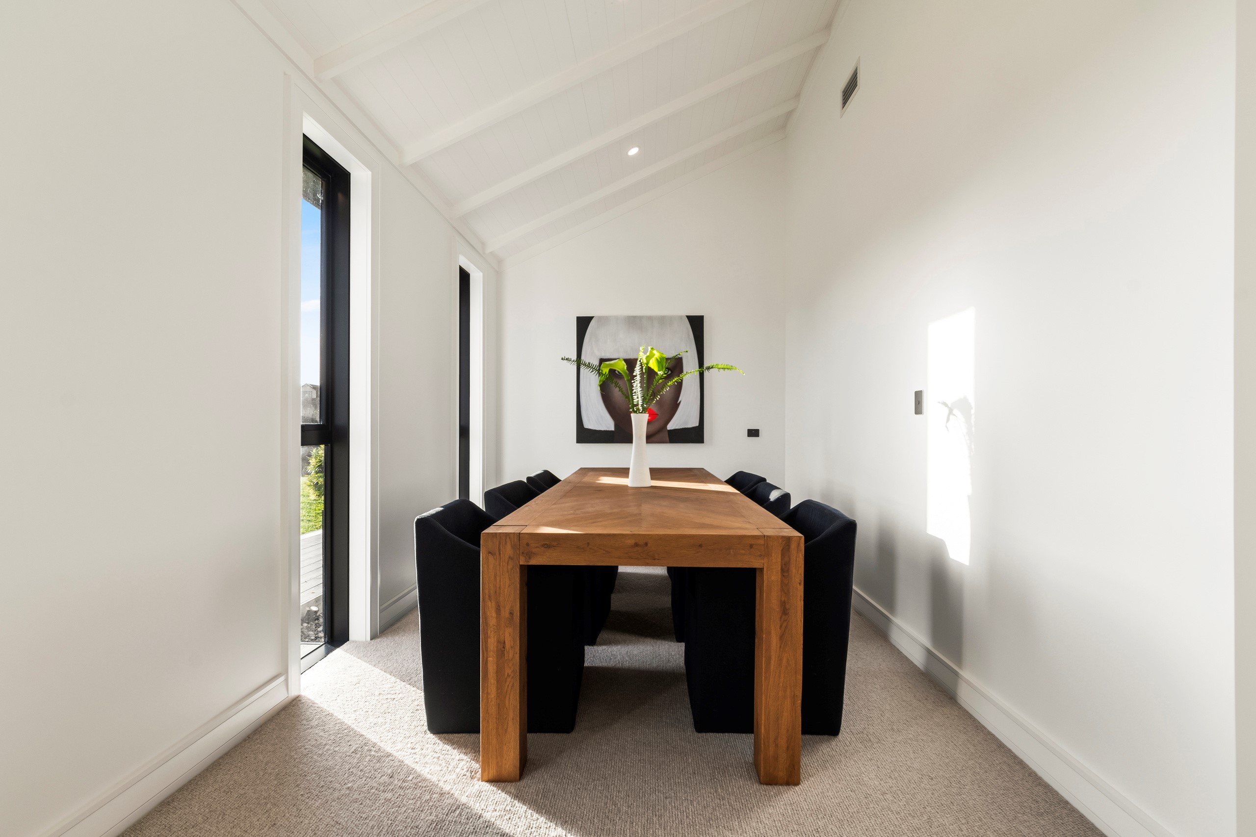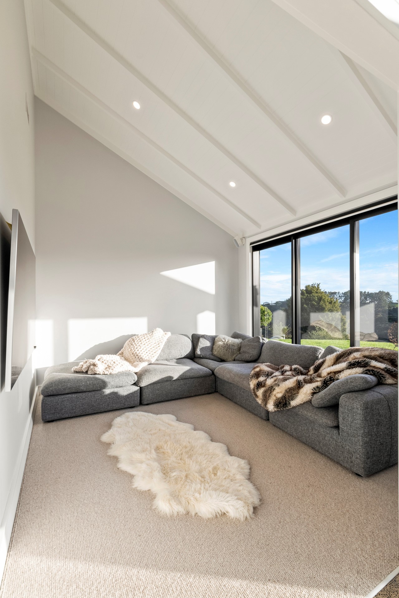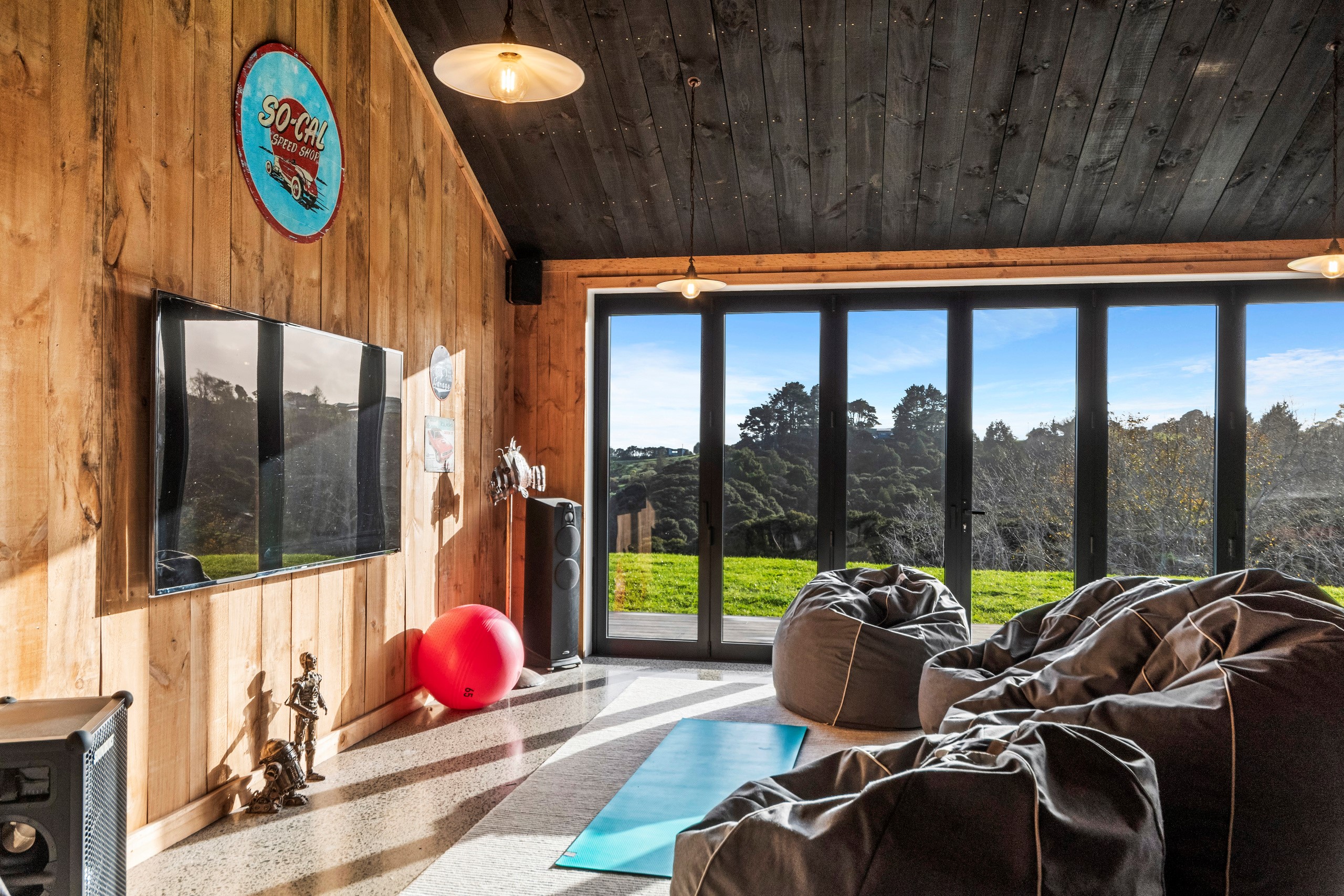Contemporary materials are combined skillfully in this home that sprawls over its elevated rural site. Pale tones in the vertical timber are offset with black steel roofing, creating striking contrasts amid the lush, shades-of-green surrounds. The centre of the house is a showcase of impressive proportions, with a double-height living area and 2.7m stud height elsewhere. Automated skylights and feature glass enhance the feeling of light and space. Oversized custom architraves and skirting, and decorative raked ceilings add a warm and welcoming country feel to the interior. This four-bedroom, 385sqm home is designed to bring a busy family together – and to give them plenty of their own space. Each bedroom is generous and well-appointed, and the main-bedroom suite is a private escape with country-style timber detailing and a luxurious ensuite. Entertaining spaces have been created throughout the home – open-plan living flows onto a covered deck and into a separate media lounge. Four-car garaging and an impressive workshop top off this spacious, splendid country home.