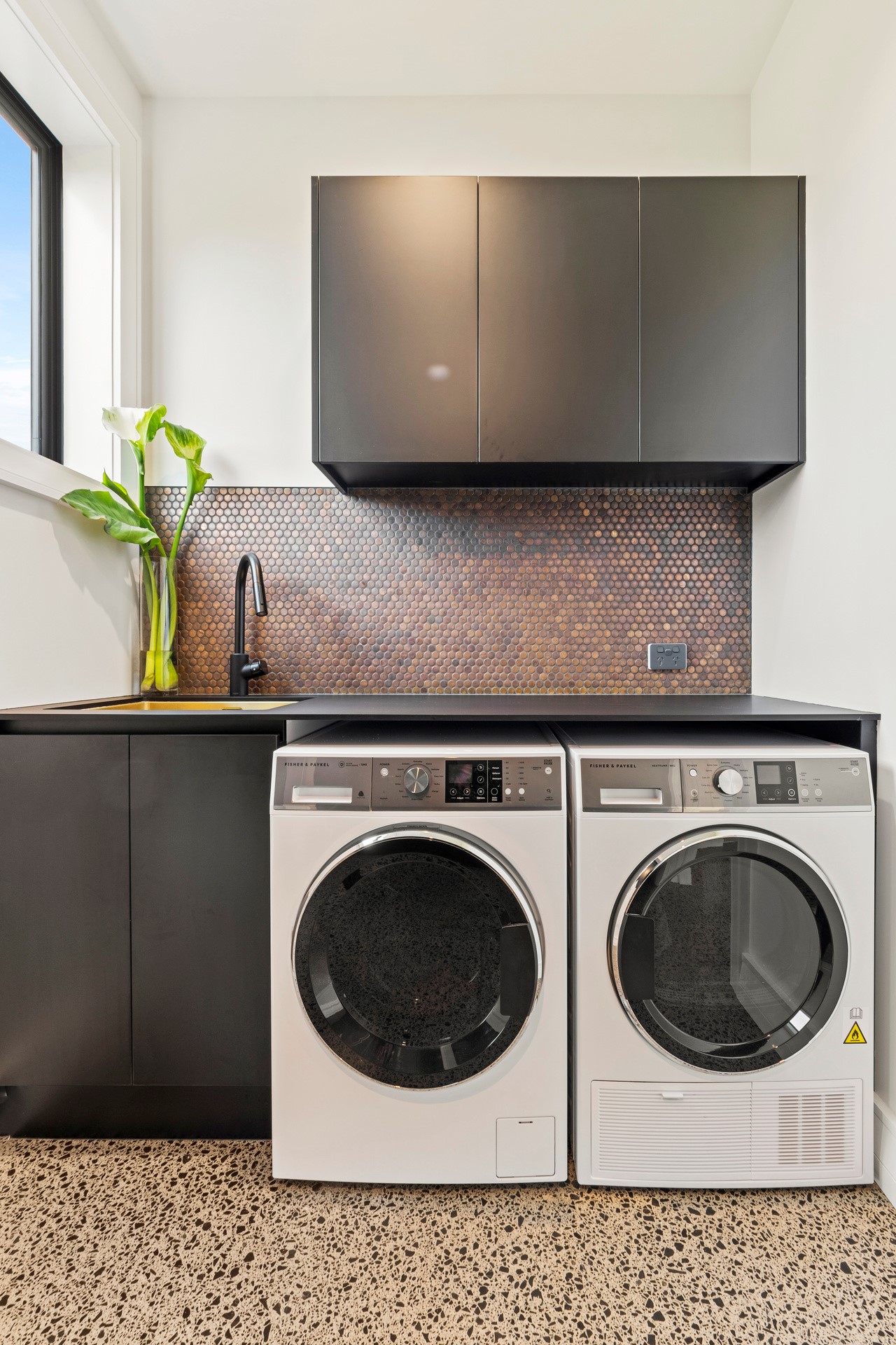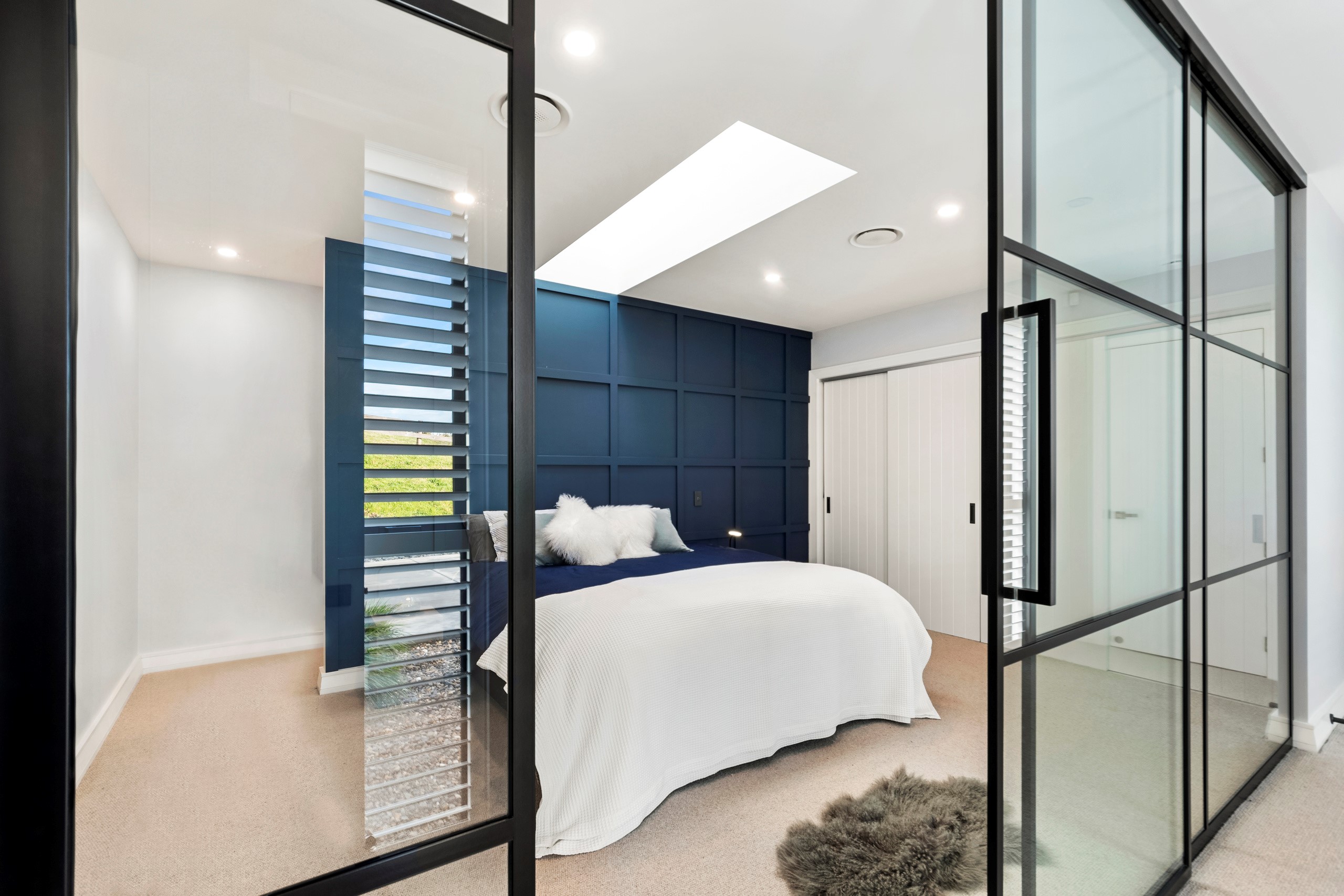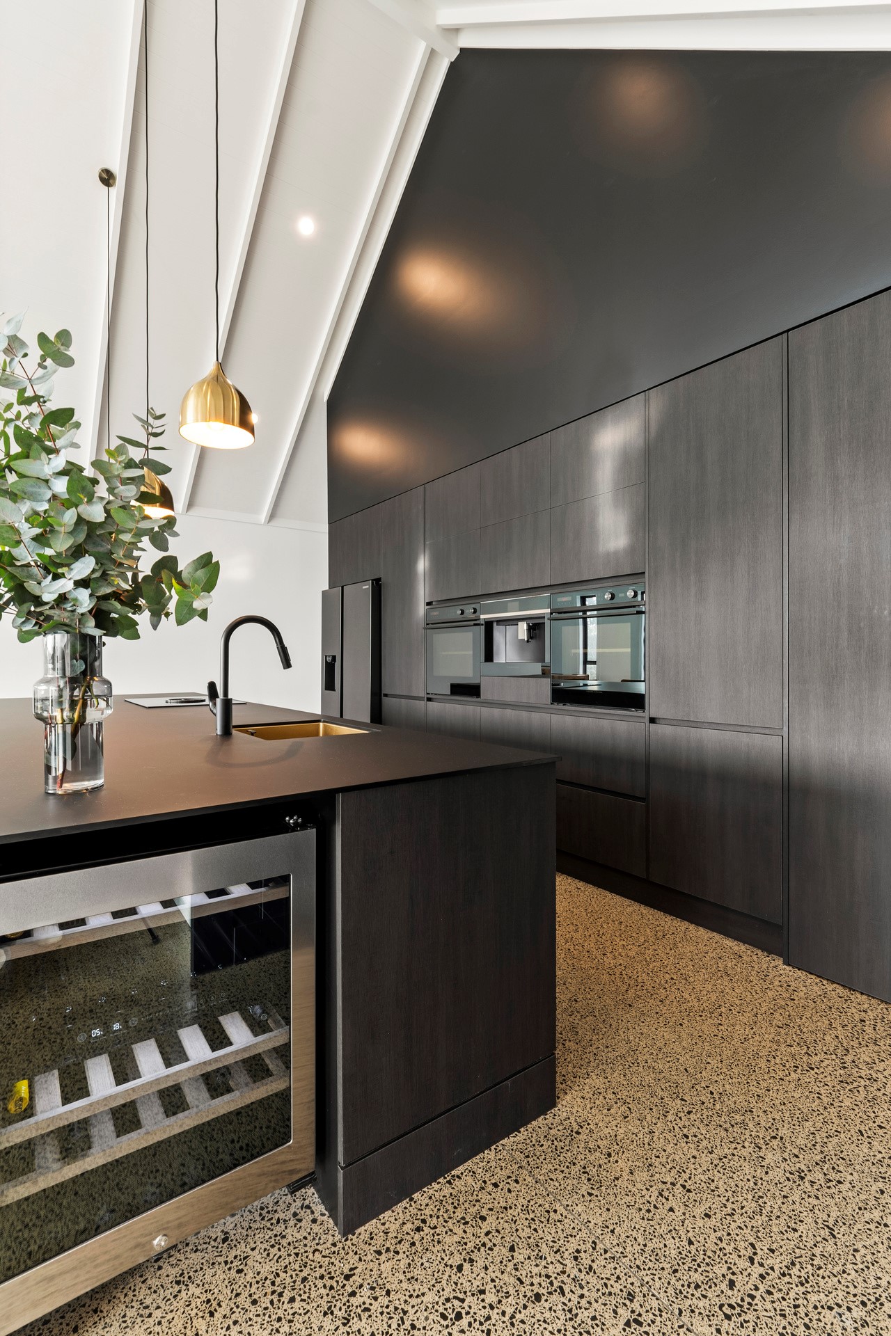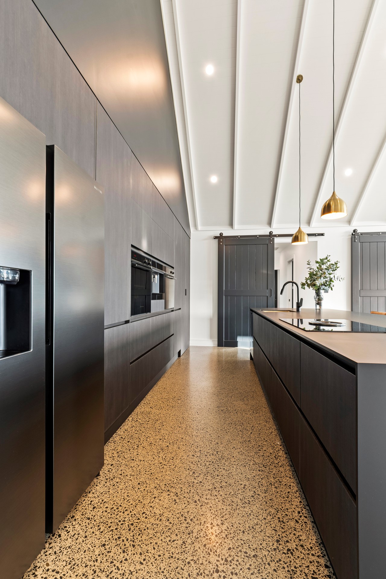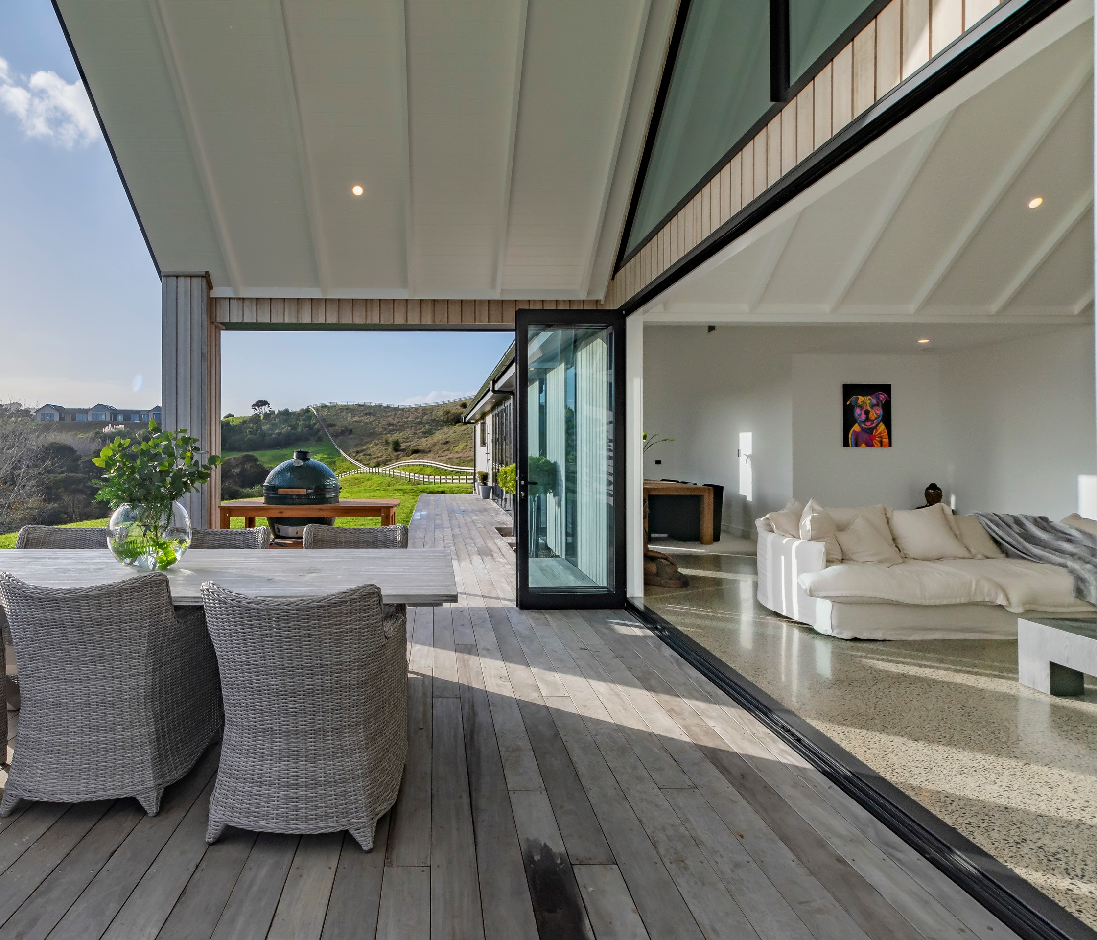 Contemporary materials are combined skillfully in this home that sprawls over its elevated rural site. Pale tones in the vertical timber are offset with black steel roofing, creating striking contrasts amid the lush, shades-of-green surrounds. The centre of the house is a showcase of impressive proportions, with a double-height living area and 2.7m stud height elsewhere. Automated skylights and feature glass enhance the feeling of light and space. Oversized custom architraves and skirting, and decorative raked ceilings add a warm and welcoming country feel to the interior. This four-bedroom, 385sqm home is designed to bring a busy family together – and to give them plenty of their own space. Each bedroom is generous and well-appointed, and the main-bedroom suite is a private escape with country-style timber detailing and a luxurious ensuite. Entertaining spaces have been created throughout the home – open-plan living flows onto a covered deck and into a separate media lounge. Four-car garaging and an impressive workshop top off this spacious, splendid country home.