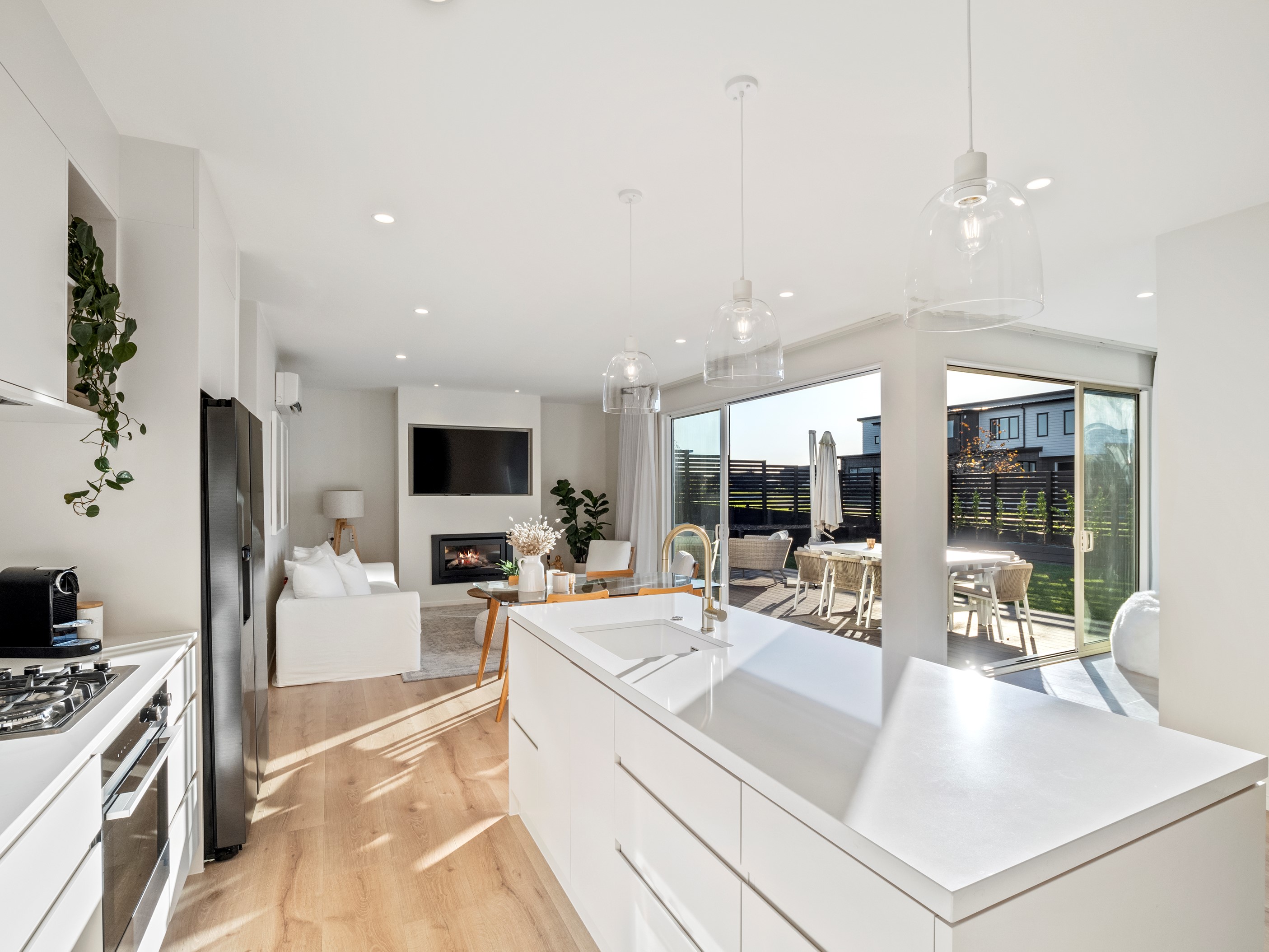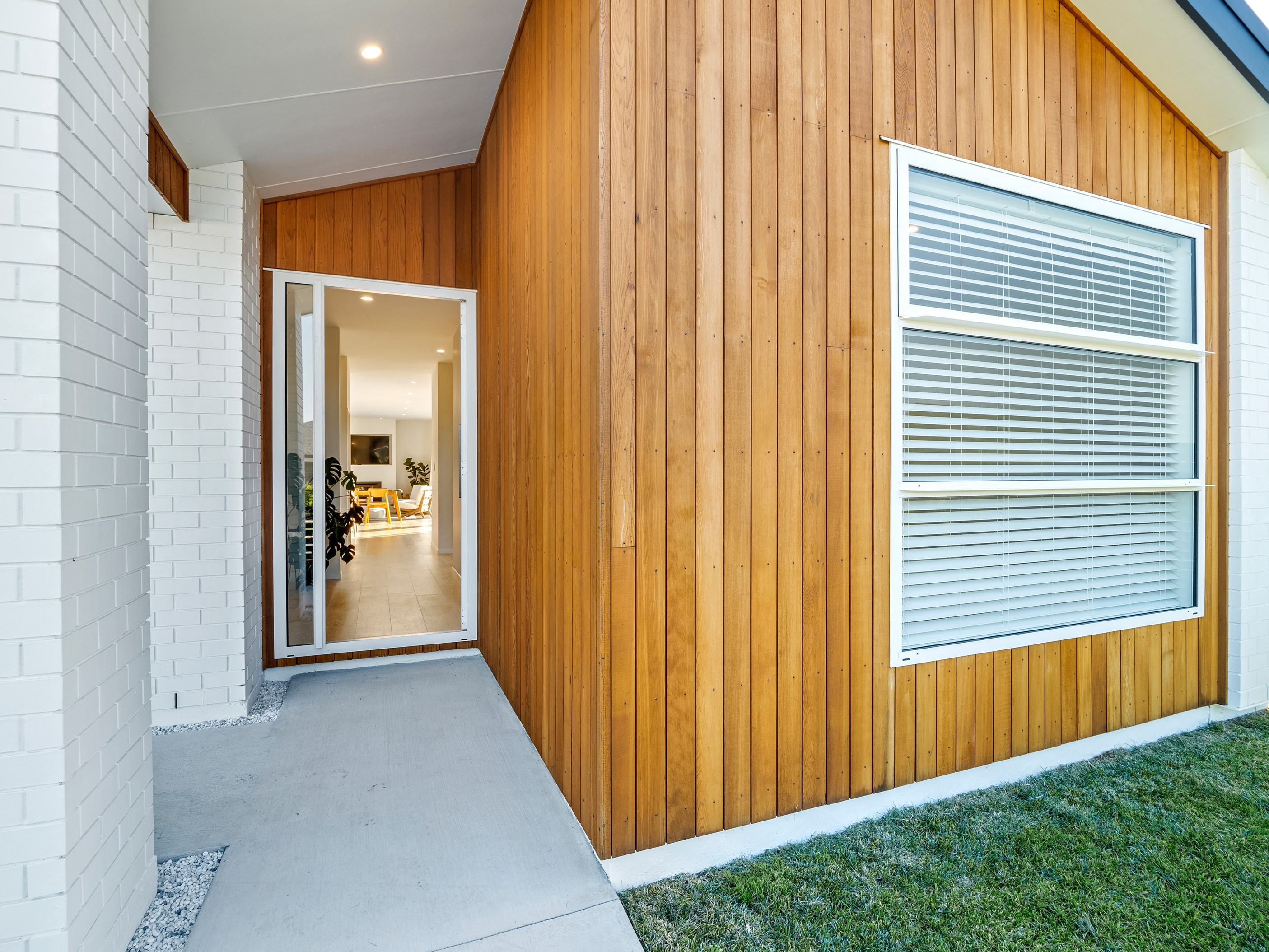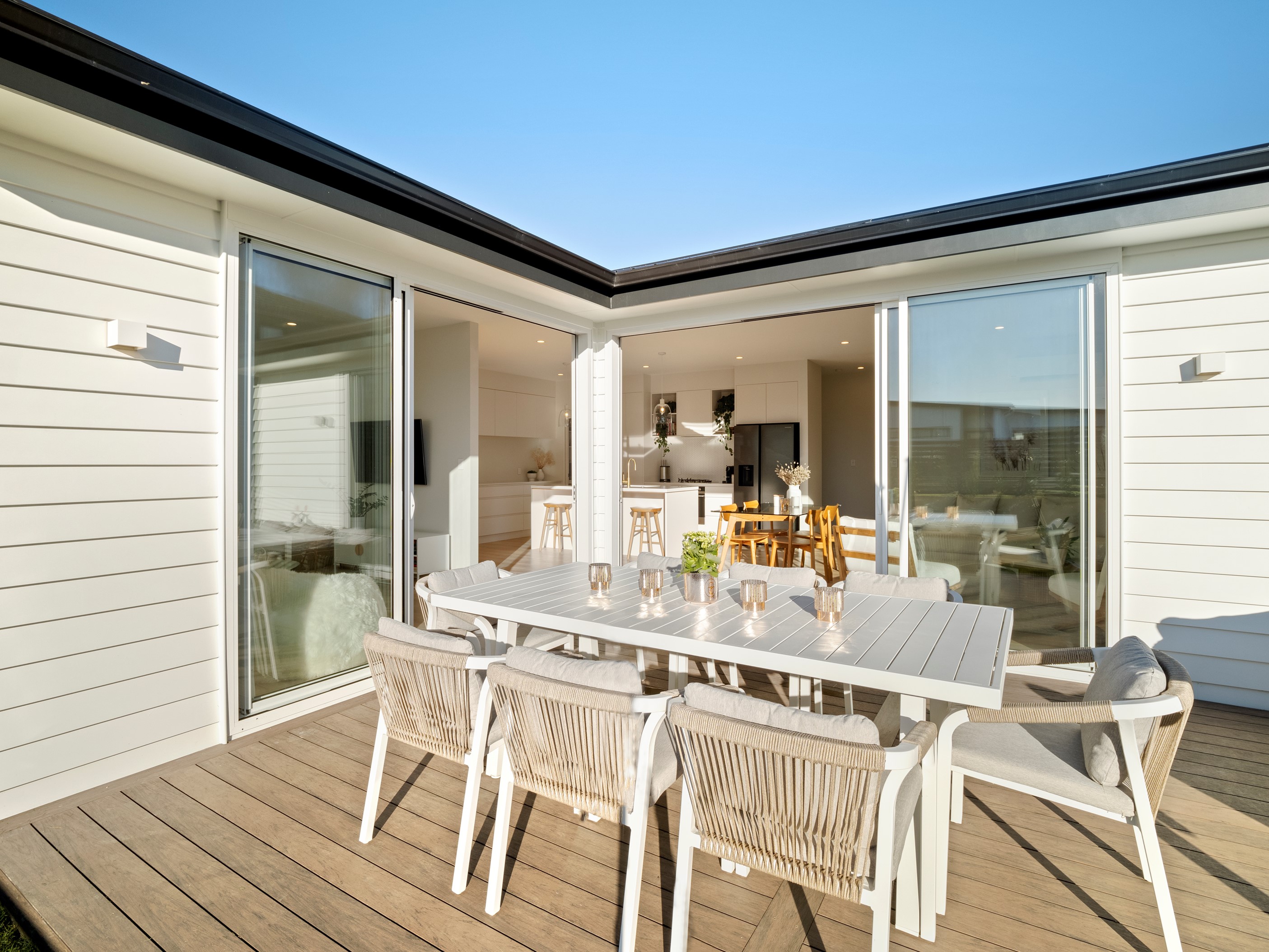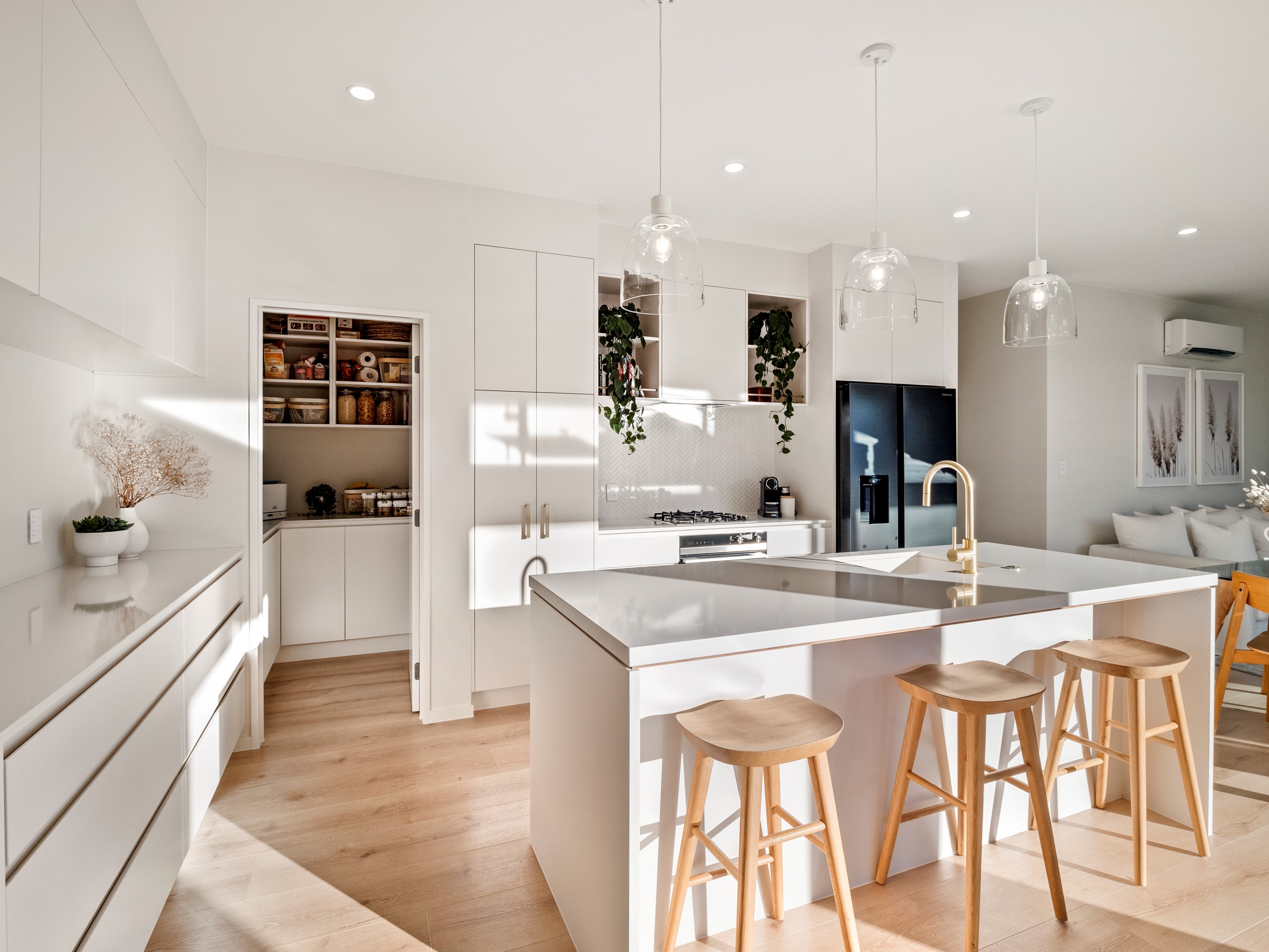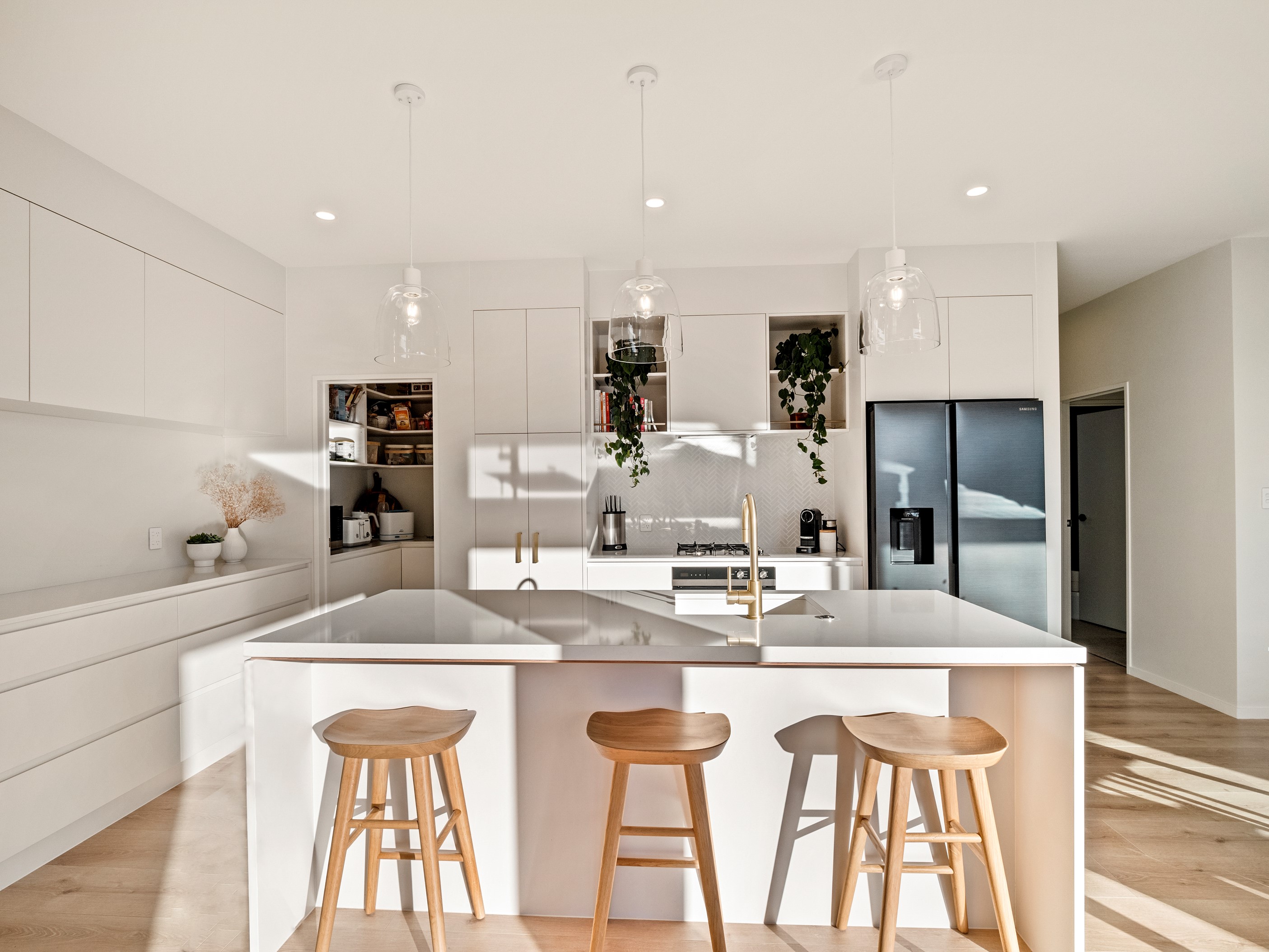 If you’re looking for inspiration in shades of white done well, this 190sqm four-bedroom property is it. A colour consultant had input into this project, and it shows, especially when you step through the front door and into the crisp, light interior. The customised fit-out and decor superbly demonstrate white-on-light style, with warming wood tones in the floor, furniture and bathroom vanities. It also shows that pale can be very interesting indeed. In the streamlined kitchen, for instance, texture and design details can be seen in the splashback, with its herringbone tiles and display shelving. The walk-in pantry is a huge bonus. Textural tiling is repeated in the bathrooms, including the main-bedroom ensuite. In fact, you’ll find tasteful contrasts everywhere. Perhaps the most impressive feature of this single-level family home is the way the two living areas open directly onto a large deck. It’s as if the outdoor entertaining area is part of the house. The exterior is crisp bevel-back weatherboard and brick trimmed with golden shiplap timber, all accented with a dark roof, fascia and garage door.