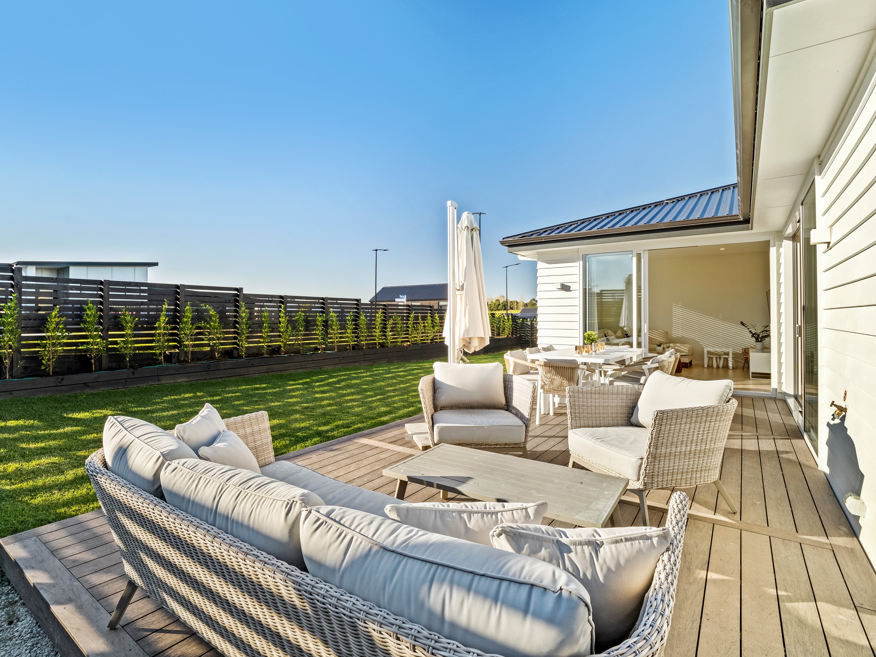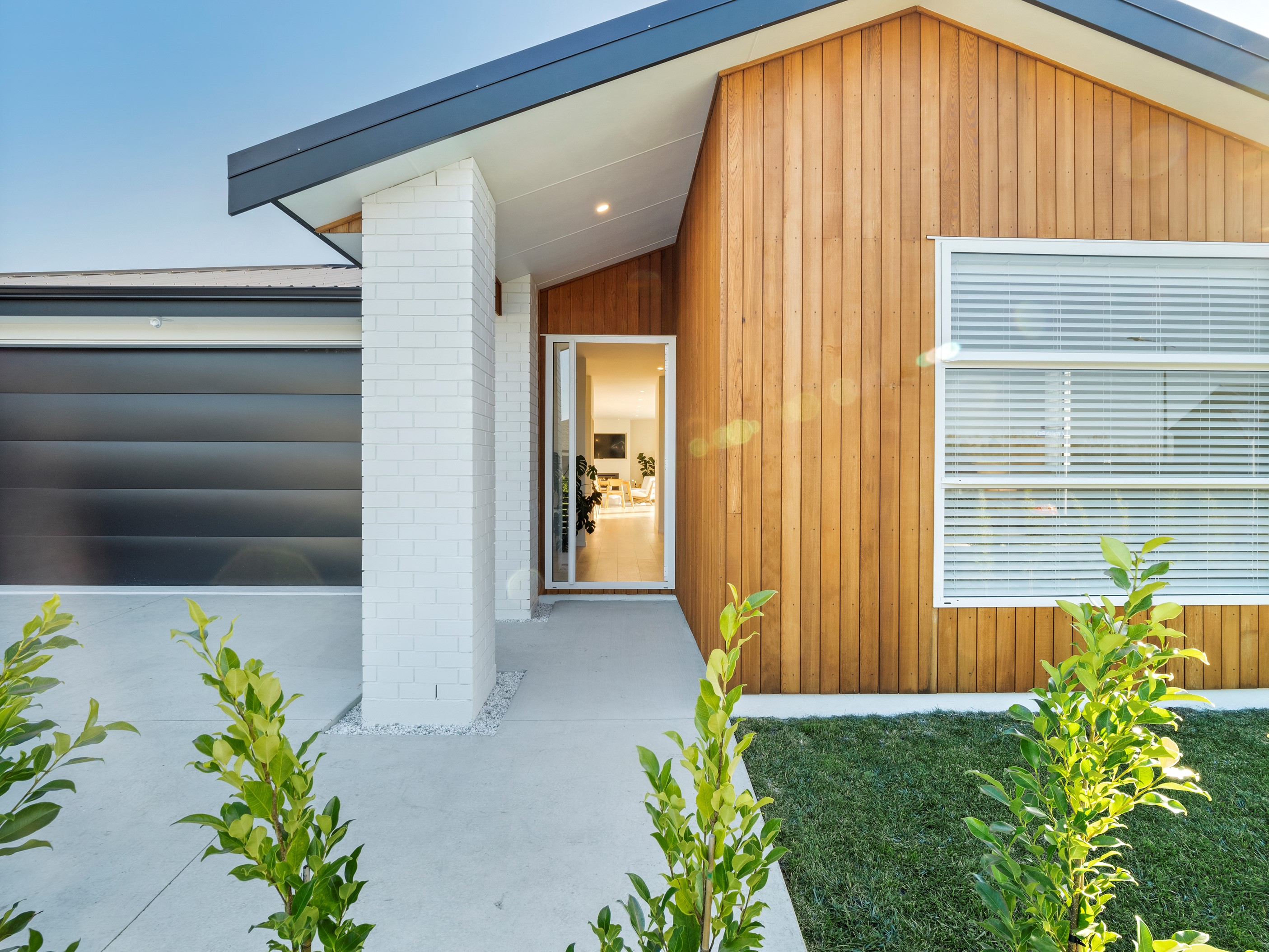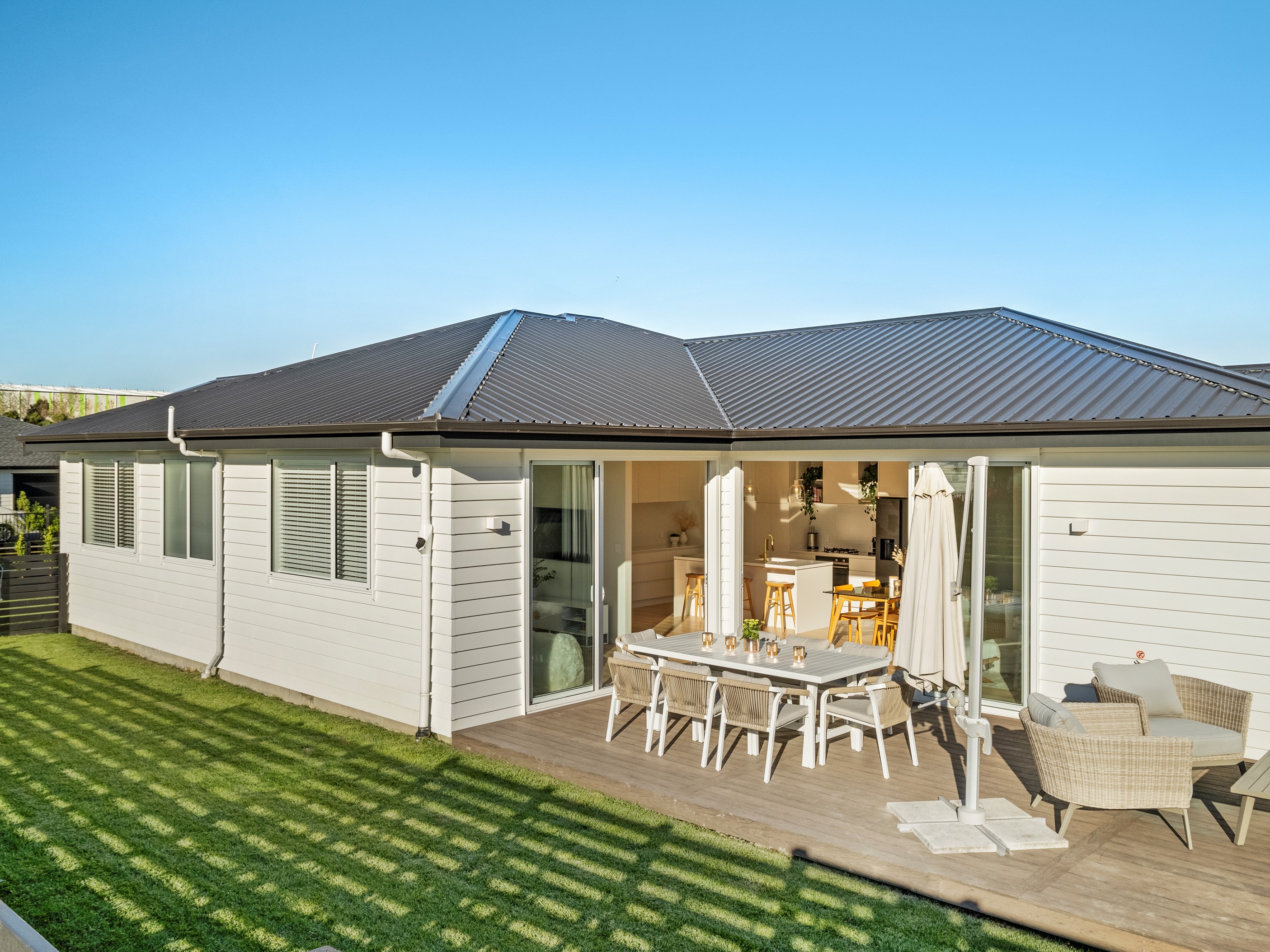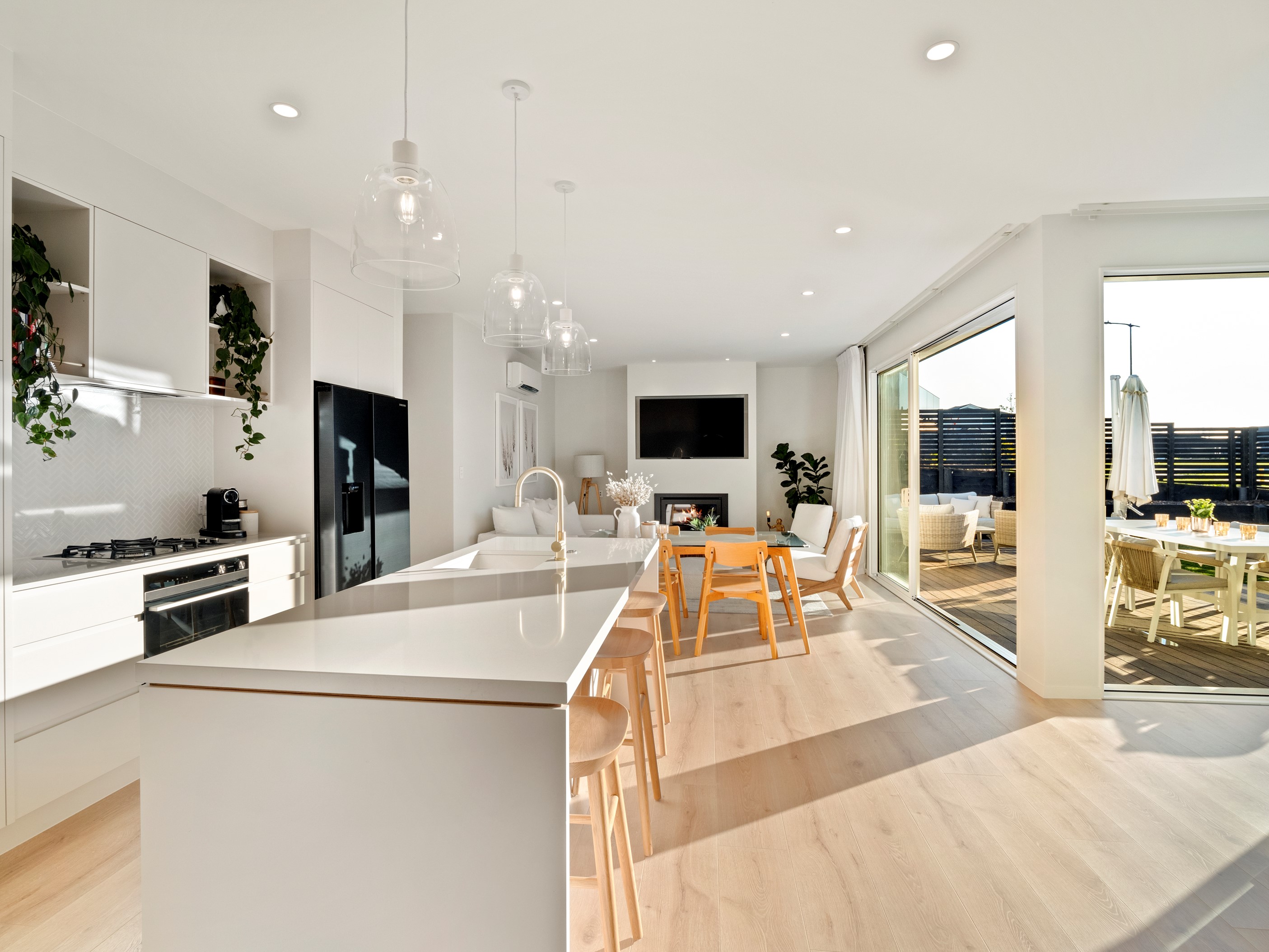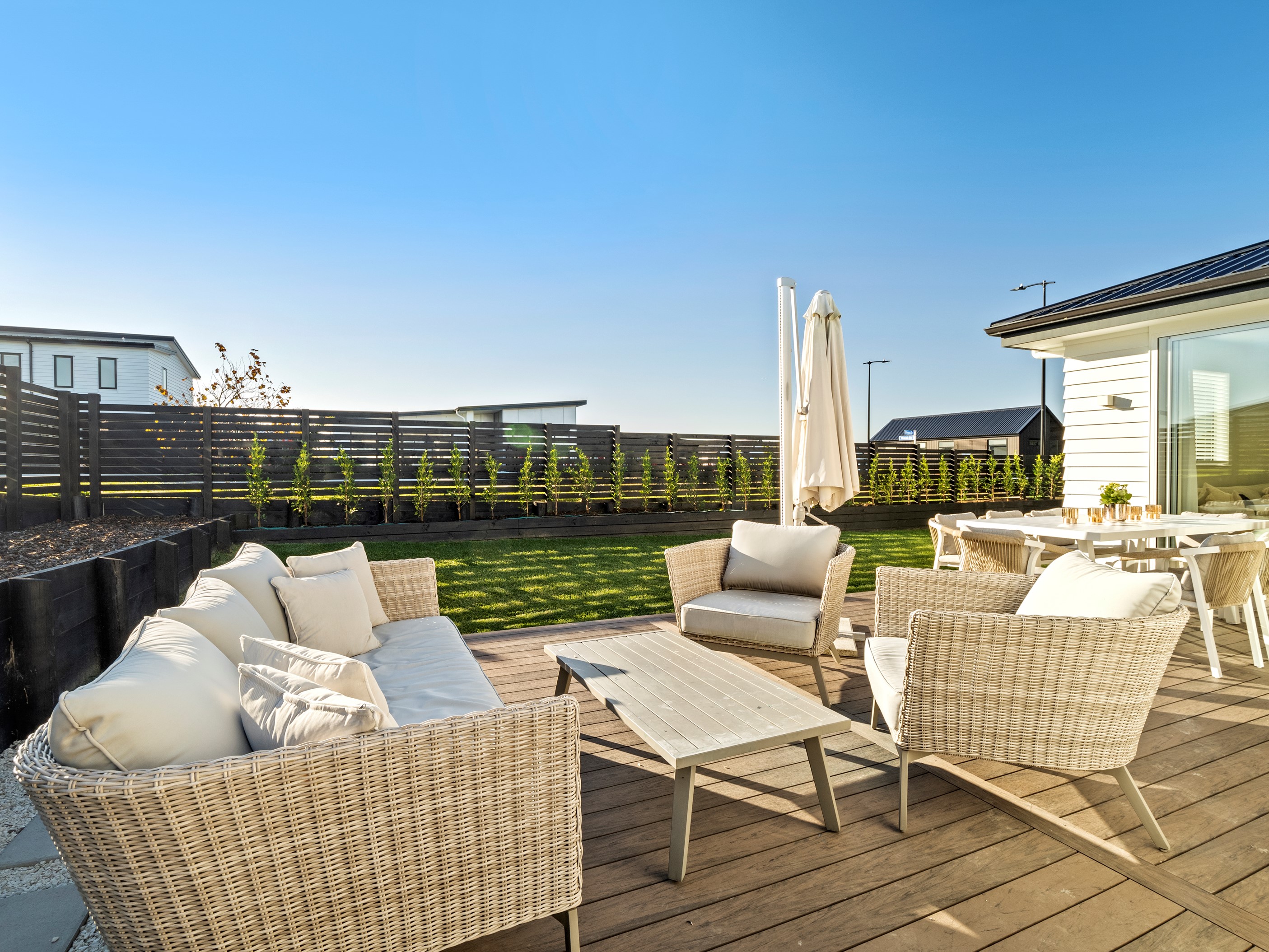 If you’re looking for inspiration in shades of white done well, this 190sqm four-bedroom property is it. A colour consultant had input into this project, and it shows, especially when you step through the front door and into the crisp, light interior. The customised fit-out and decor superbly demonstrate white-on-light style, with warming wood tones in the floor, furniture and bathroom vanities. It also shows that pale can be very interesting indeed. In the streamlined kitchen, for instance, texture and design details can be seen in the splashback, with its herringbone tiles and display shelving. The walk-in pantry is a huge bonus. Textural tiling is repeated in the bathrooms, including the main-bedroom ensuite. In fact, you’ll find tasteful contrasts everywhere. Perhaps the most impressive feature of this single-level family home is the way the two living areas open directly onto a large deck. It’s as if the outdoor entertaining area is part of the house. The exterior is crisp bevel-back weatherboard and brick trimmed with golden shiplap timber, all accented with a dark roof, fascia and garage door.