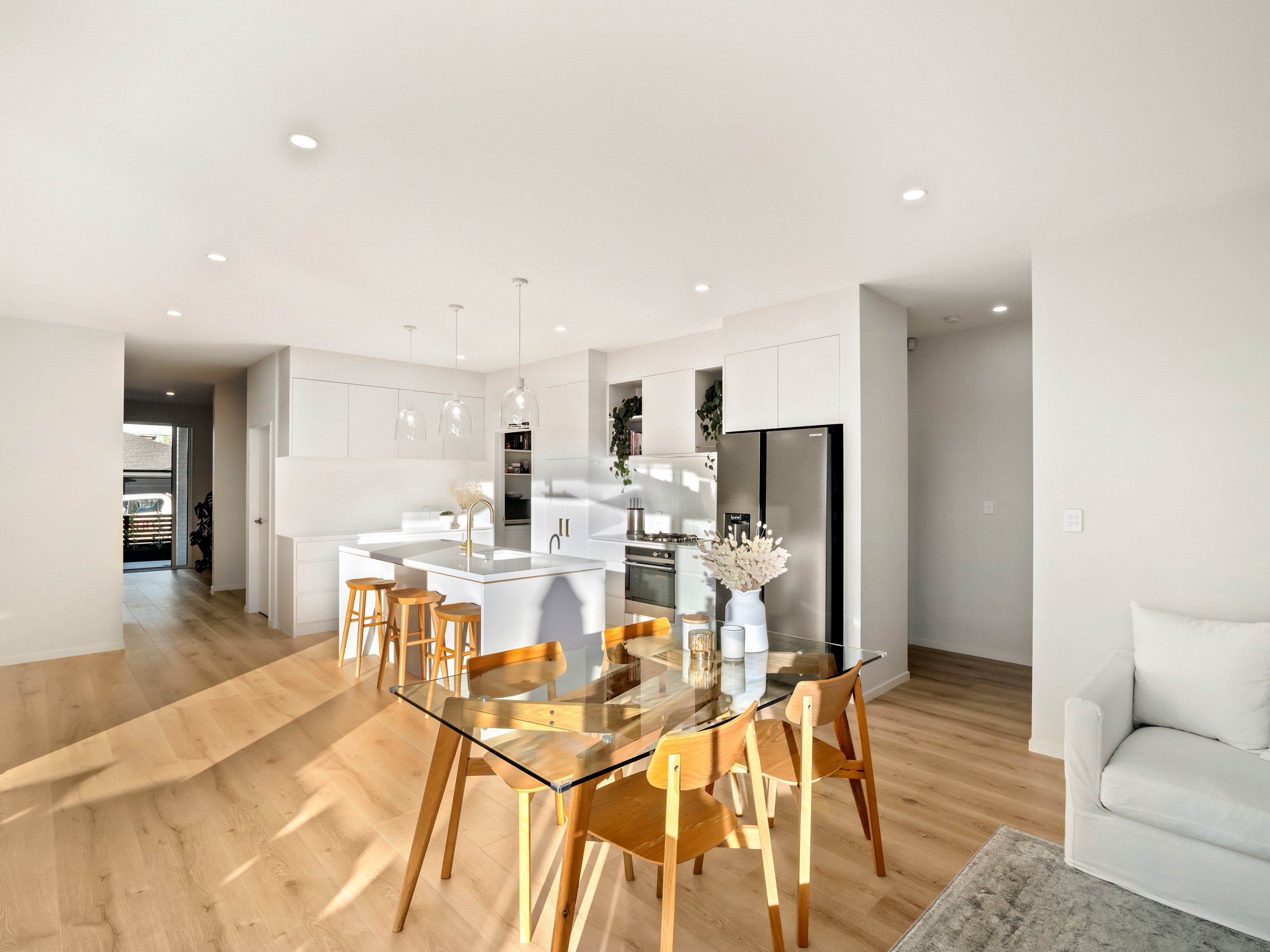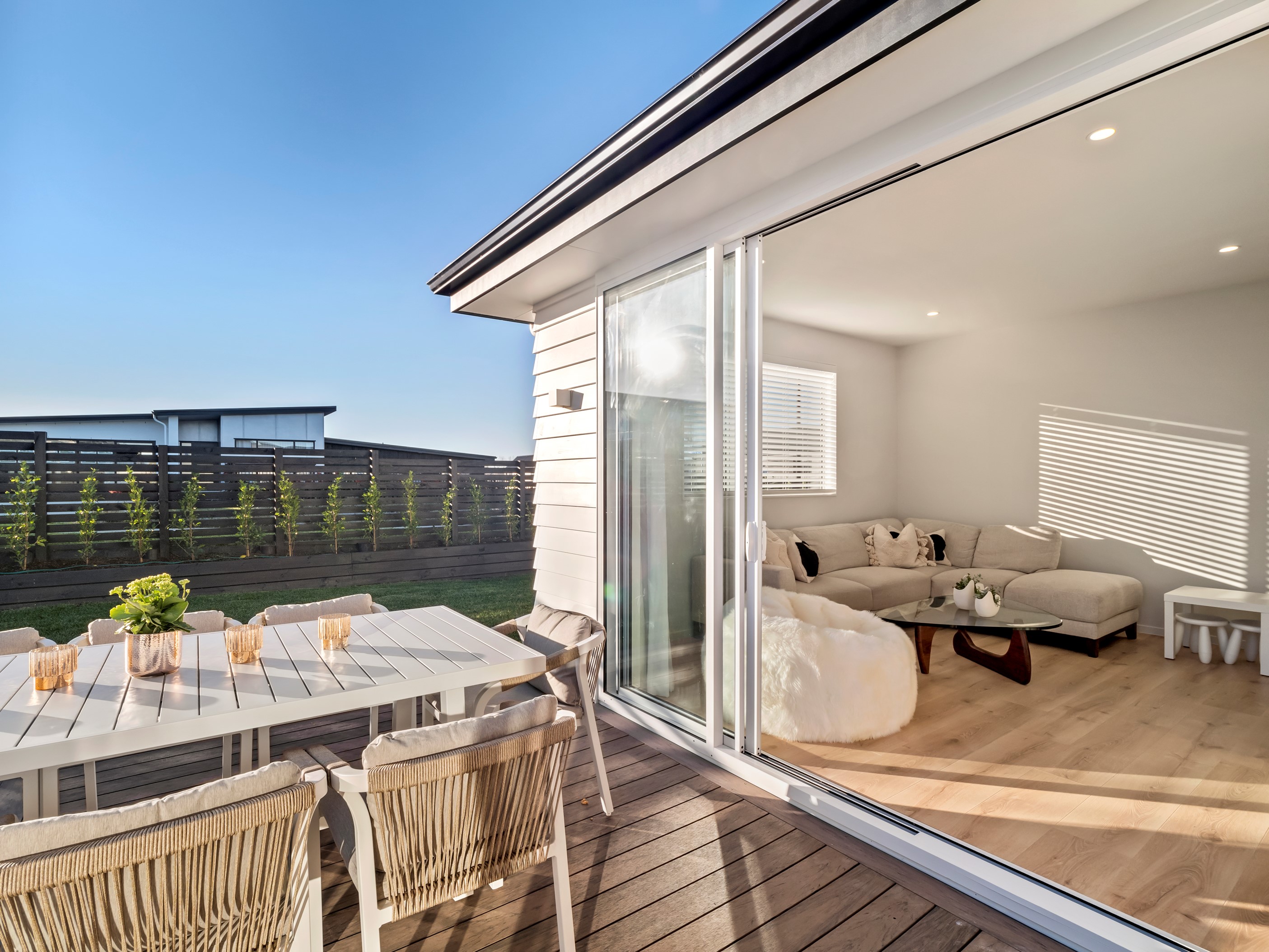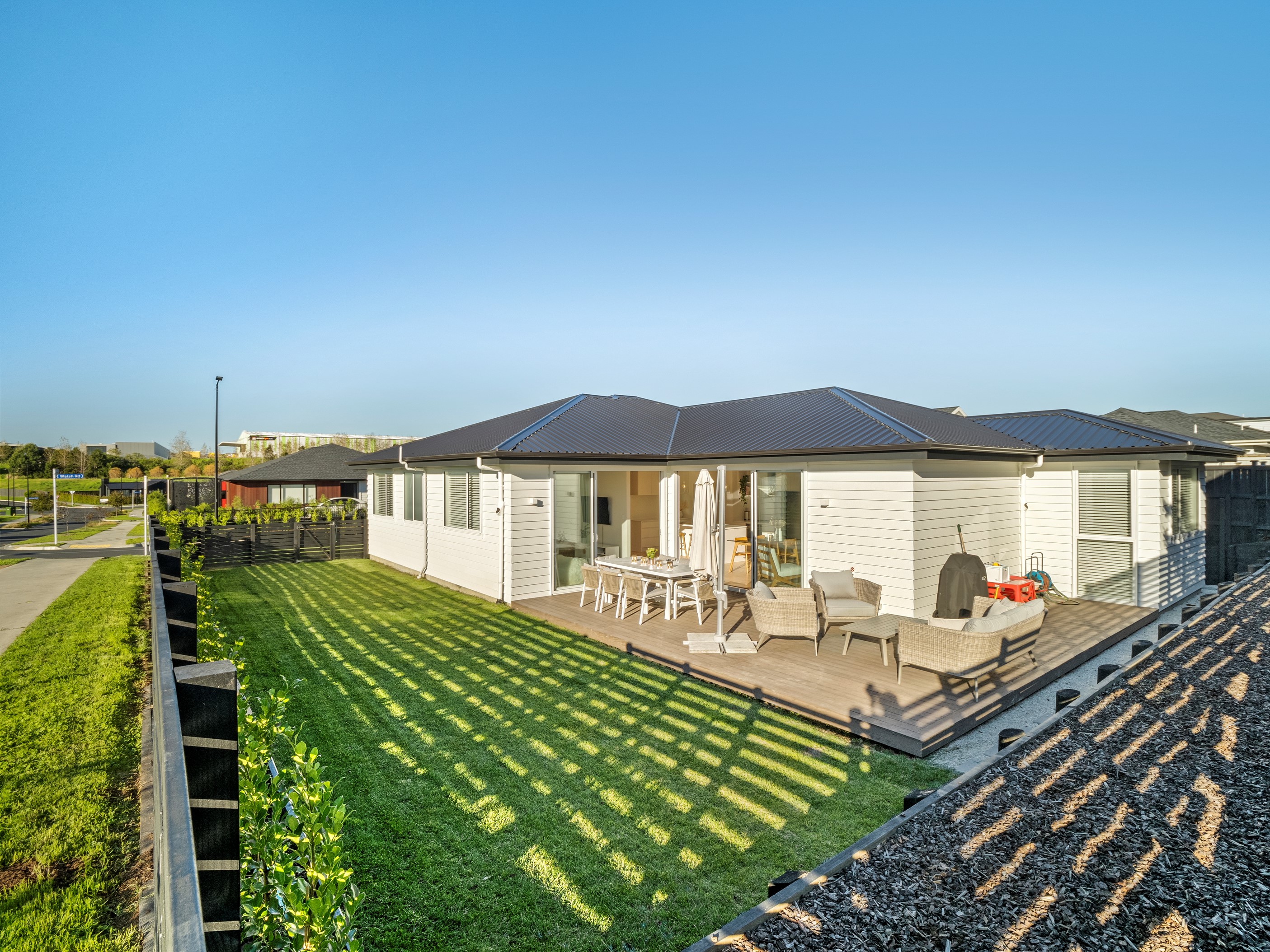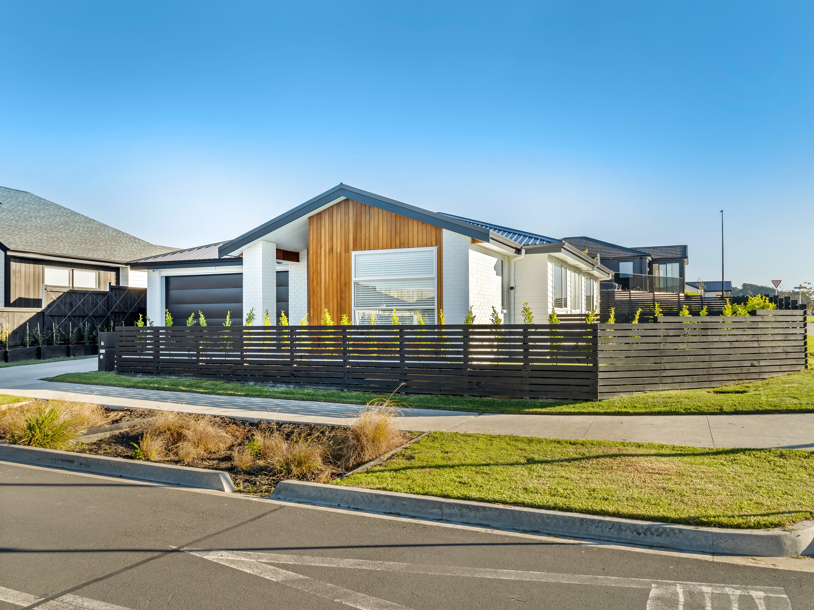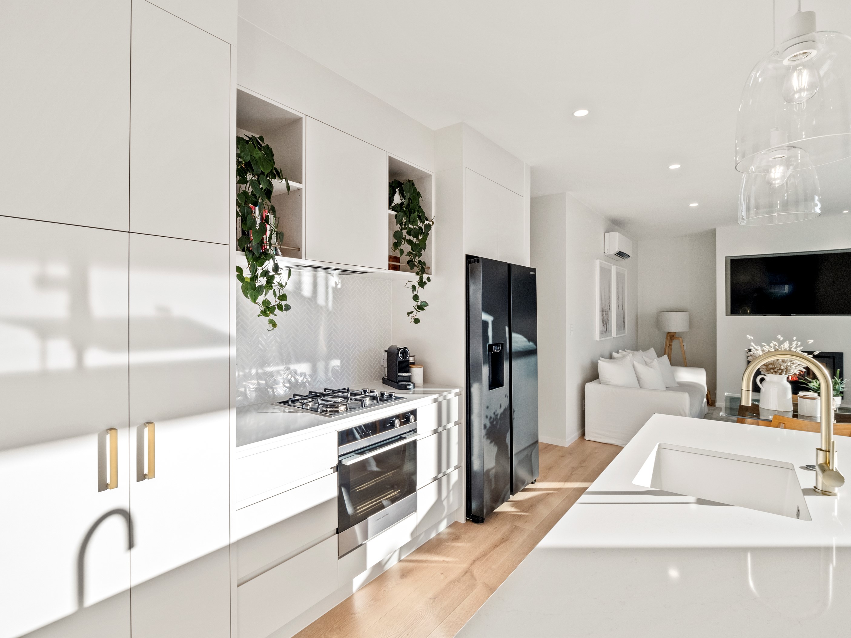 If you’re looking for inspiration in shades of white done well, this 190sqm four-bedroom property is it. A colour consultant had input into this project, and it shows, especially when you step through the front door and into the crisp, light interior. The customised fit-out and decor superbly demonstrate white-on-light style, with warming wood tones in the floor, furniture and bathroom vanities. It also shows that pale can be very interesting indeed. In the streamlined kitchen, for instance, texture and design details can be seen in the splashback, with its herringbone tiles and display shelving. The walk-in pantry is a huge bonus. Textural tiling is repeated in the bathrooms, including the main-bedroom ensuite. In fact, you’ll find tasteful contrasts everywhere. Perhaps the most impressive feature of this single-level family home is the way the two living areas open directly onto a large deck. It’s as if the outdoor entertaining area is part of the house. The exterior is crisp bevel-back weatherboard and brick trimmed with golden shiplap timber, all accented with a dark roof, fascia and garage door.