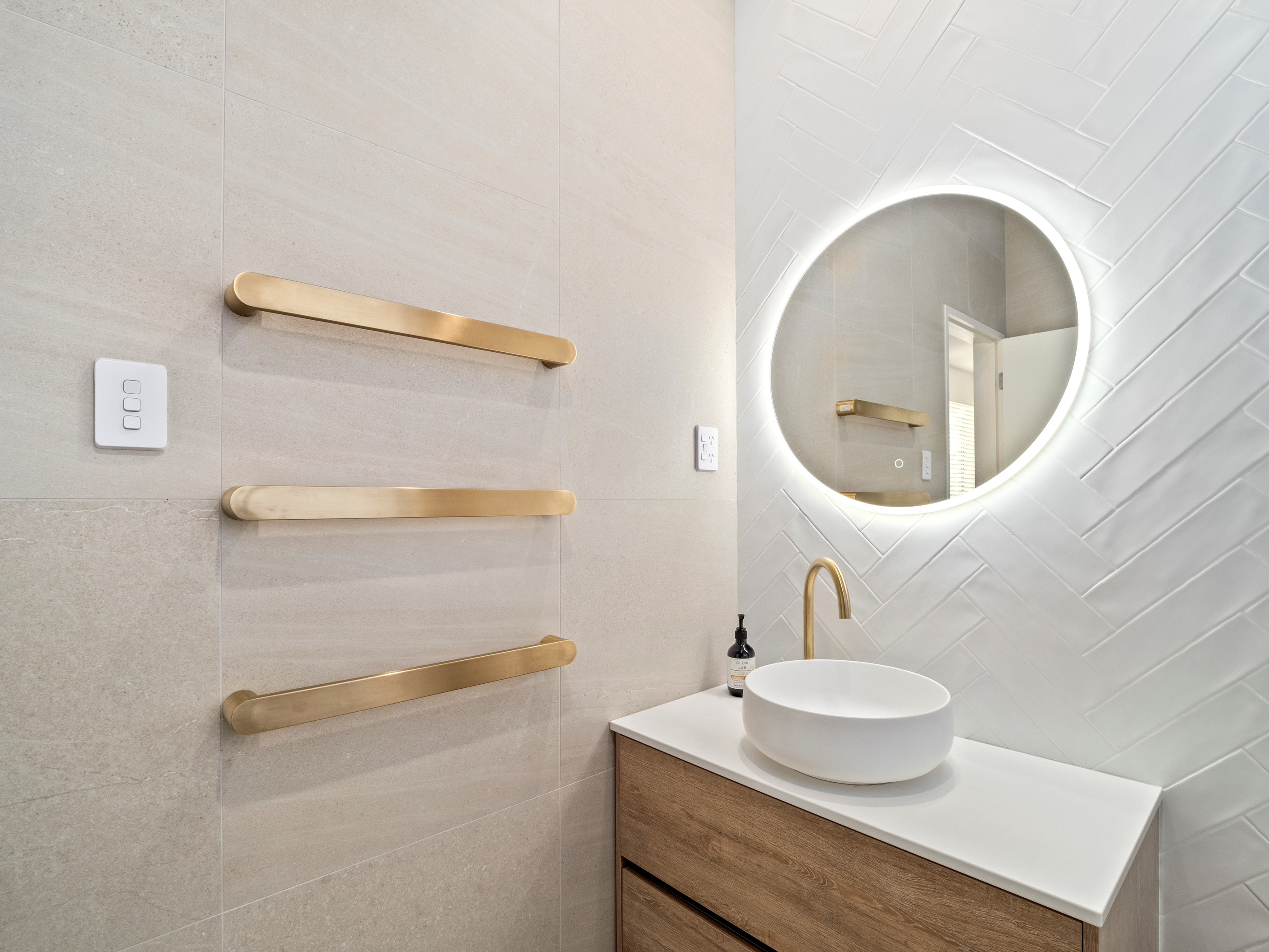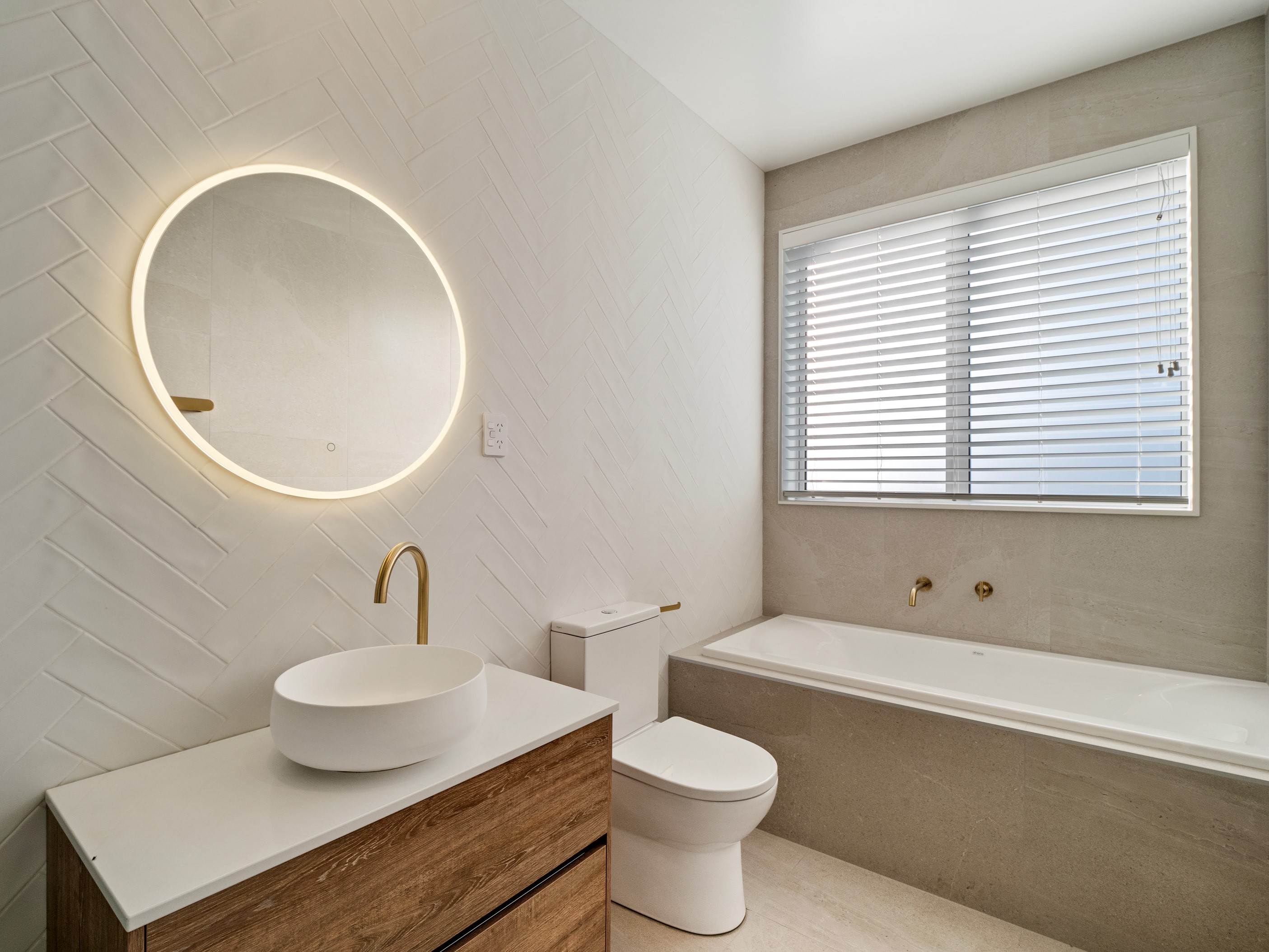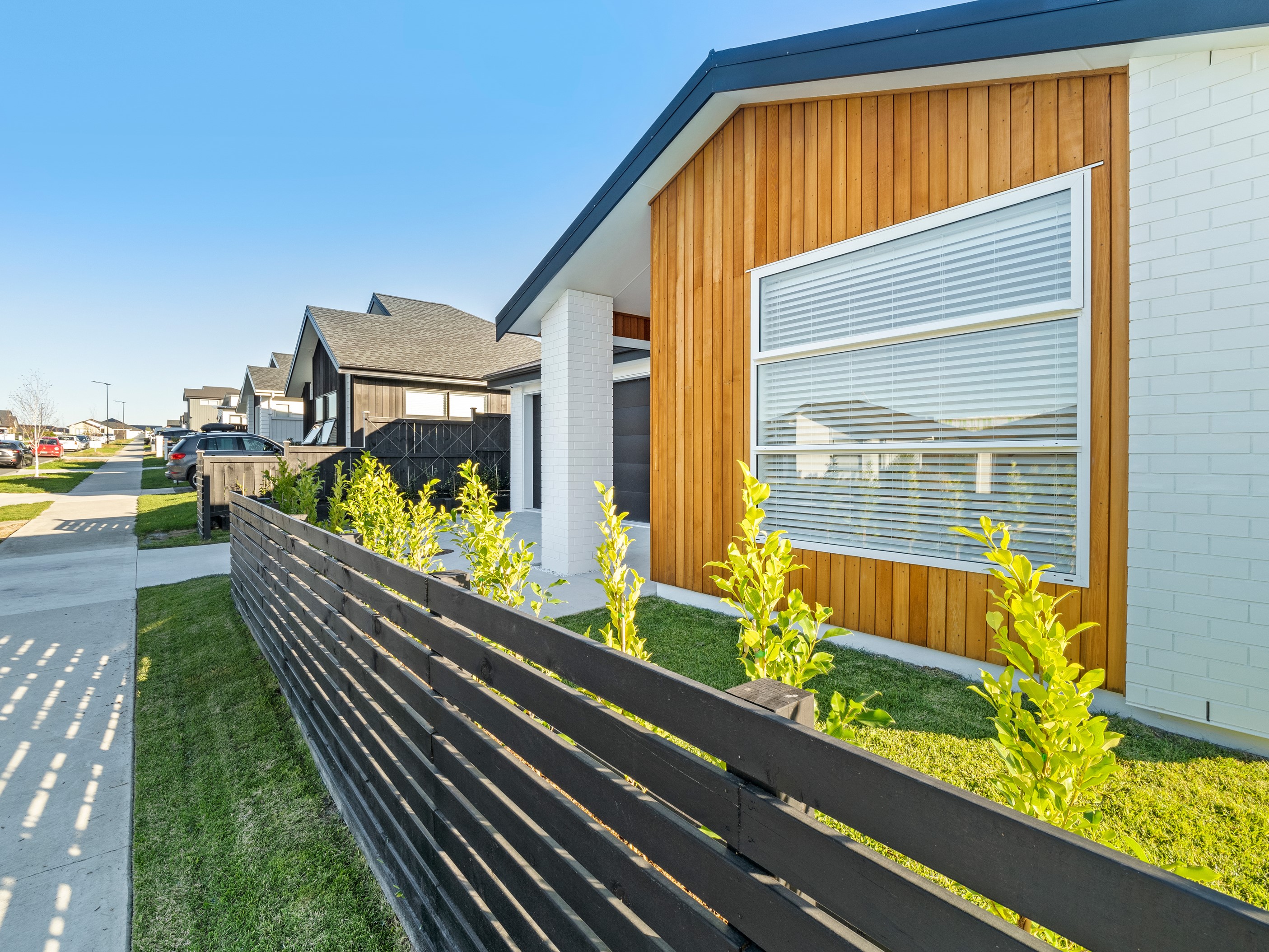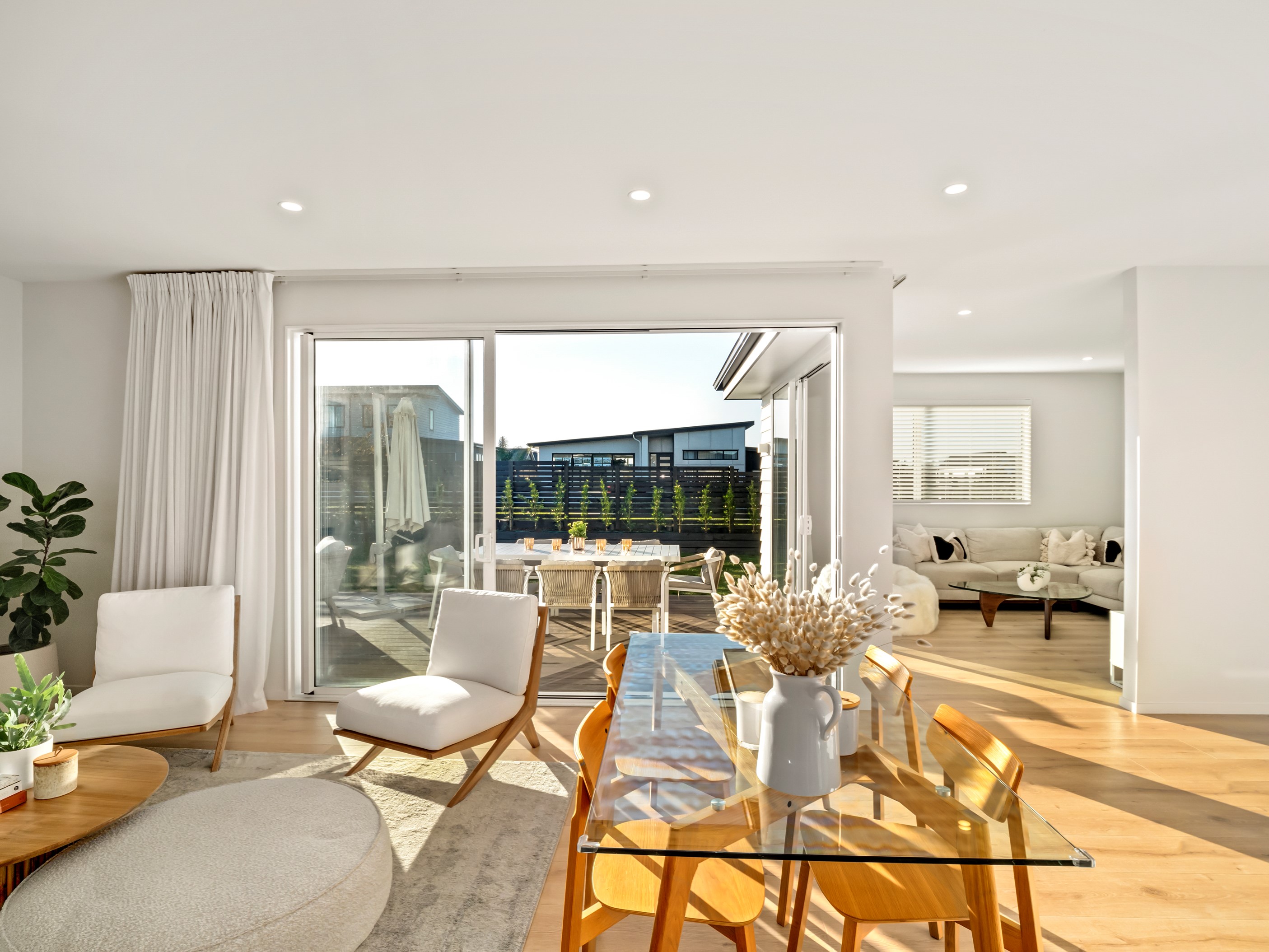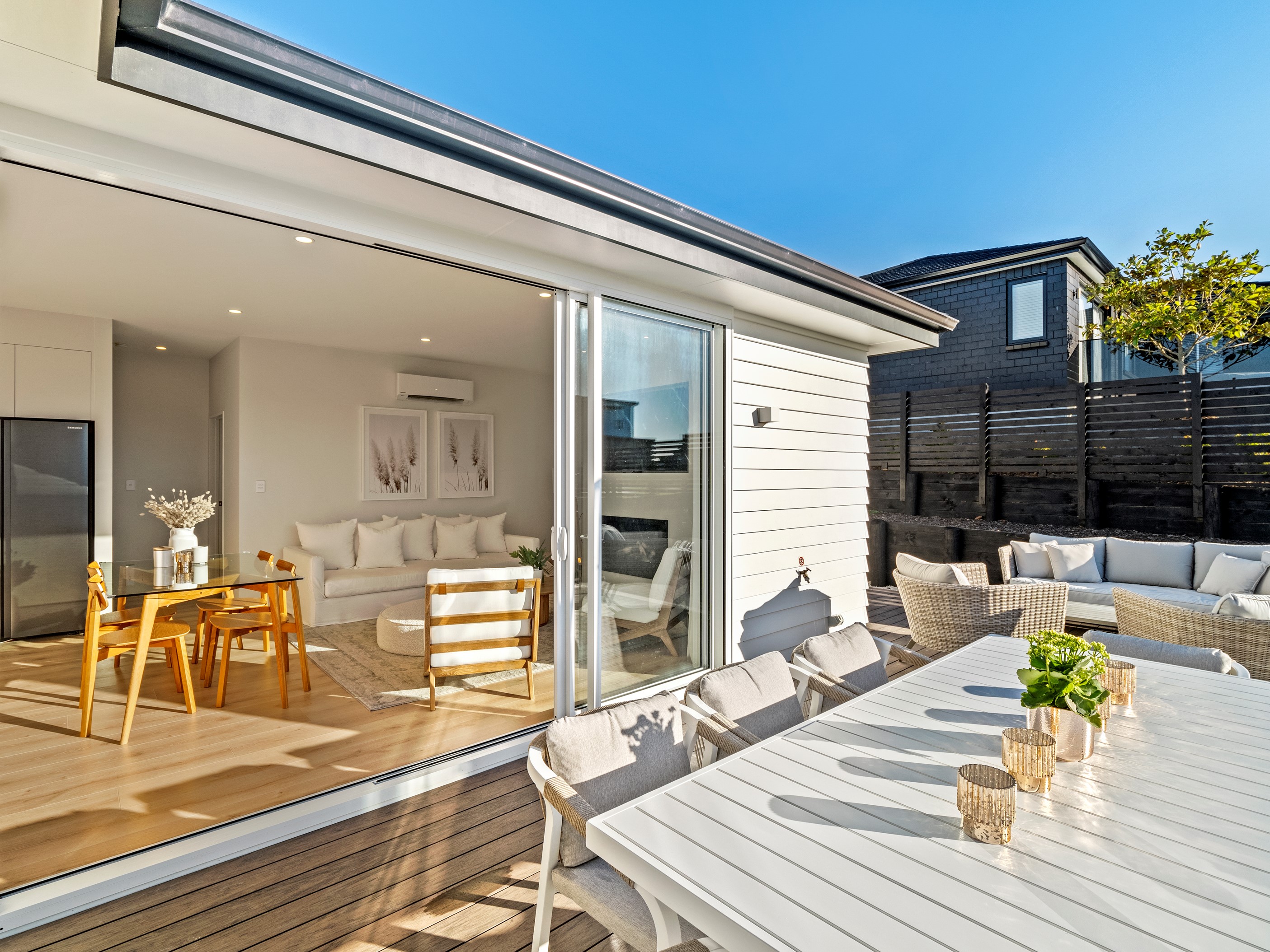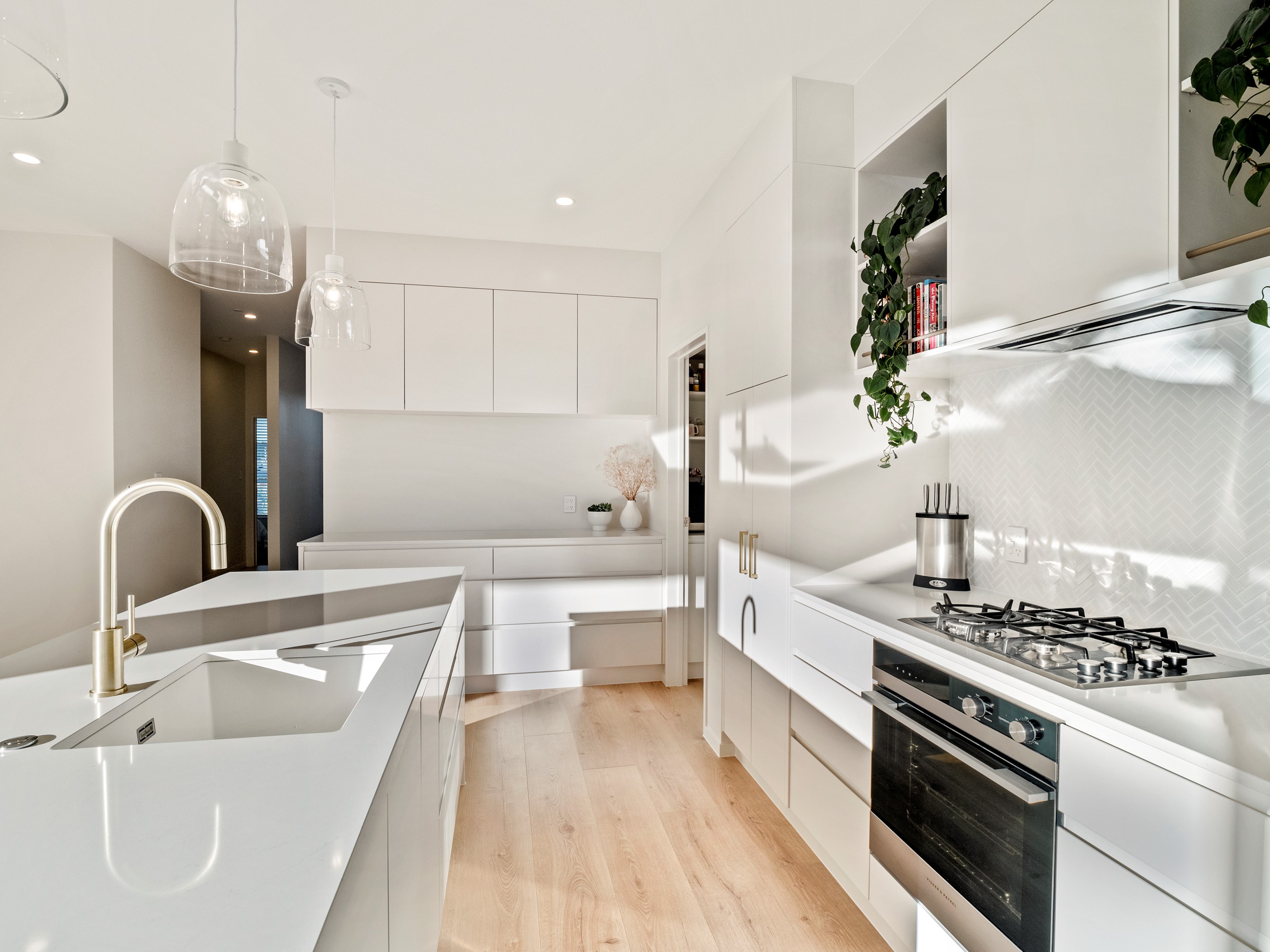 If you’re looking for inspiration in shades of white done well, this 190sqm four-bedroom property is it. A colour consultant had input into this project, and it shows, especially when you step through the front door and into the crisp, light interior. The customised fit-out and decor superbly demonstrate white-on-light style, with warming wood tones in the floor, furniture and bathroom vanities. It also shows that pale can be very interesting indeed. In the streamlined kitchen, for instance, texture and design details can be seen in the splashback, with its herringbone tiles and display shelving. The walk-in pantry is a huge bonus. Textural tiling is repeated in the bathrooms, including the main-bedroom ensuite. In fact, you’ll find tasteful contrasts everywhere. Perhaps the most impressive feature of this single-level family home is the way the two living areas open directly onto a large deck. It’s as if the outdoor entertaining area is part of the house. The exterior is crisp bevel-back weatherboard and brick trimmed with golden shiplap timber, all accented with a dark roof, fascia and garage door.