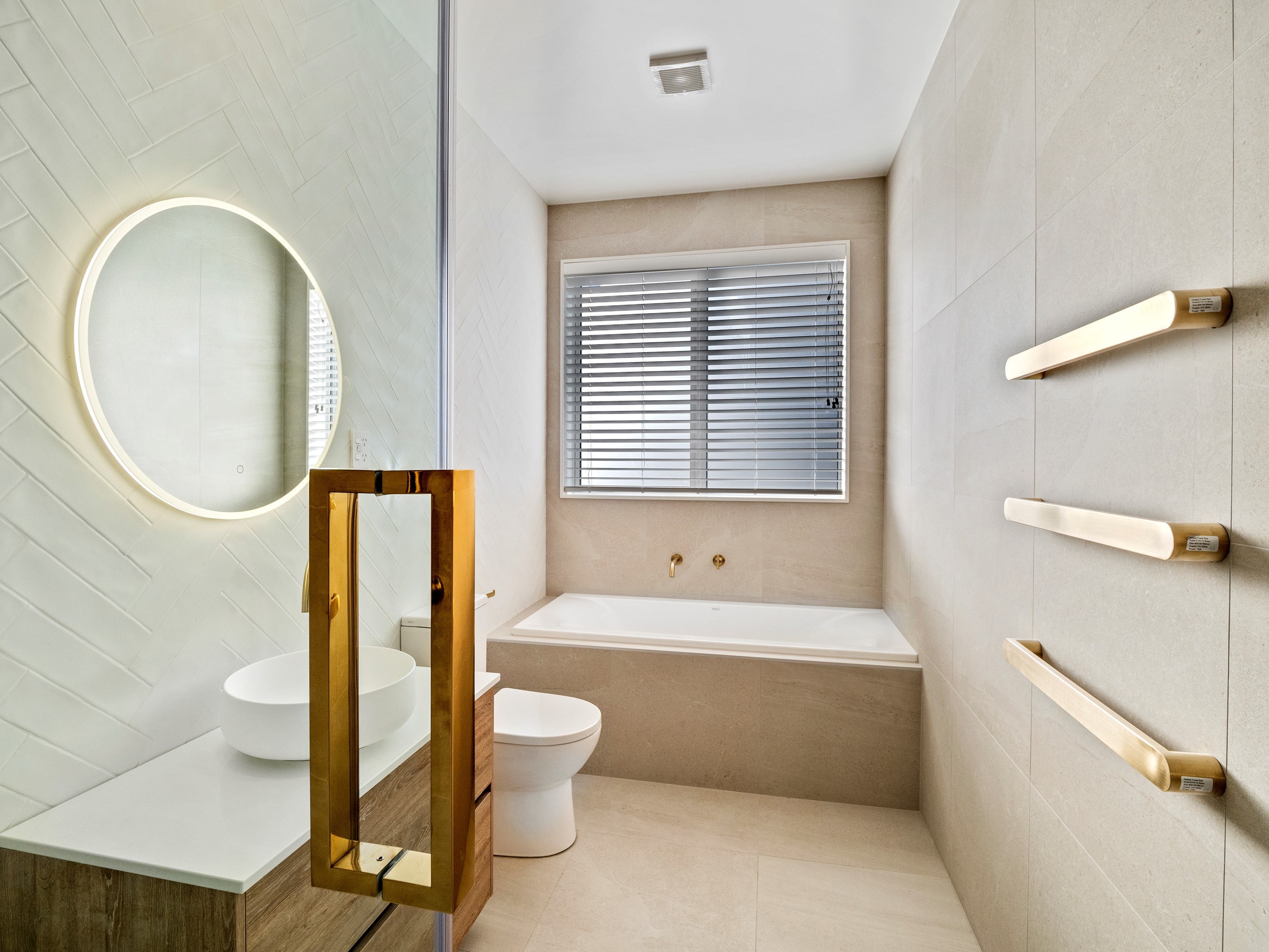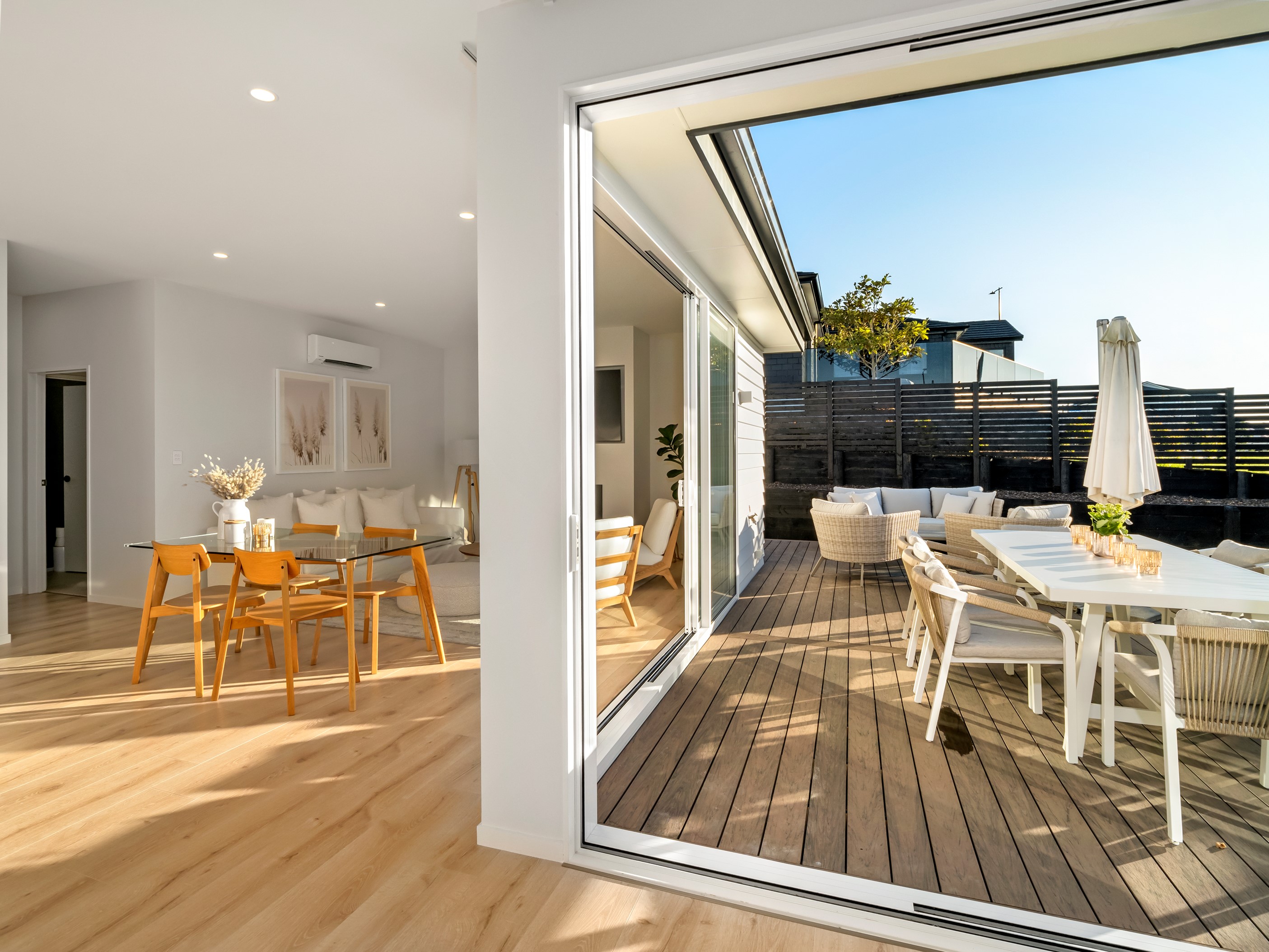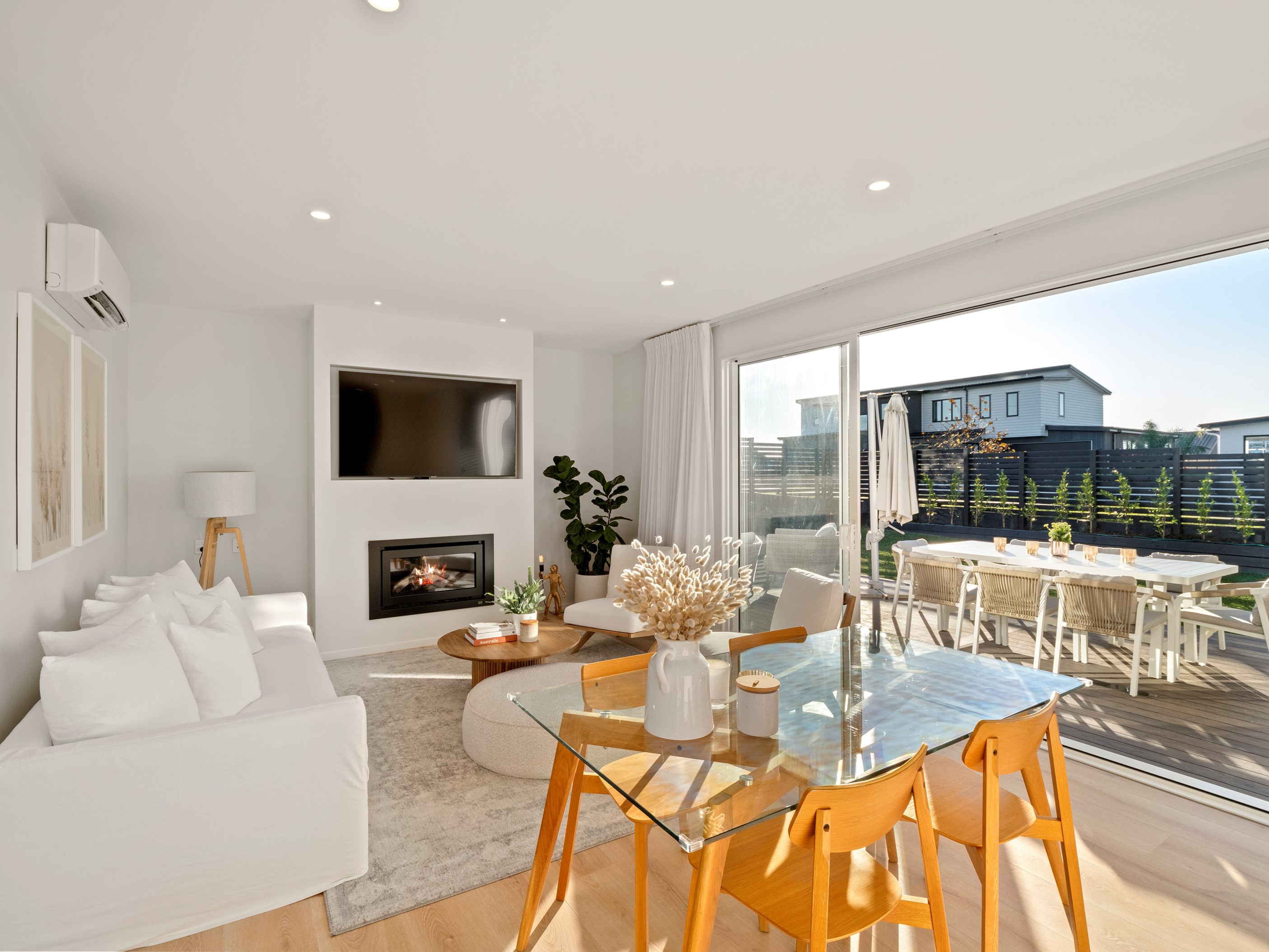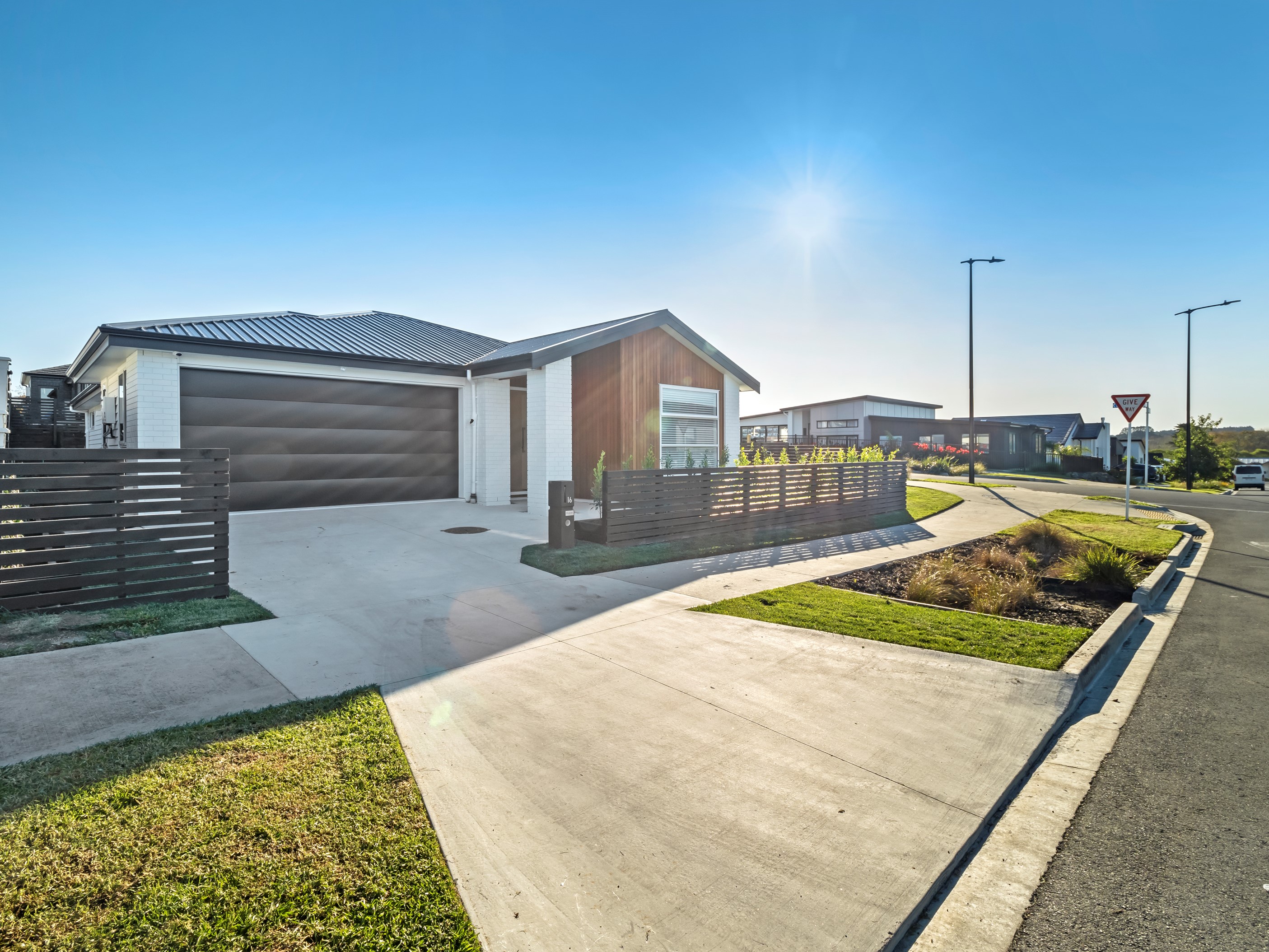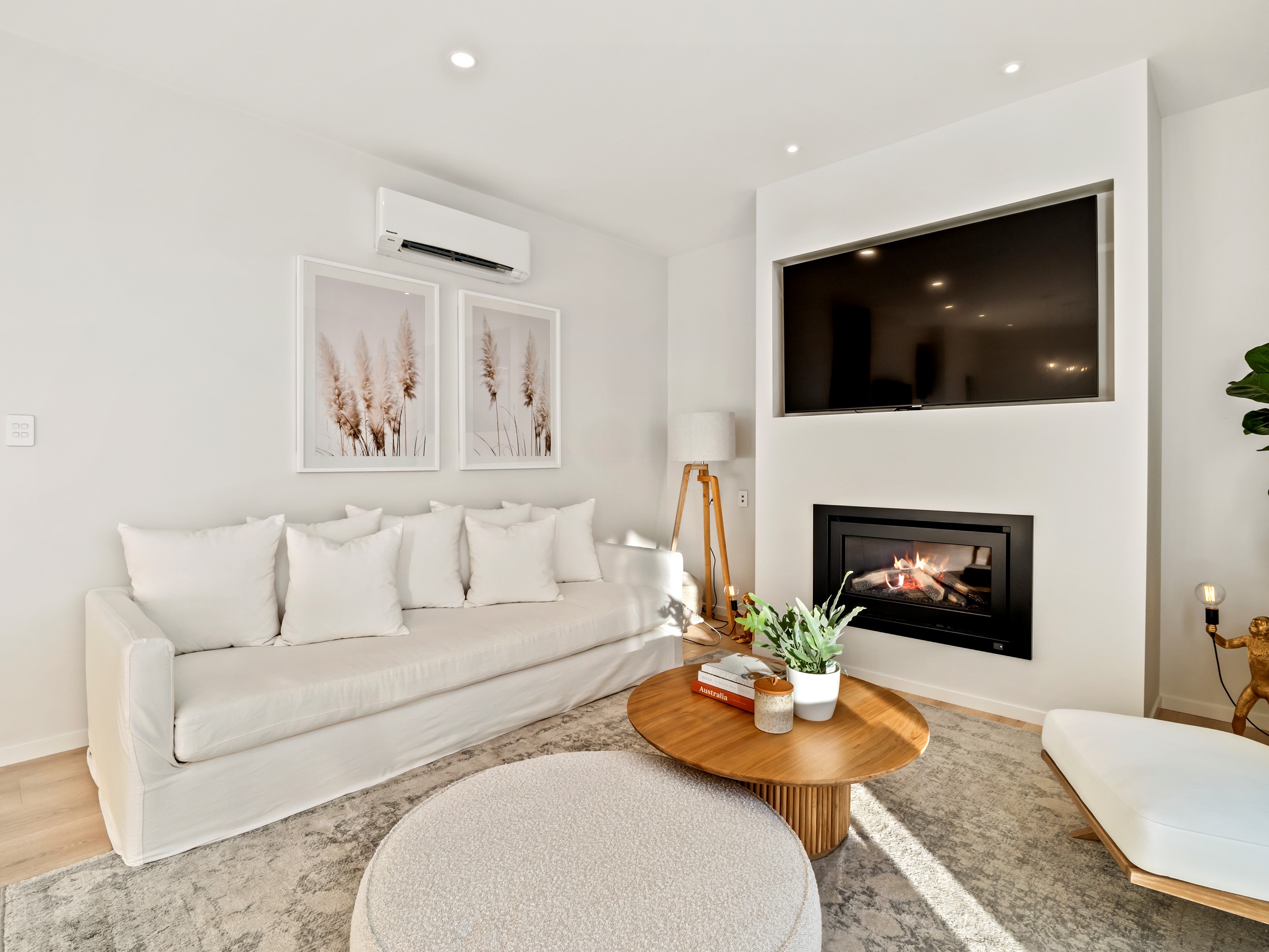 If you’re looking for inspiration in shades of white done well, this 190sqm four-bedroom property is it. A colour consultant had input into this project, and it shows, especially when you step through the front door and into the crisp, light interior. The customised fit-out and decor superbly demonstrate white-on-light style, with warming wood tones in the floor, furniture and bathroom vanities. It also shows that pale can be very interesting indeed. In the streamlined kitchen, for instance, texture and design details can be seen in the splashback, with its herringbone tiles and display shelving. The walk-in pantry is a huge bonus. Textural tiling is repeated in the bathrooms, including the main-bedroom ensuite. In fact, you’ll find tasteful contrasts everywhere. Perhaps the most impressive feature of this single-level family home is the way the two living areas open directly onto a large deck. It’s as if the outdoor entertaining area is part of the house. The exterior is crisp bevel-back weatherboard and brick trimmed with golden shiplap timber, all accented with a dark roof, fascia and garage door.
