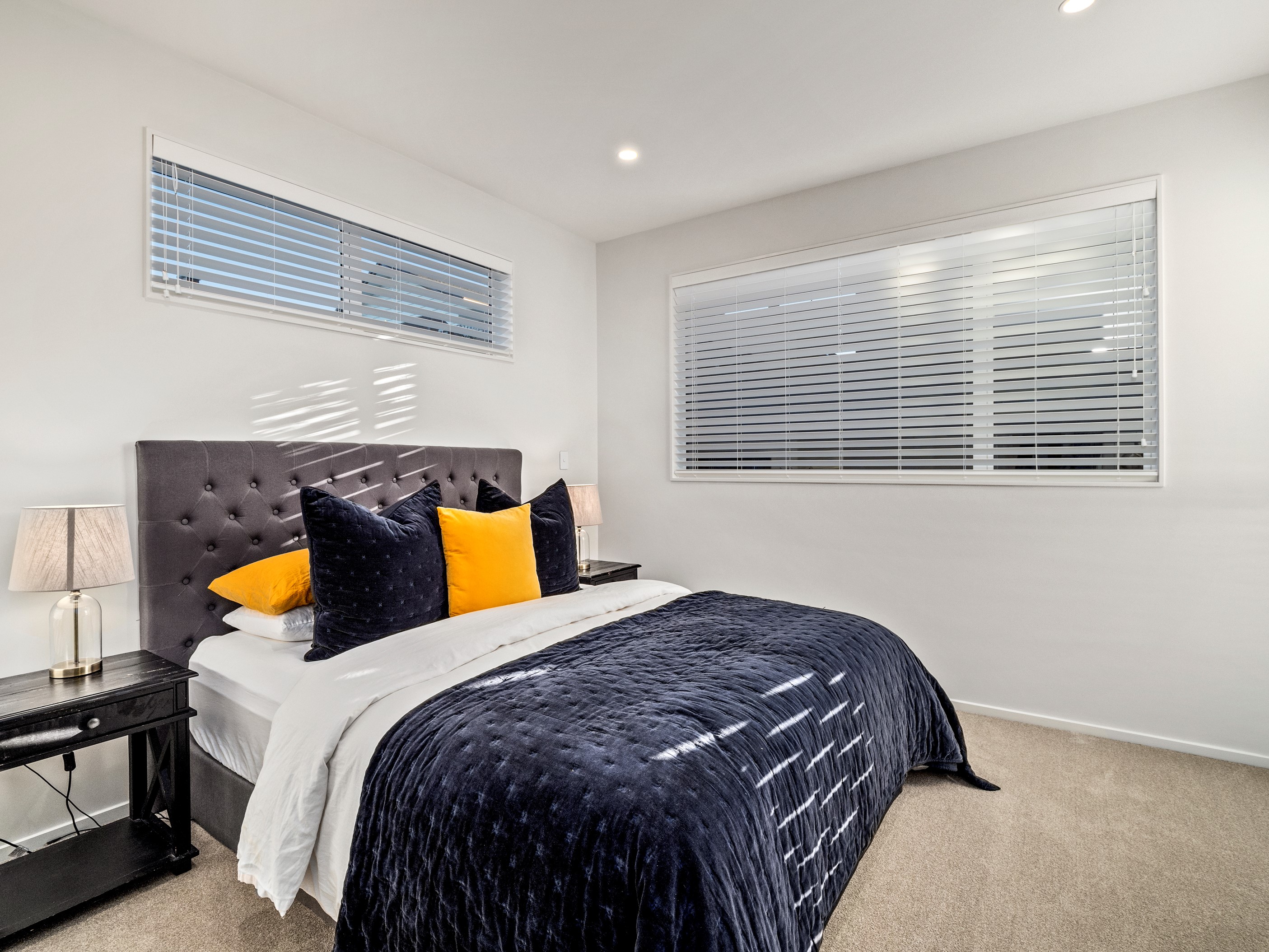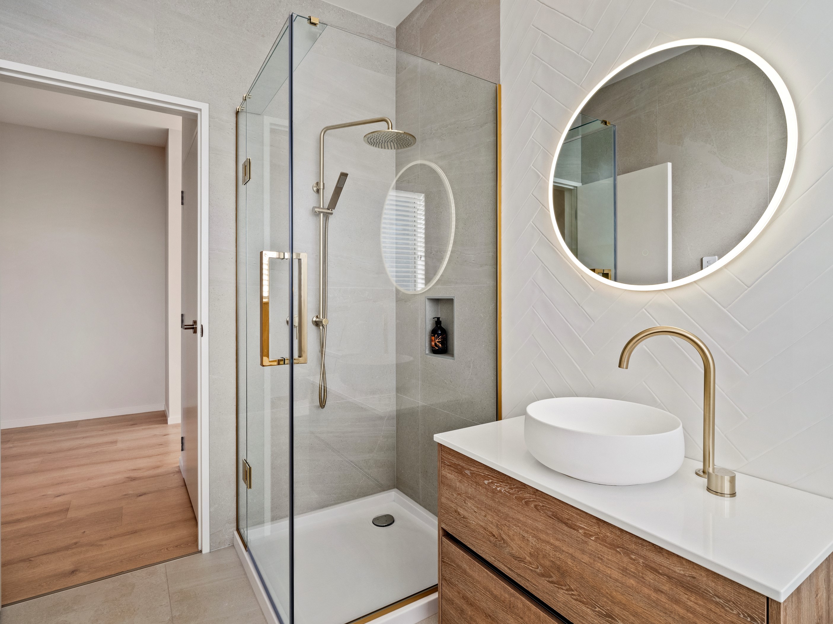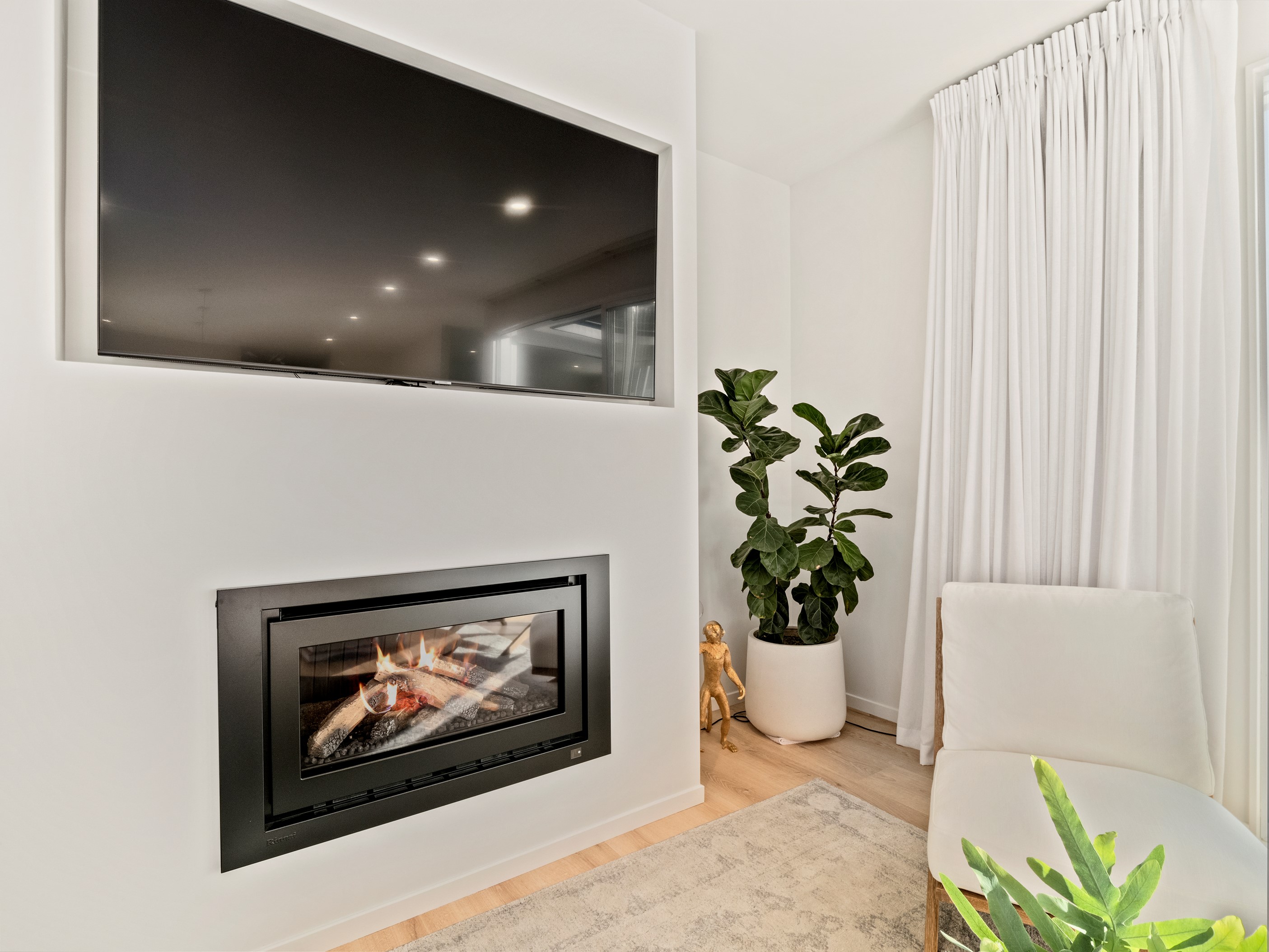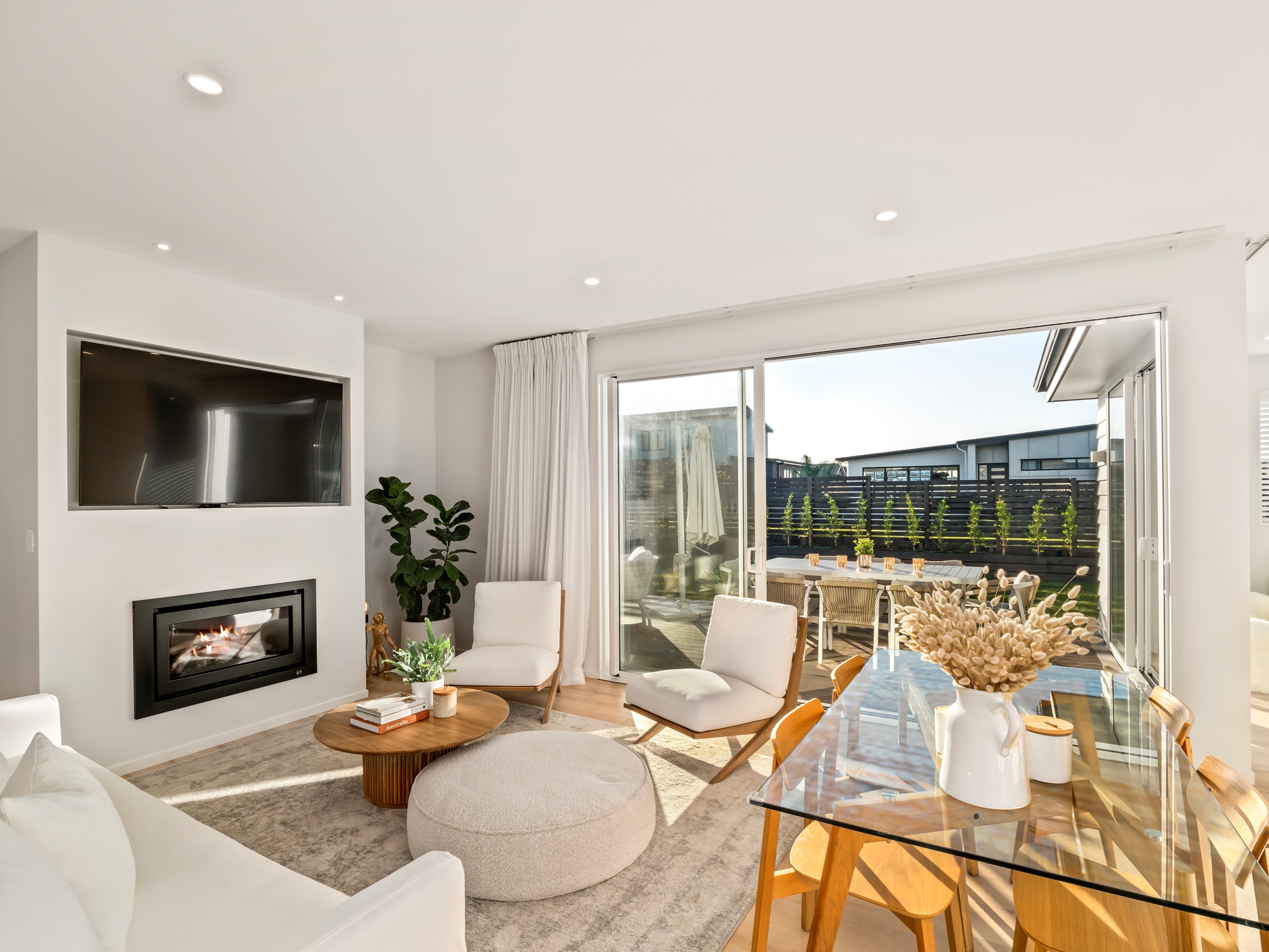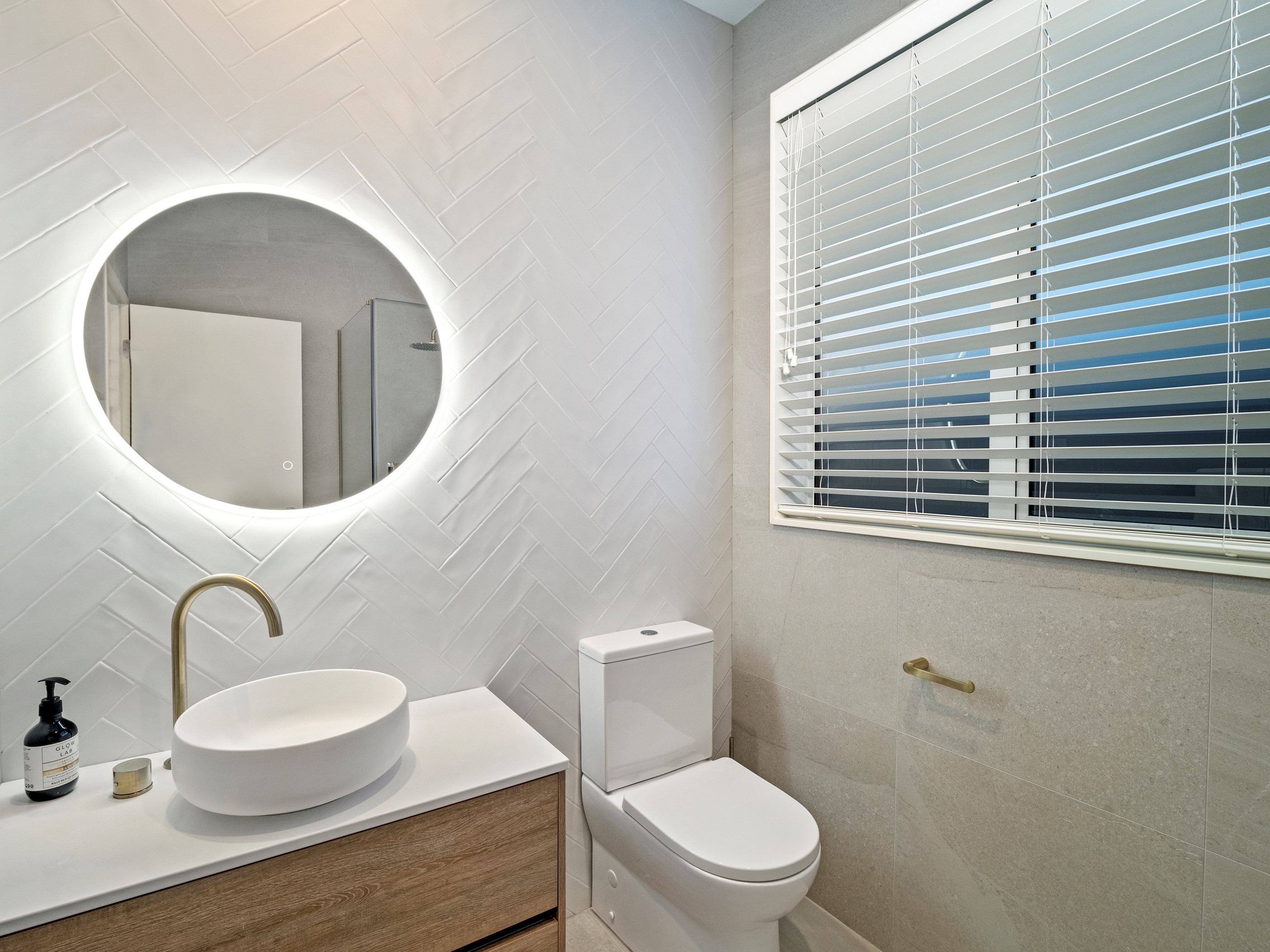 If you’re looking for inspiration in shades of white done well, this 190sqm four-bedroom property is it. A colour consultant had input into this project, and it shows, especially when you step through the front door and into the crisp, light interior. The customised fit-out and decor superbly demonstrate white-on-light style, with warming wood tones in the floor, furniture and bathroom vanities. It also shows that pale can be very interesting indeed. In the streamlined kitchen, for instance, texture and design details can be seen in the splashback, with its herringbone tiles and display shelving. The walk-in pantry is a huge bonus. Textural tiling is repeated in the bathrooms, including the main-bedroom ensuite. In fact, you’ll find tasteful contrasts everywhere. Perhaps the most impressive feature of this single-level family home is the way the two living areas open directly onto a large deck. It’s as if the outdoor entertaining area is part of the house. The exterior is crisp bevel-back weatherboard and brick trimmed with golden shiplap timber, all accented with a dark roof, fascia and garage door.