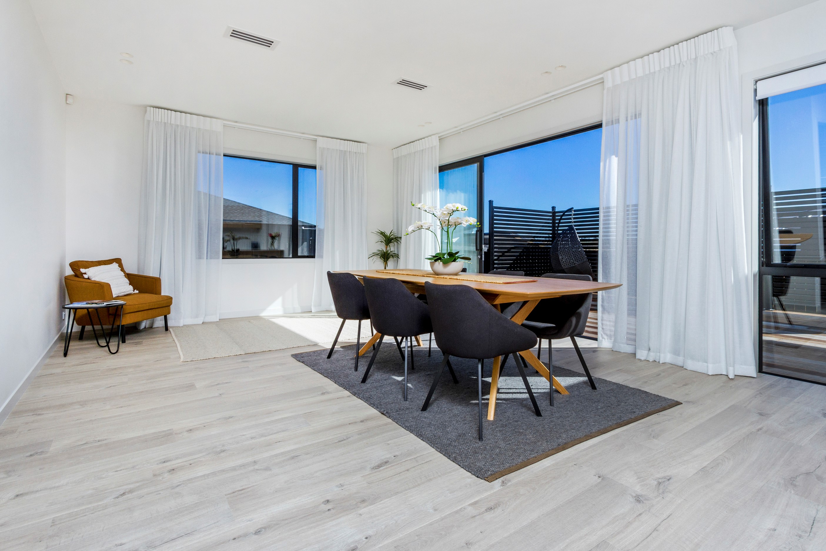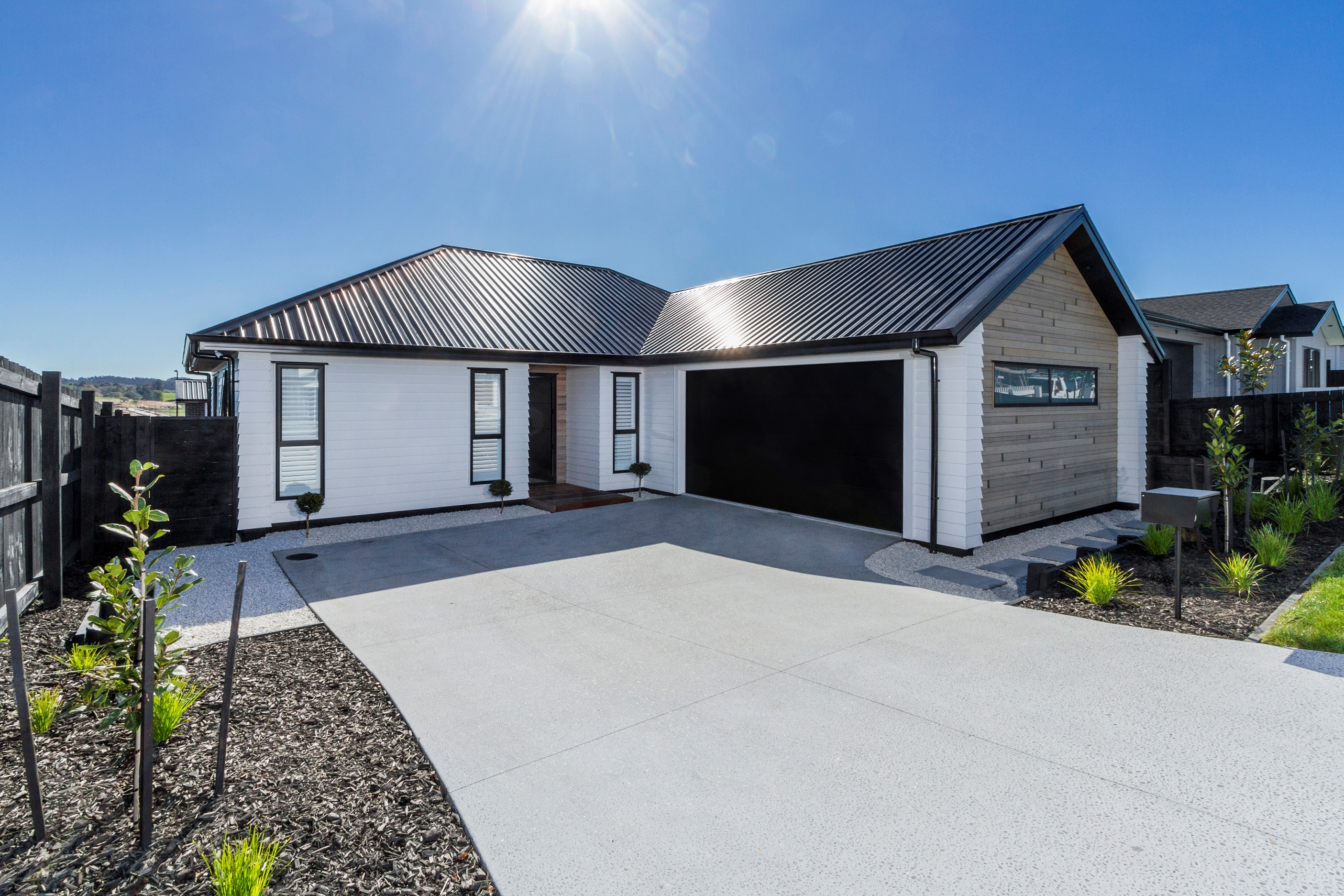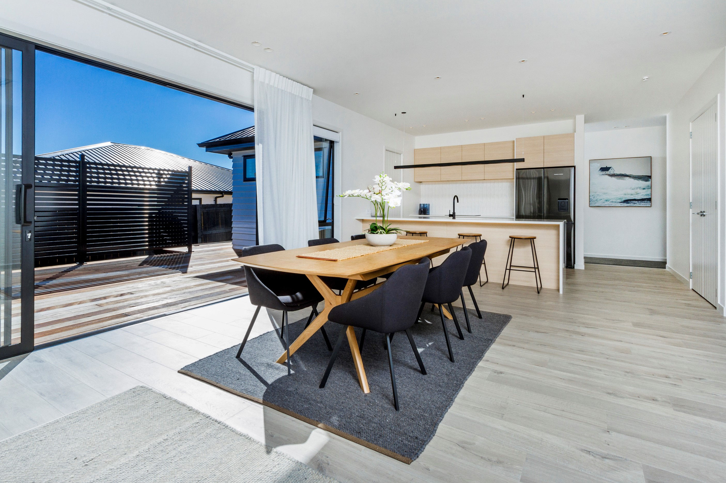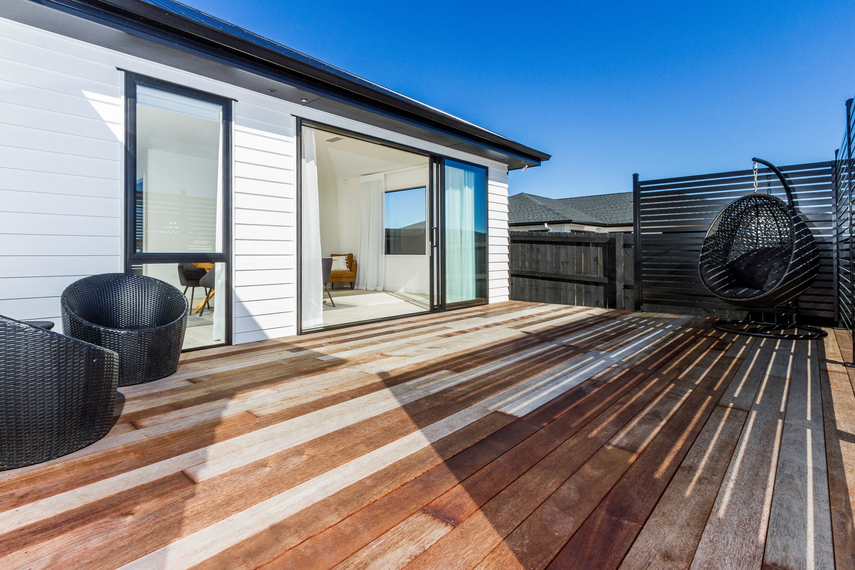 This smart house in Auckland’s northern suburbs is T-shaped. It’s fitting, given that the 170sqm property is tasteful, timeless and illustrates the builders’ talent and attention to detail. It’s also a terrific example of a family home done well. A custom-made horizontal cedar gable front and matching entry hammers home the points. It’s partly the combination of timber weatherboard with dark accents and roofing that gives the four-bedroom home instant street appeal. That charm extends indoors where it’s clear that clever design and positioning maximise all-day sun. What better place to enjoy it than a deck that extends from the living and dining space, as well as the main bedroom. You’ll be surprised by some of the extras on offer. As well as four bedrooms, there’s a home theatre and a barn door crafted in macrocarpa. The latter dovetails nicely with the timber of the furniture and the kitchen cabinetry. You can’t go wrong with a white-and-wood aesthetic. You’ll also find an internal-access double garage with laundry, full-height tiling in the family bathroom and main-bedroom ensuite, a tasteful natural palette and quality fixtures throughout. T is also for top-notch.