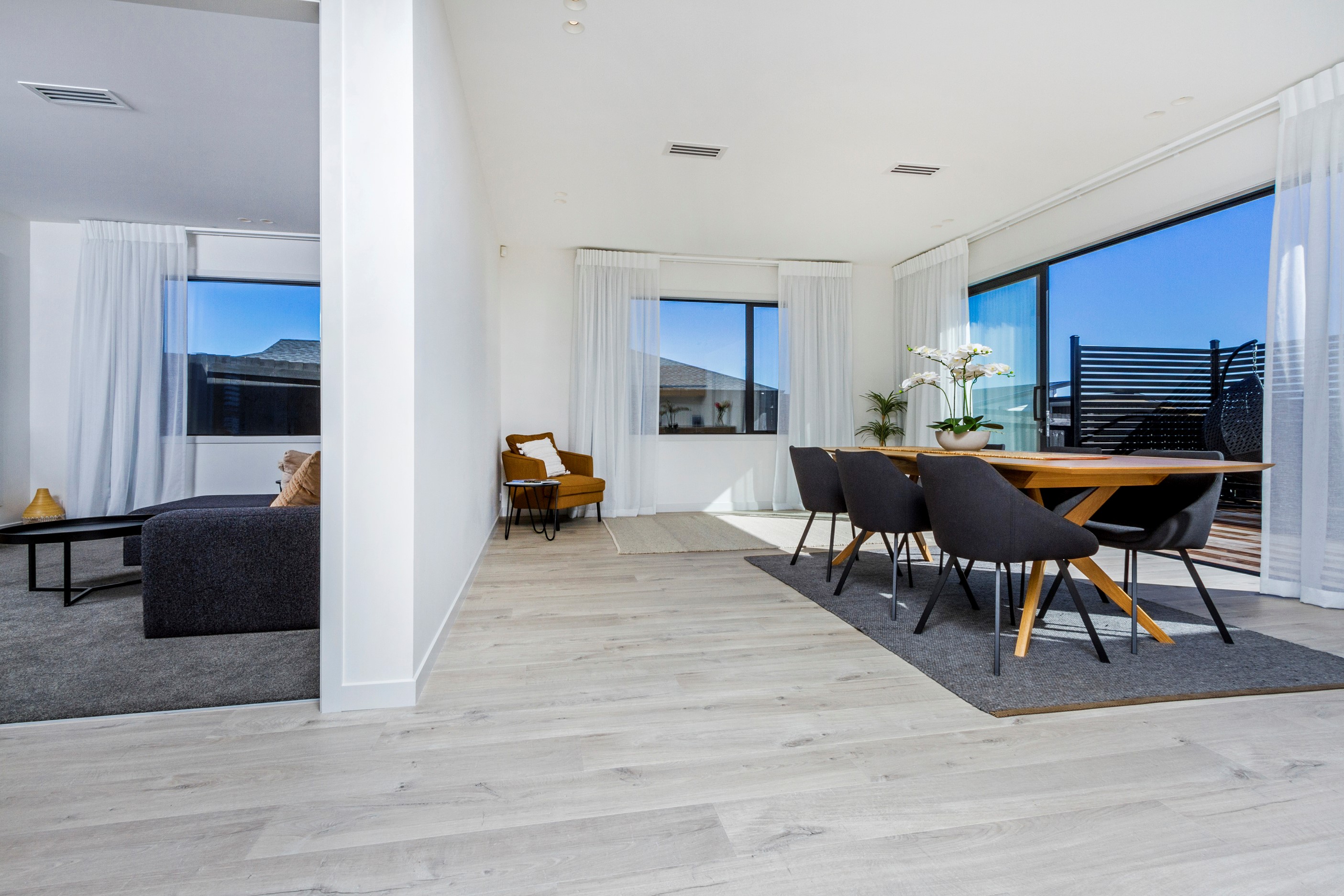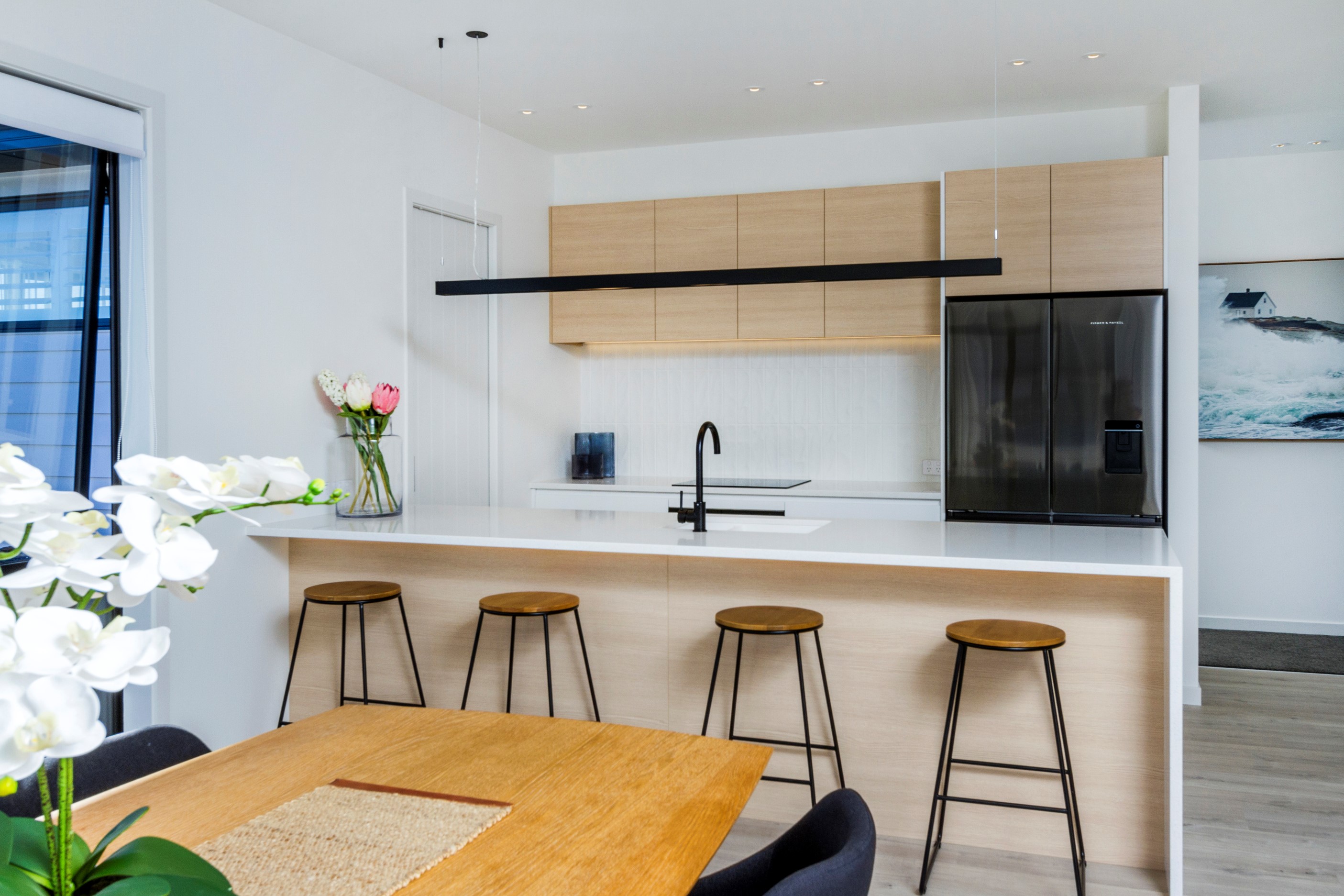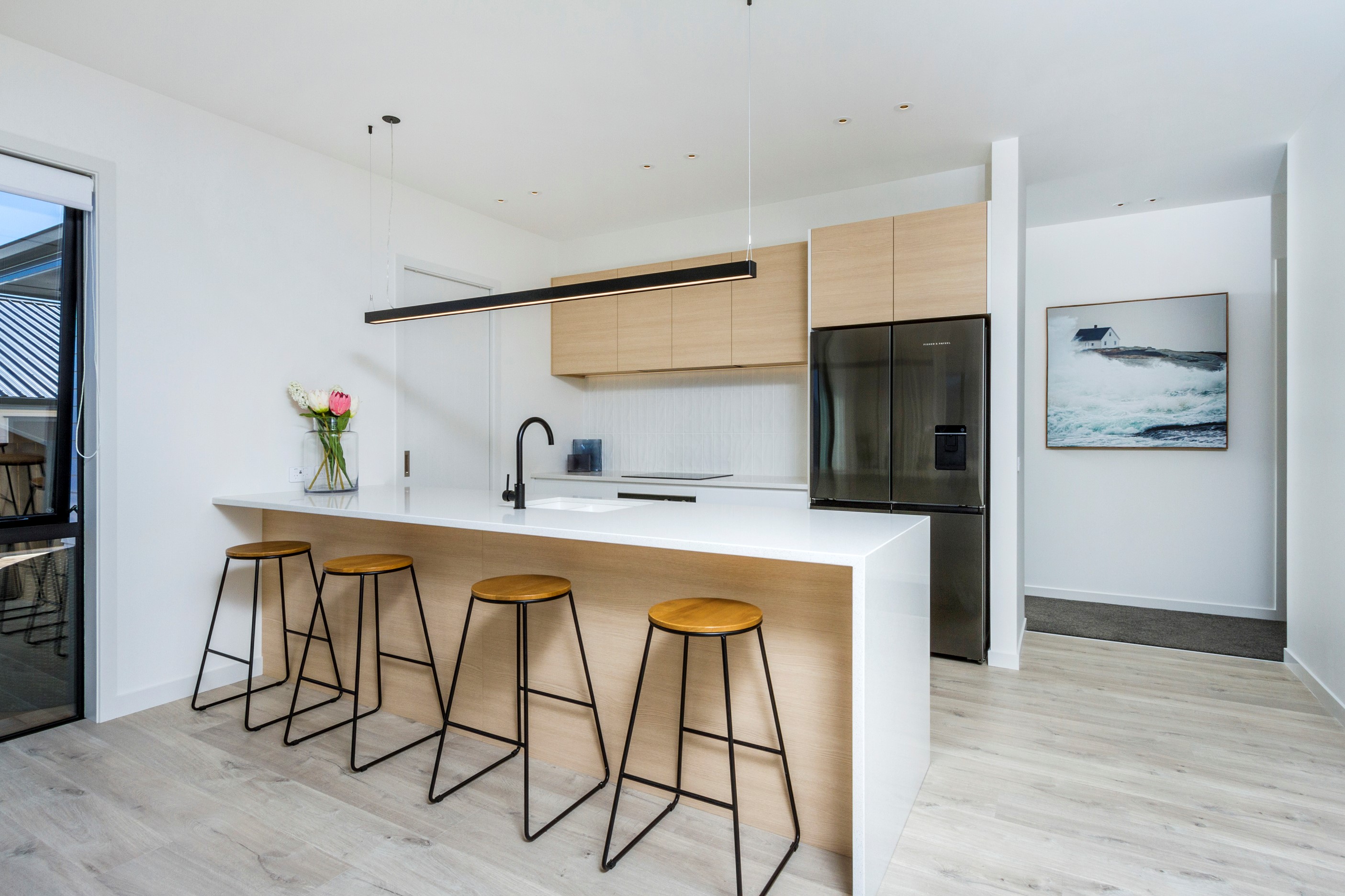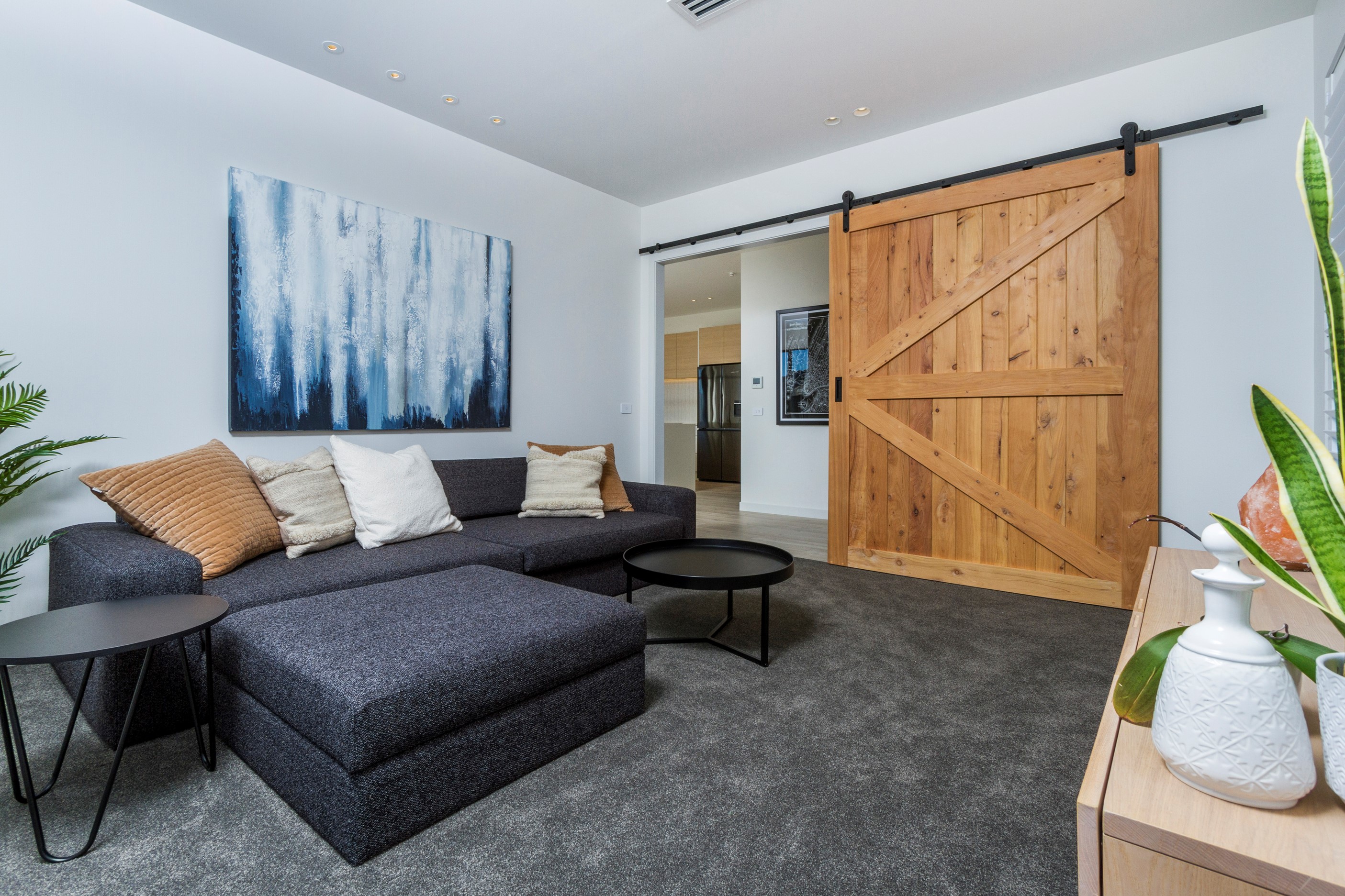 This smart house in Auckland’s northern suburbs is T-shaped. It’s fitting, given that the 170sqm property is tasteful, timeless and illustrates the builders’ talent and attention to detail. It’s also a terrific example of a family home done well. A custom-made horizontal cedar gable front and matching entry hammers home the points. It’s partly the combination of timber weatherboard with dark accents and roofing that gives the four-bedroom home instant street appeal. That charm extends indoors where it’s clear that clever design and positioning maximise all-day sun. What better place to enjoy it than a deck that extends from the living and dining space, as well as the main bedroom. You’ll be surprised by some of the extras on offer. As well as four bedrooms, there’s a home theatre and a barn door crafted in macrocarpa. The latter dovetails nicely with the timber of the furniture and the kitchen cabinetry. You can’t go wrong with a white-and-wood aesthetic. You’ll also find an internal-access double garage with laundry, full-height tiling in the family bathroom and main-bedroom ensuite, a tasteful natural palette and quality fixtures throughout. T is also for top-notch.