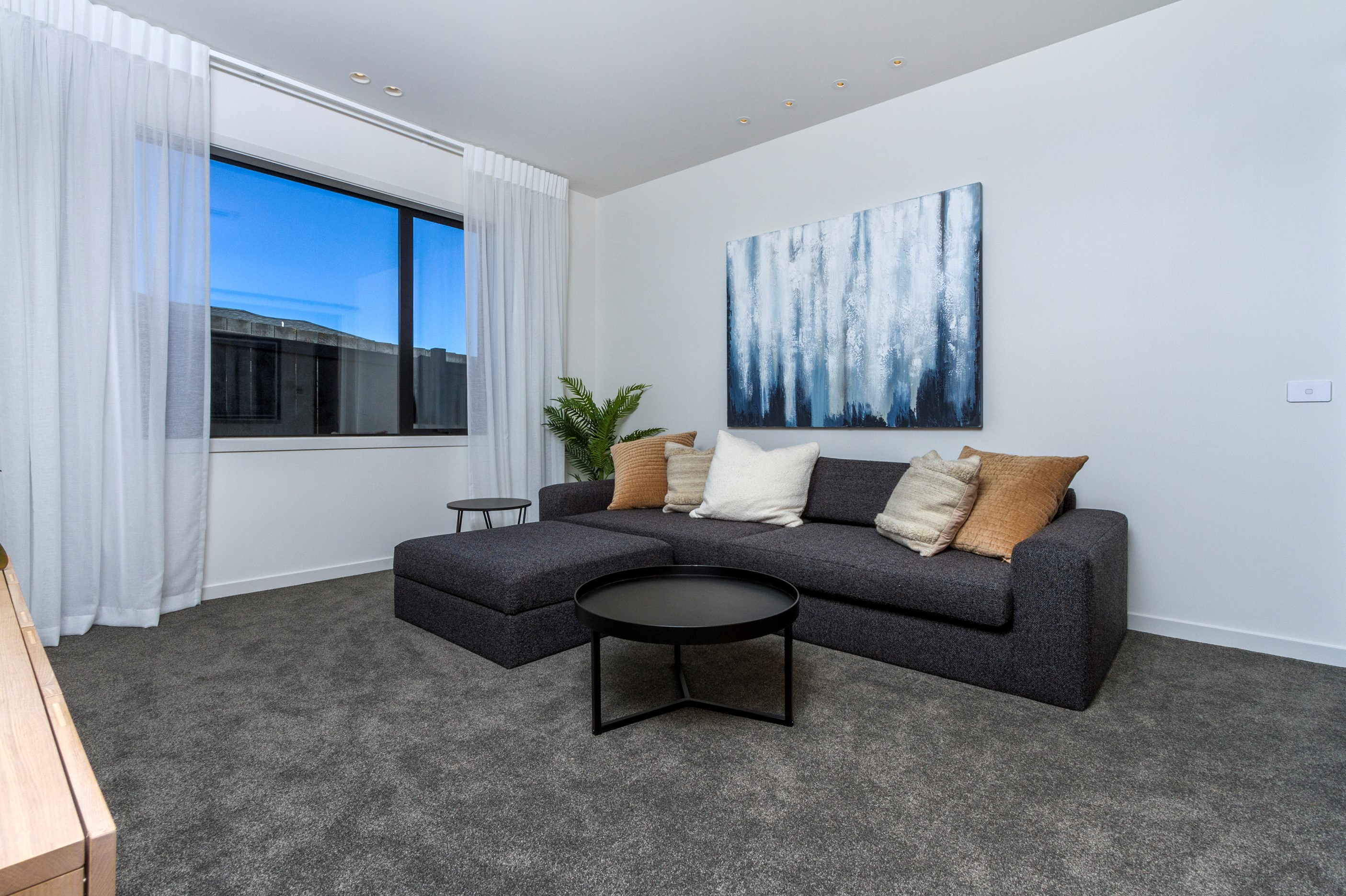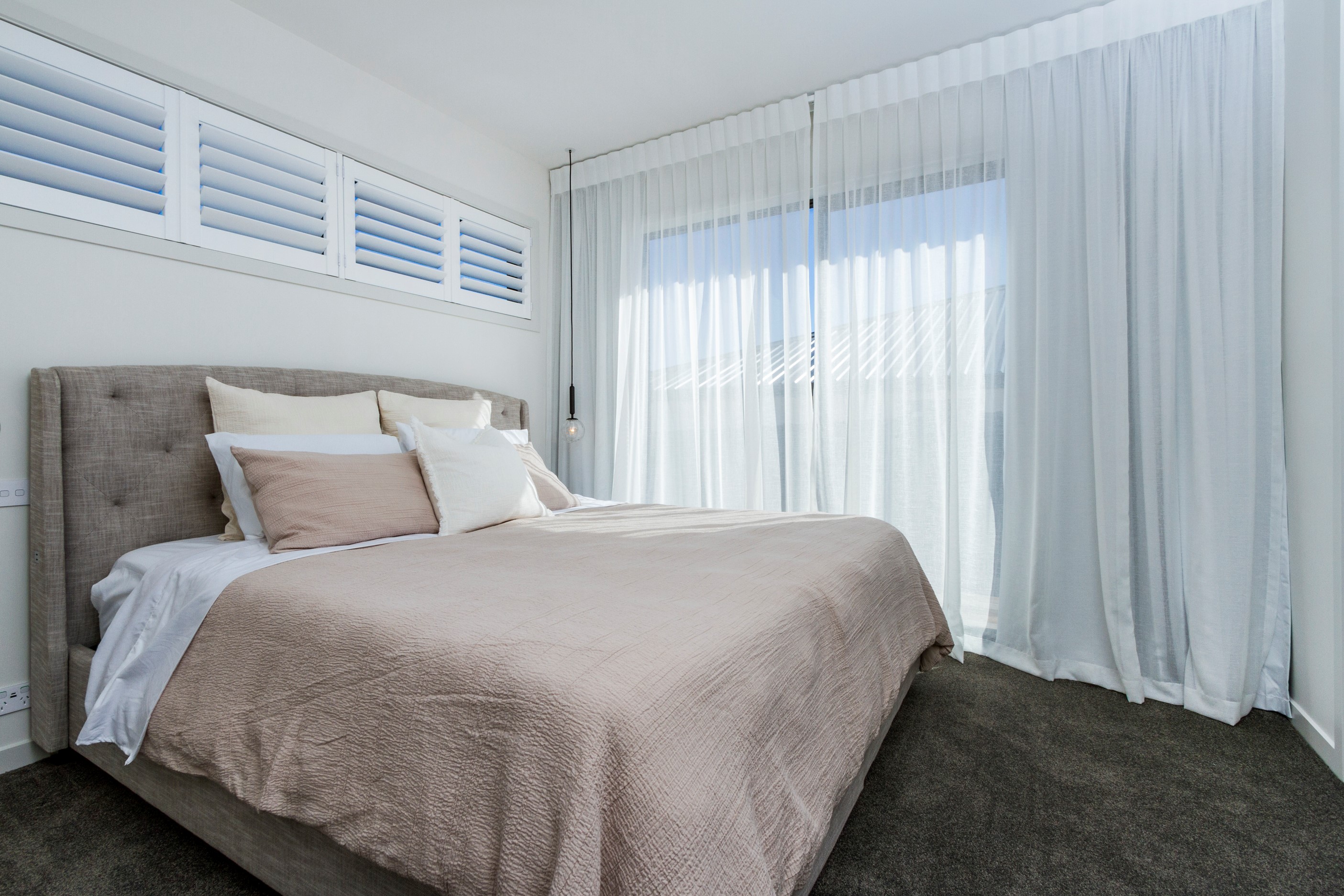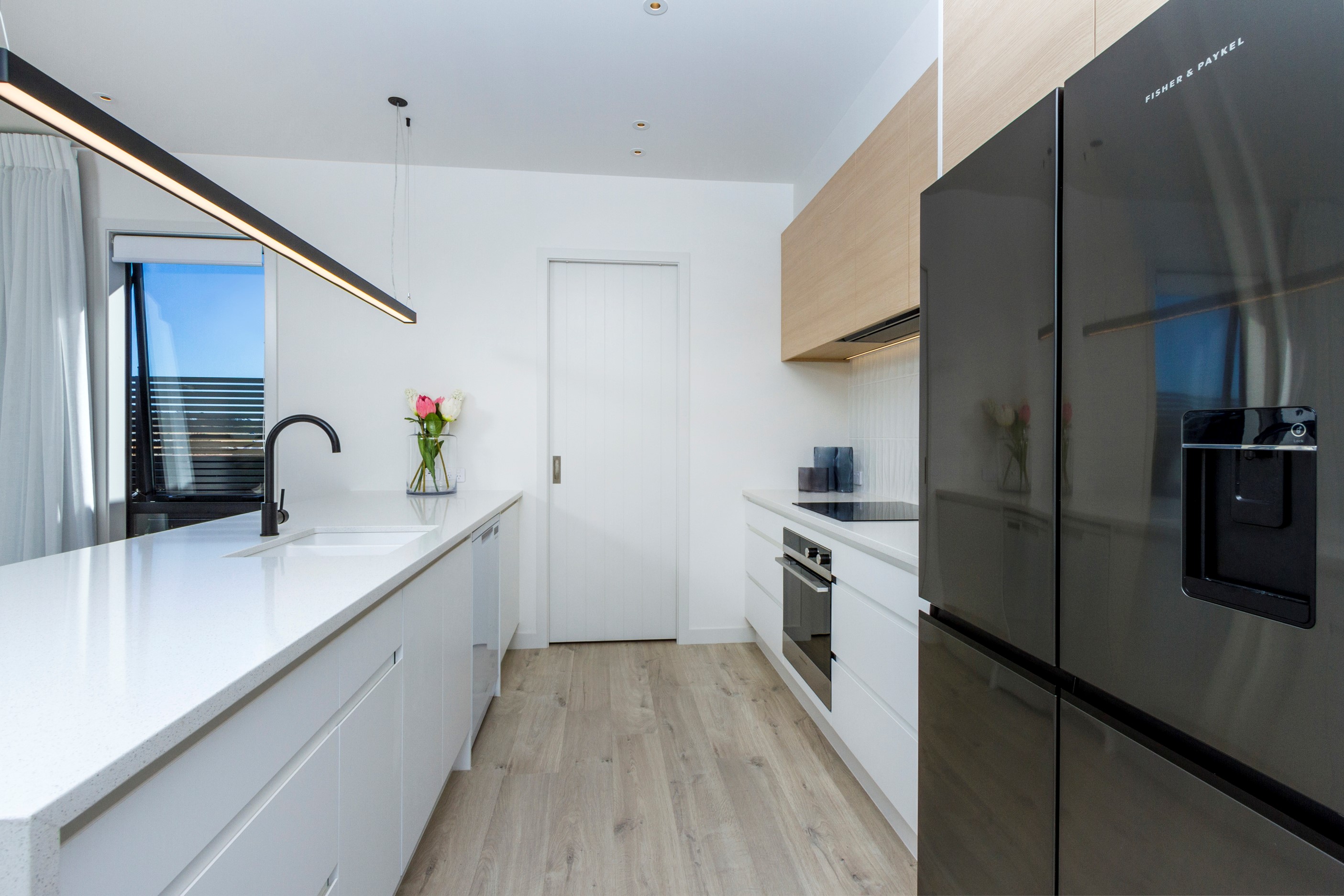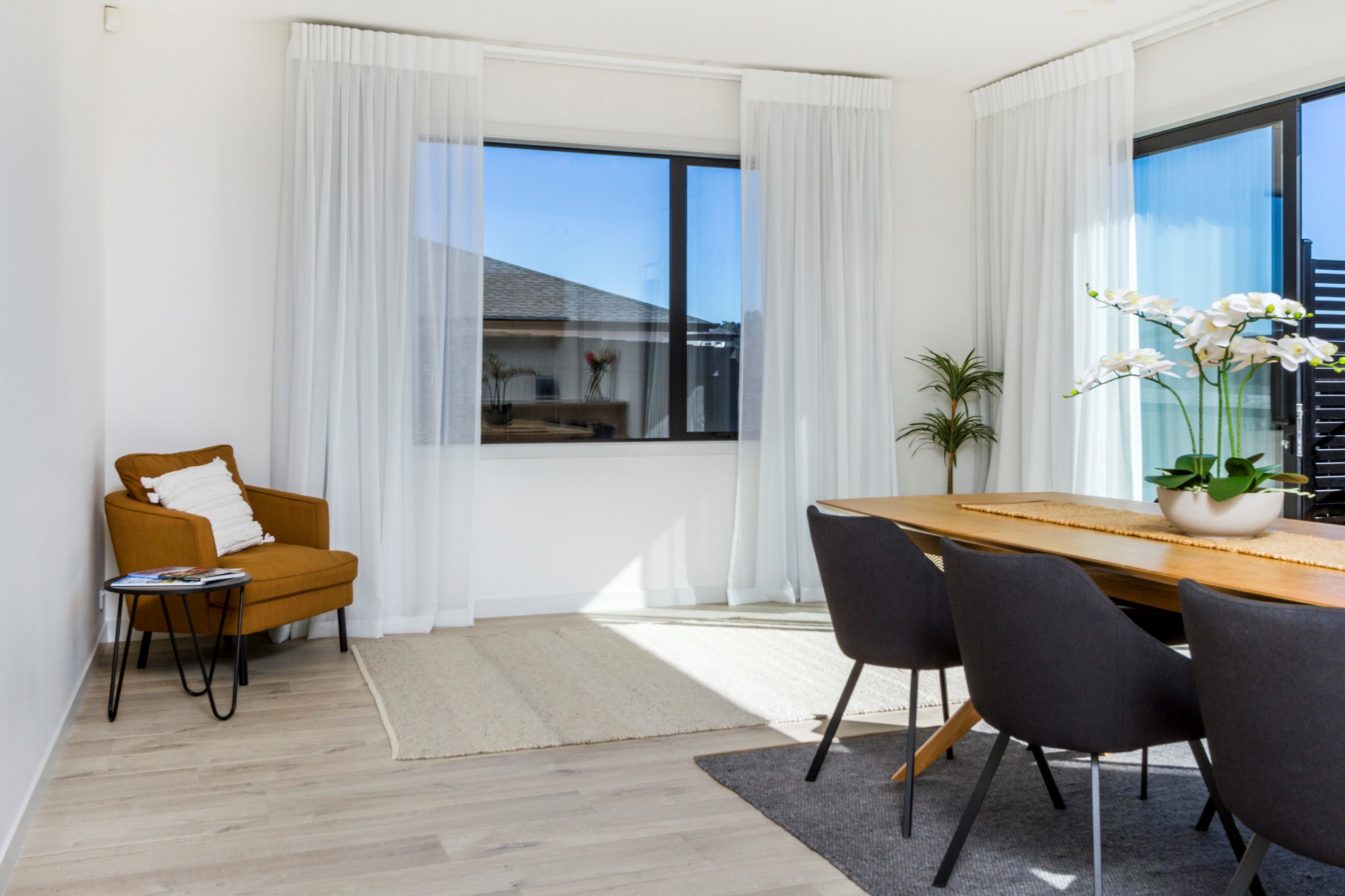 This smart house in Auckland’s northern suburbs is T-shaped. It’s fitting, given that the 170sqm property is tasteful, timeless and illustrates the builders’ talent and attention to detail. It’s also a terrific example of a family home done well. A custom-made horizontal cedar gable front and matching entry hammers home the points. It’s partly the combination of timber weatherboard with dark accents and roofing that gives the four-bedroom home instant street appeal. That charm extends indoors where it’s clear that clever design and positioning maximise all-day sun. What better place to enjoy it than a deck that extends from the living and dining space, as well as the main bedroom. You’ll be surprised by some of the extras on offer. As well as four bedrooms, there’s a home theatre and a barn door crafted in macrocarpa. The latter dovetails nicely with the timber of the furniture and the kitchen cabinetry. You can’t go wrong with a white-and-wood aesthetic. You’ll also find an internal-access double garage with laundry, full-height tiling in the family bathroom and main-bedroom ensuite, a tasteful natural palette and quality fixtures throughout. T is also for top-notch.