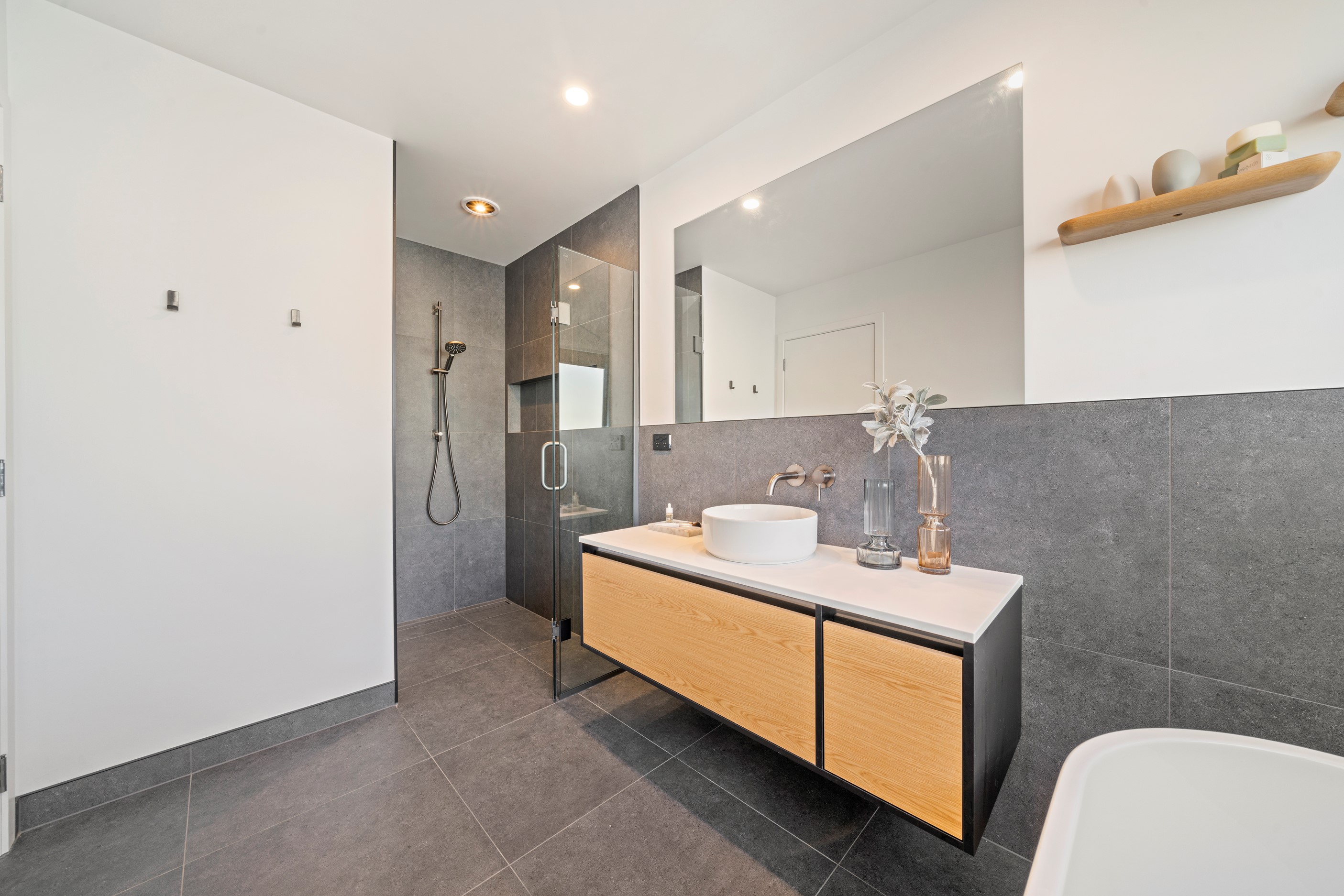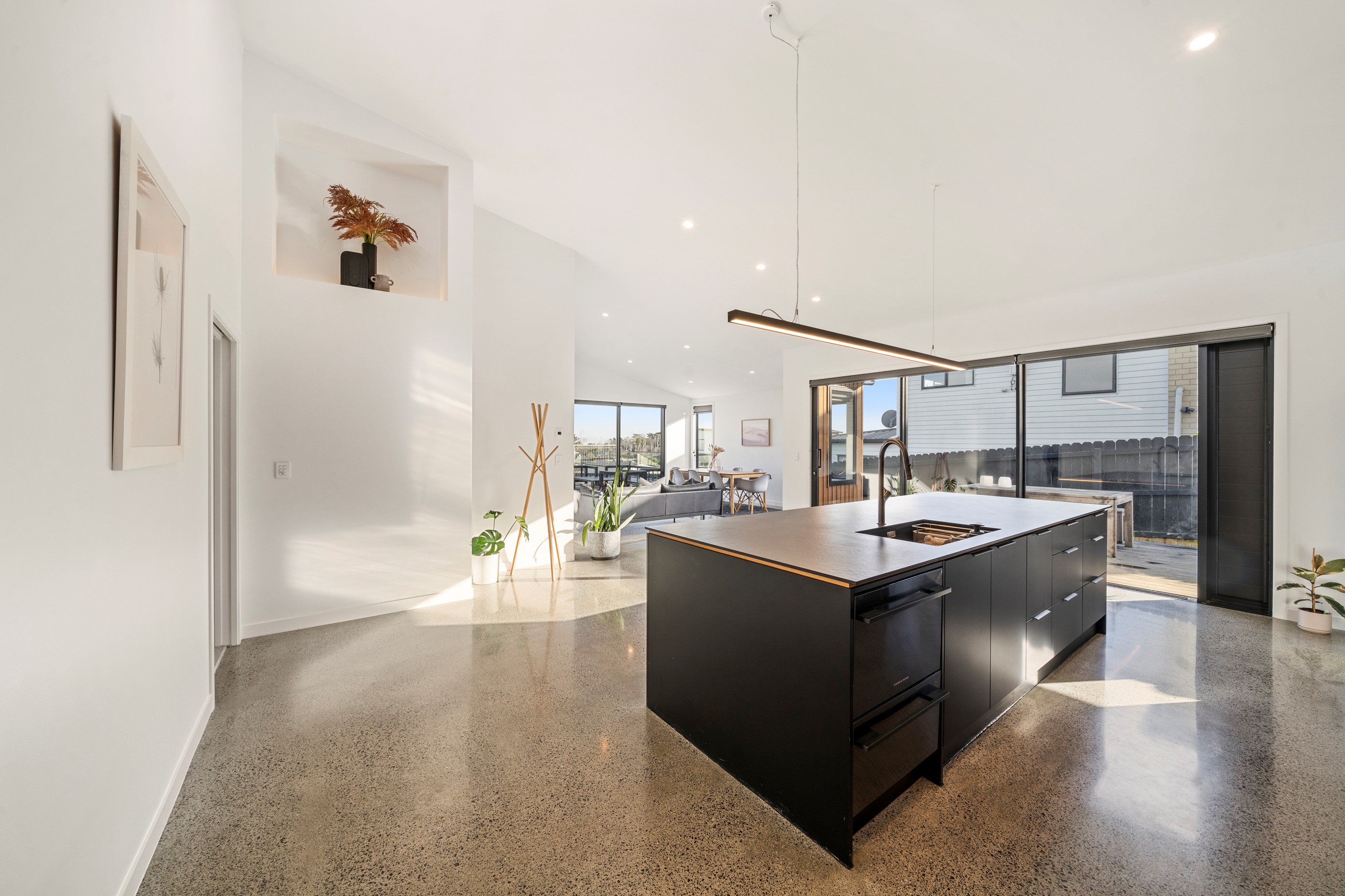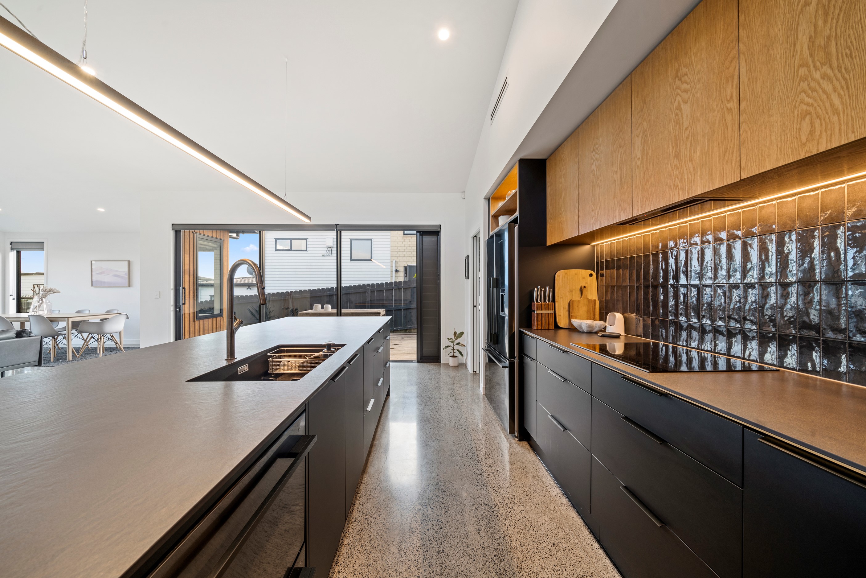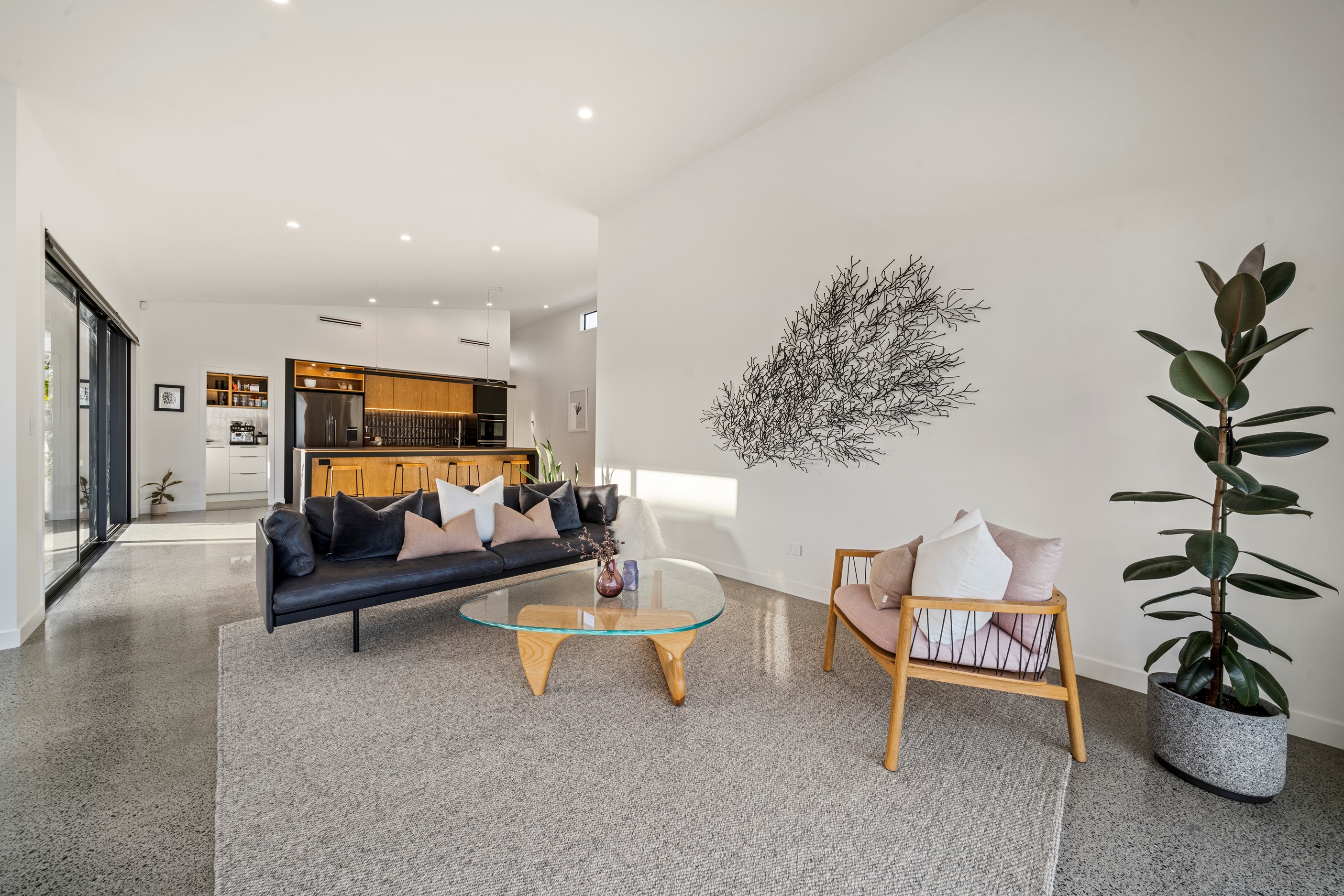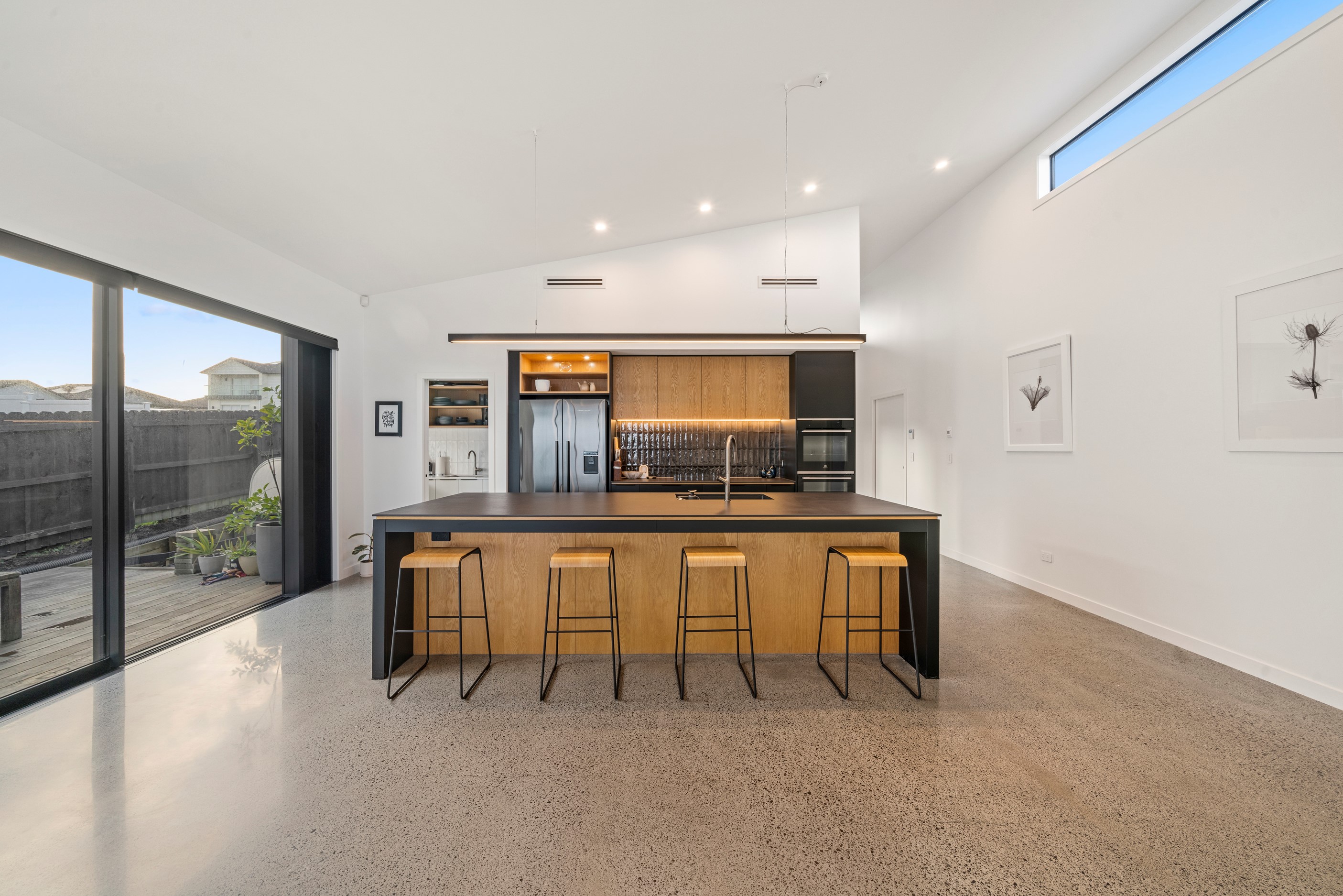 When builders pay attention to every tiny detail, the result is a high-end home that doesn’t cost the earth. Although in this 236sqm house, which nails the point spectacularly, the earth is front and centre. The owners designed it with sustainability in mind, strategically placing windows to maximise sun and warmth, future-proofing with wiring for solar panels, and opting for natural products wherever possible. The four-bedroom north-facing entertainer is built for modern family living, and is a showpiece for craftsmanship, inside and out. Street appeal is achieved with black grooved panelling and timber cladding, the latter being skilfully applied to the garage door. Inside, the open-plan living is in tasteful tones that echo the exterior, and has custom-built timber cabinetry and raked ceilings. Ranch sliders with flush joinery open to decking with glass balustrades for unobstructed sea views. A high-spec kitchen carries on the natural theme with a Dekton benchtop and American oak features. In the main bedroom, you’ll find a built-in headboard, and windows that take in those views, and both bathrooms have fully tiled showers. Central air conditioning and heated polished concrete floors keep things comfy.