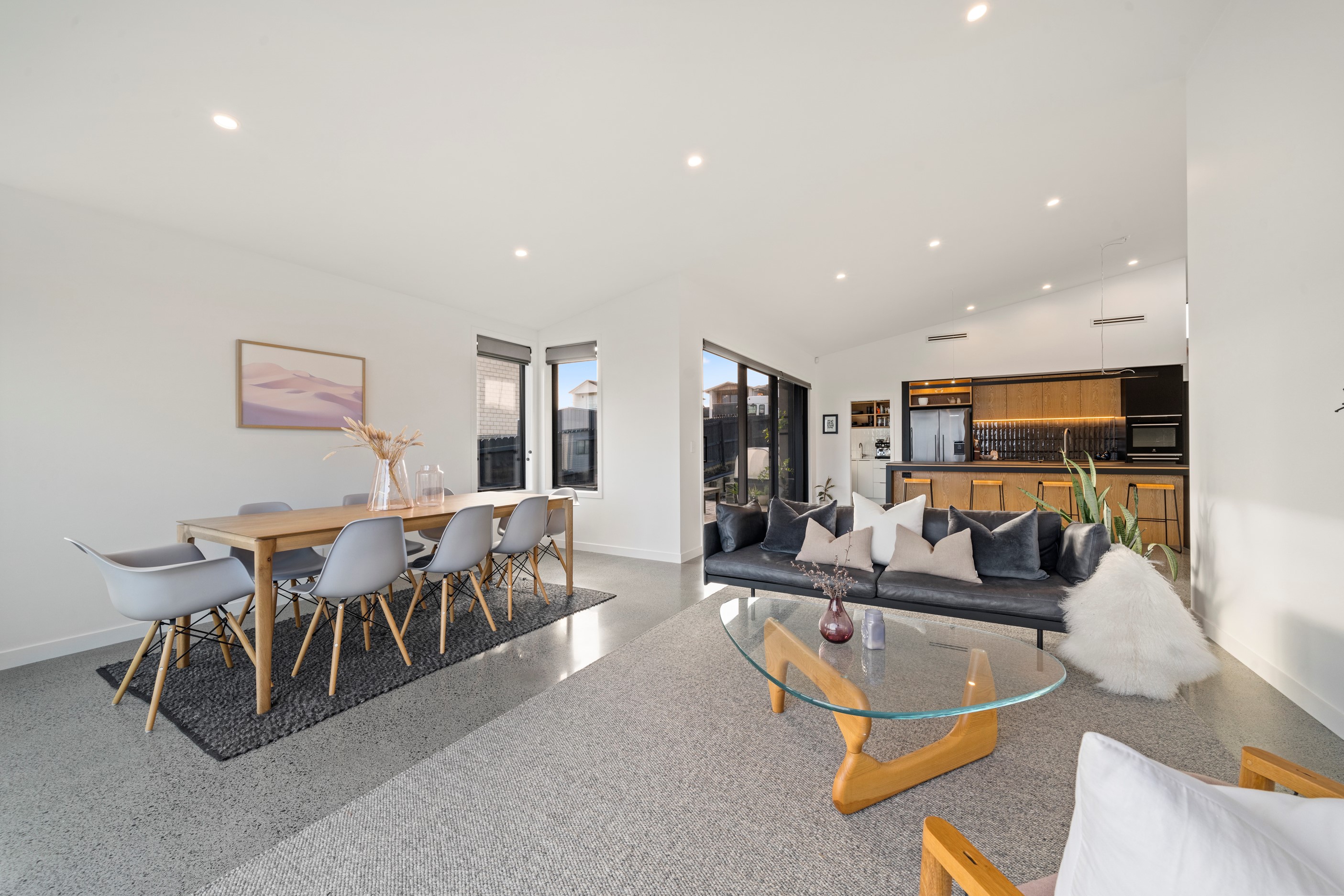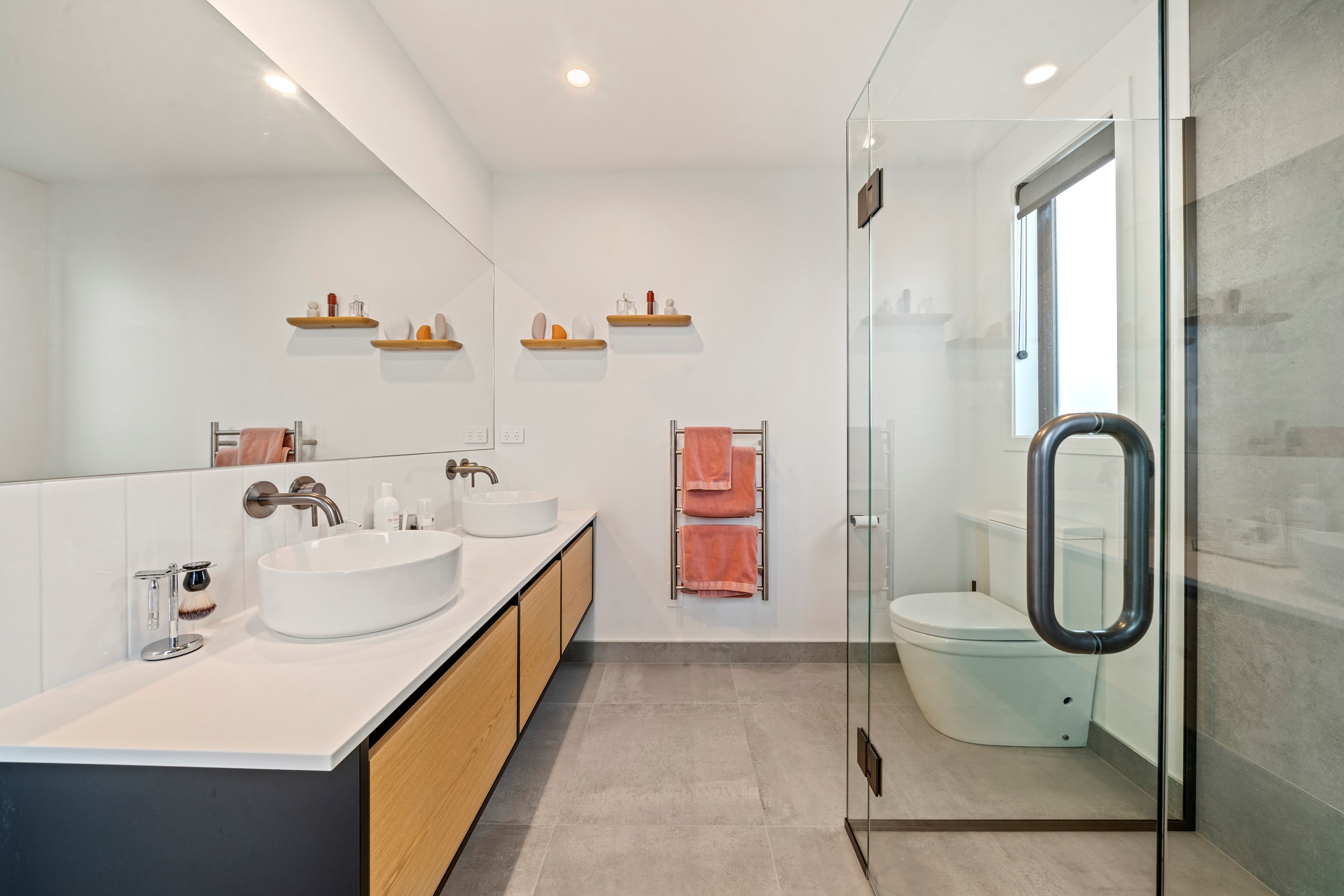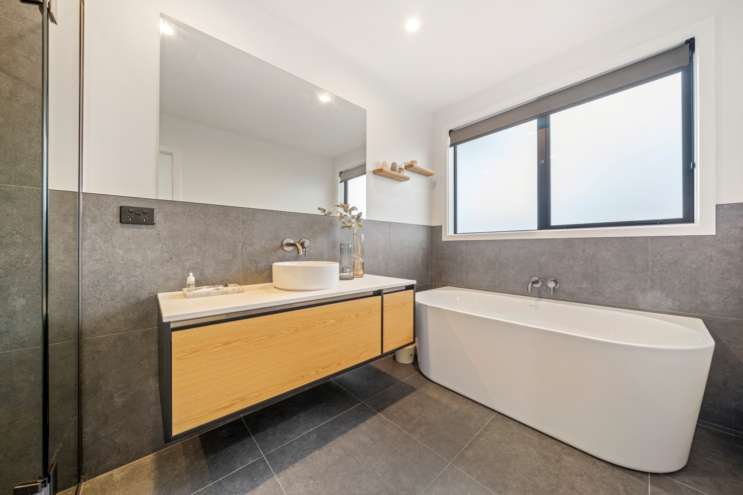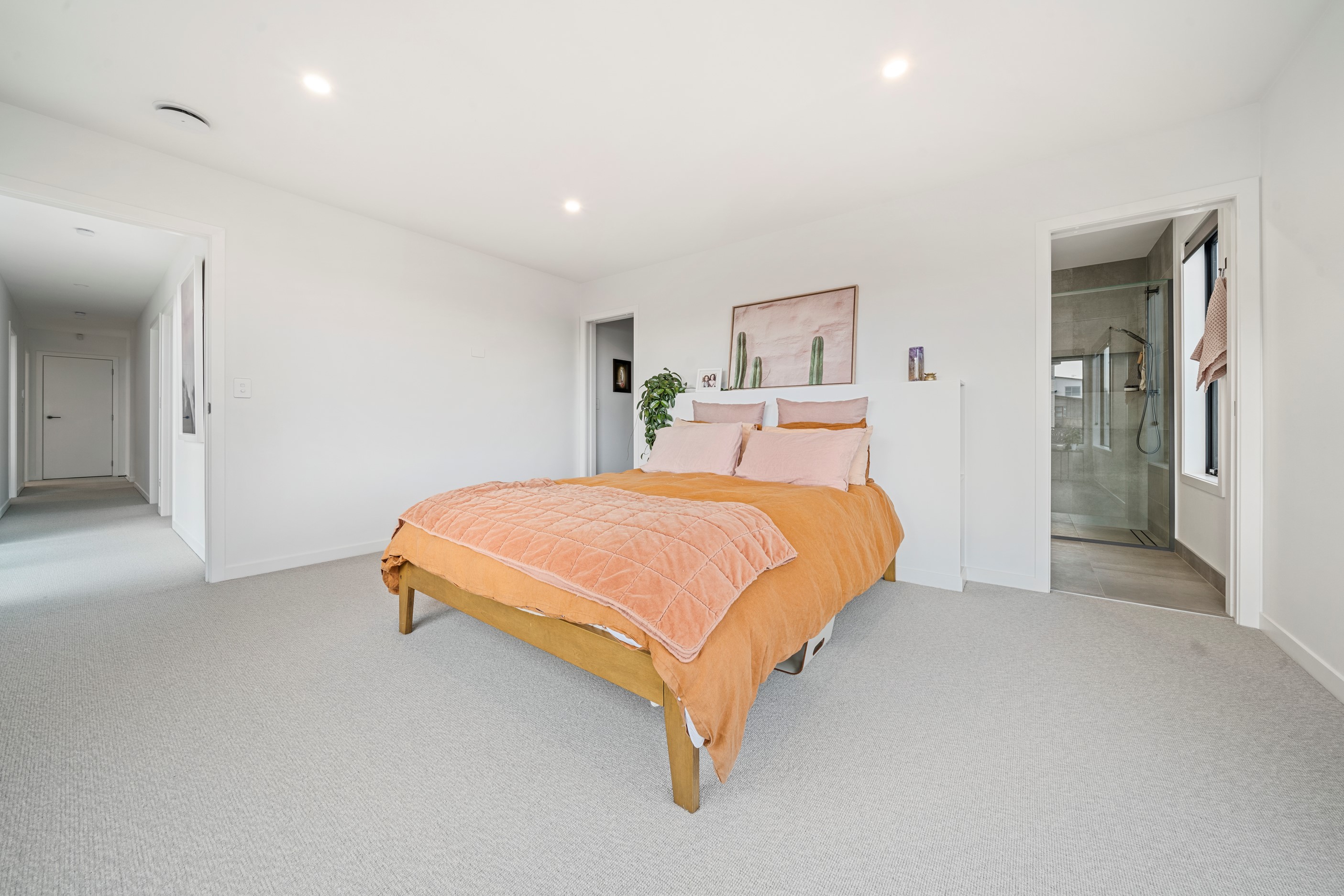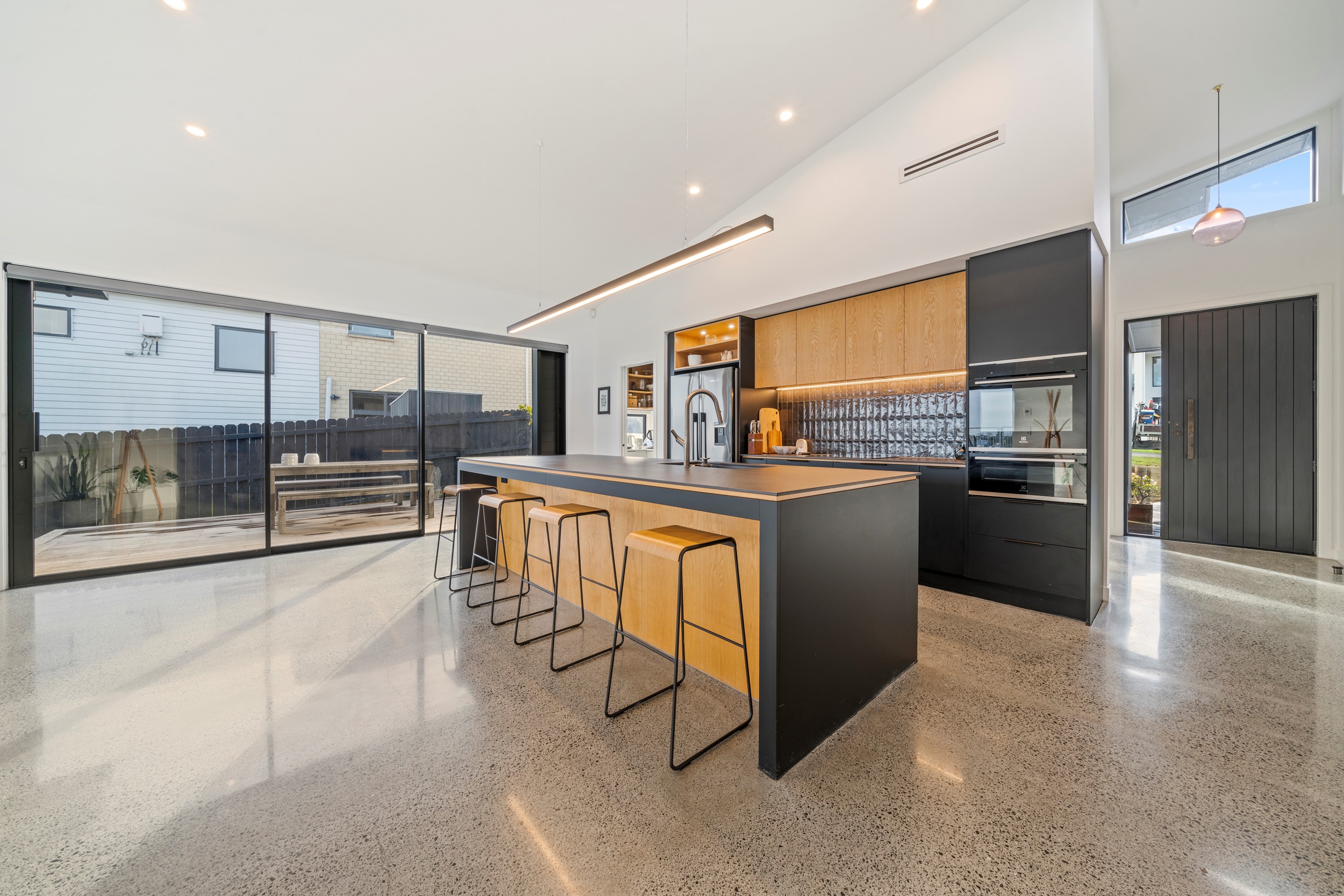 When builders pay attention to every tiny detail, the result is a high-end home that doesn’t cost the earth. Although in this 236sqm house, which nails the point spectacularly, the earth is front and centre. The owners designed it with sustainability in mind, strategically placing windows to maximise sun and warmth, future-proofing with wiring for solar panels, and opting for natural products wherever possible. The four-bedroom north-facing entertainer is built for modern family living, and is a showpiece for craftsmanship, inside and out. Street appeal is achieved with black grooved panelling and timber cladding, the latter being skilfully applied to the garage door. Inside, the open-plan living is in tasteful tones that echo the exterior, and has custom-built timber cabinetry and raked ceilings. Ranch sliders with flush joinery open to decking with glass balustrades for unobstructed sea views. A high-spec kitchen carries on the natural theme with a Dekton benchtop and American oak features. In the main bedroom, you’ll find a built-in headboard, and windows that take in those views, and both bathrooms have fully tiled showers. Central air conditioning and heated polished concrete floors keep things comfy.