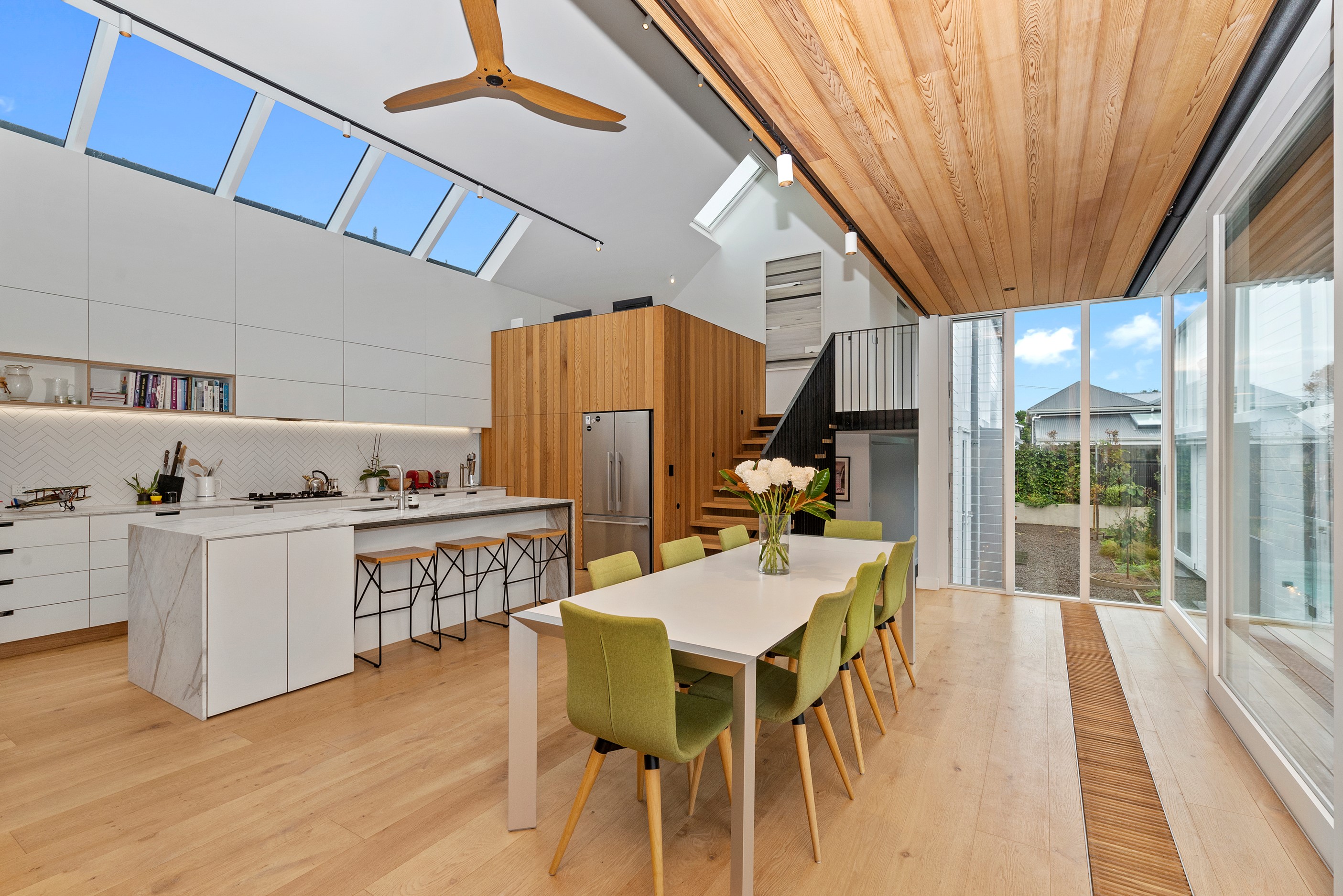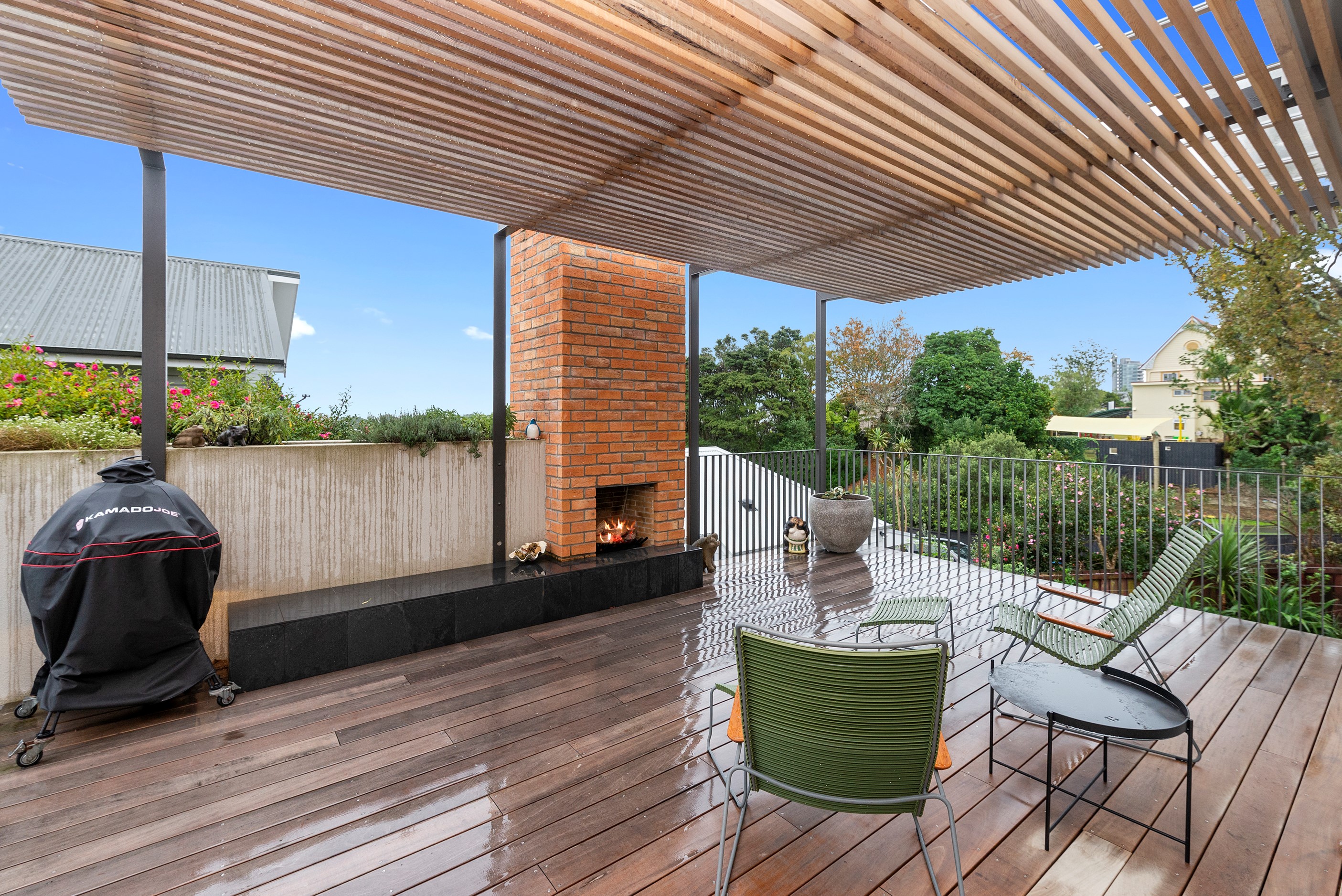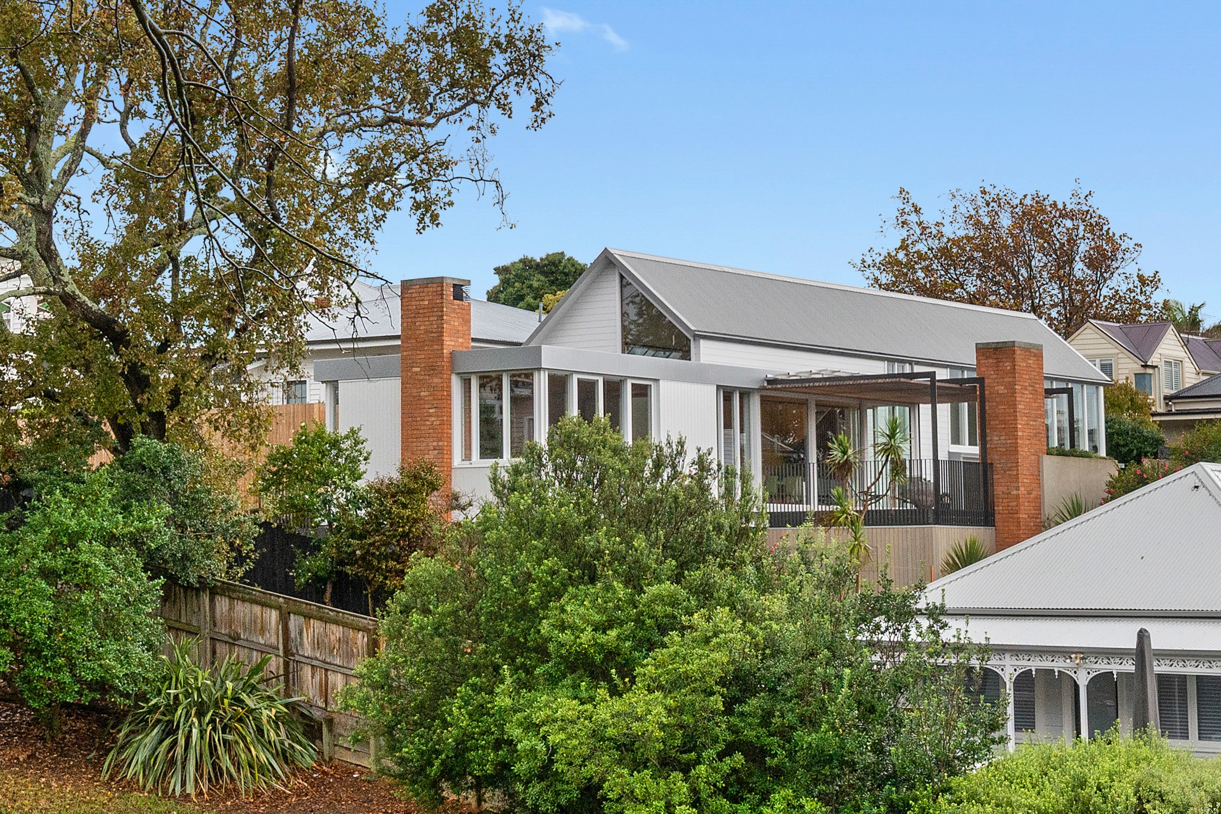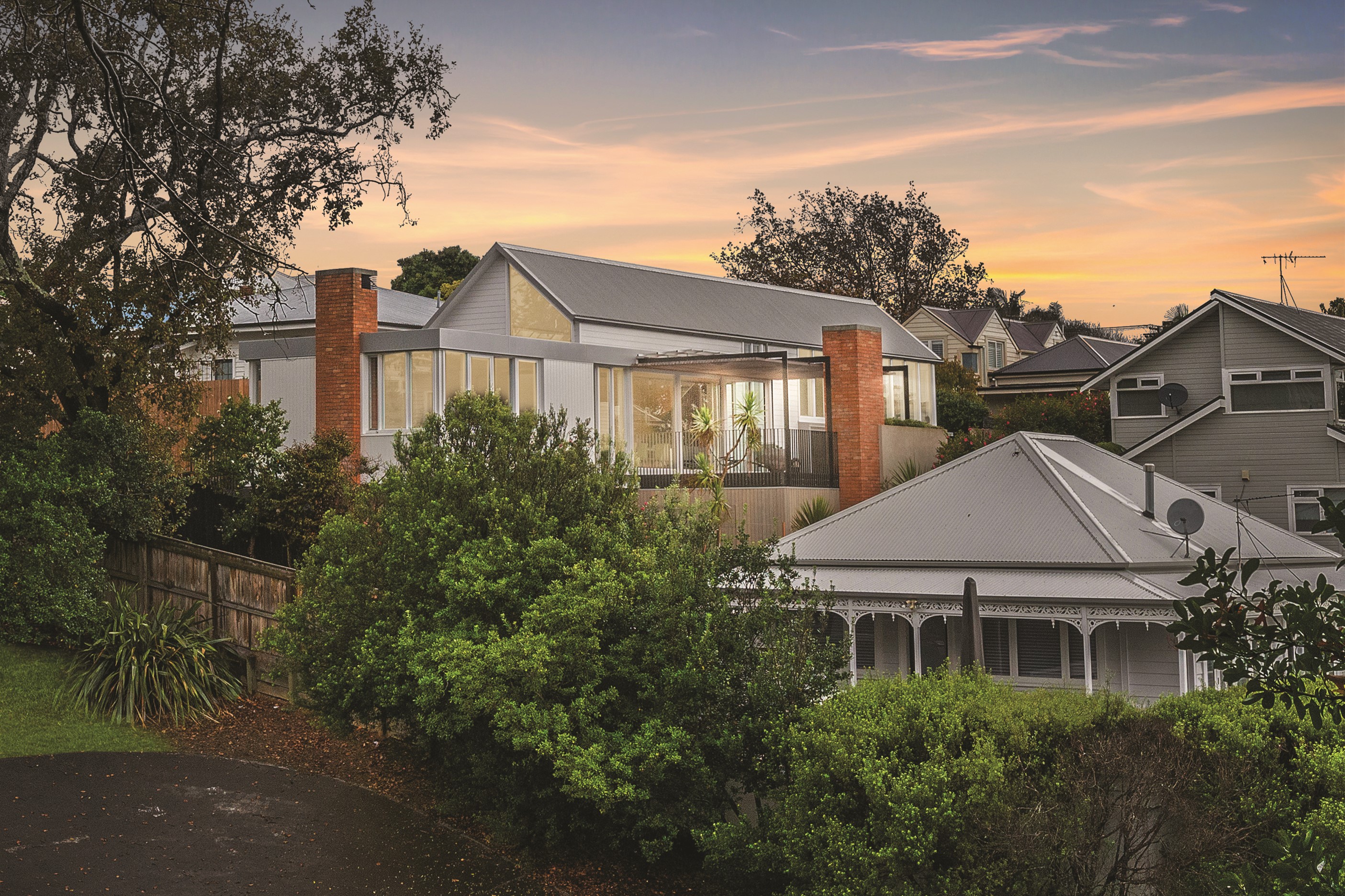 Every available square metre of challenging terrain has been used in crafting this high-end architect-designed home in one of the city’s central suburbs. The tricky narrow site was just one of the challenges that needed overcoming to bring the owners’ vision to life. The results speak volumes. In this 260sqm home, two intersecting geometric forms culminate in three levels, copious light, a series of contained outdoor spaces and views to the Waitākere Ranges. The outlook over the concrete swimming pool, landscaping and park is pretty impressive too. Quality, locally sourced materials have been used here – horizontal and vertical weatherboard – and the result is a first-class finish. The interior palette is restrained: timber floors, ceilings, stairs and feature walls against a white backdrop. Brick adds a layer of warmth and a sense of connection to the heritage suburb the three-bedroom, two-bathroom home inhabits. You’ll also see bespoke extras, including a wine cellar and wrought-iron balustrade, as well as deviations from the neutral script, such as teal subway tiles in a bathroom. Custom-made flashings and gutters press home the point that these builders are at the top of their game.