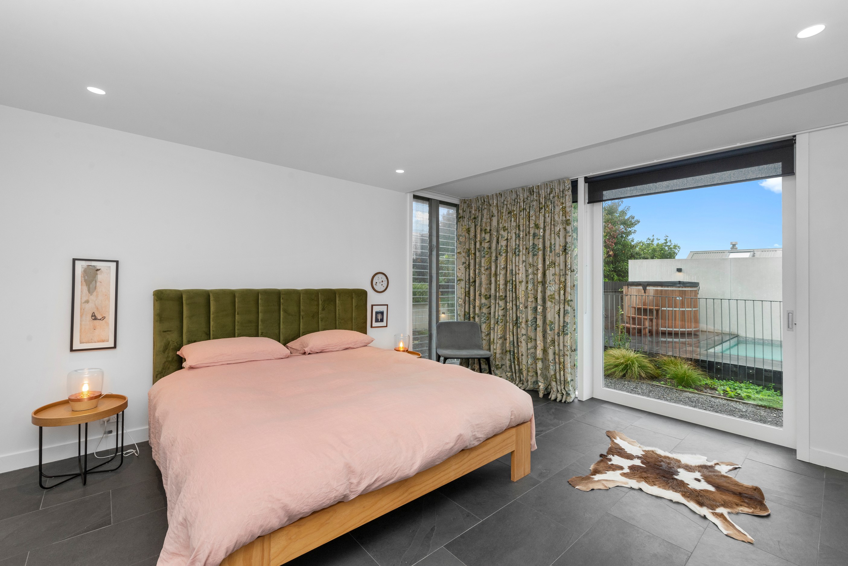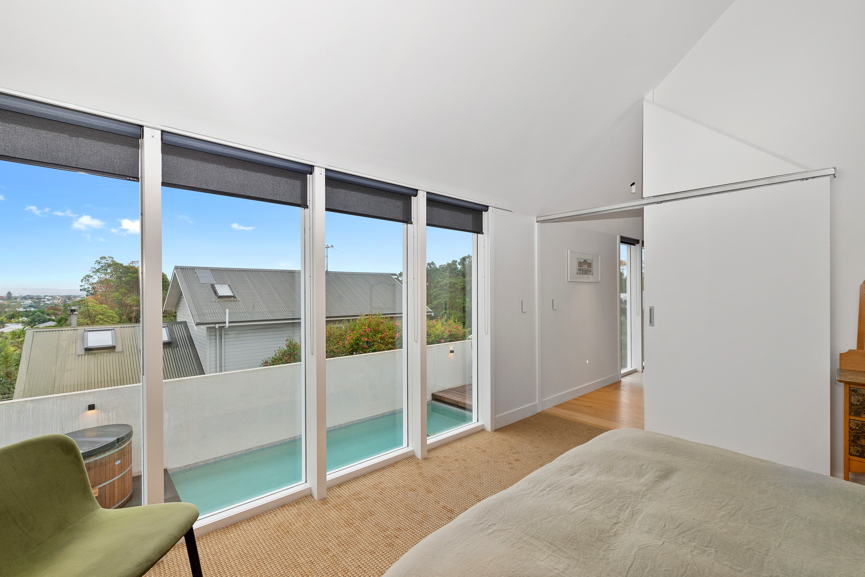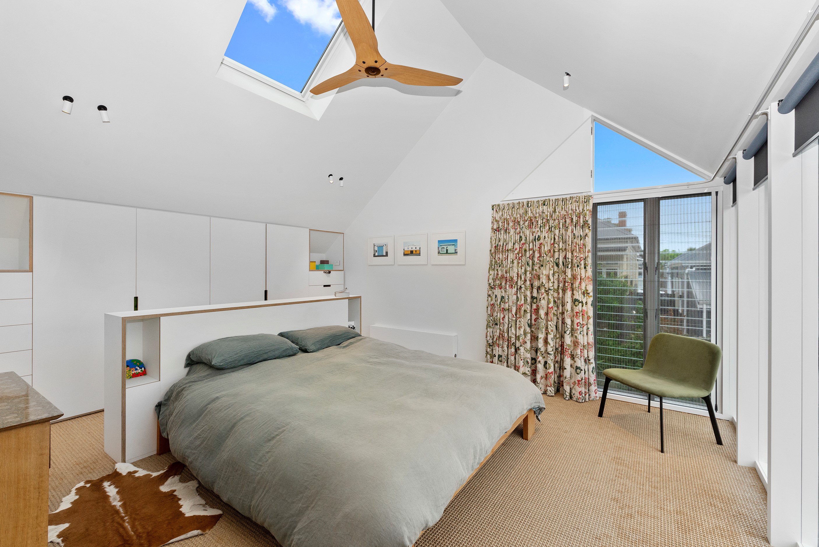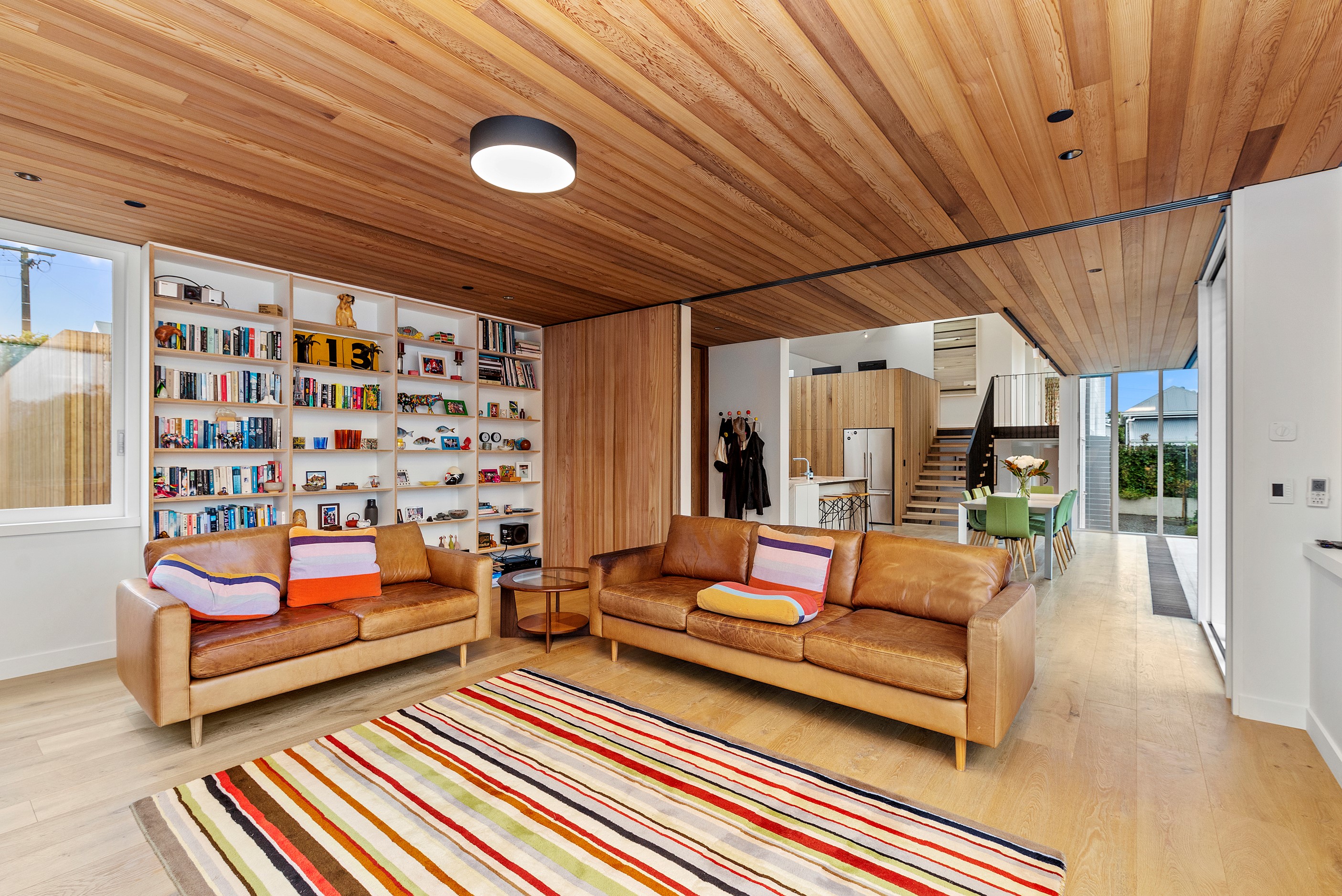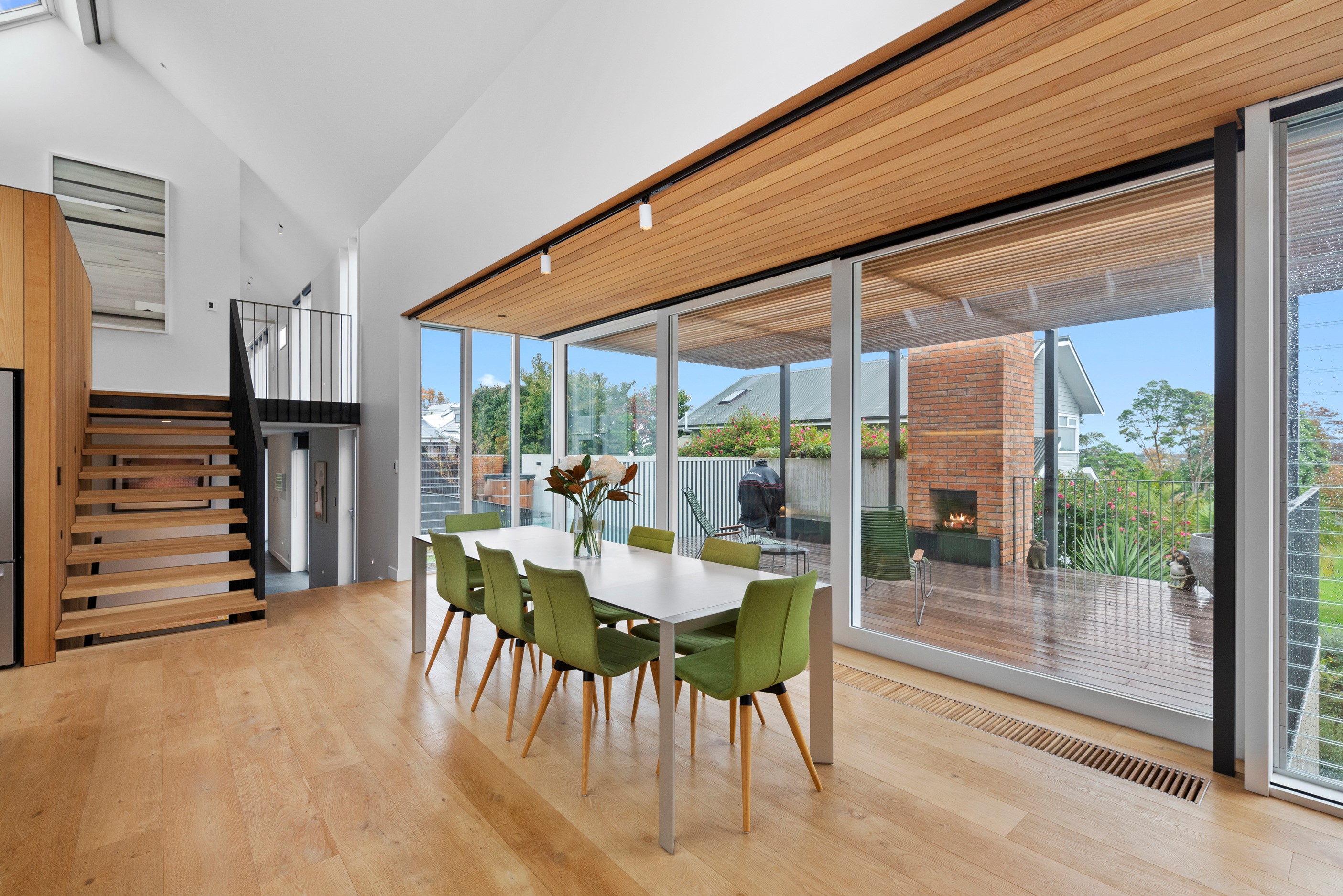 Every available square metre of challenging terrain has been used in crafting this high-end architect-designed home in one of the city’s central suburbs. The tricky narrow site was just one of the challenges that needed overcoming to bring the owners’ vision to life. The results speak volumes. In this 260sqm home, two intersecting geometric forms culminate in three levels, copious light, a series of contained outdoor spaces and views to the Waitākere Ranges. The outlook over the concrete swimming pool, landscaping and park is pretty impressive too. Quality, locally sourced materials have been used here – horizontal and vertical weatherboard – and the result is a first-class finish. The interior palette is restrained: timber floors, ceilings, stairs and feature walls against a white backdrop. Brick adds a layer of warmth and a sense of connection to the heritage suburb the three-bedroom, two-bathroom home inhabits. You’ll also see bespoke extras, including a wine cellar and wrought-iron balustrade, as well as deviations from the neutral script, such as teal subway tiles in a bathroom. Custom-made flashings and gutters press home the point that these builders are at the top of their game.