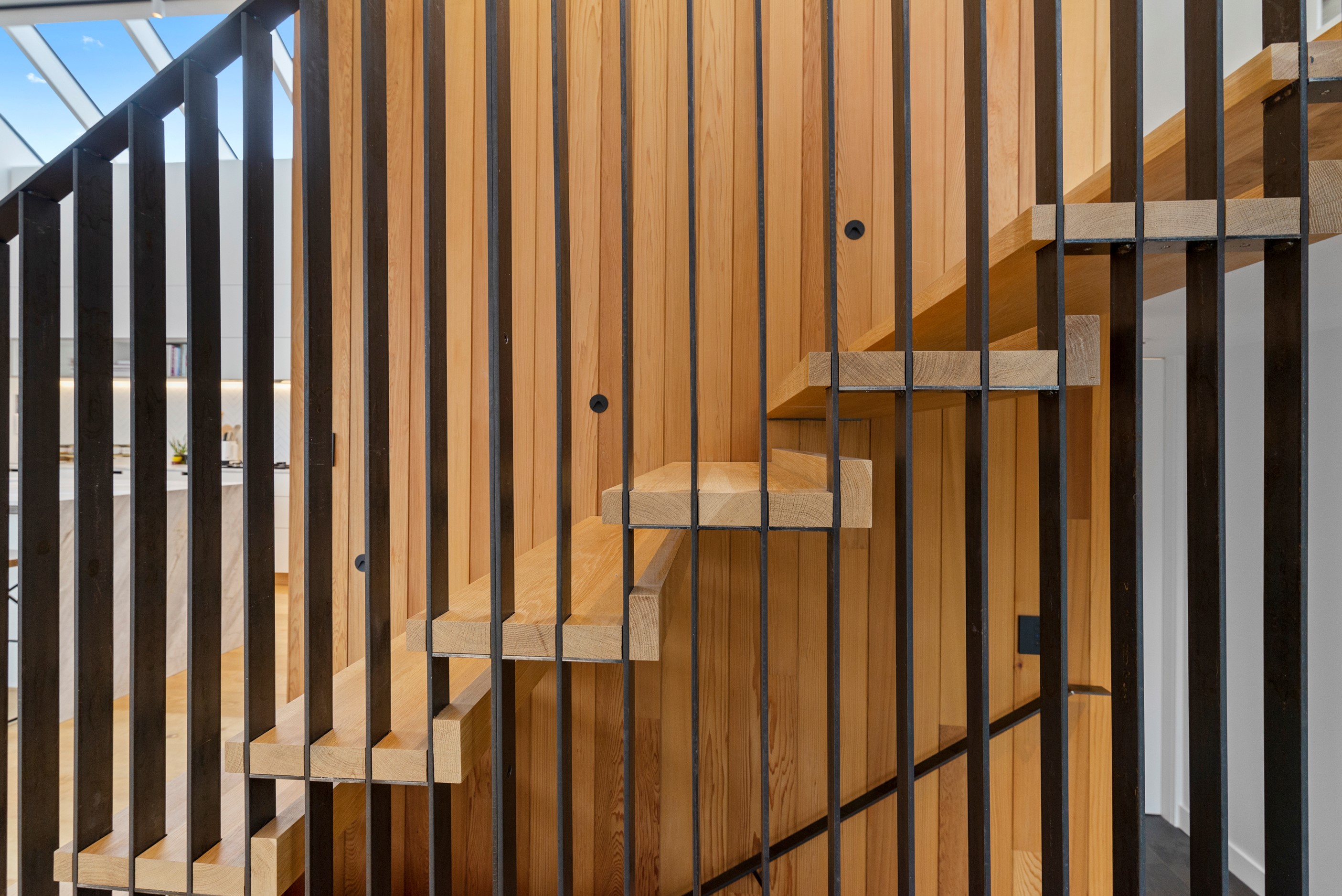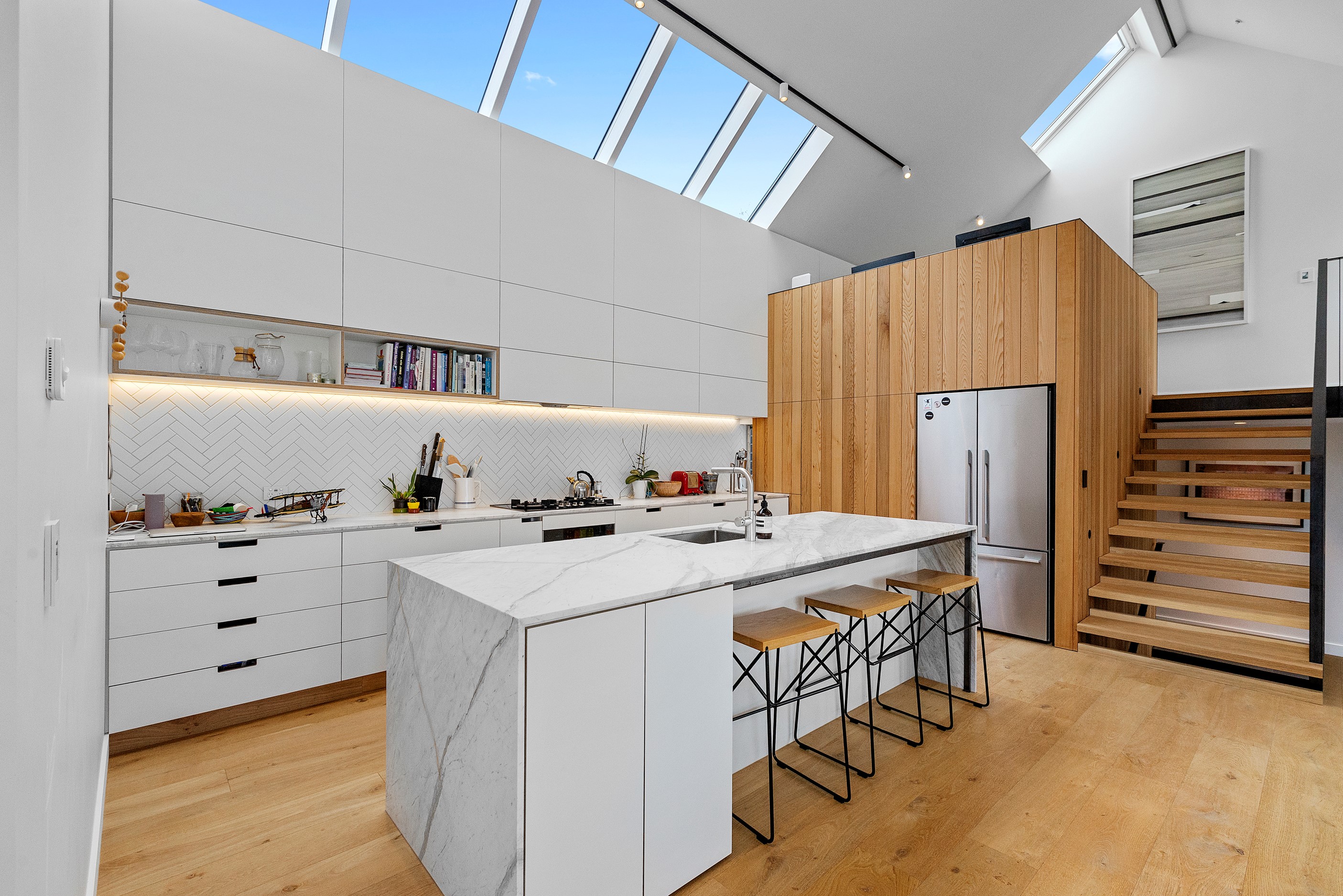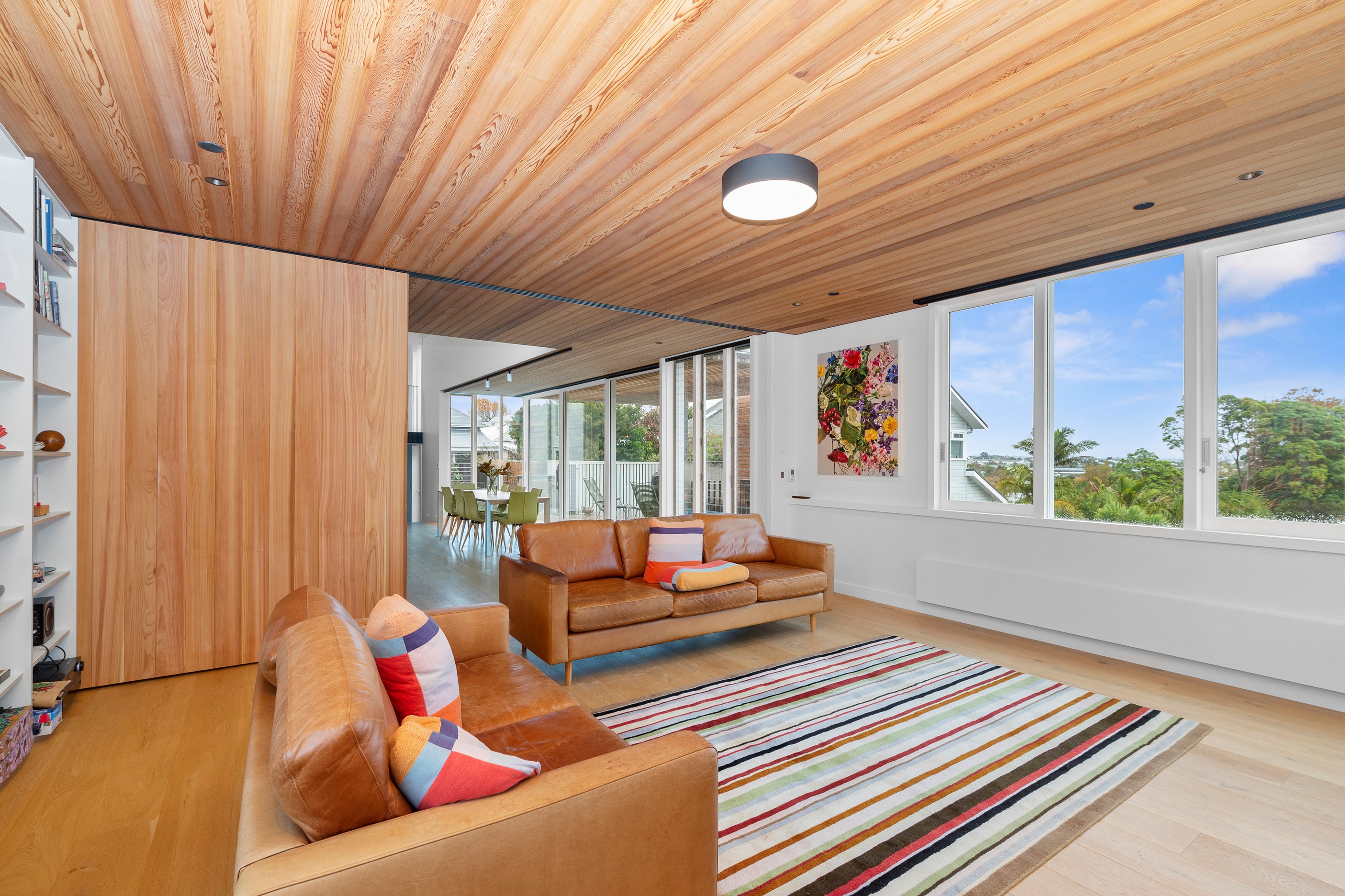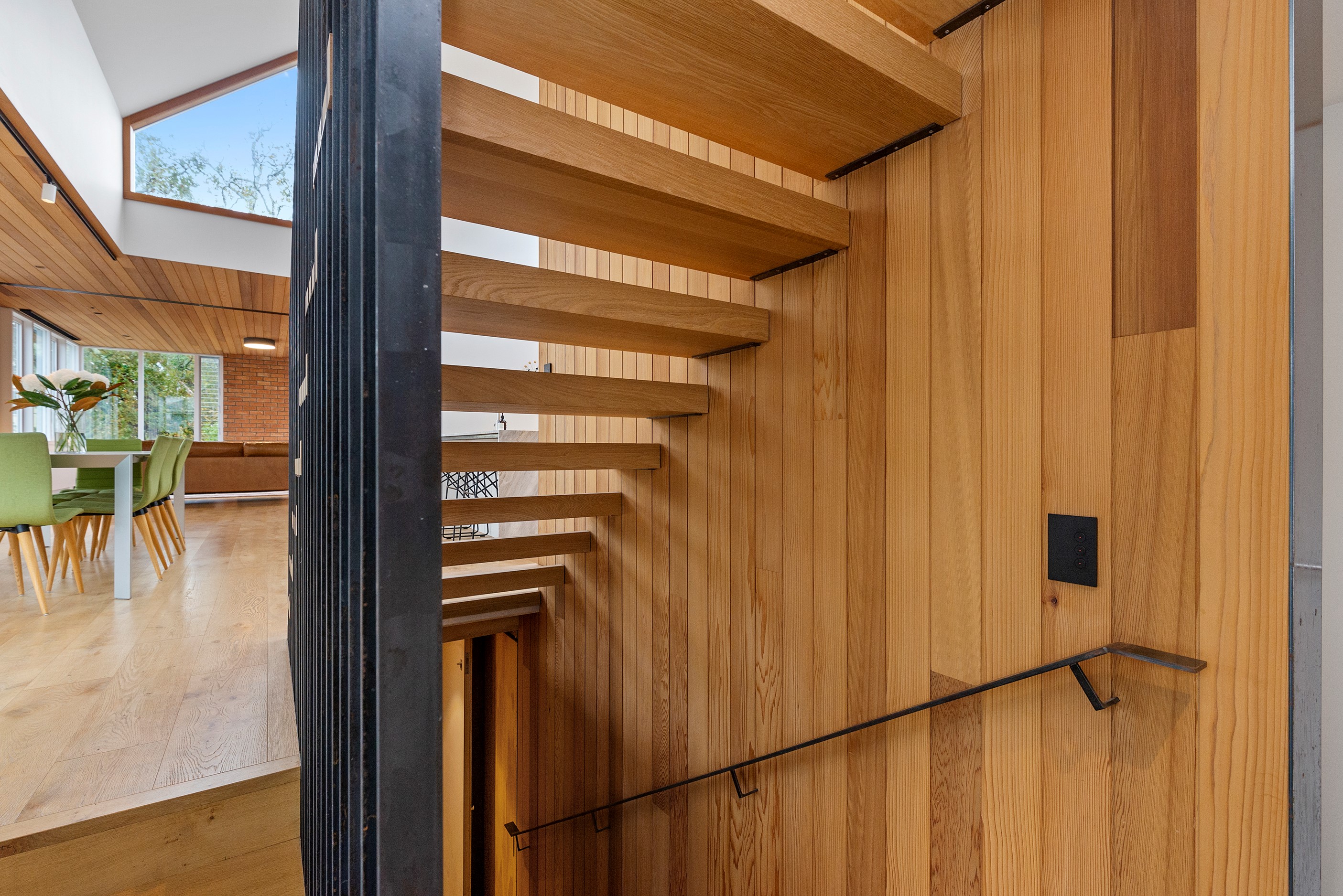 Every available square metre of challenging terrain has been used in crafting this high-end architect-designed home in one of the city’s central suburbs. The tricky narrow site was just one of the challenges that needed overcoming to bring the owners’ vision to life. The results speak volumes. In this 260sqm home, two intersecting geometric forms culminate in three levels, copious light, a series of contained outdoor spaces and views to the Waitākere Ranges. The outlook over the concrete swimming pool, landscaping and park is pretty impressive too. Quality, locally sourced materials have been used here – horizontal and vertical weatherboard – and the result is a first-class finish. The interior palette is restrained: timber floors, ceilings, stairs and feature walls against a white backdrop. Brick adds a layer of warmth and a sense of connection to the heritage suburb the three-bedroom, two-bathroom home inhabits. You’ll also see bespoke extras, including a wine cellar and wrought-iron balustrade, as well as deviations from the neutral script, such as teal subway tiles in a bathroom. Custom-made flashings and gutters press home the point that these builders are at the top of their game.