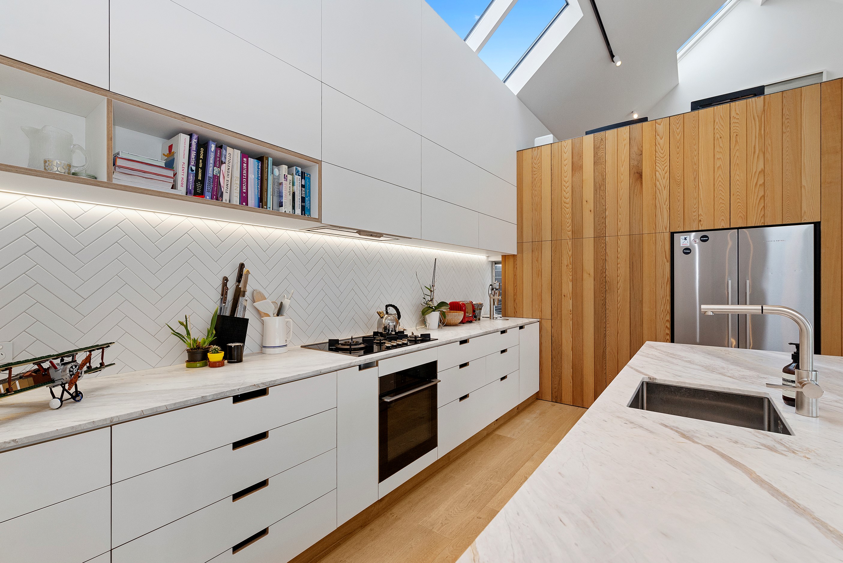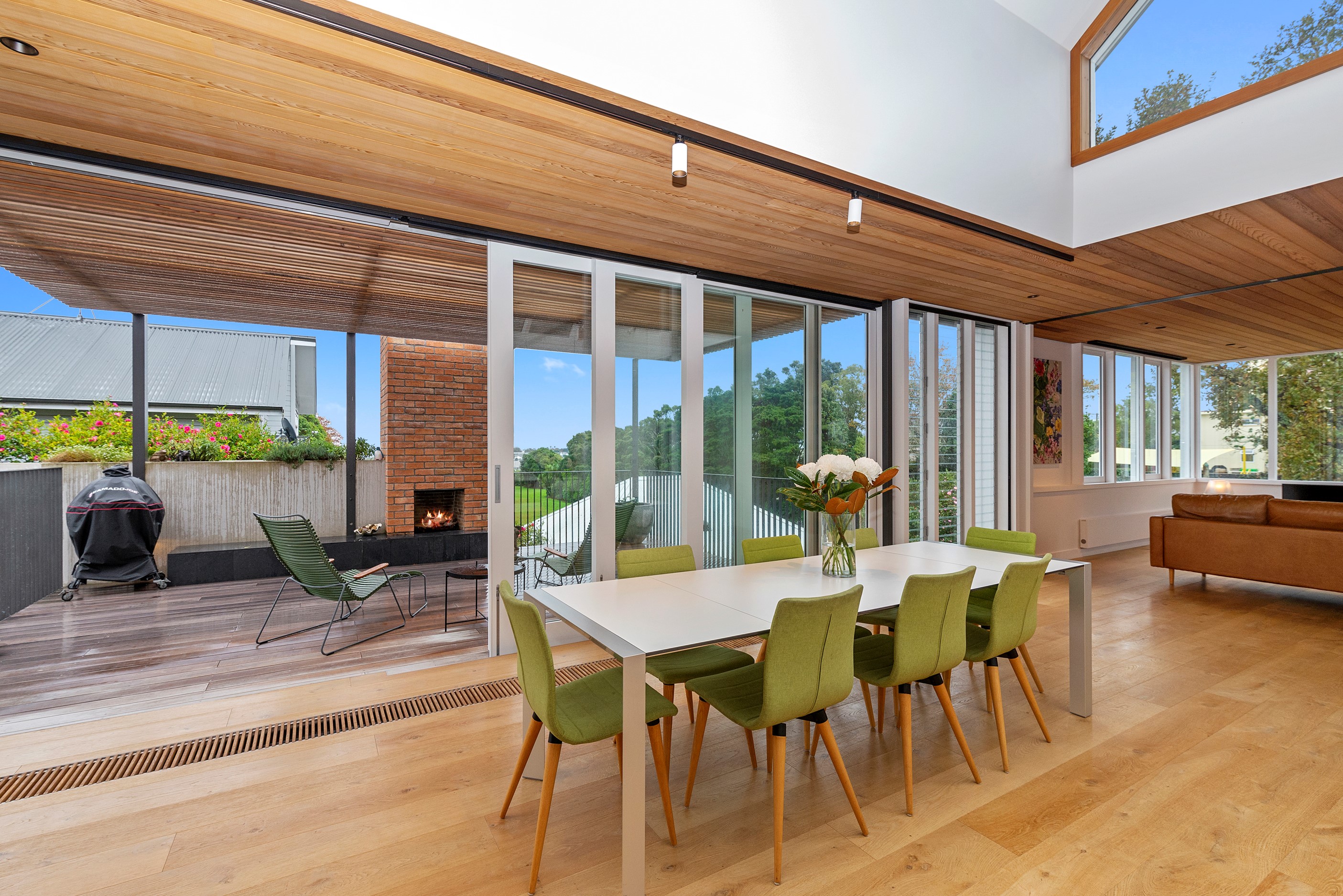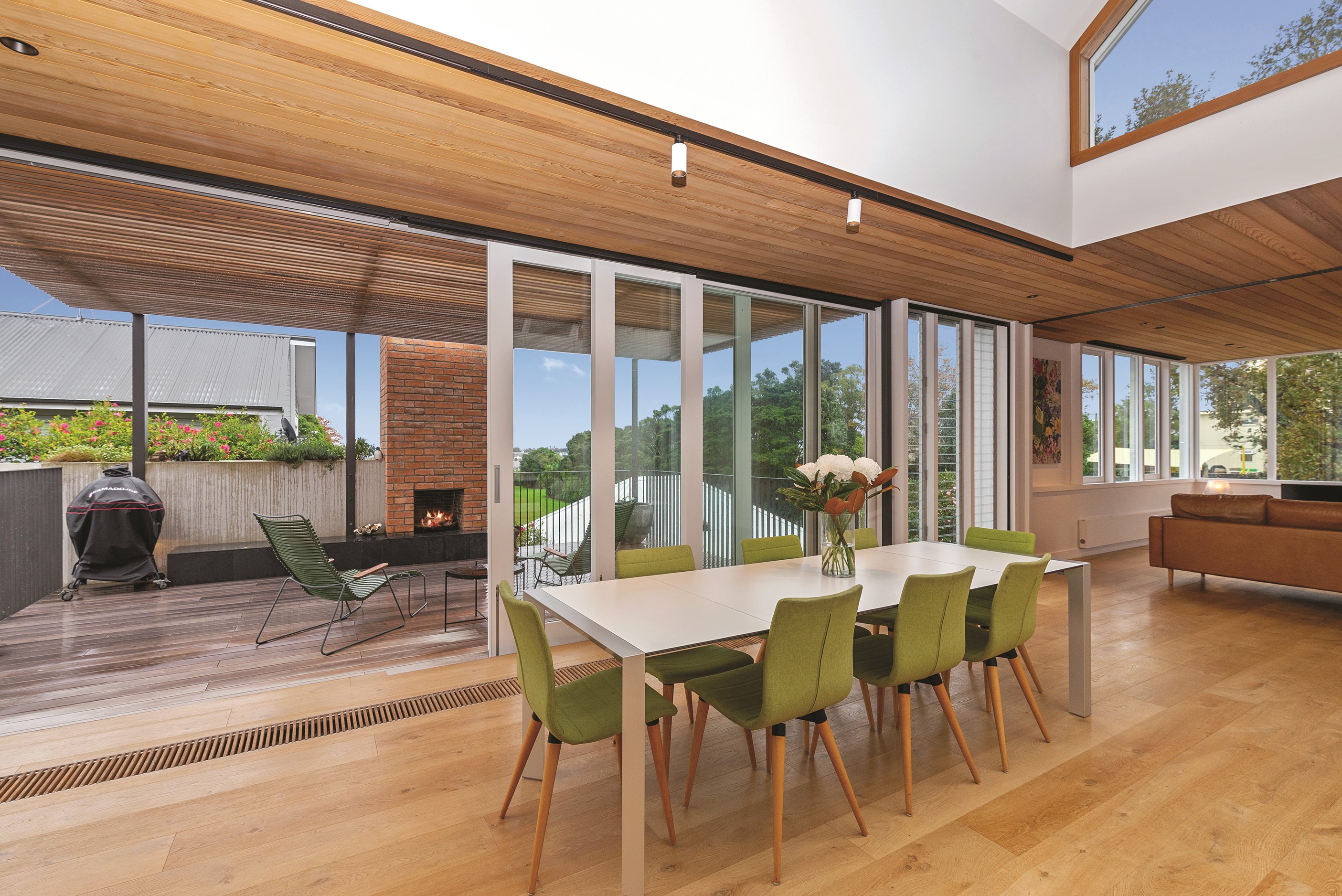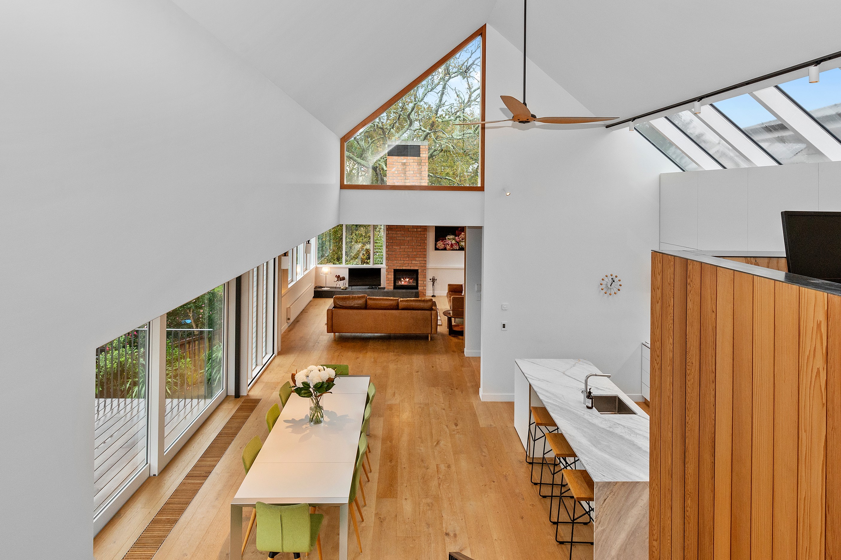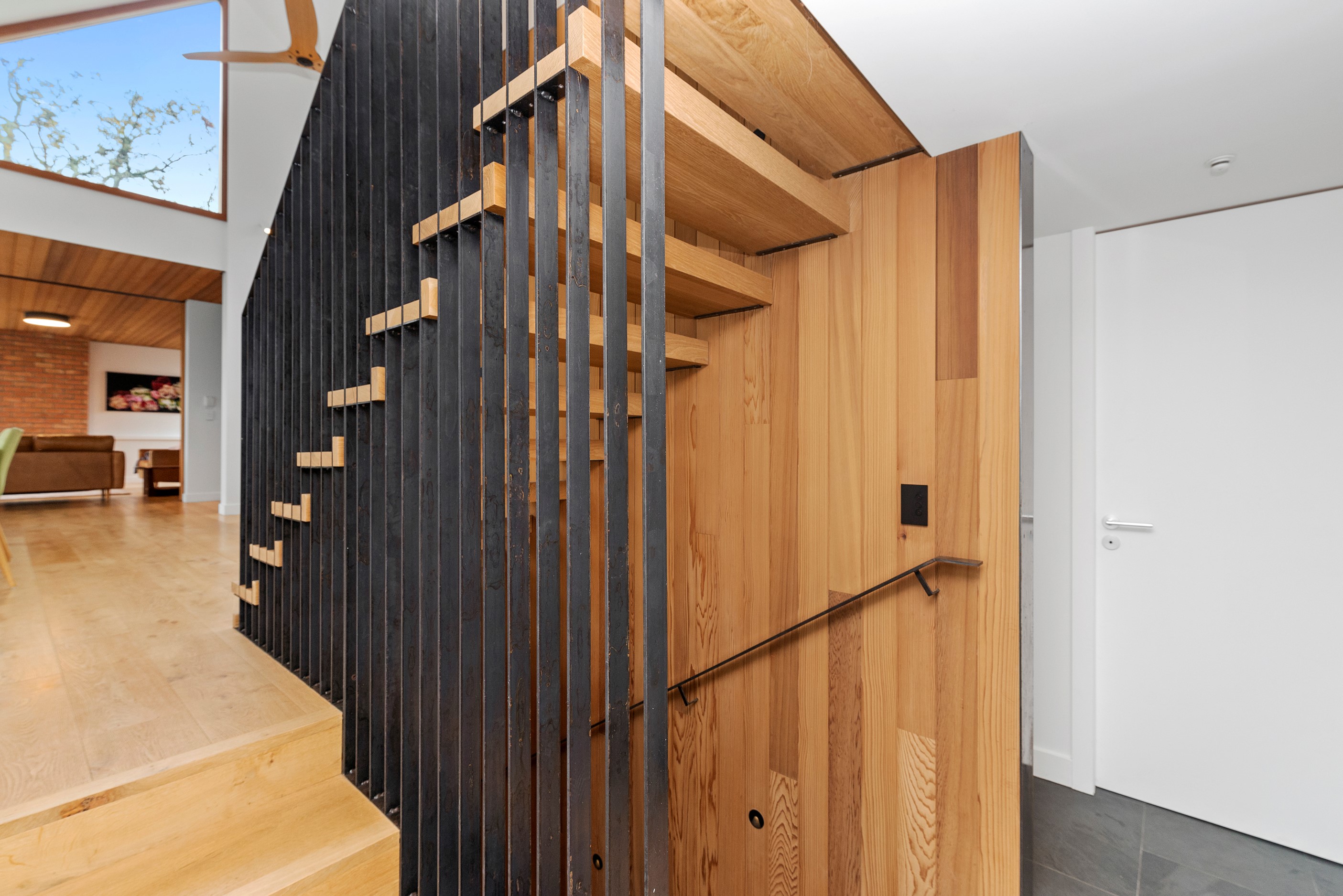Every available square metre of challenging terrain has been used in crafting this high-end architect-designed home in one of the city’s central suburbs. The tricky narrow site was just one of the challenges that needed overcoming to bring the owners’ vision to life. The results speak volumes. In this 260sqm home, two intersecting geometric forms culminate in three levels, copious light, a series of contained outdoor spaces and views to the Waitākere Ranges. The outlook over the concrete swimming pool, landscaping and park is pretty impressive too. Quality, locally sourced materials have been used here – horizontal and vertical weatherboard – and the result is a first-class finish. The interior palette is restrained: timber floors, ceilings, stairs and feature walls against a white backdrop. Brick adds a layer of warmth and a sense of connection to the heritage suburb the three-bedroom, two-bathroom home inhabits. You’ll also see bespoke extras, including a wine cellar and wrought-iron balustrade, as well as deviations from the neutral script, such as teal subway tiles in a bathroom. Custom-made flashings and gutters press home the point that these builders are at the top of their game.