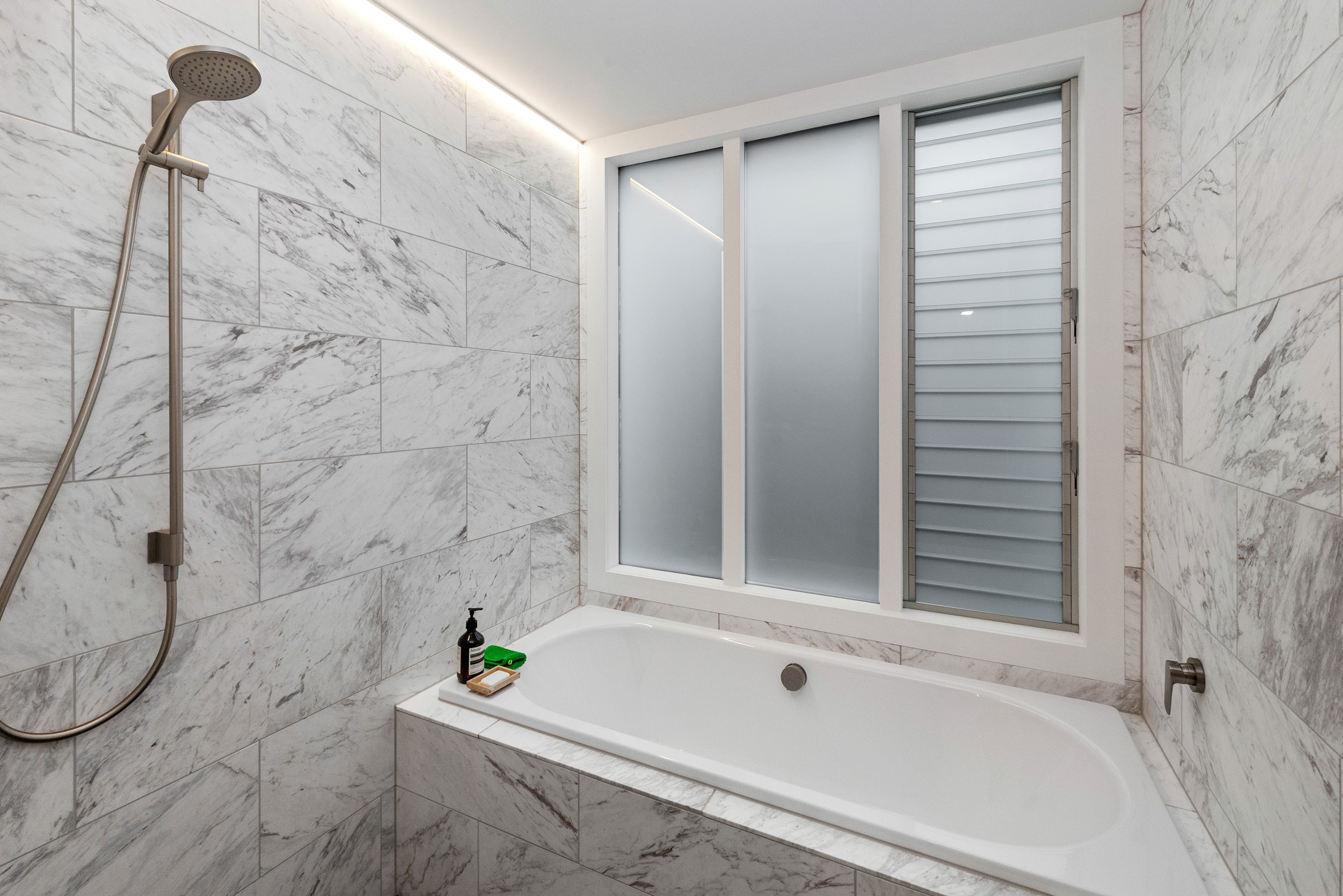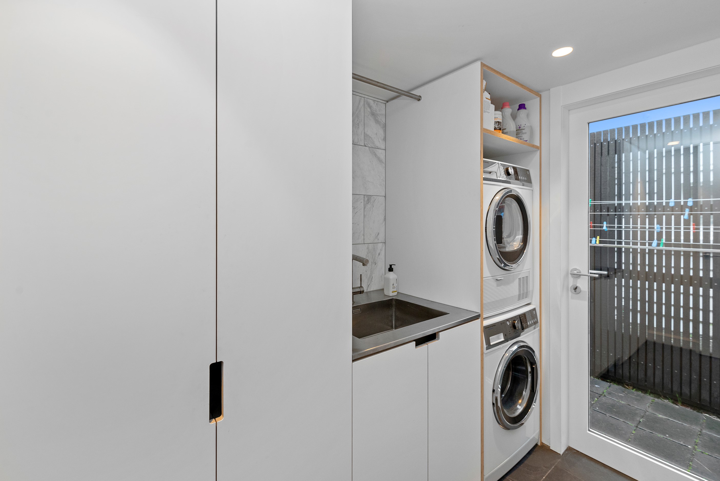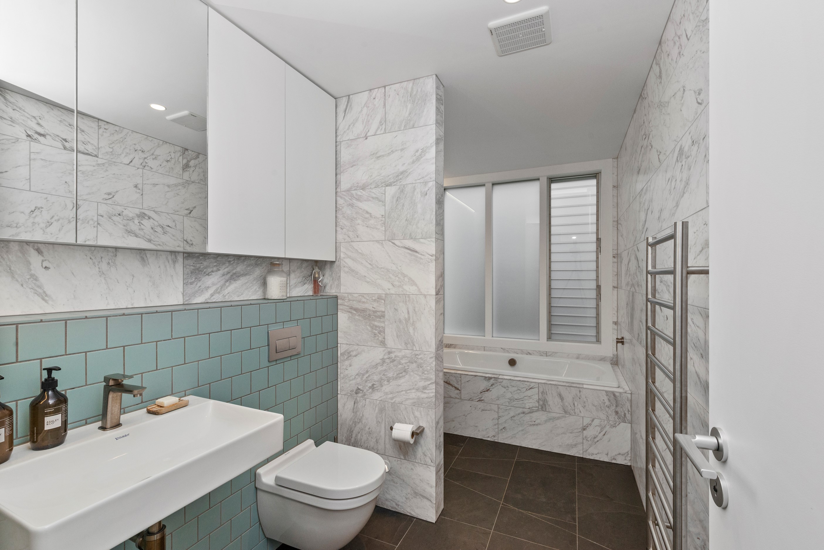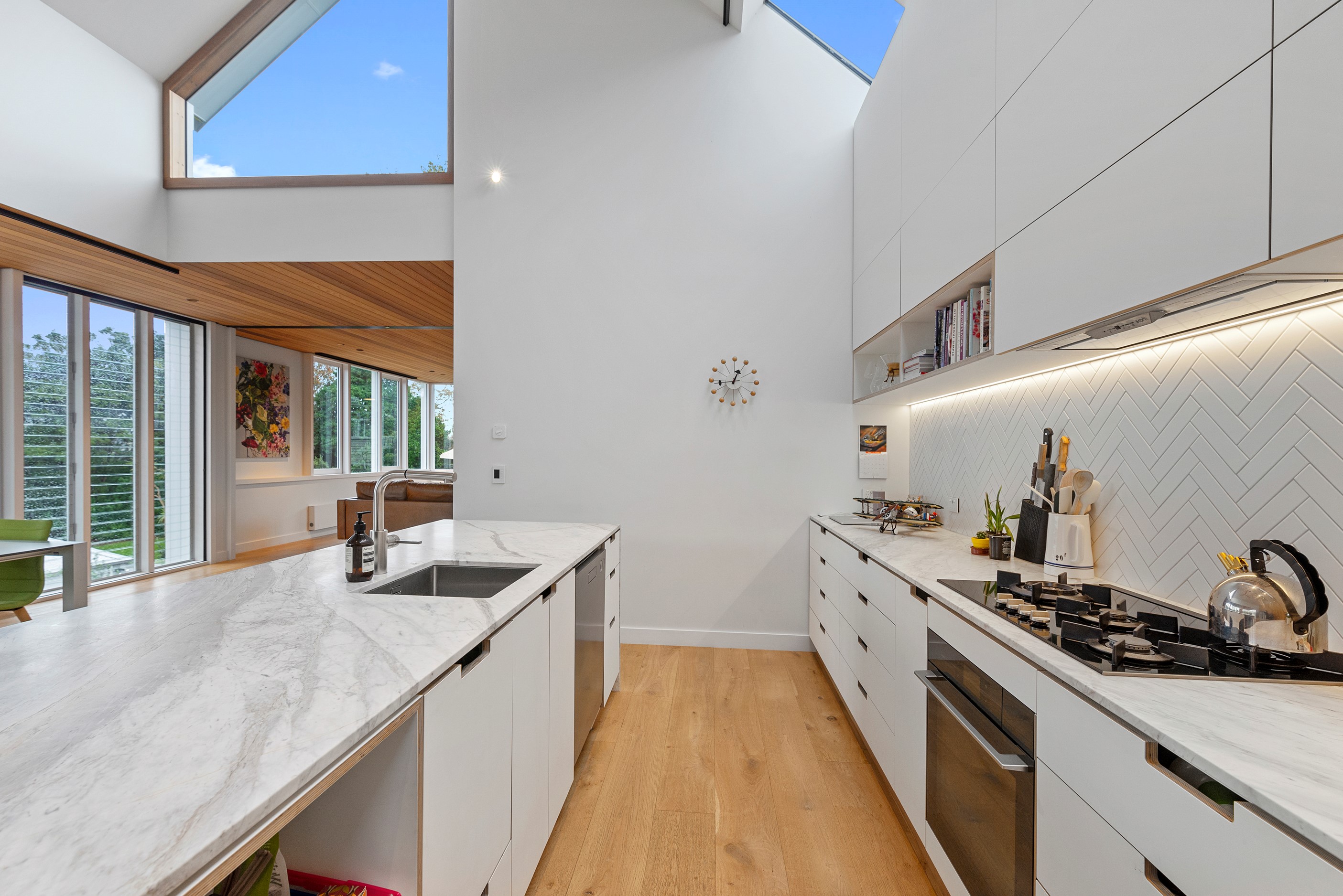 Every available square metre of challenging terrain has been used in crafting this high-end architect-designed home in one of the city’s central suburbs. The tricky narrow site was just one of the challenges that needed overcoming to bring the owners’ vision to life. The results speak volumes. In this 260sqm home, two intersecting geometric forms culminate in three levels, copious light, a series of contained outdoor spaces and views to the Waitākere Ranges. The outlook over the concrete swimming pool, landscaping and park is pretty impressive too. Quality, locally sourced materials have been used here – horizontal and vertical weatherboard – and the result is a first-class finish. The interior palette is restrained: timber floors, ceilings, stairs and feature walls against a white backdrop. Brick adds a layer of warmth and a sense of connection to the heritage suburb the three-bedroom, two-bathroom home inhabits. You’ll also see bespoke extras, including a wine cellar and wrought-iron balustrade, as well as deviations from the neutral script, such as teal subway tiles in a bathroom. Custom-made flashings and gutters press home the point that these builders are at the top of their game.