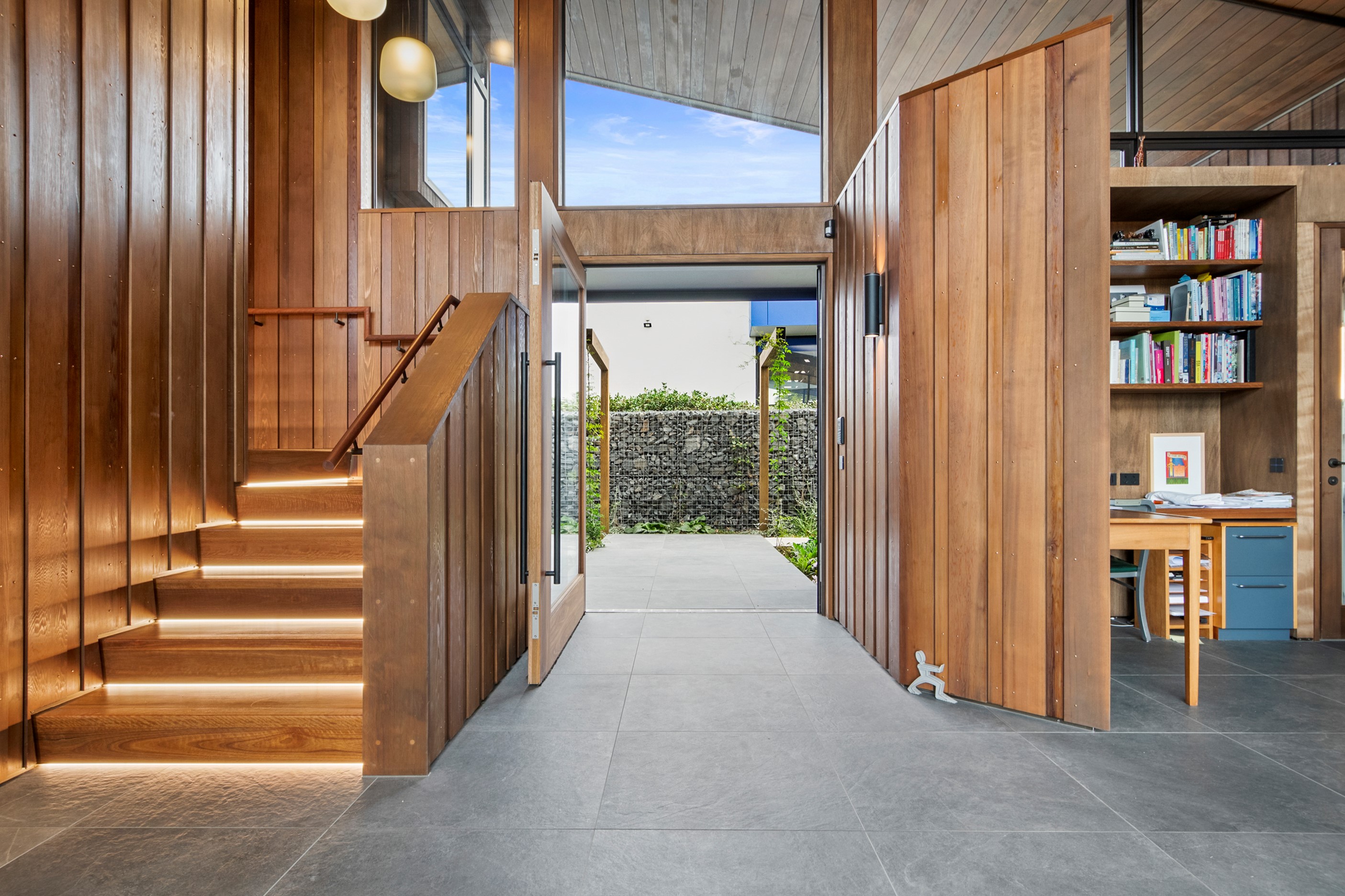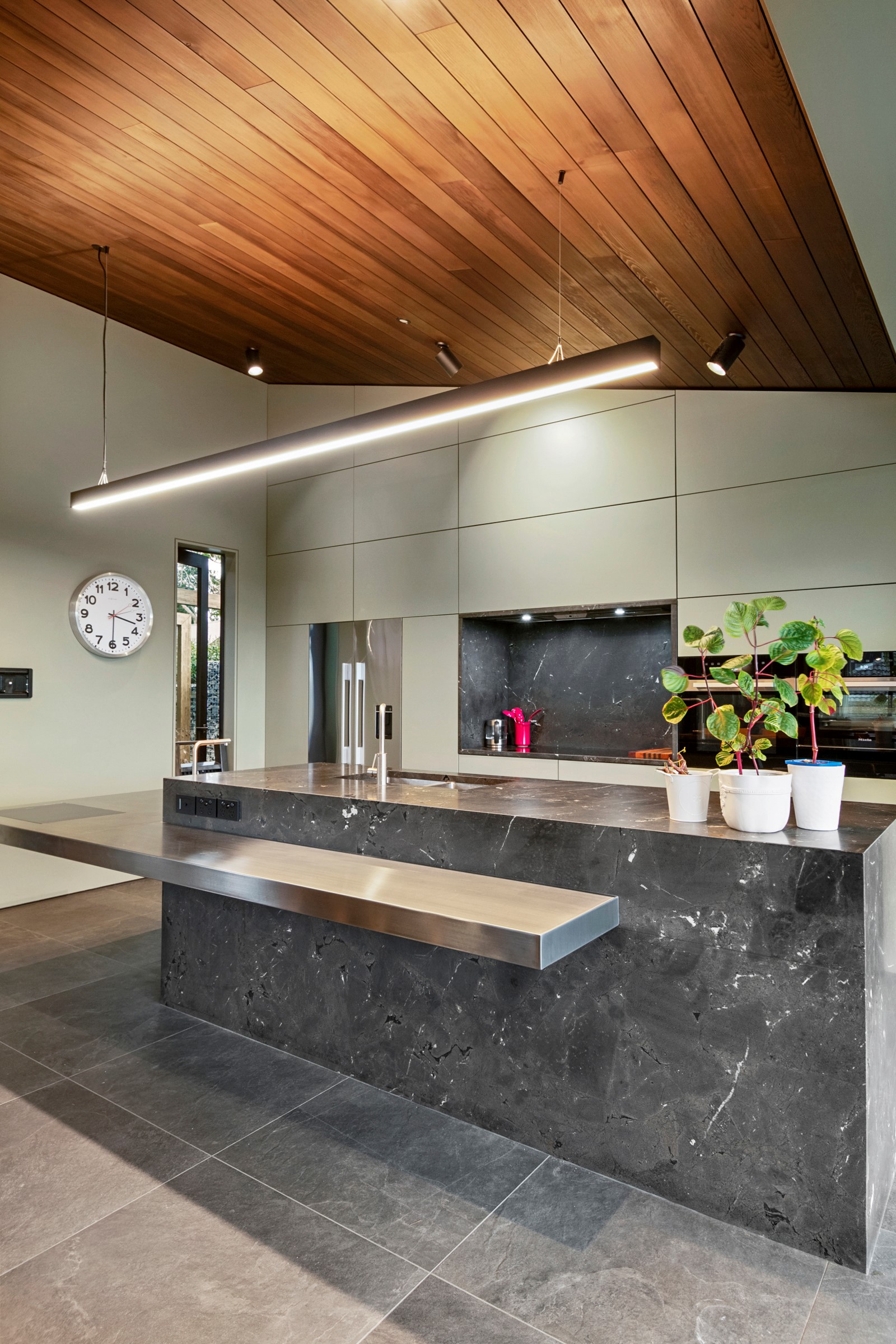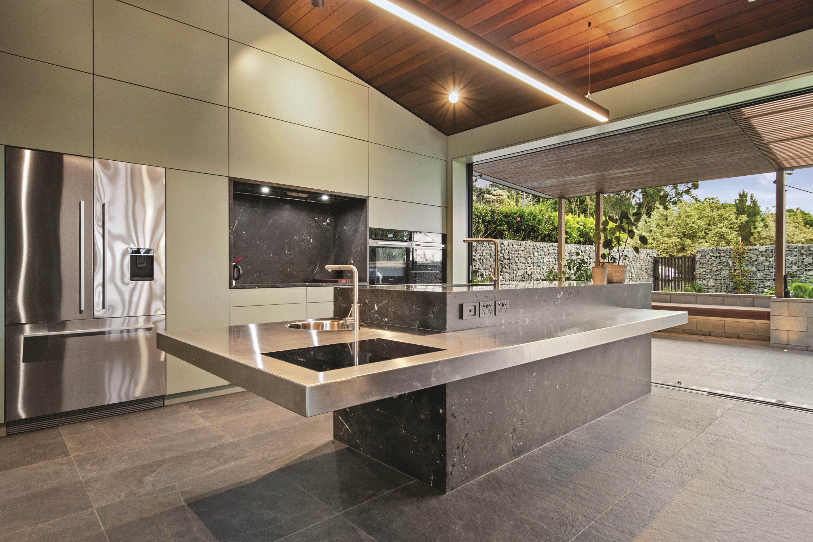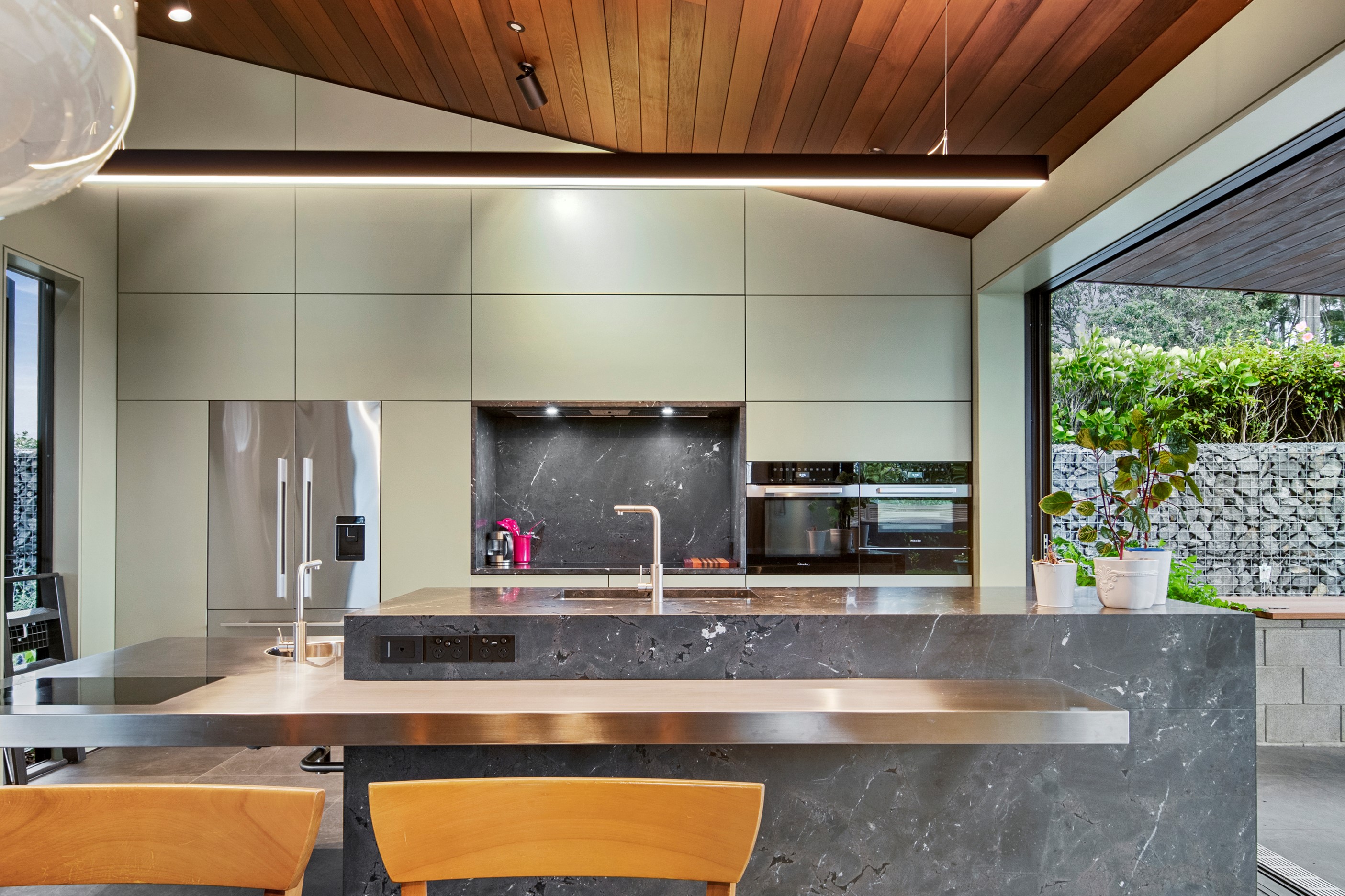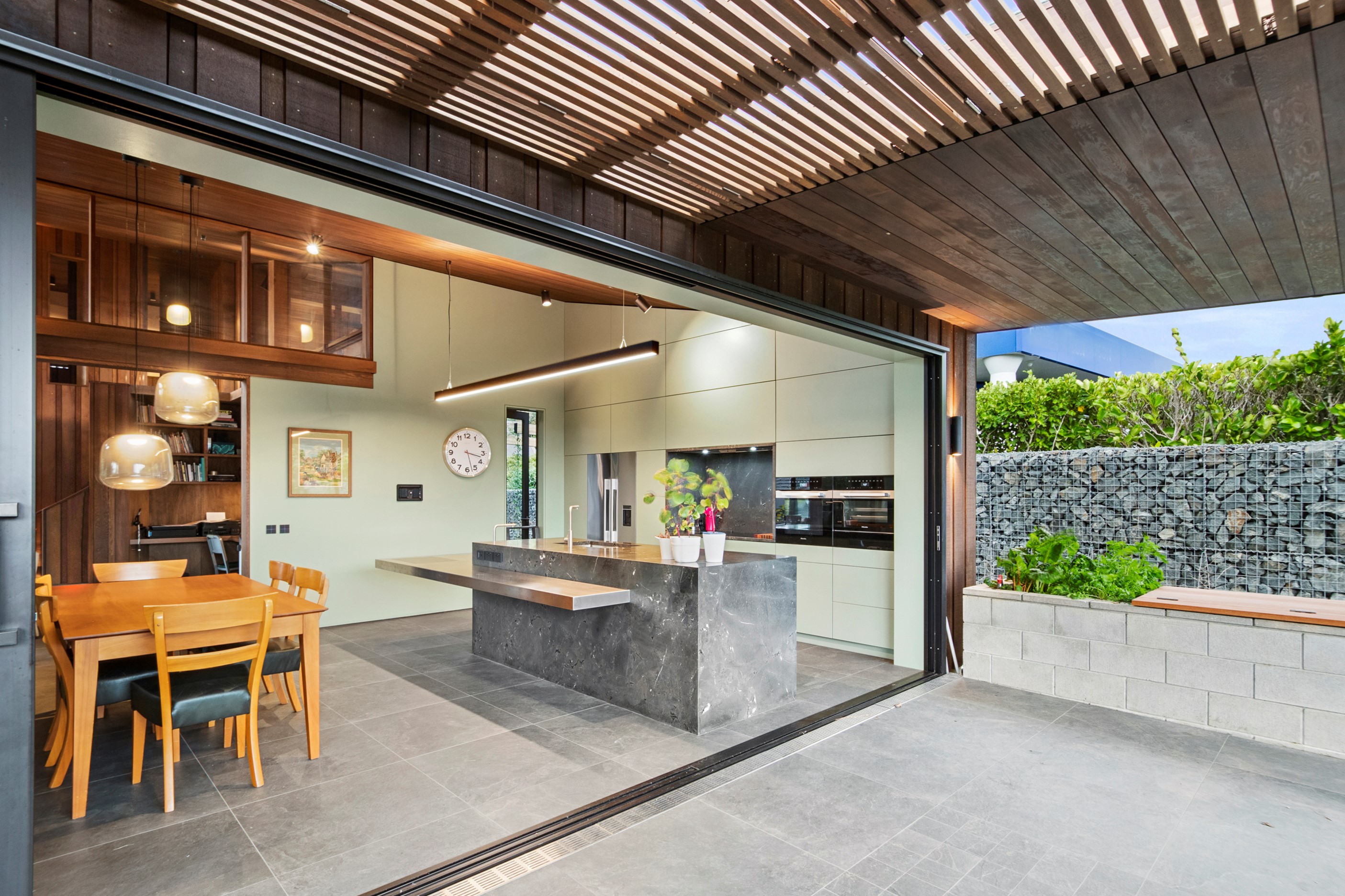 When the clients wanted to build a cutting-edge sustainable home for their retirement, they didn’t need to search very far for the site. They looked at somewhere they’d spent a lot of enjoyable time – their garden. The architect-designed three-bedroom, three-bathroom residence is all about ease of living and self-sufficiency. It includes a lift, level-entry outdoor spaces and wheelchair-accessible rooms. An energy consultant was engaged early in the design process to ensure all the solar energy, water storage, security, data and electricity systems were compatible. But this 280sqm split-level home is about more than its practical performance – it is also a wooded wonderland. The exterior is clad in cedar weatherboards, while inside a dressed version lines the walls. There’s cedar sarking on ceilings and the upper floors are made of spotted gum. Light streams in through swathes of glazing, giving the timber a warm glow. Soaring ceilings add to the sense of openness and space, not unlike a gallery. Concrete floors with hydronic heating are tiled. The kitchen is the perfect mix of high-end materials, pared-back style and accessibility. Outdoors, the landscaping is sublime.