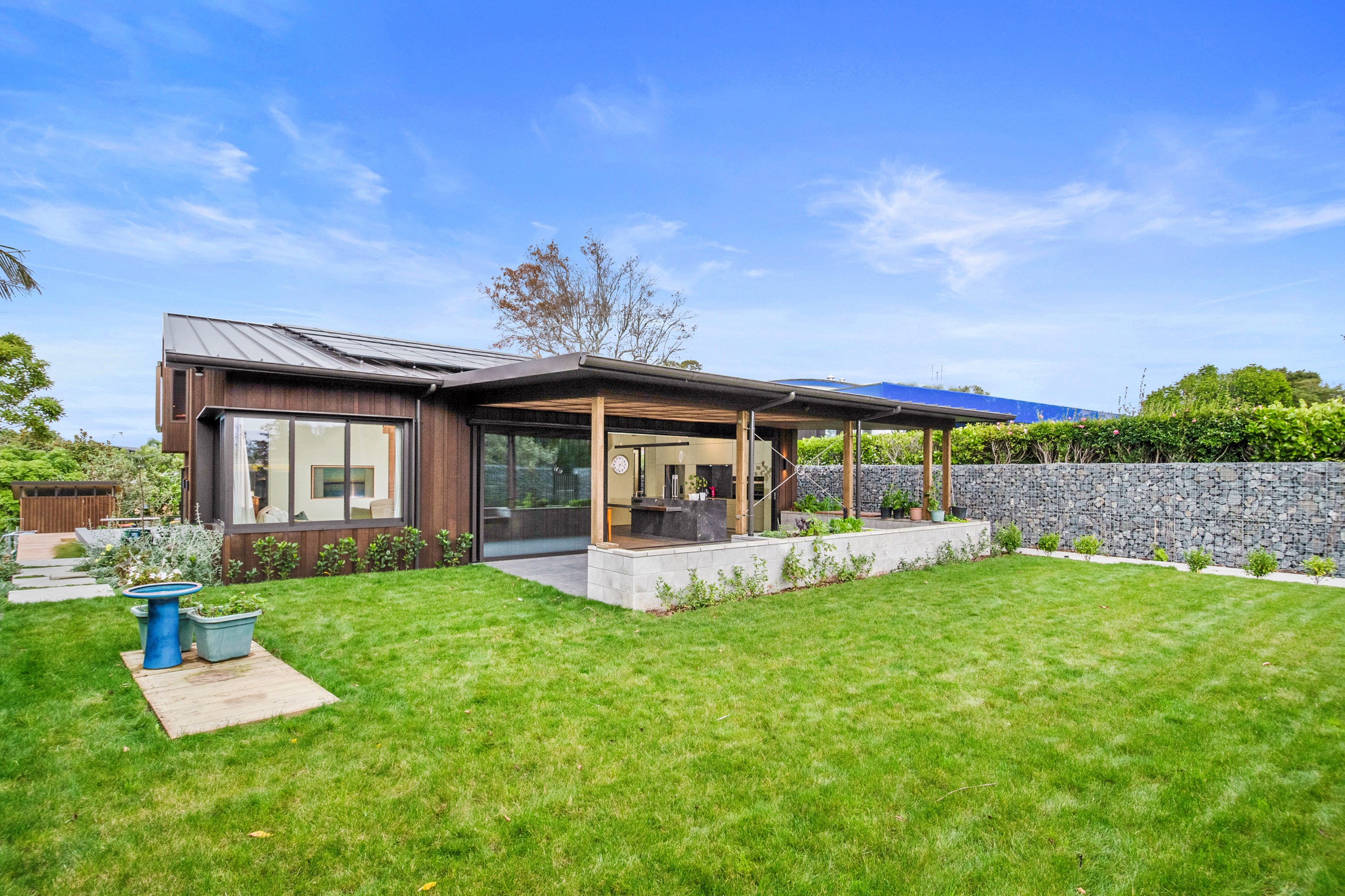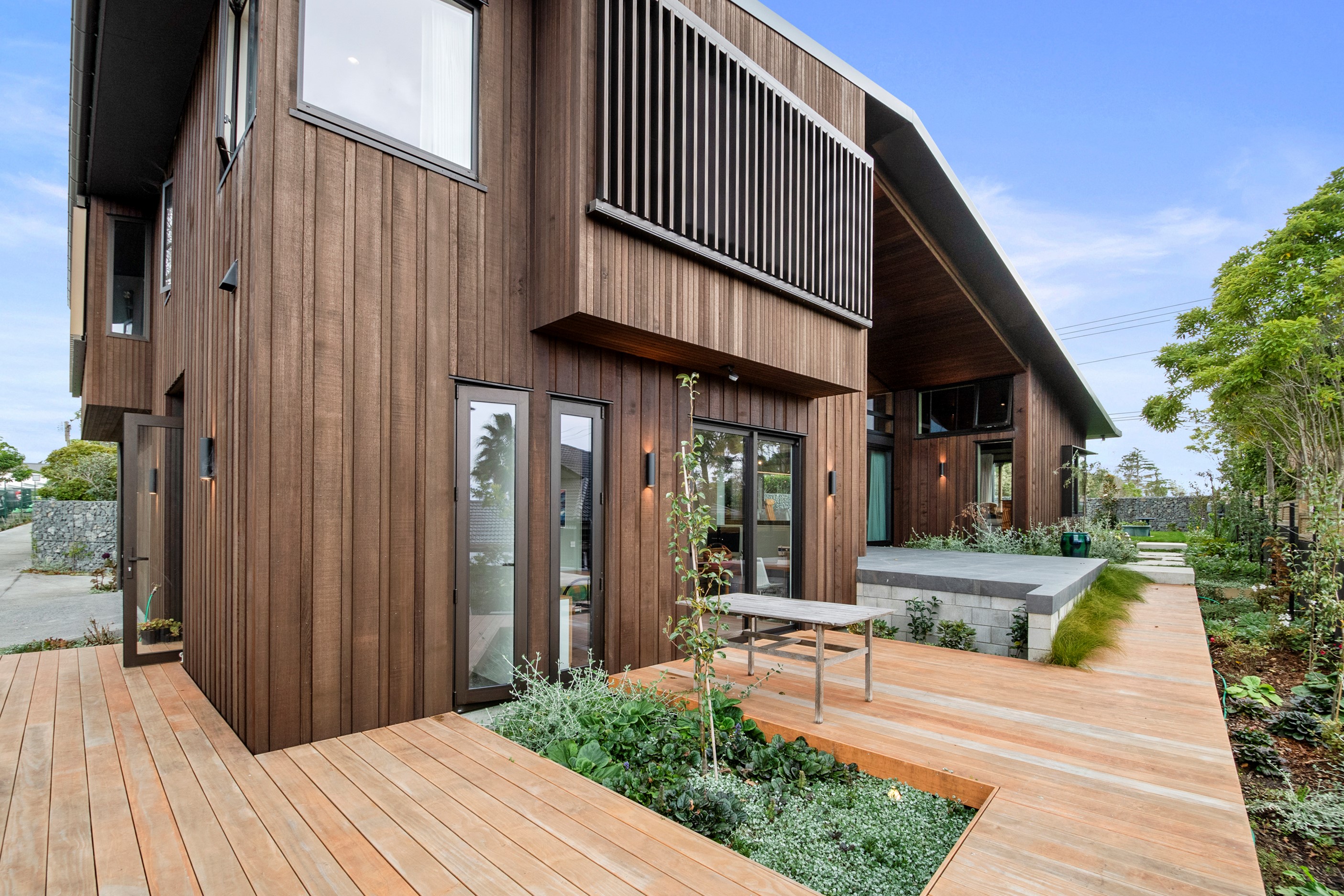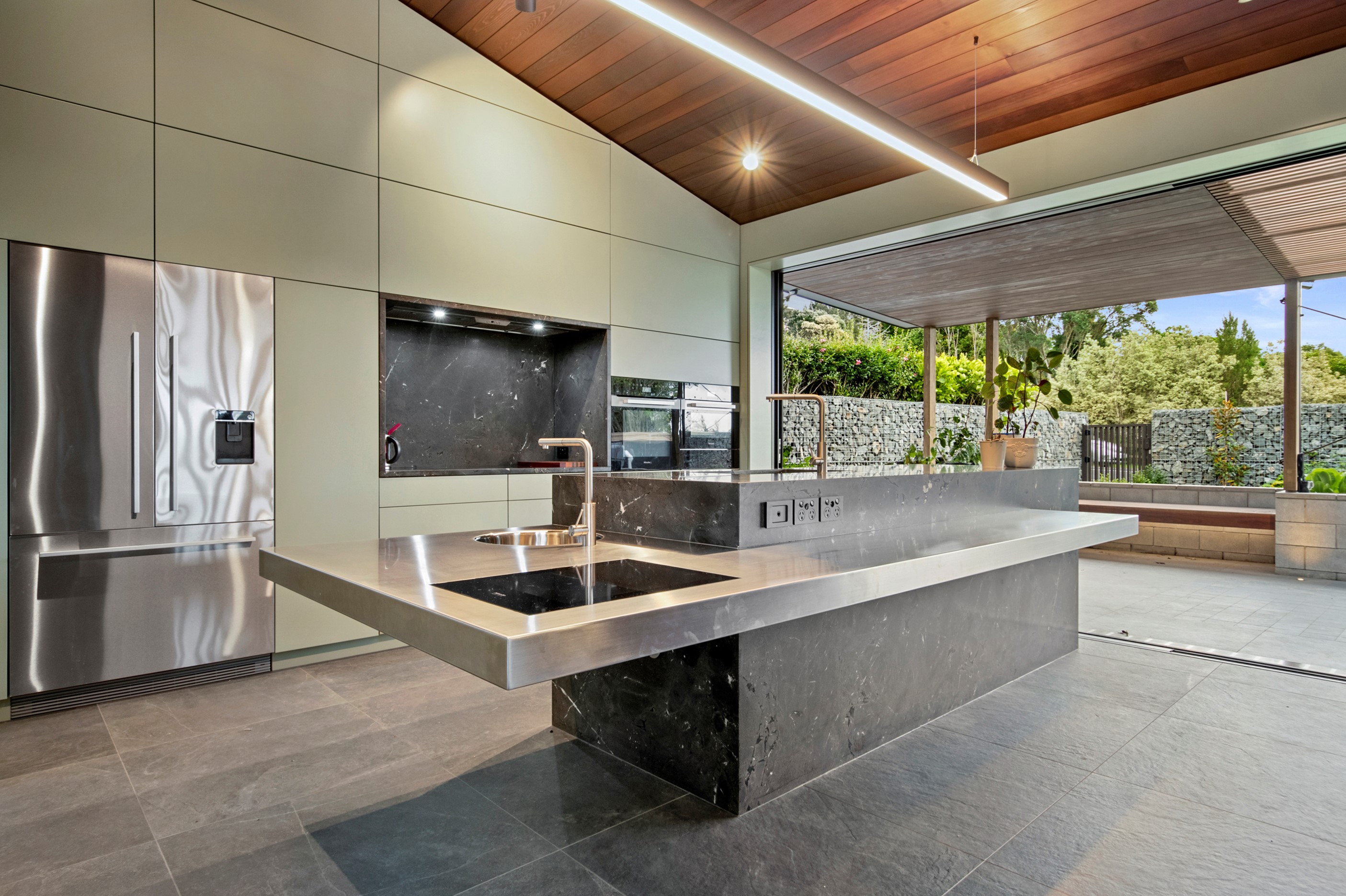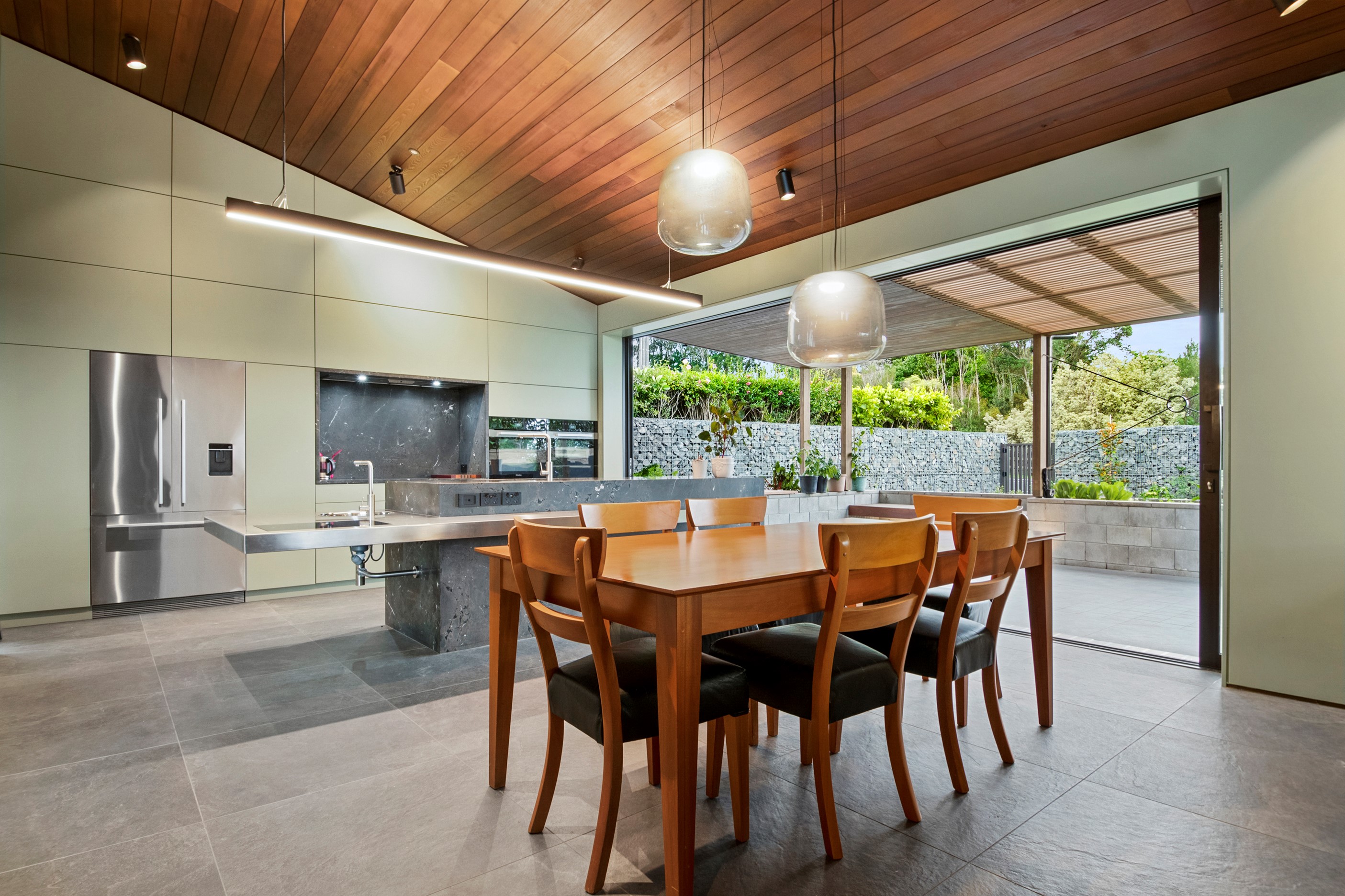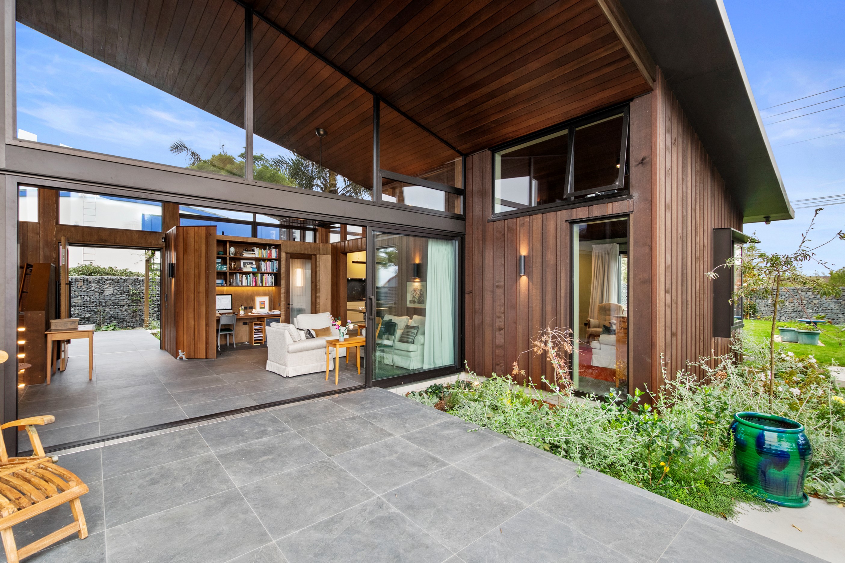 When the clients wanted to build a cutting-edge sustainable home for their retirement, they didn’t need to search very far for the site. They looked at somewhere they’d spent a lot of enjoyable time – their garden. The architect-designed three-bedroom, three-bathroom residence is all about ease of living and self-sufficiency. It includes a lift, level-entry outdoor spaces and wheelchair-accessible rooms. An energy consultant was engaged early in the design process to ensure all the solar energy, water storage, security, data and electricity systems were compatible. But this 280sqm split-level home is about more than its practical performance – it is also a wooded wonderland. The exterior is clad in cedar weatherboards, while inside a dressed version lines the walls. There’s cedar sarking on ceilings and the upper floors are made of spotted gum. Light streams in through swathes of glazing, giving the timber a warm glow. Soaring ceilings add to the sense of openness and space, not unlike a gallery. Concrete floors with hydronic heating are tiled. The kitchen is the perfect mix of high-end materials, pared-back style and accessibility. Outdoors, the landscaping is sublime.