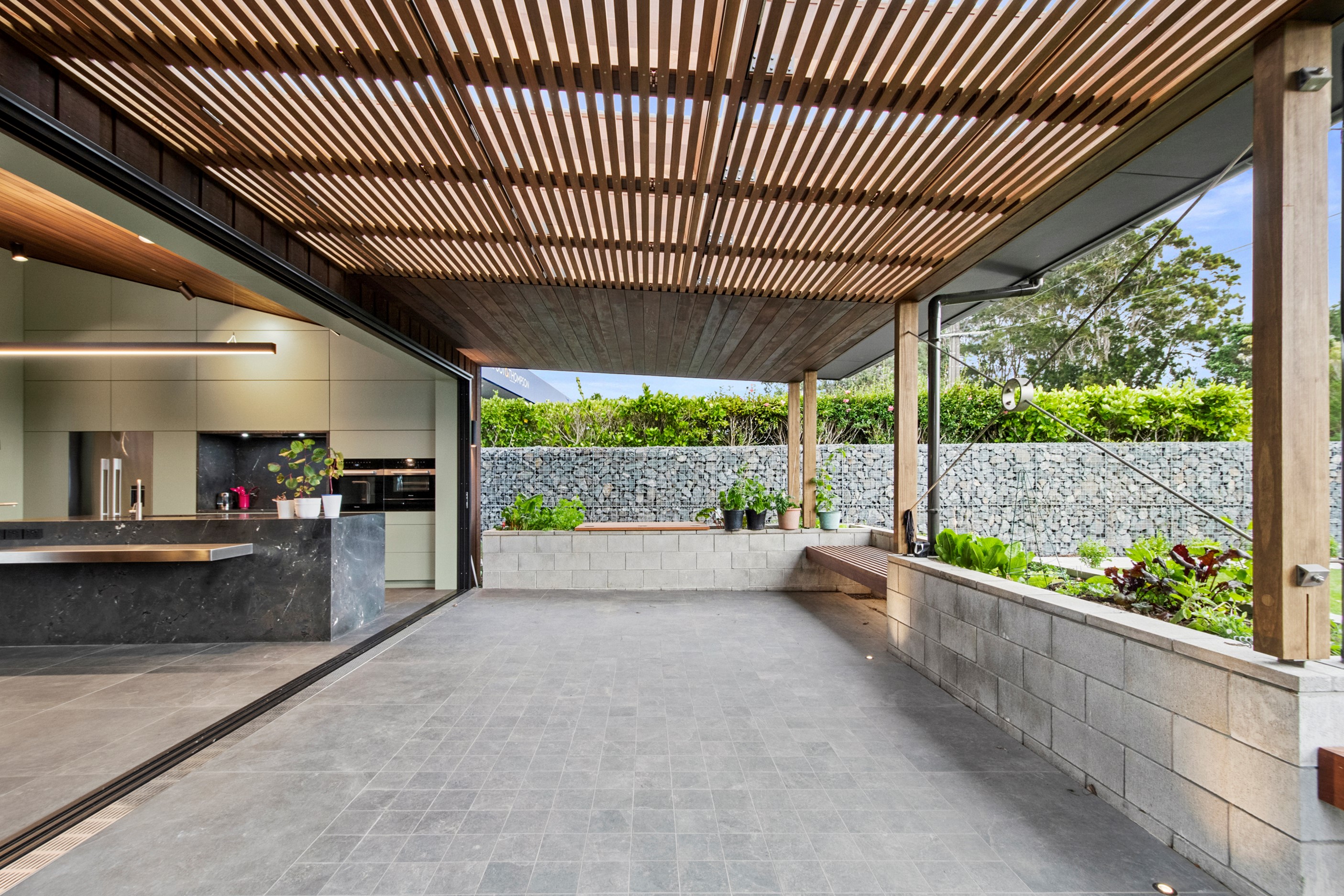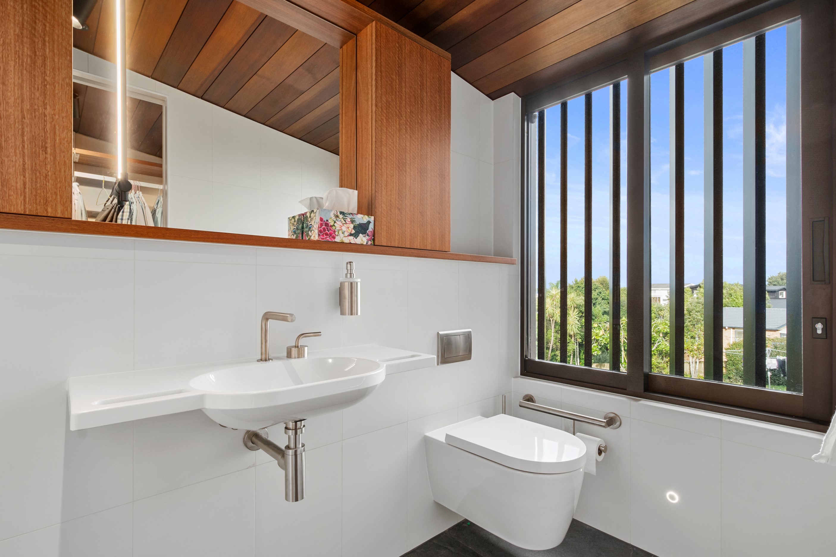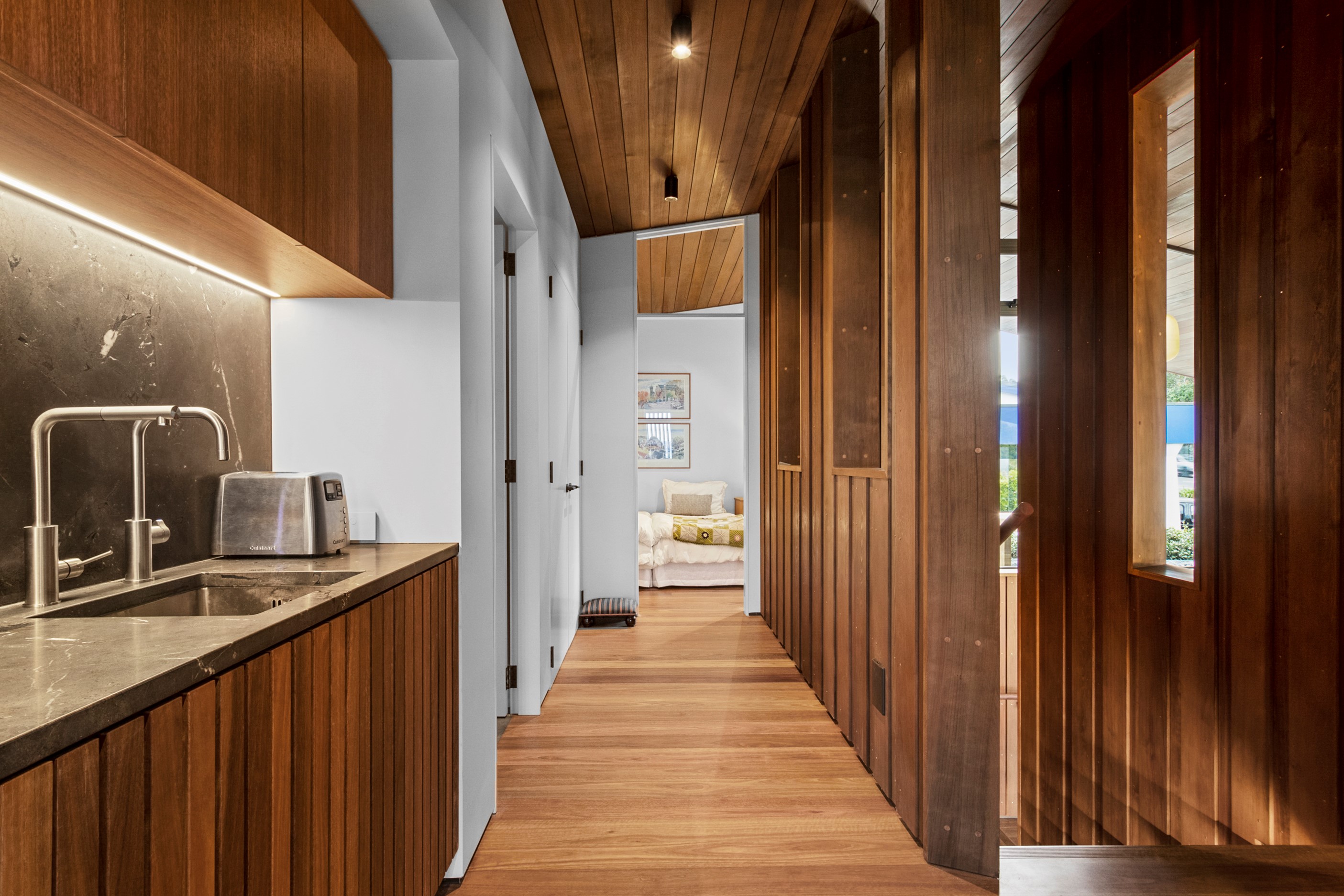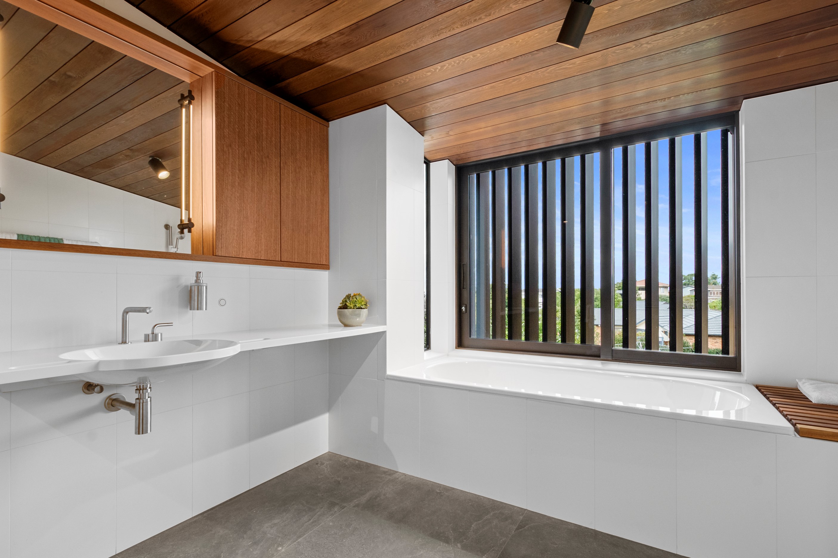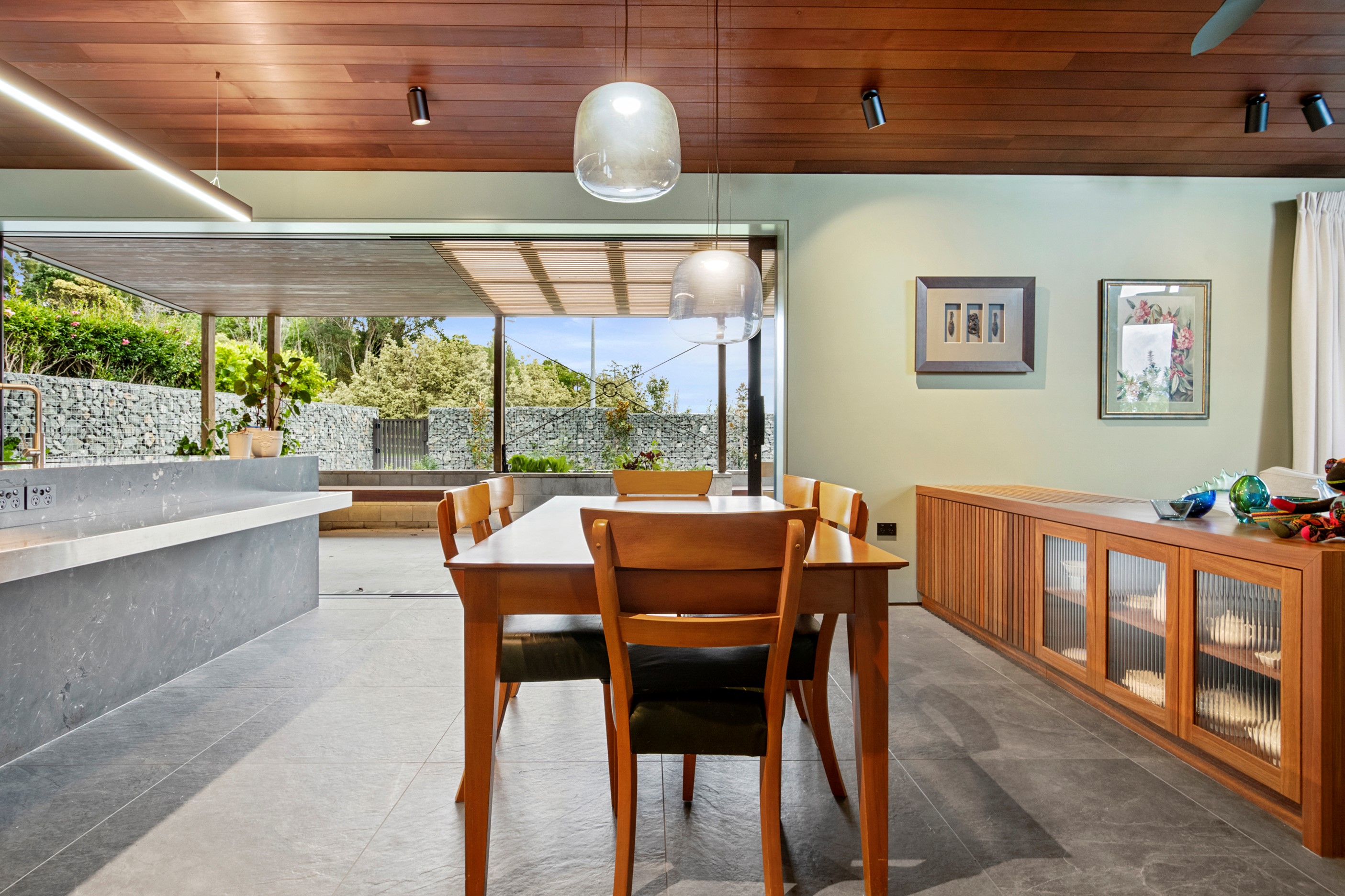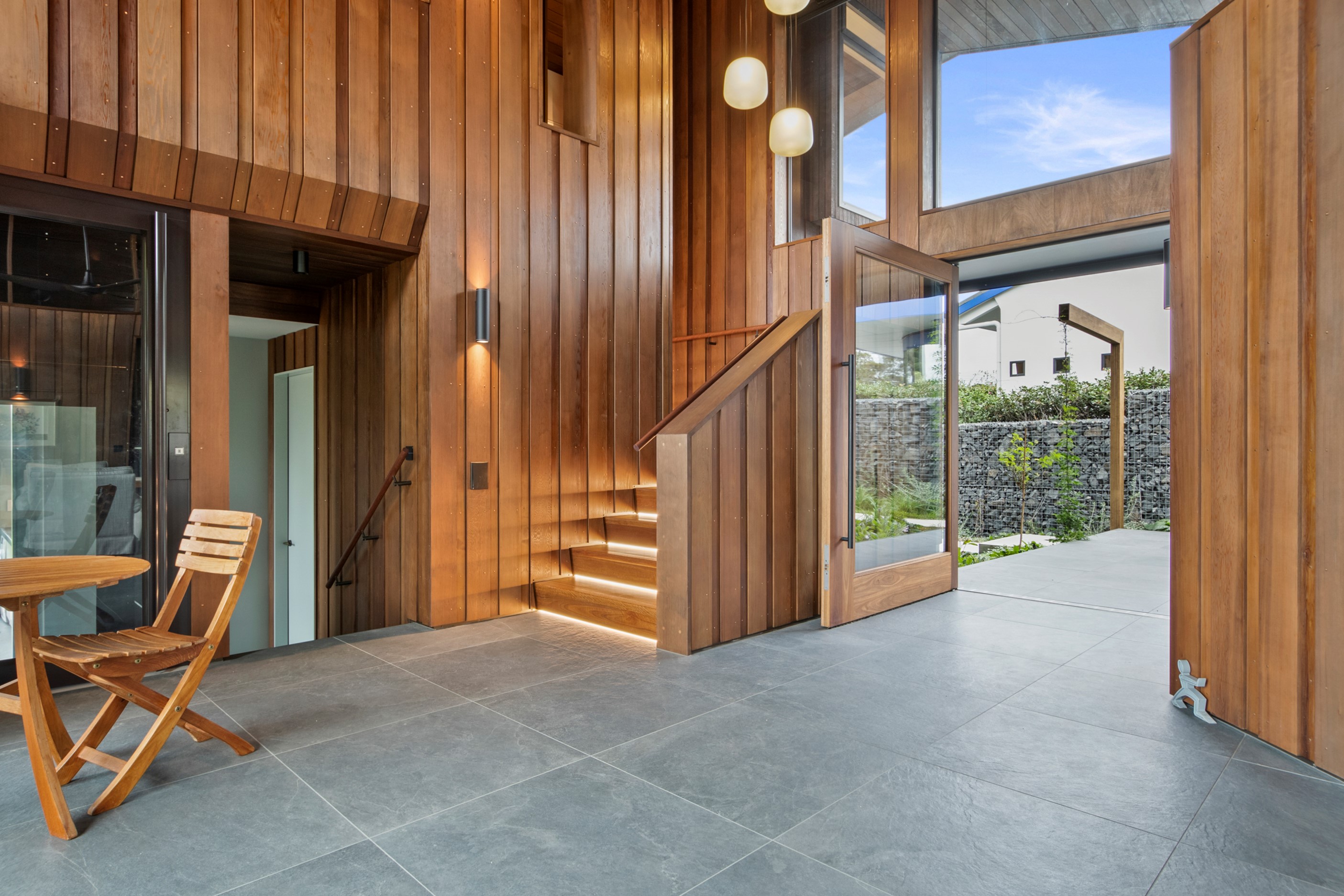 When the clients wanted to build a cutting-edge sustainable home for their retirement, they didn’t need to search very far for the site. They looked at somewhere they’d spent a lot of enjoyable time – their garden. The architect-designed three-bedroom, three-bathroom residence is all about ease of living and self-sufficiency. It includes a lift, level-entry outdoor spaces and wheelchair-accessible rooms. An energy consultant was engaged early in the design process to ensure all the solar energy, water storage, security, data and electricity systems were compatible. But this 280sqm split-level home is about more than its practical performance – it is also a wooded wonderland. The exterior is clad in cedar weatherboards, while inside a dressed version lines the walls. There’s cedar sarking on ceilings and the upper floors are made of spotted gum. Light streams in through swathes of glazing, giving the timber a warm glow. Soaring ceilings add to the sense of openness and space, not unlike a gallery. Concrete floors with hydronic heating are tiled. The kitchen is the perfect mix of high-end materials, pared-back style and accessibility. Outdoors, the landscaping is sublime.