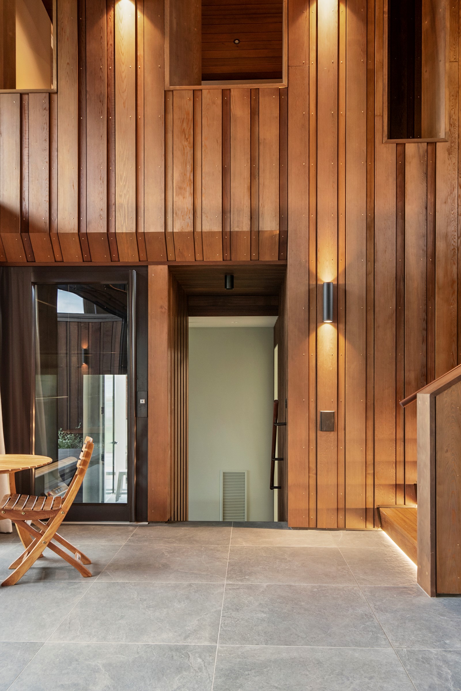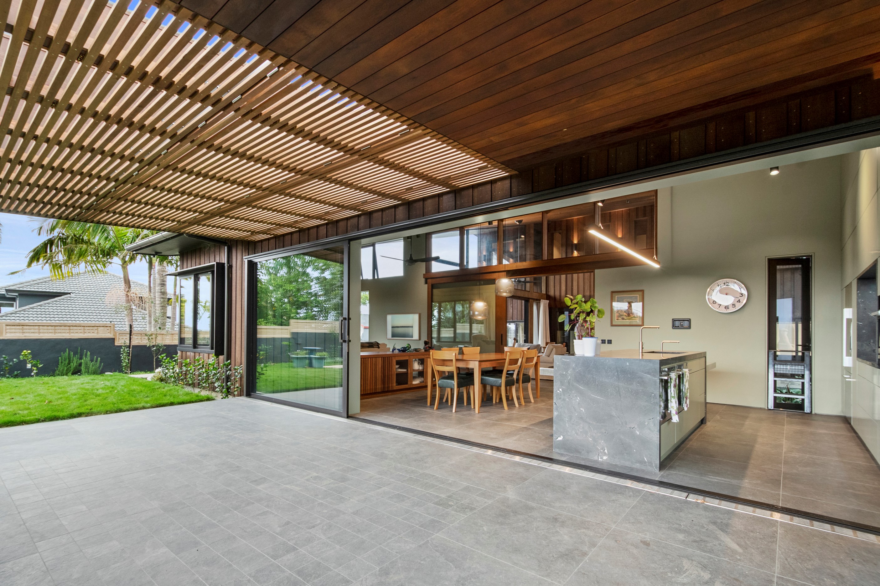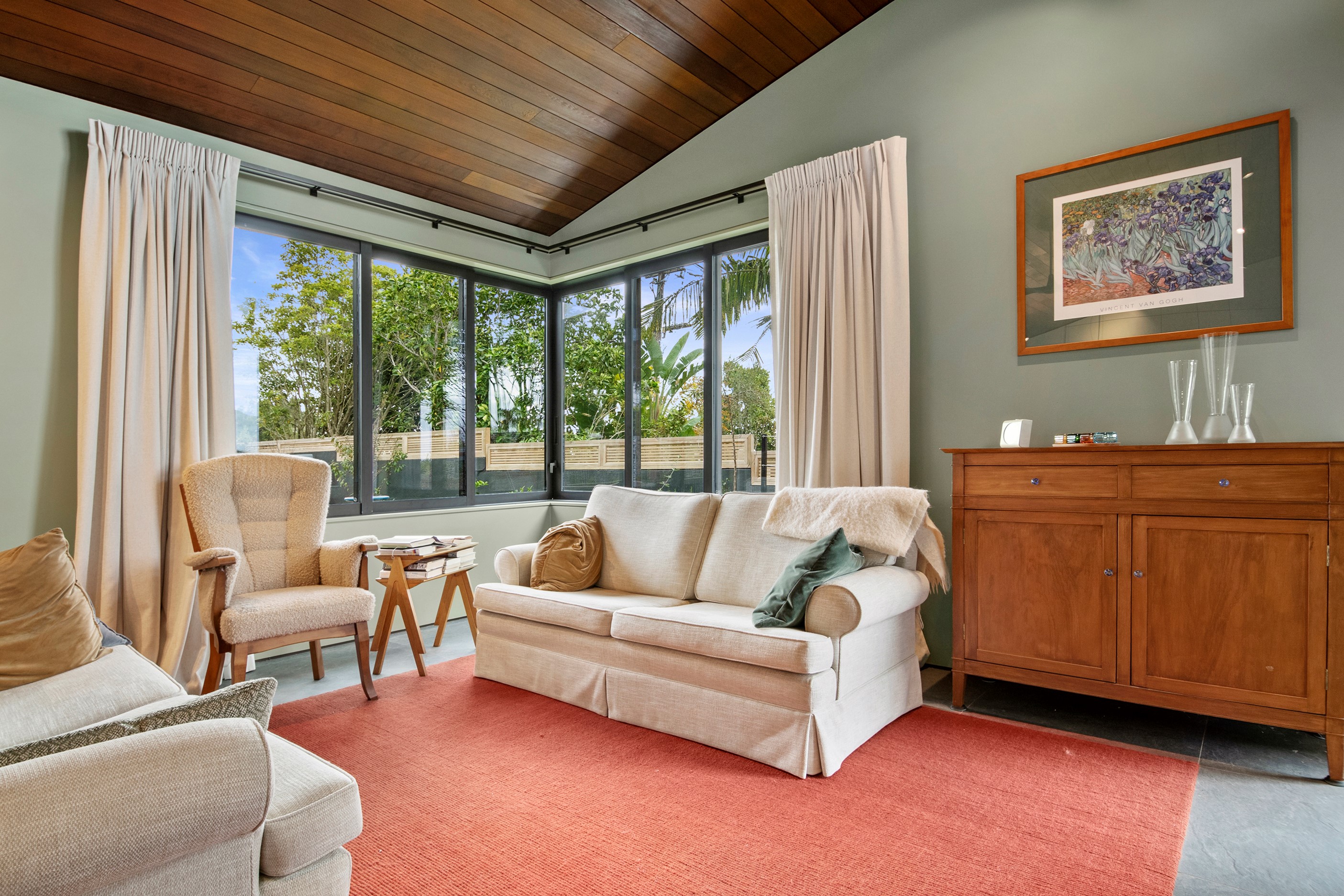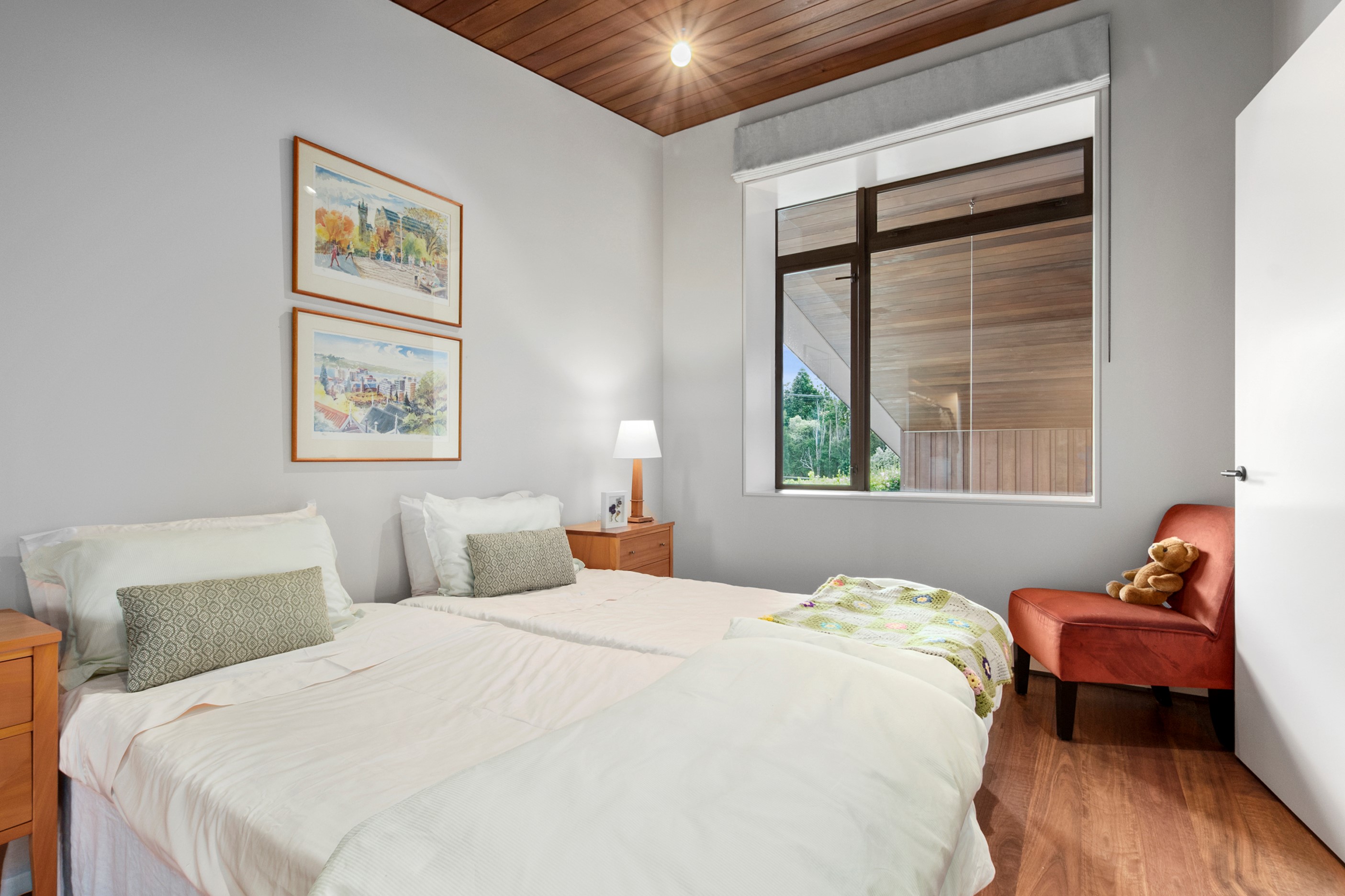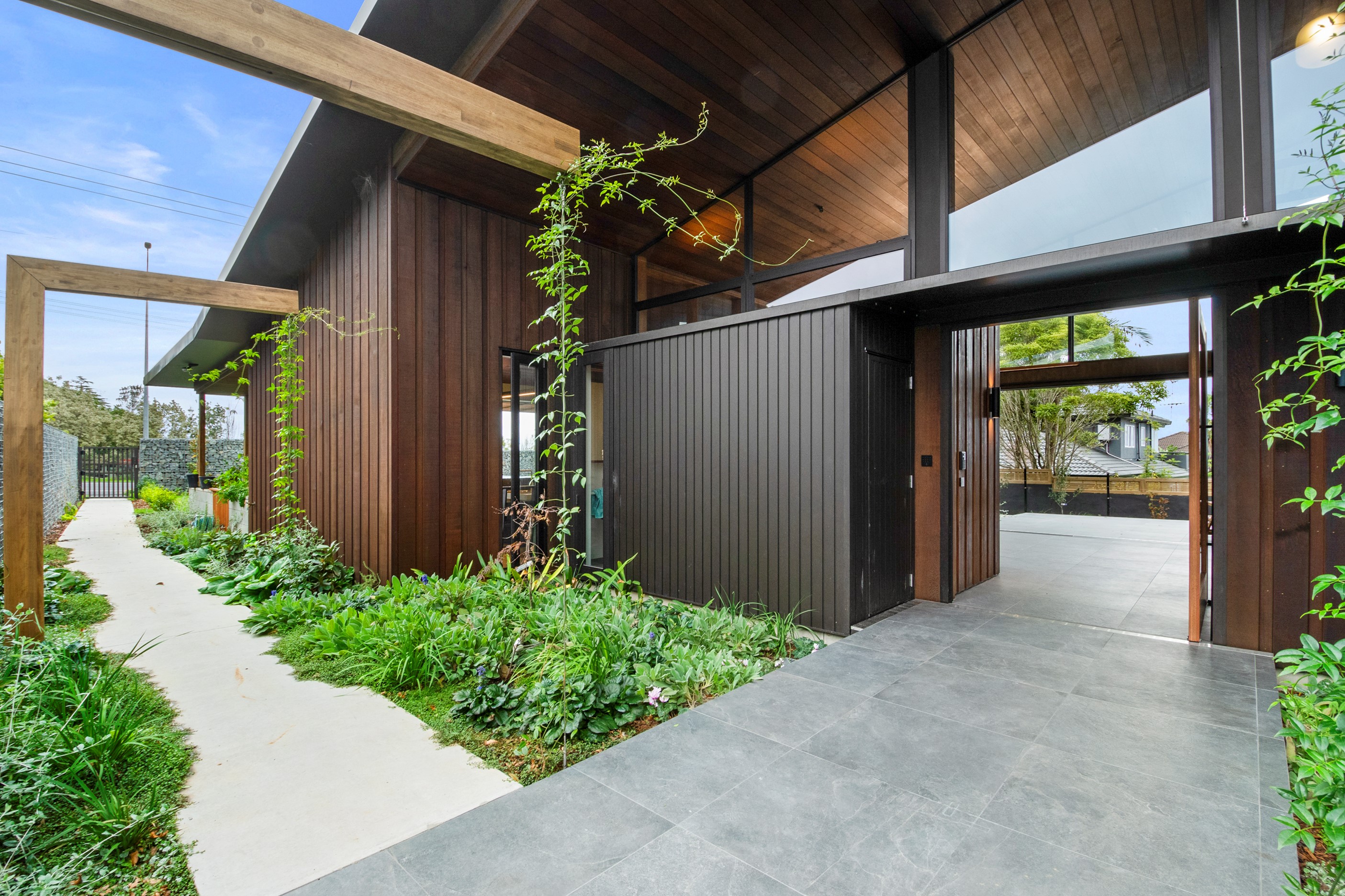 When the clients wanted to build a cutting-edge sustainable home for their retirement, they didn’t need to search very far for the site. They looked at somewhere they’d spent a lot of enjoyable time – their garden. The architect-designed three-bedroom, three-bathroom residence is all about ease of living and self-sufficiency. It includes a lift, level-entry outdoor spaces and wheelchair-accessible rooms. An energy consultant was engaged early in the design process to ensure all the solar energy, water storage, security, data and electricity systems were compatible. But this 280sqm split-level home is about more than its practical performance – it is also a wooded wonderland. The exterior is clad in cedar weatherboards, while inside a dressed version lines the walls. There’s cedar sarking on ceilings and the upper floors are made of spotted gum. Light streams in through swathes of glazing, giving the timber a warm glow. Soaring ceilings add to the sense of openness and space, not unlike a gallery. Concrete floors with hydronic heating are tiled. The kitchen is the perfect mix of high-end materials, pared-back style and accessibility. Outdoors, the landscaping is sublime.