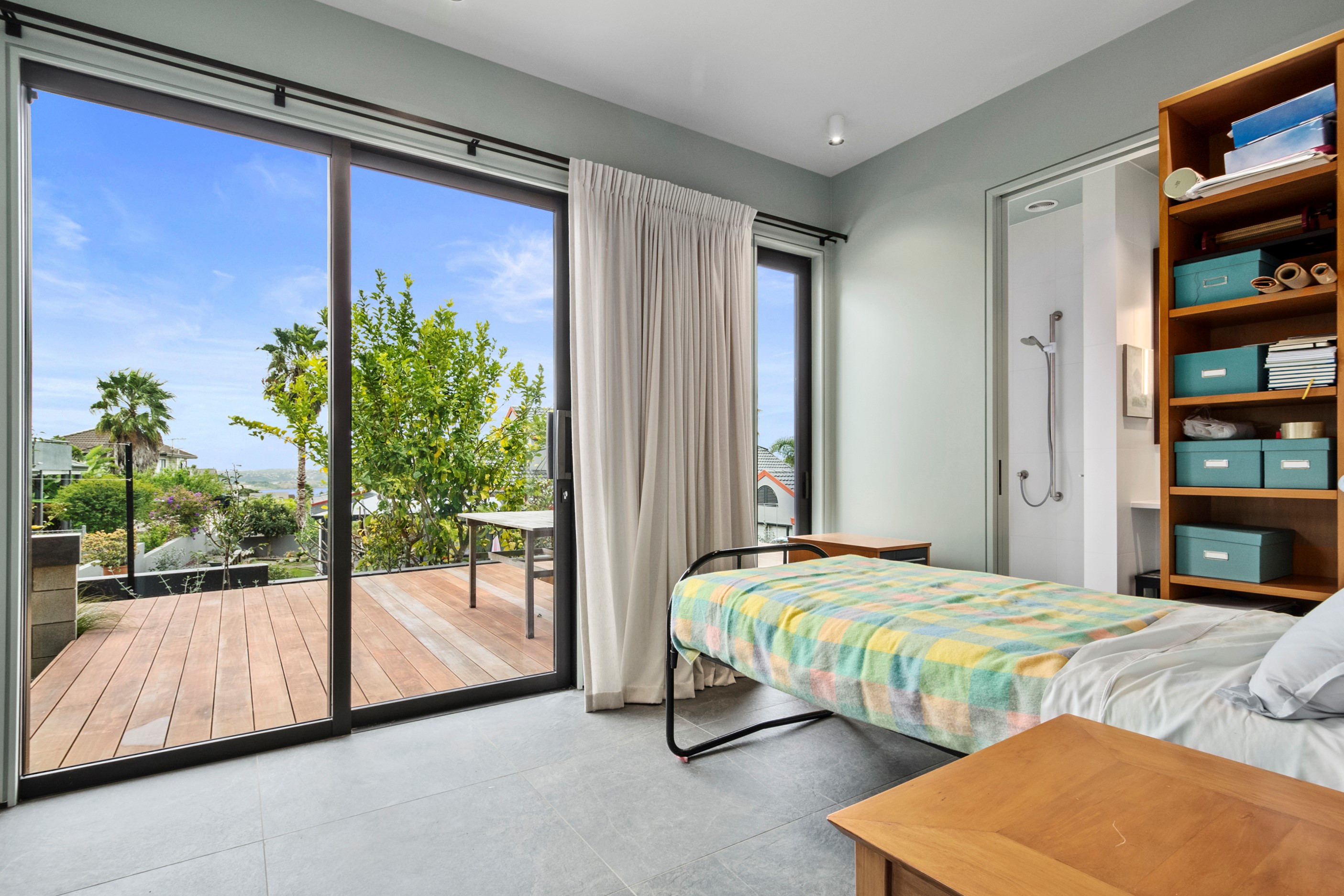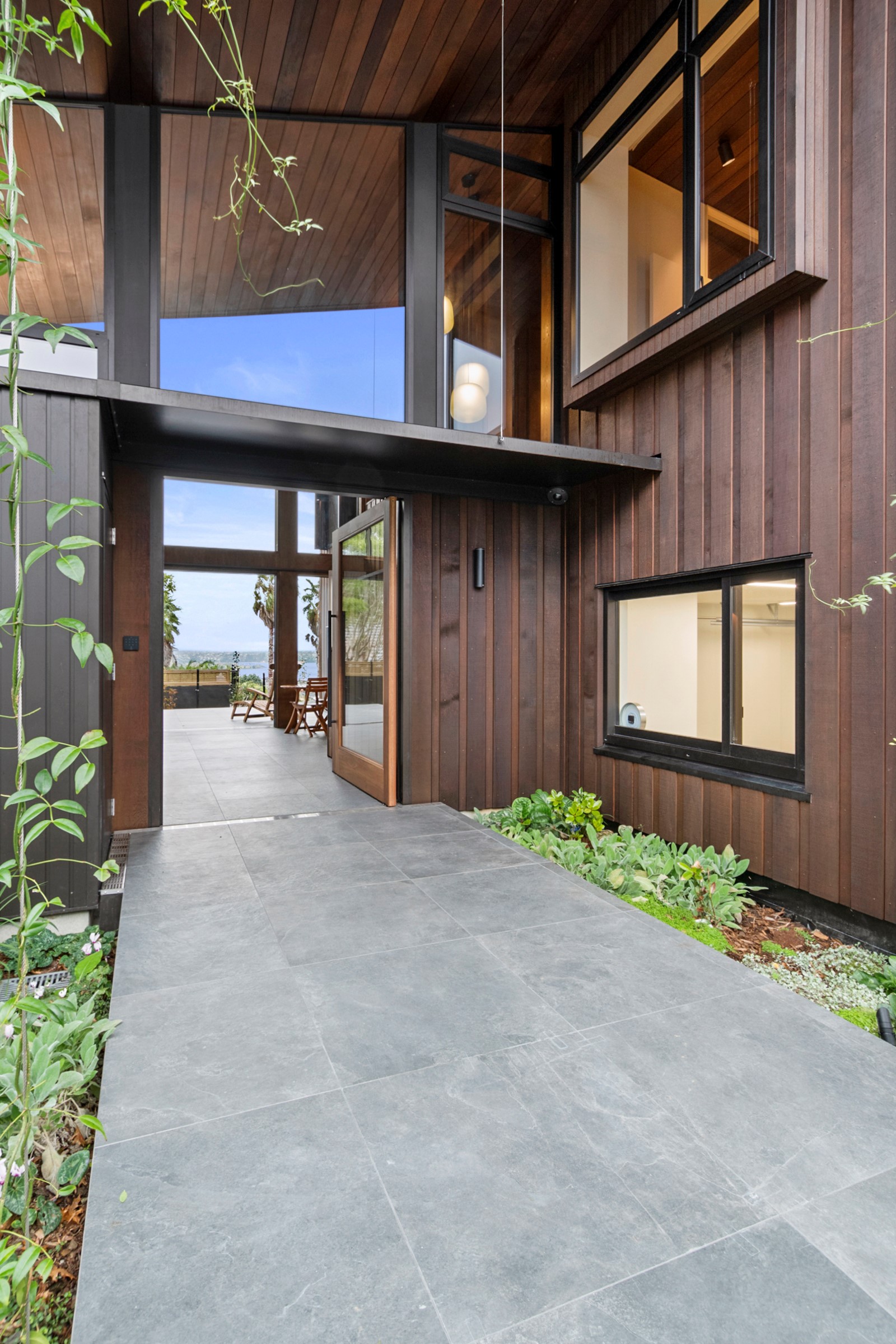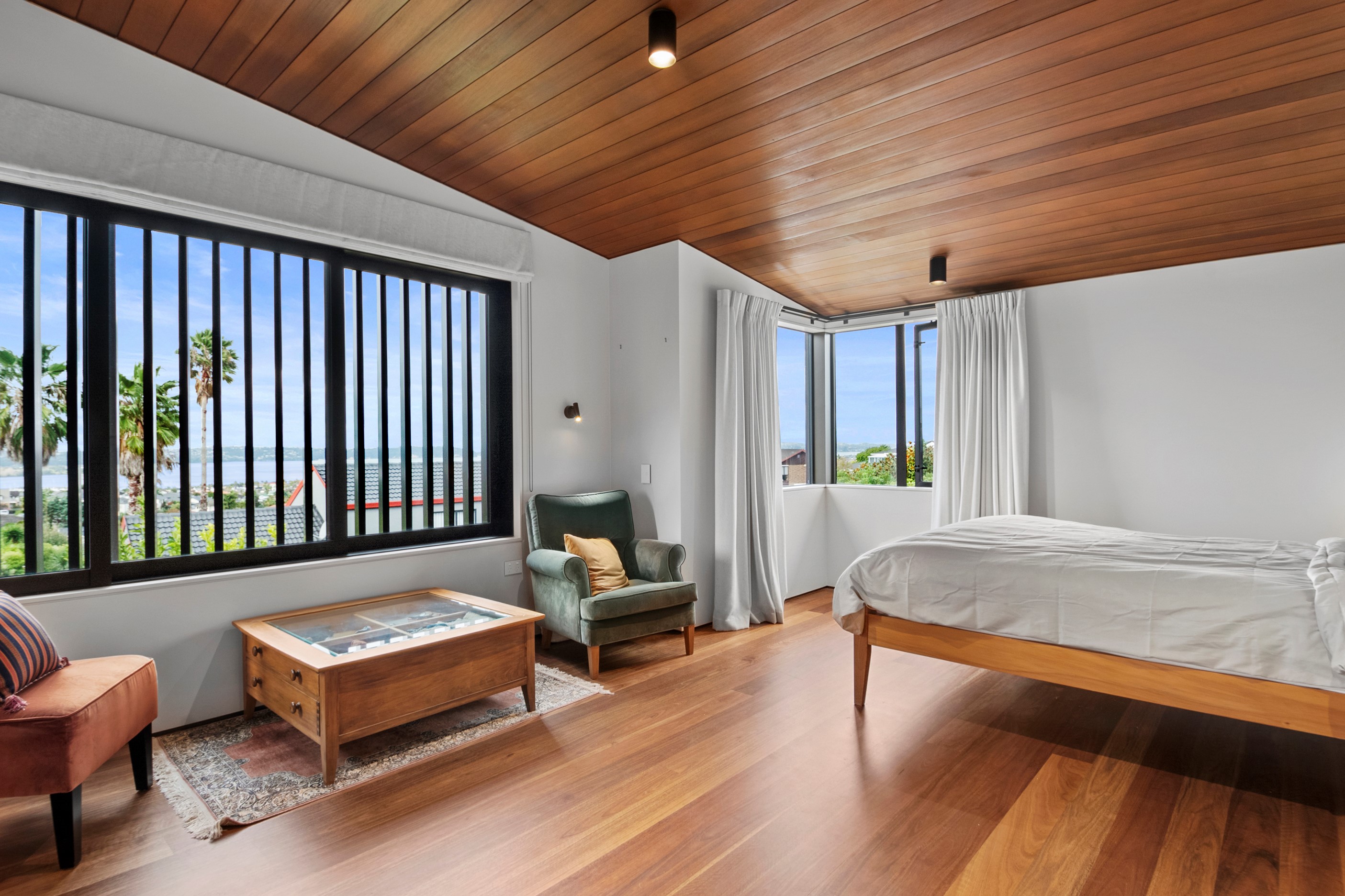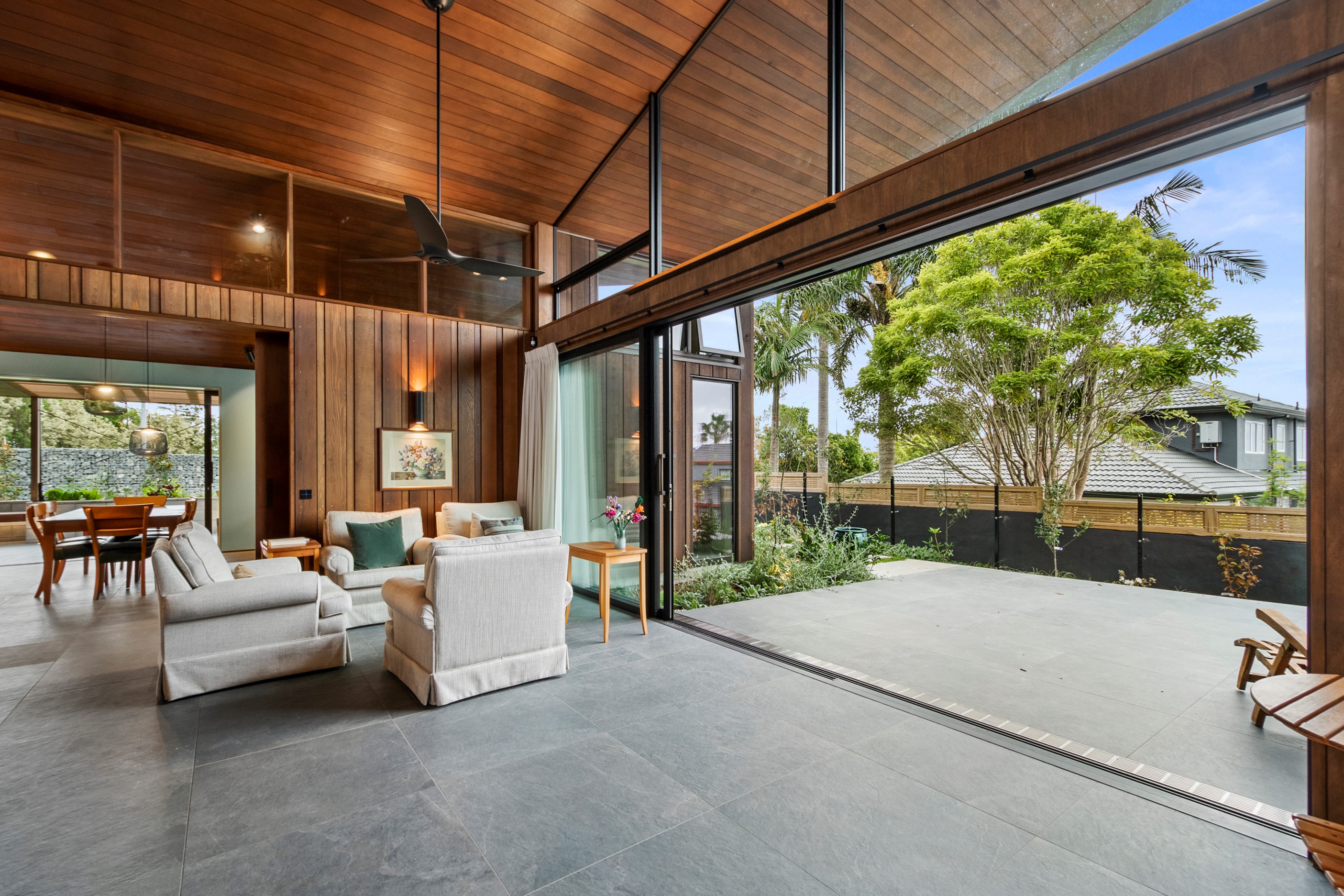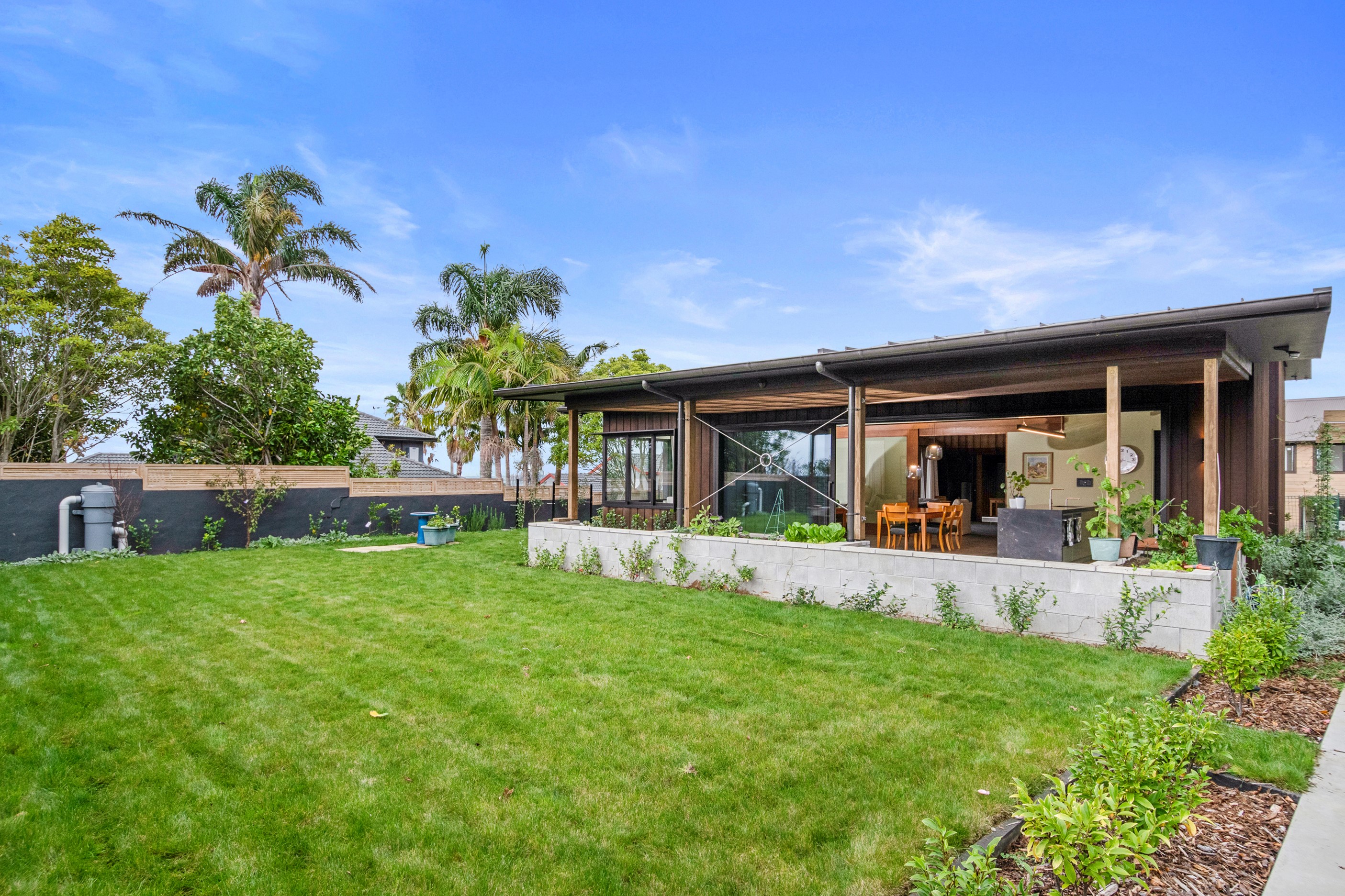 When the clients wanted to build a cutting-edge sustainable home for their retirement, they didn’t need to search very far for the site. They looked at somewhere they’d spent a lot of enjoyable time – their garden. The architect-designed three-bedroom, three-bathroom residence is all about ease of living and self-sufficiency. It includes a lift, level-entry outdoor spaces and wheelchair-accessible rooms. An energy consultant was engaged early in the design process to ensure all the solar energy, water storage, security, data and electricity systems were compatible. But this 280sqm split-level home is about more than its practical performance – it is also a wooded wonderland. The exterior is clad in cedar weatherboards, while inside a dressed version lines the walls. There’s cedar sarking on ceilings and the upper floors are made of spotted gum. Light streams in through swathes of glazing, giving the timber a warm glow. Soaring ceilings add to the sense of openness and space, not unlike a gallery. Concrete floors with hydronic heating are tiled. The kitchen is the perfect mix of high-end materials, pared-back style and accessibility. Outdoors, the landscaping is sublime.