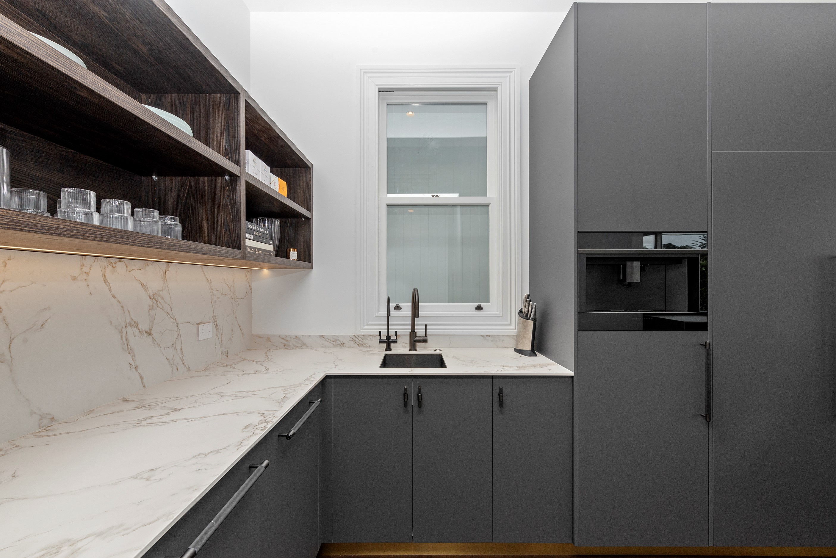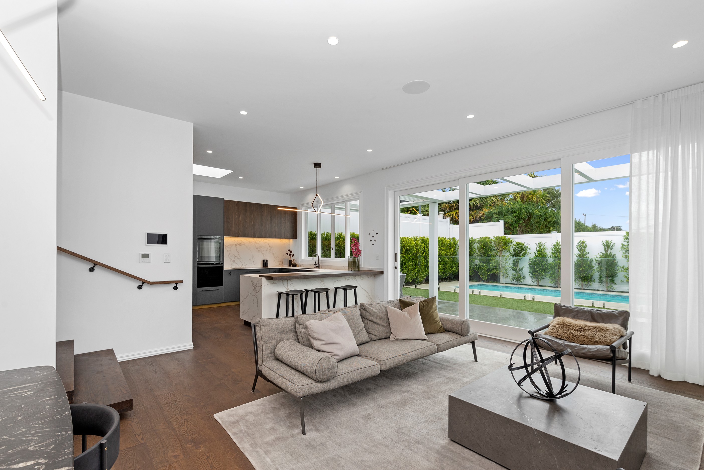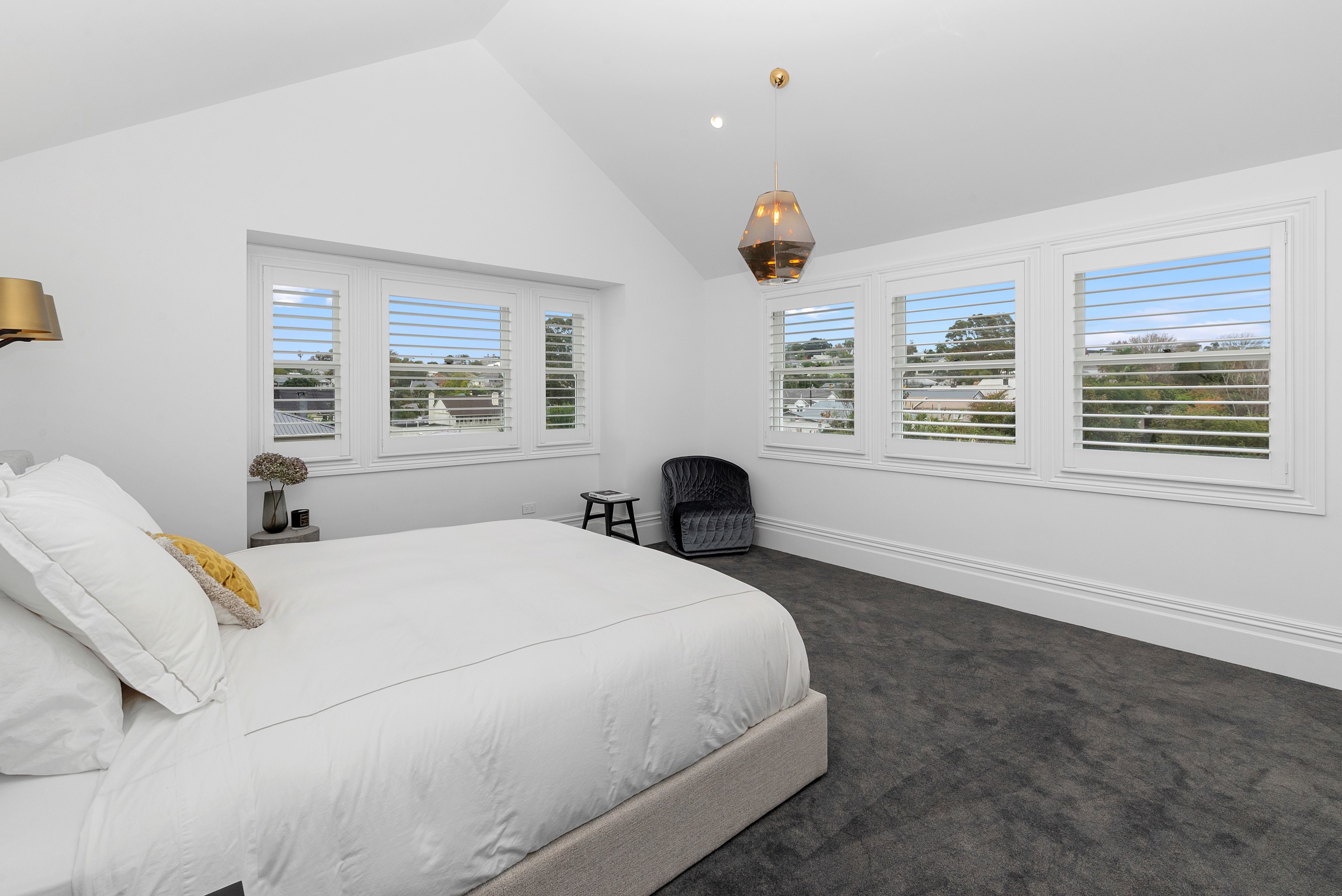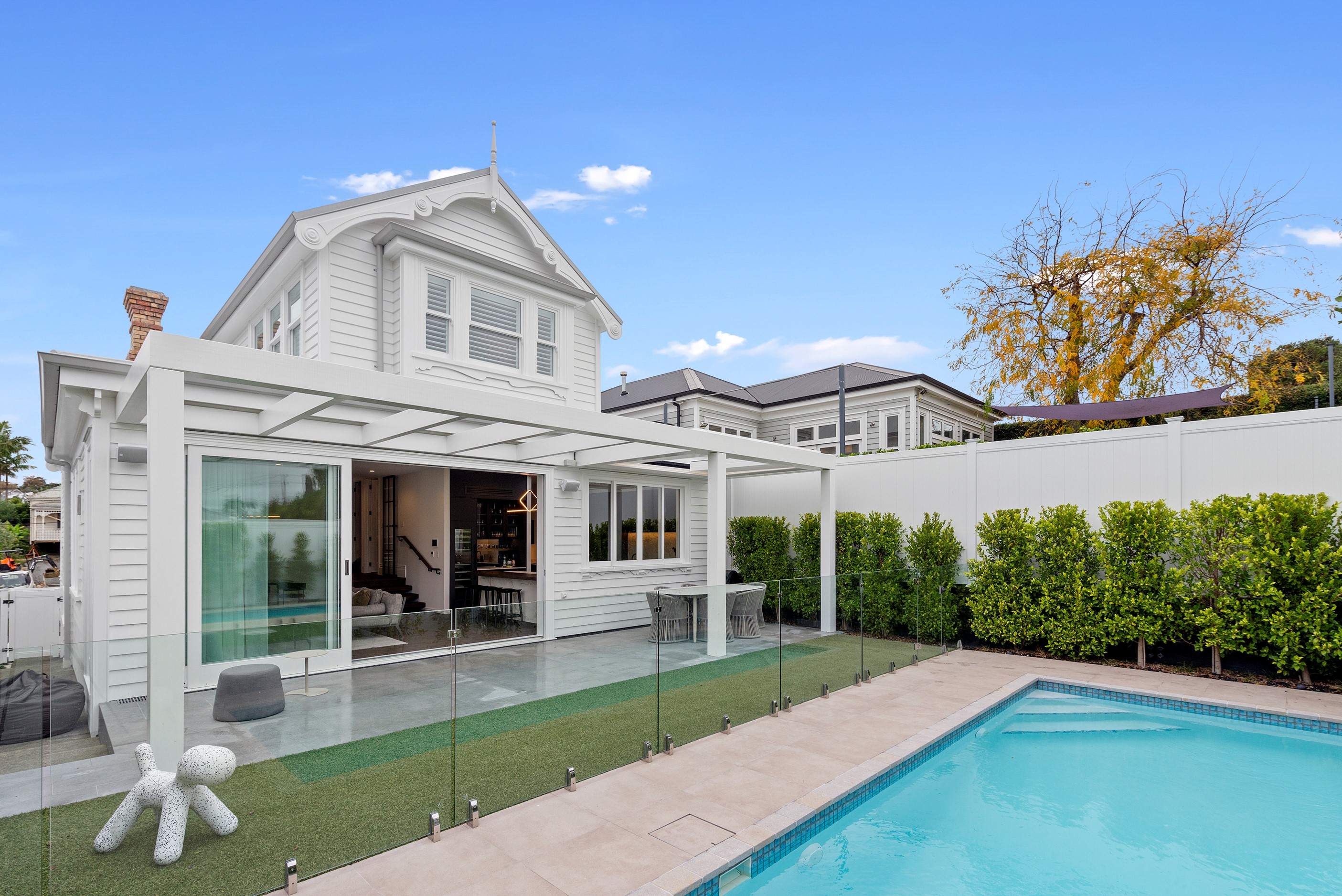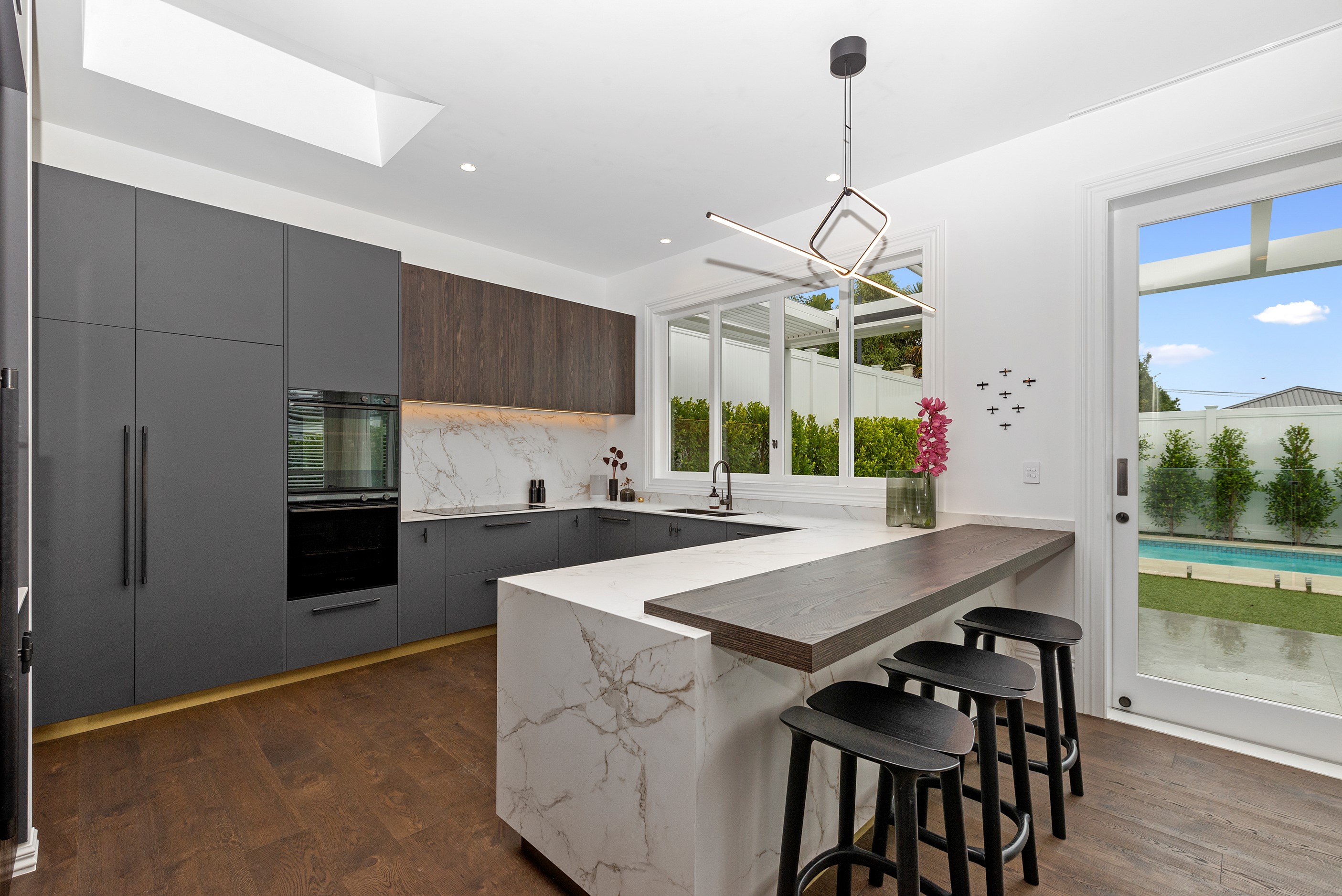 This white swan was once the ugliest duckling on the block. Peeling paint, rusty roofing, smashed windows and rooms coated in spray paint and graffiti – the builder had never seen a property in such a state. So began the metamorphosis, from dilapidated to drop-dead gorgeous. The once-sad villa has undergone a “head-to-toe” renovation and also includes an extension – the results are nothing short of remarkable. The now high-end, three-level 336sqm home has four bedrooms, three bathrooms, a swimming pool and bags of style. In order to create the new basement garage, laundry and storage space, the team took away 55 truckloads of earth and put the house on cribs. The middle floor is home to three reconfigured bedrooms, plus the extension out back with dove-grey kitchen and living-dining space flowing to an outdoor area and the pool. In the new upper level – you’ll find a private retreat with the main bedroom, ensuite and walk-in wardrobe. New life has been breathed into every room and space, and the additions have been handled seamlessly and sympathetically. It’s almost impossible to imagine where the old stops and new begins, such is the craftsmanship on this project. It’s perfect.
