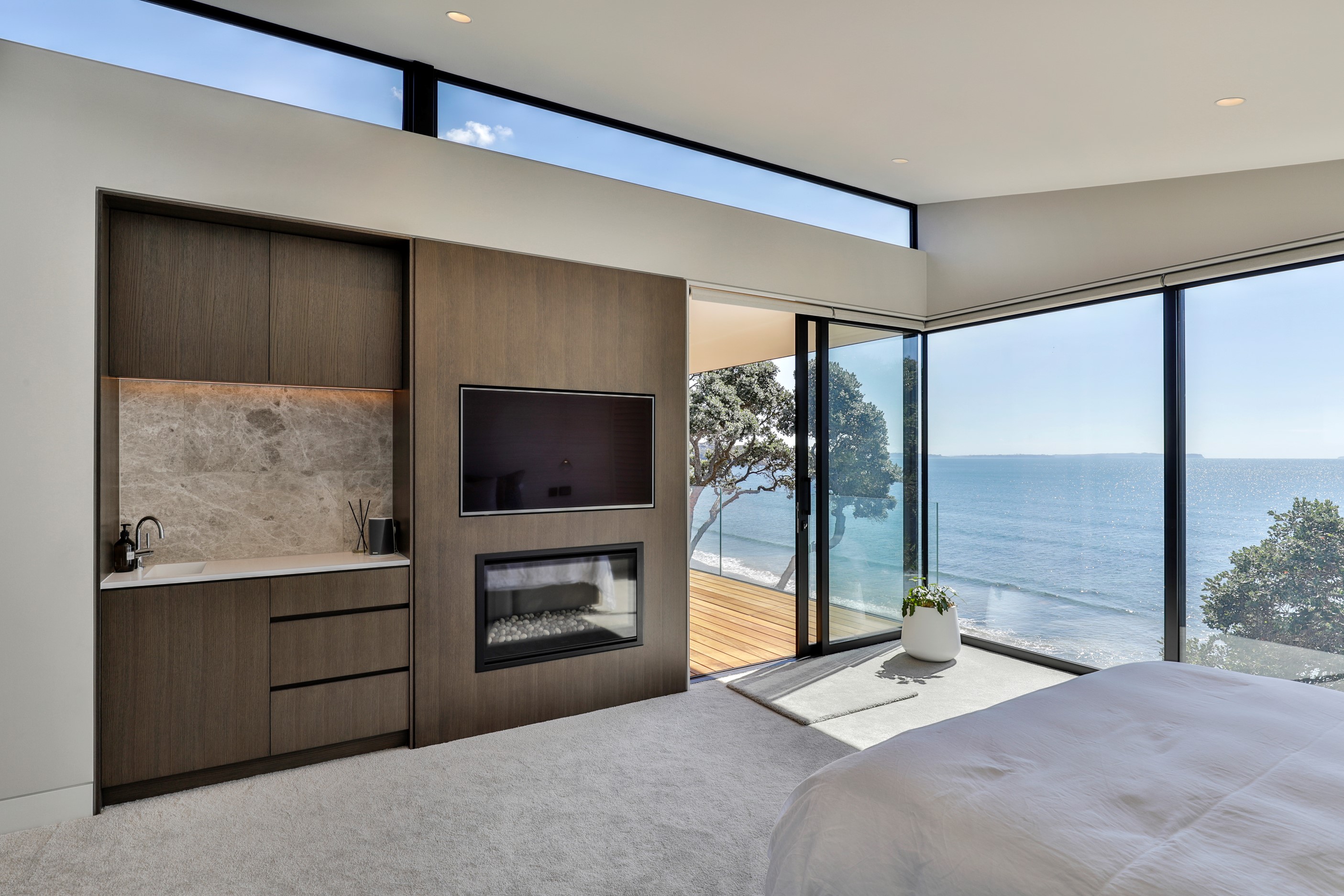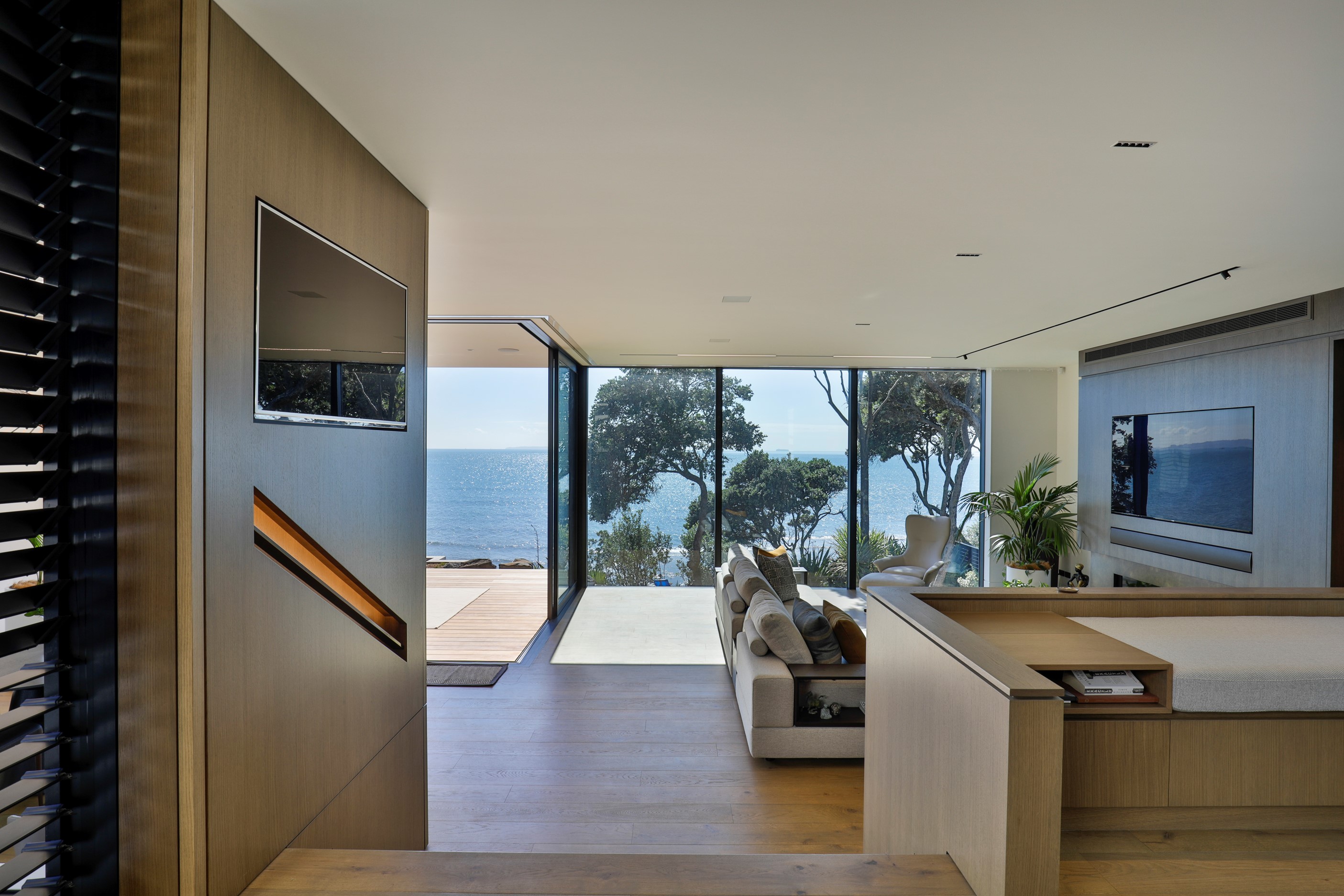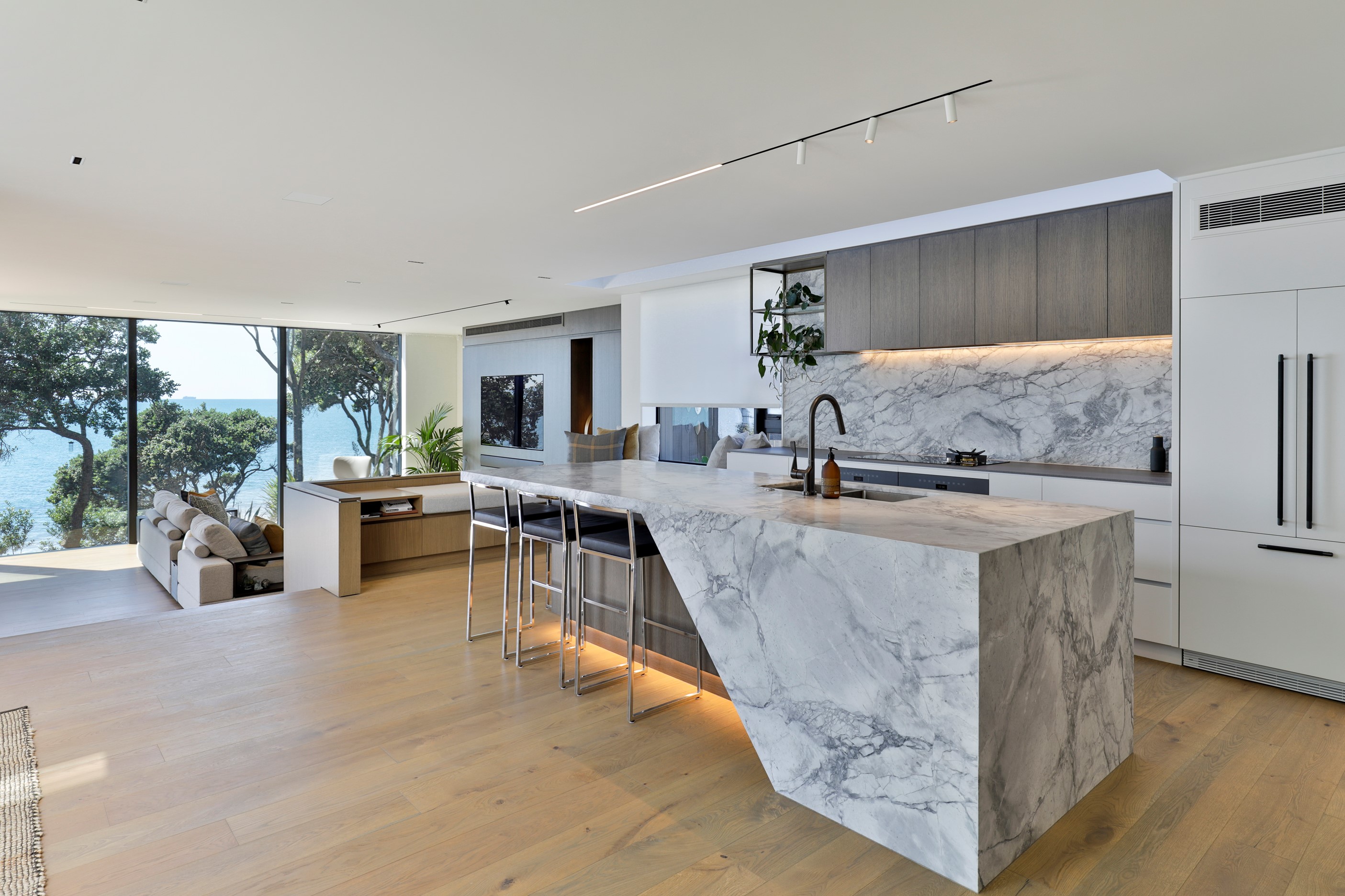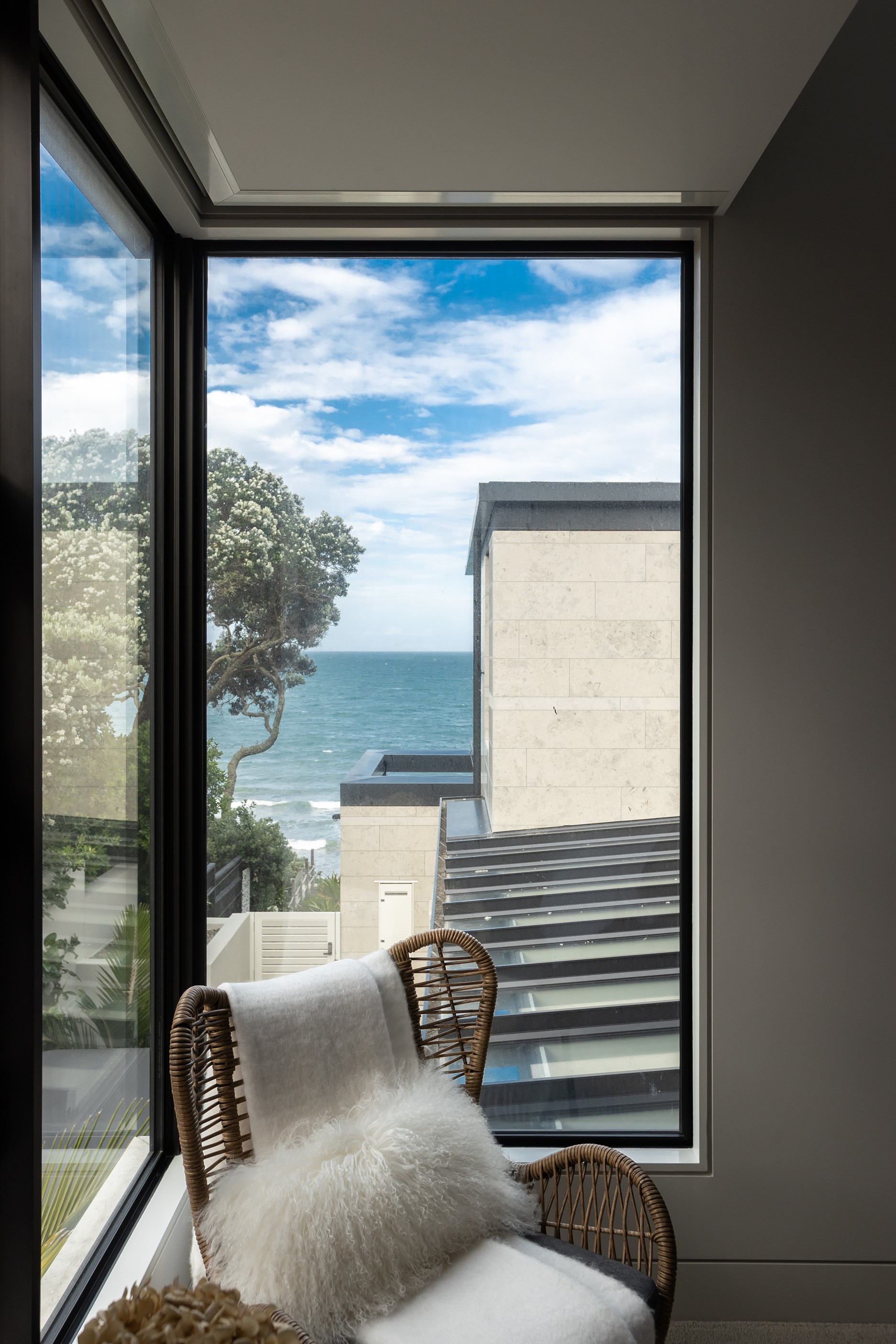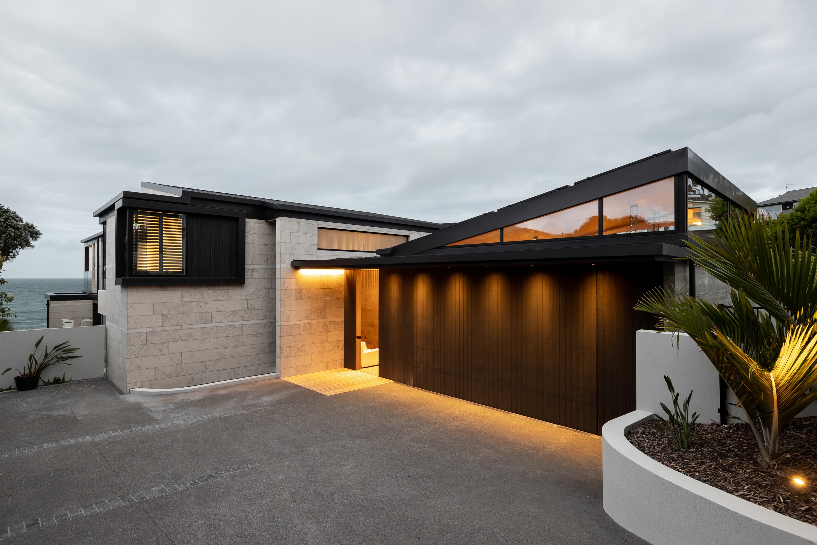 When you own a piece of coastal paradise like this, what you build on it needs to be exceptional. That was certainly the case for the clients who wanted to replace the rundown house on the site with their dream home. Enter the teams from QPC Build Group and award-winning Scarlet Architects who delivered the clients’ vision of a bespoke, luxury cliff-top home. Collaboration was always part of the service – enthusiasm, commitment and assurance, without the stress – even with the tumult of Covid lockdowns and resulting complications. The dream home was completed with minimal delay and maximum expertise. Like many homes of this calibre, it is spacious – four bedrooms, three bathrooms and three living areas in its 369sqm footprint – but that’s not where the magic resides. It’s crafted into the details, thanks to the builders’ care and attention. You’ll find finesse in the way the home drinks in views of the Hauraki Gulf; in the sheltered loggia; in the many timber interior features, including a wall with a secret door; and the sunken living room, which is a study in understated luxury. This two-level, beachfront house clad in Jura Limestone and Vulcan Abodo, and nestled between the pōhutukawa, is a dream home by any measure.