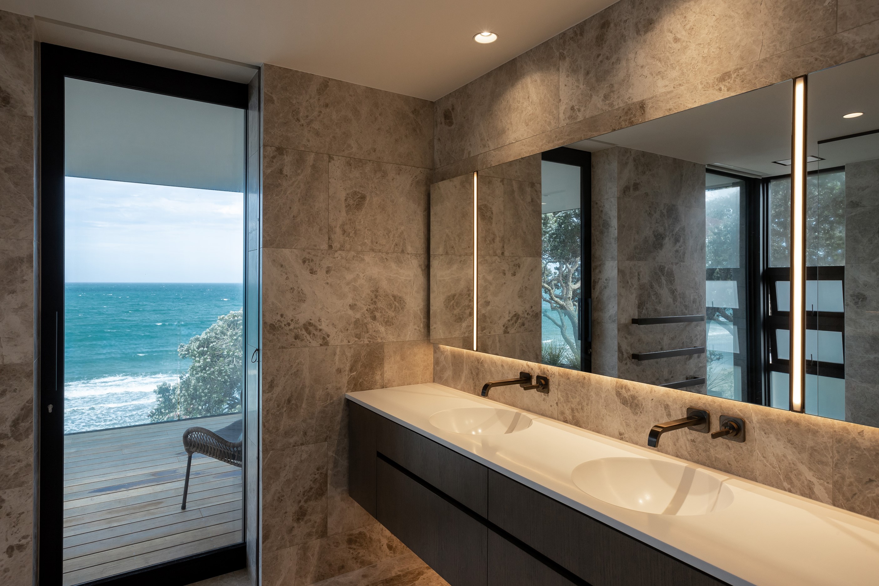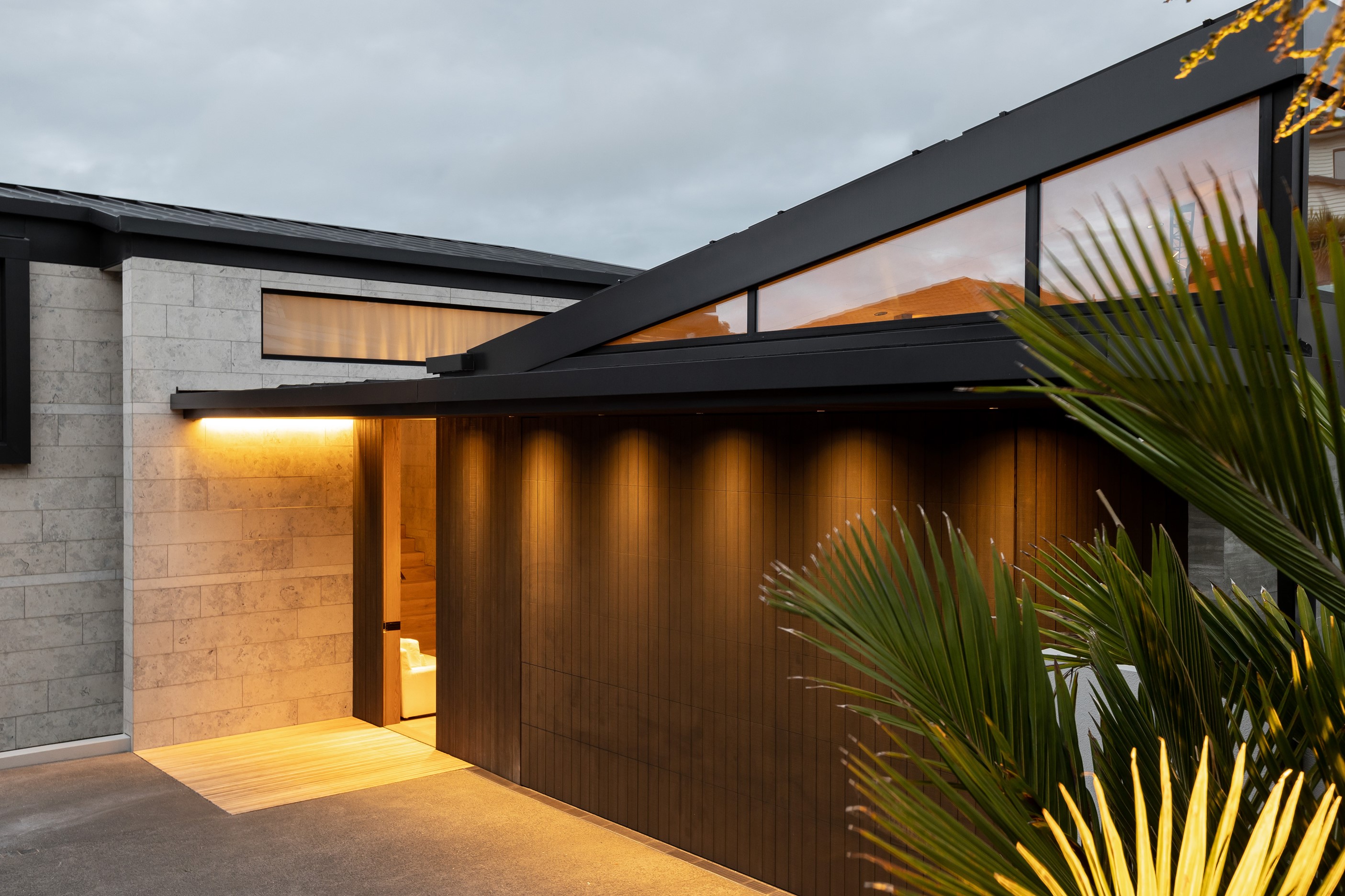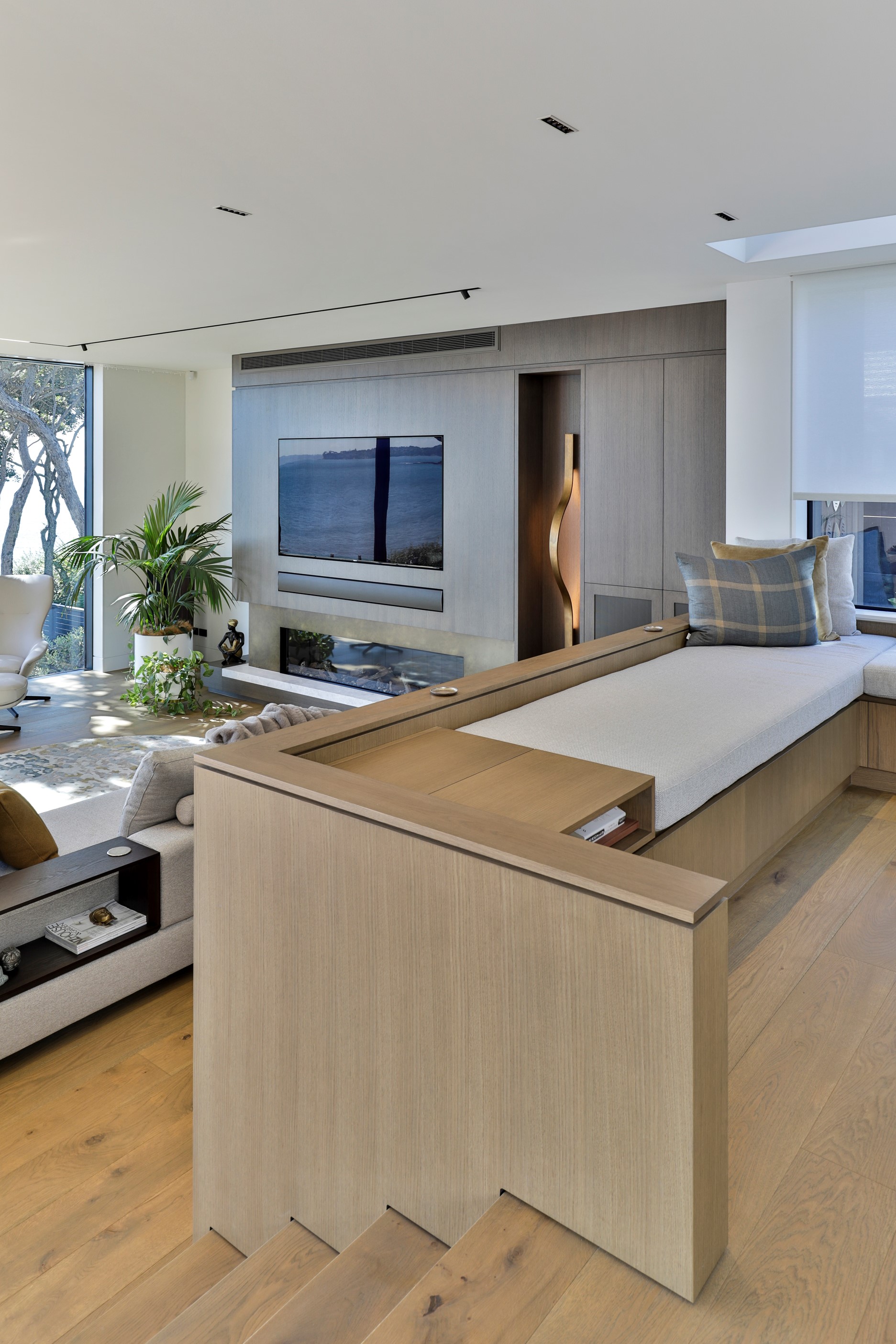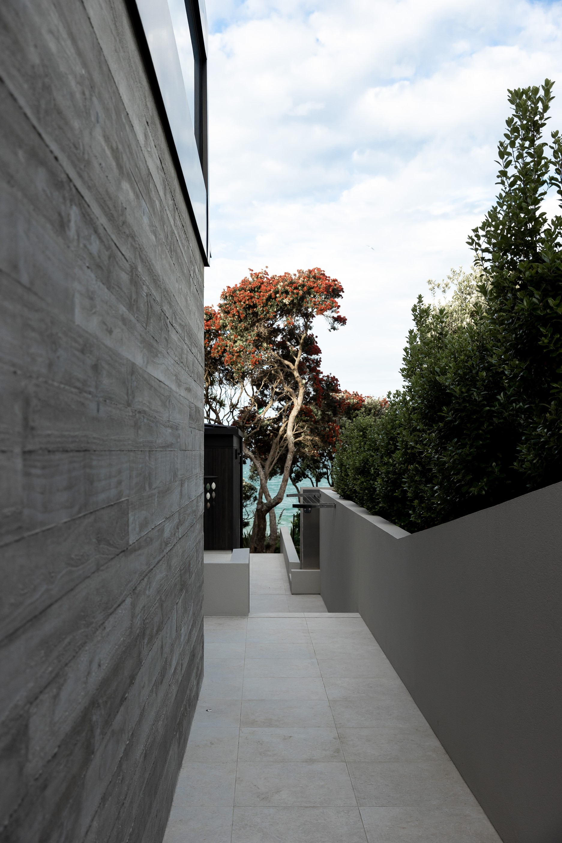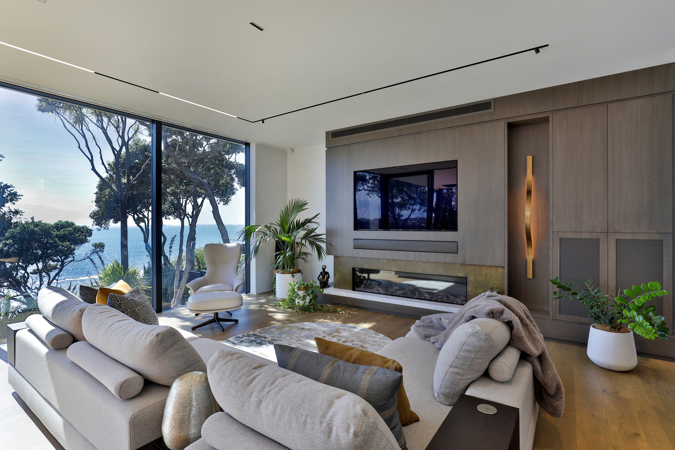 When you own a piece of coastal paradise like this, what you build on it needs to be exceptional. That was certainly the case for the clients who wanted to replace the rundown house on the site with their dream home. Enter the teams from QPC Build Group and award-winning Scarlet Architects who delivered the clients’ vision of a bespoke, luxury cliff-top home. Collaboration was always part of the service – enthusiasm, commitment and assurance, without the stress – even with the tumult of Covid lockdowns and resulting complications. The dream home was completed with minimal delay and maximum expertise. Like many homes of this calibre, it is spacious – four bedrooms, three bathrooms and three living areas in its 369sqm footprint – but that’s not where the magic resides. It’s crafted into the details, thanks to the builders’ care and attention. You’ll find finesse in the way the home drinks in views of the Hauraki Gulf; in the sheltered loggia; in the many timber interior features, including a wall with a secret door; and the sunken living room, which is a study in understated luxury. This two-level, beachfront house clad in Jura Limestone and Vulcan Abodo, and nestled between the pōhutukawa, is a dream home by any measure.