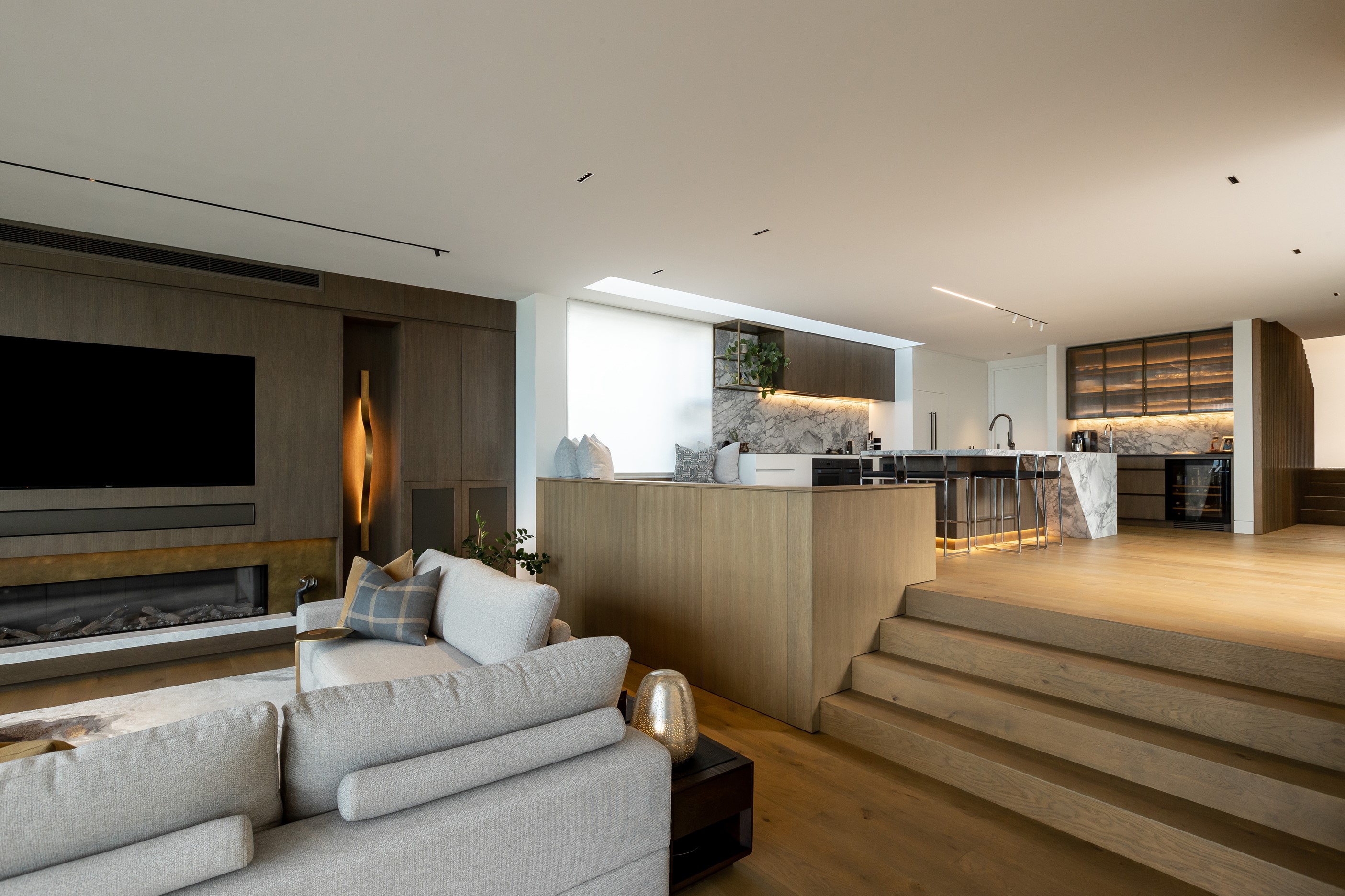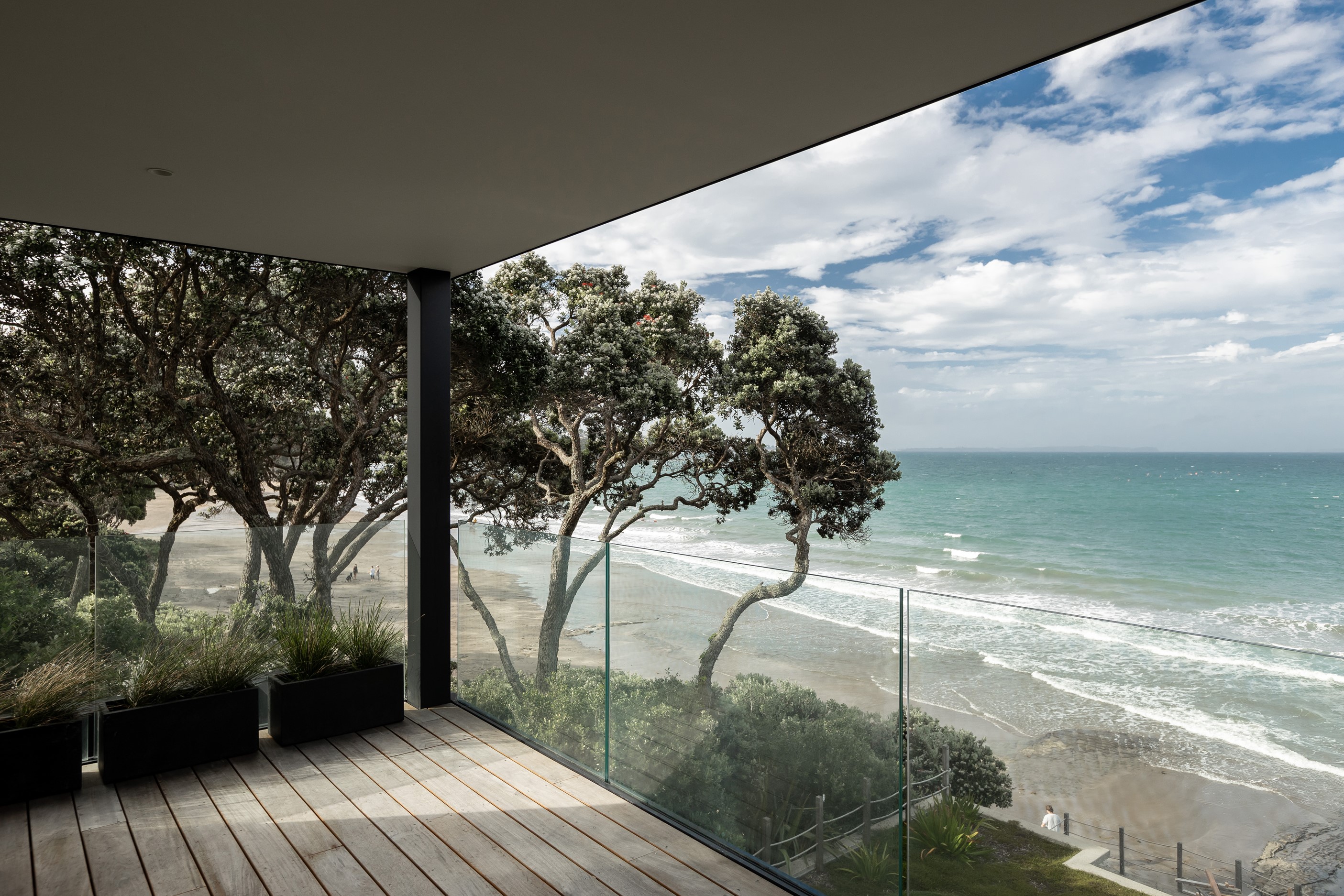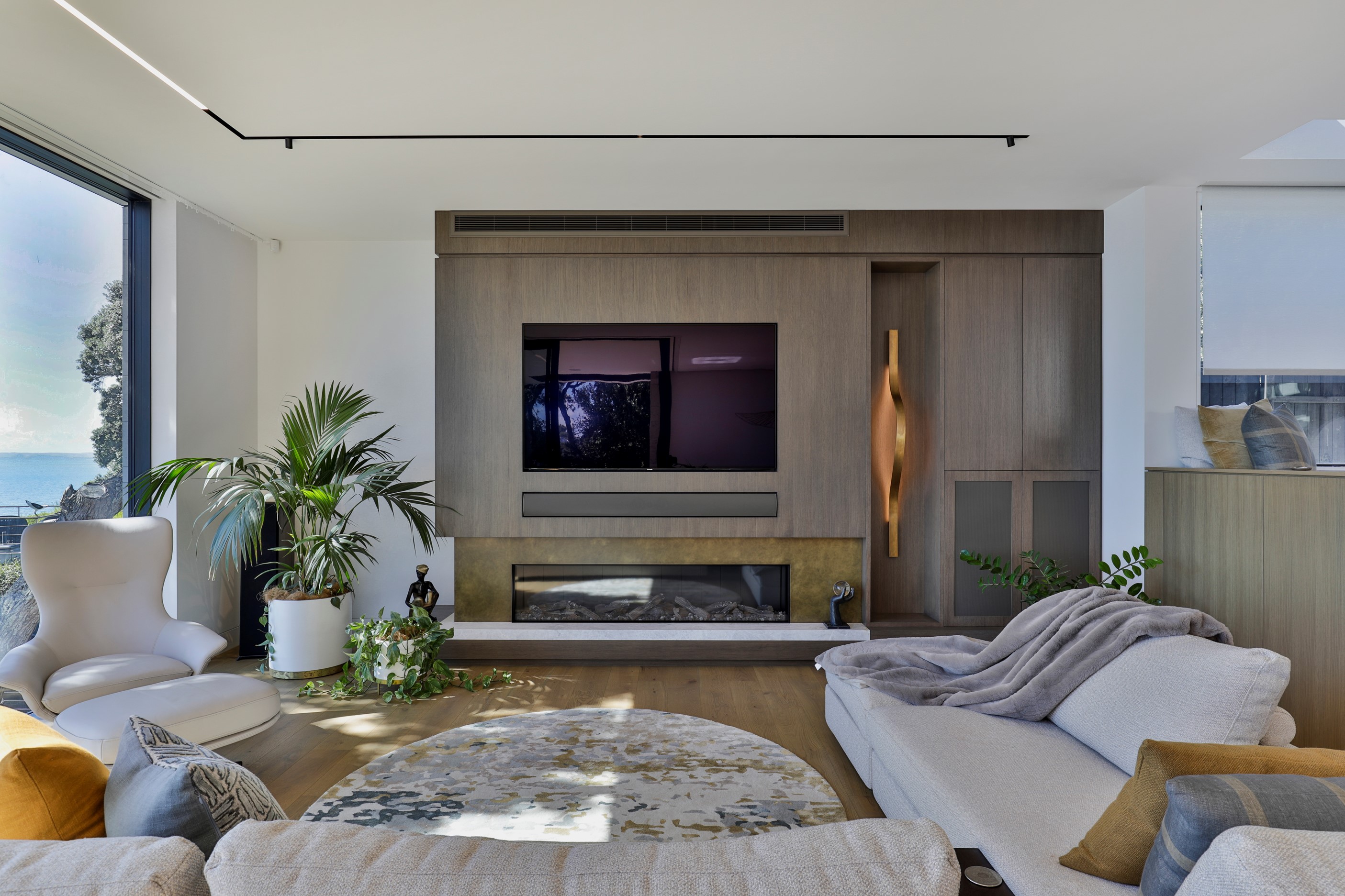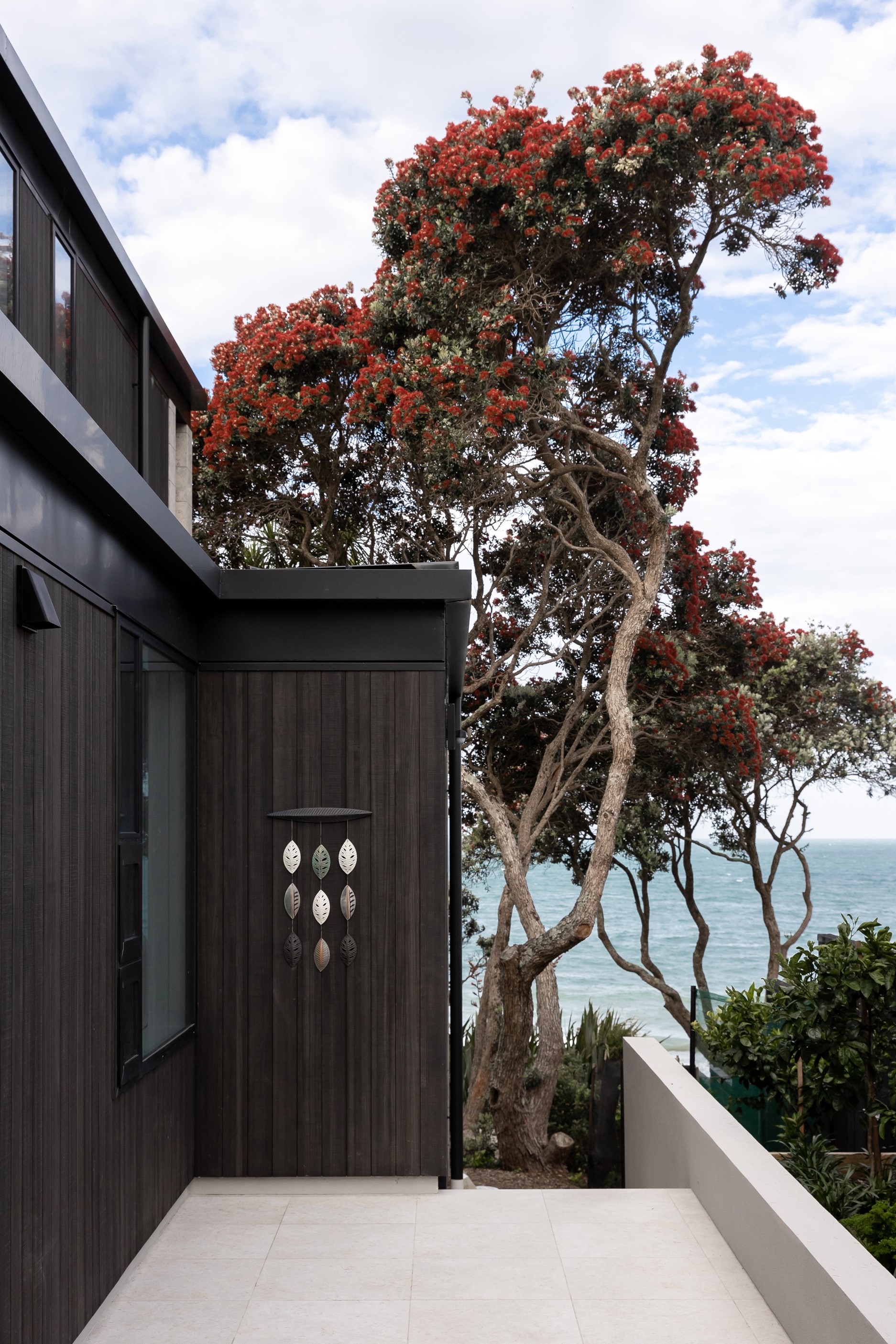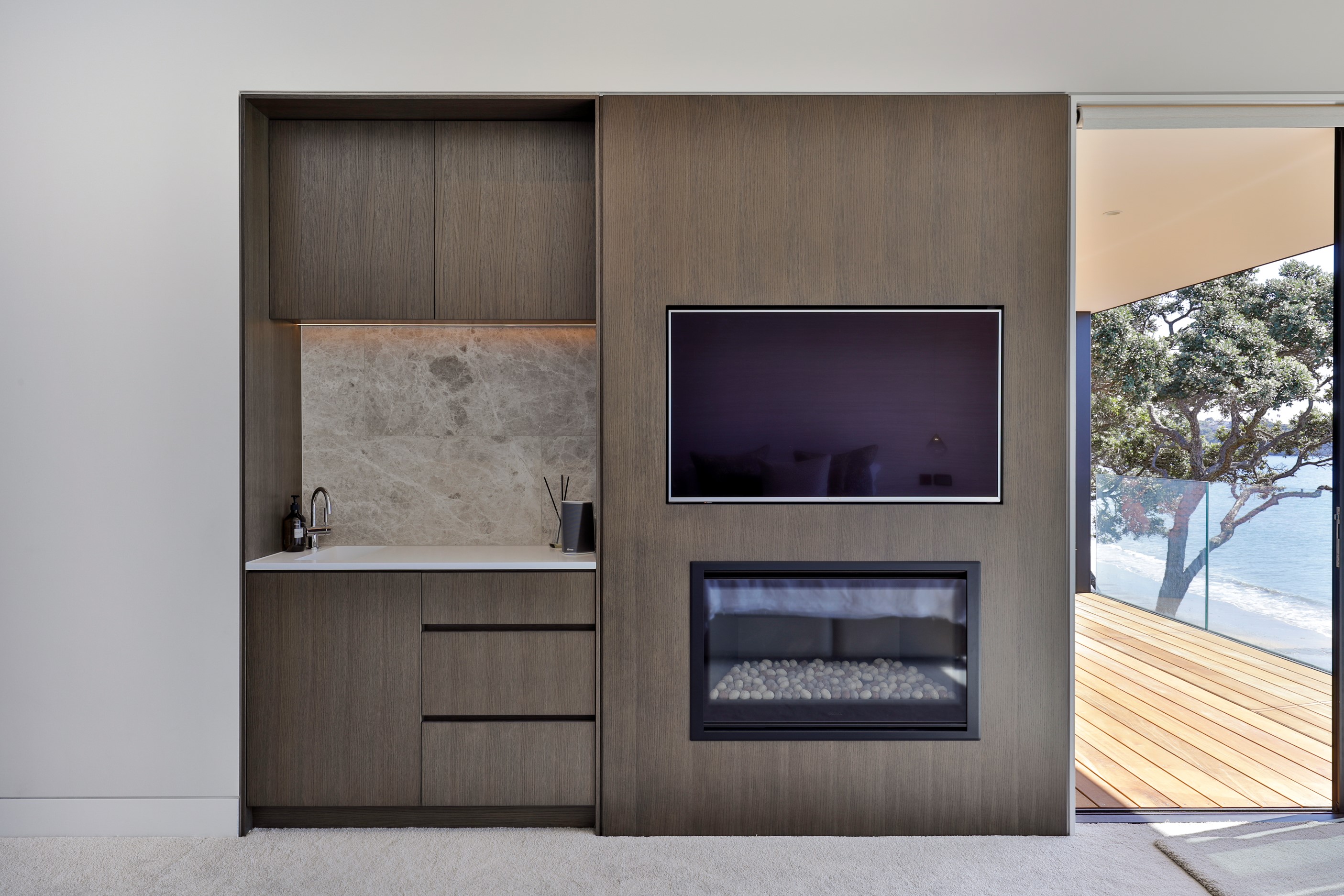 When you own a piece of coastal paradise like this, what you build on it needs to be exceptional. That was certainly the case for the clients who wanted to replace the rundown house on the site with their dream home. Enter the teams from QPC Build Group and award-winning Scarlet Architects who delivered the clients’ vision of a bespoke, luxury cliff-top home. Collaboration was always part of the service – enthusiasm, commitment and assurance, without the stress – even with the tumult of Covid lockdowns and resulting complications. The dream home was completed with minimal delay and maximum expertise. Like many homes of this calibre, it is spacious – four bedrooms, three bathrooms and three living areas in its 369sqm footprint – but that’s not where the magic resides. It’s crafted into the details, thanks to the builders’ care and attention. You’ll find finesse in the way the home drinks in views of the Hauraki Gulf; in the sheltered loggia; in the many timber interior features, including a wall with a secret door; and the sunken living room, which is a study in understated luxury. This two-level, beachfront house clad in Jura Limestone and Vulcan Abodo, and nestled between the pōhutukawa, is a dream home by any measure.