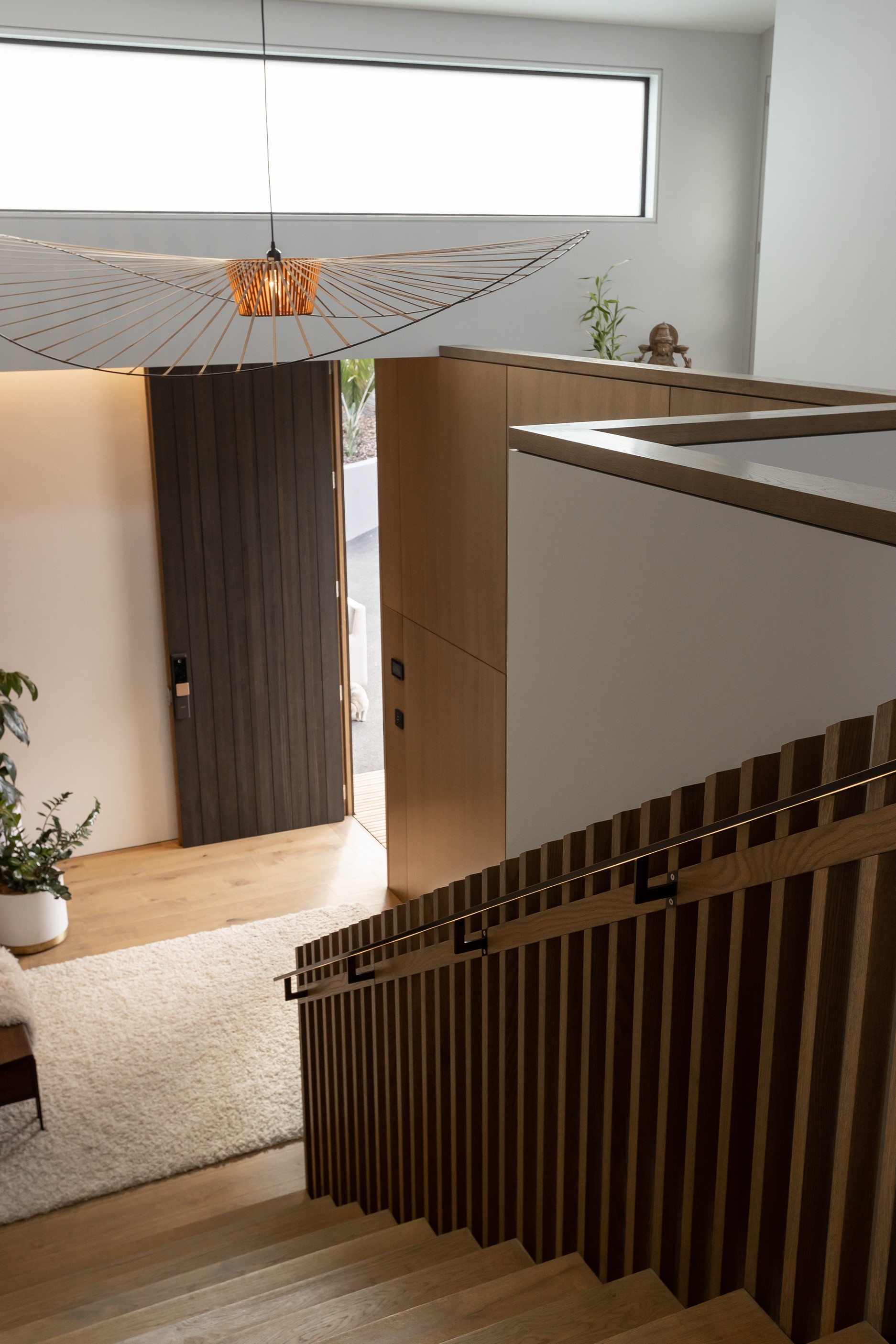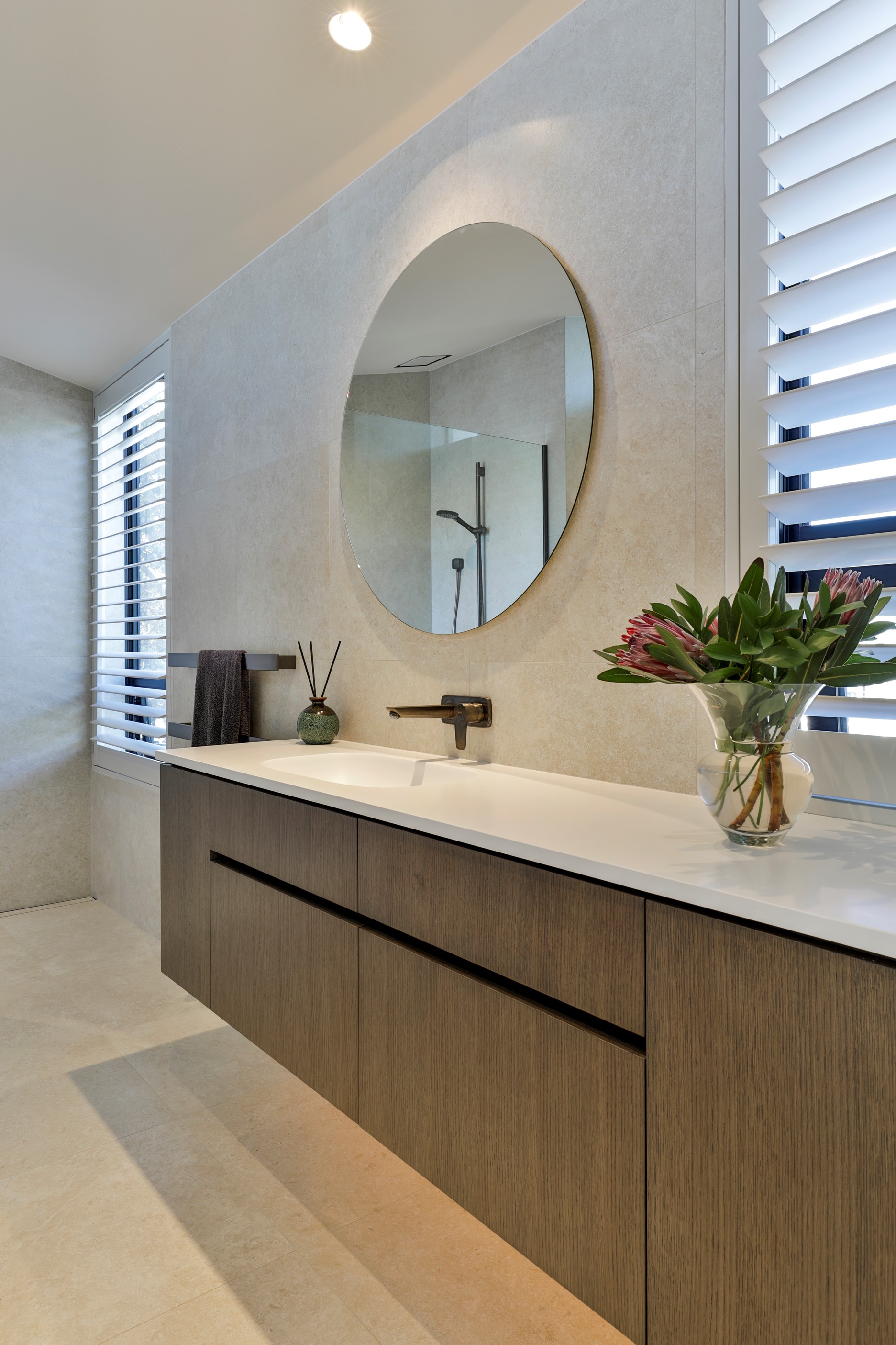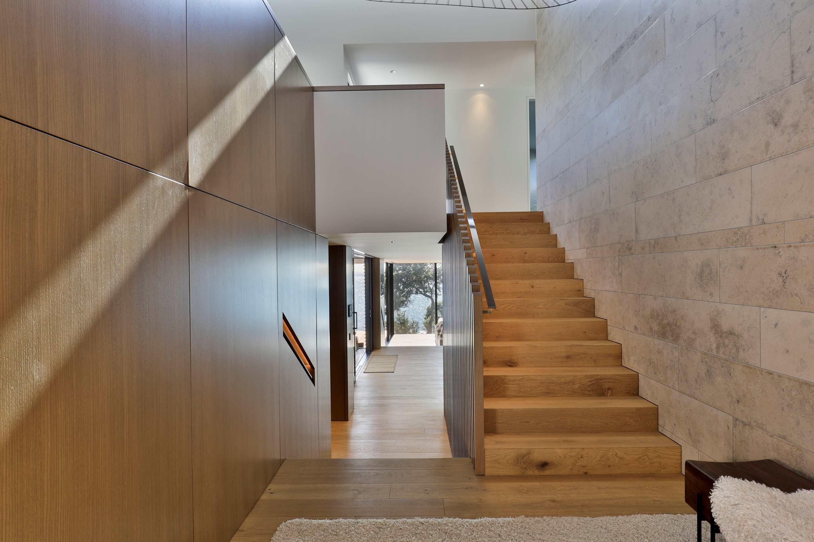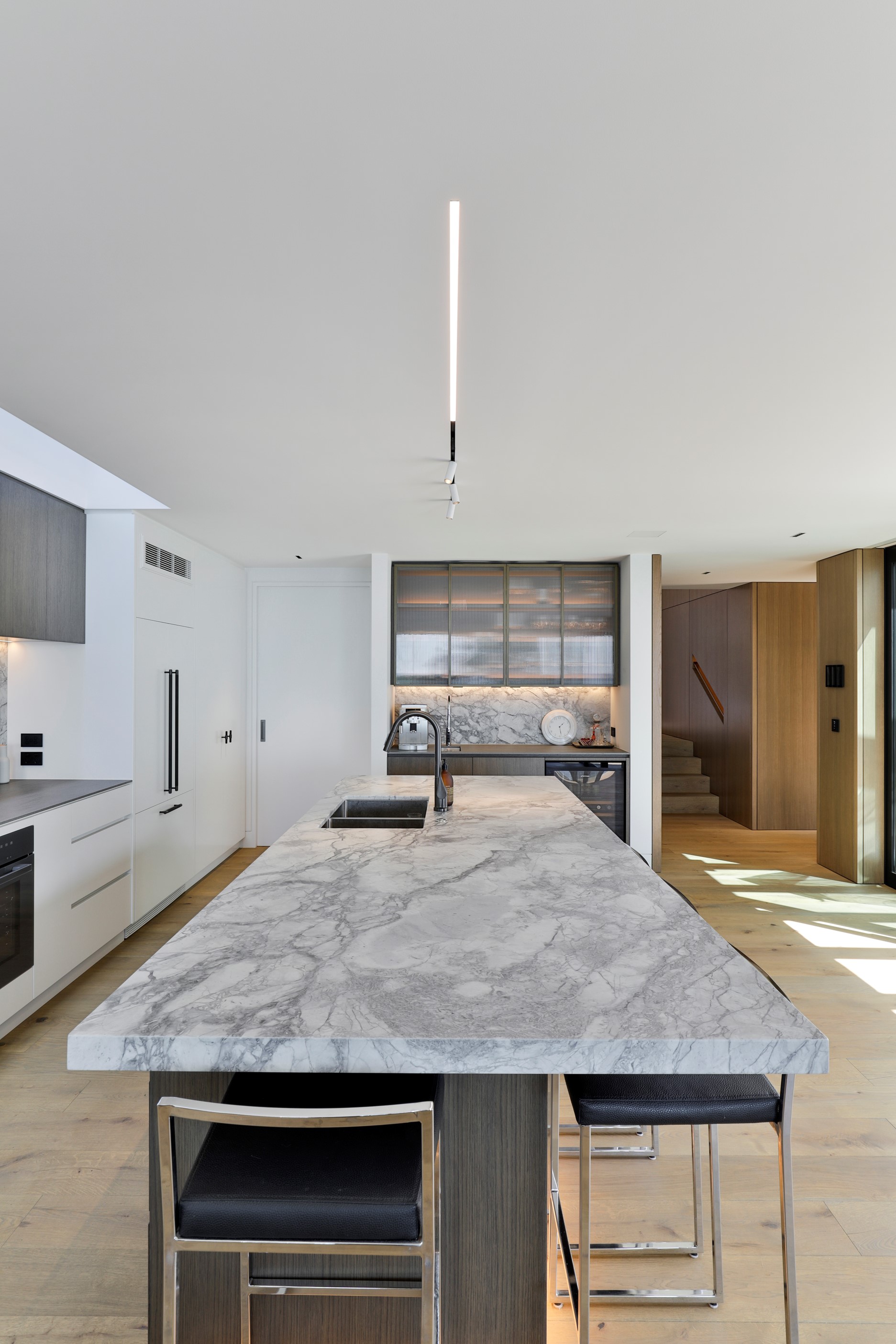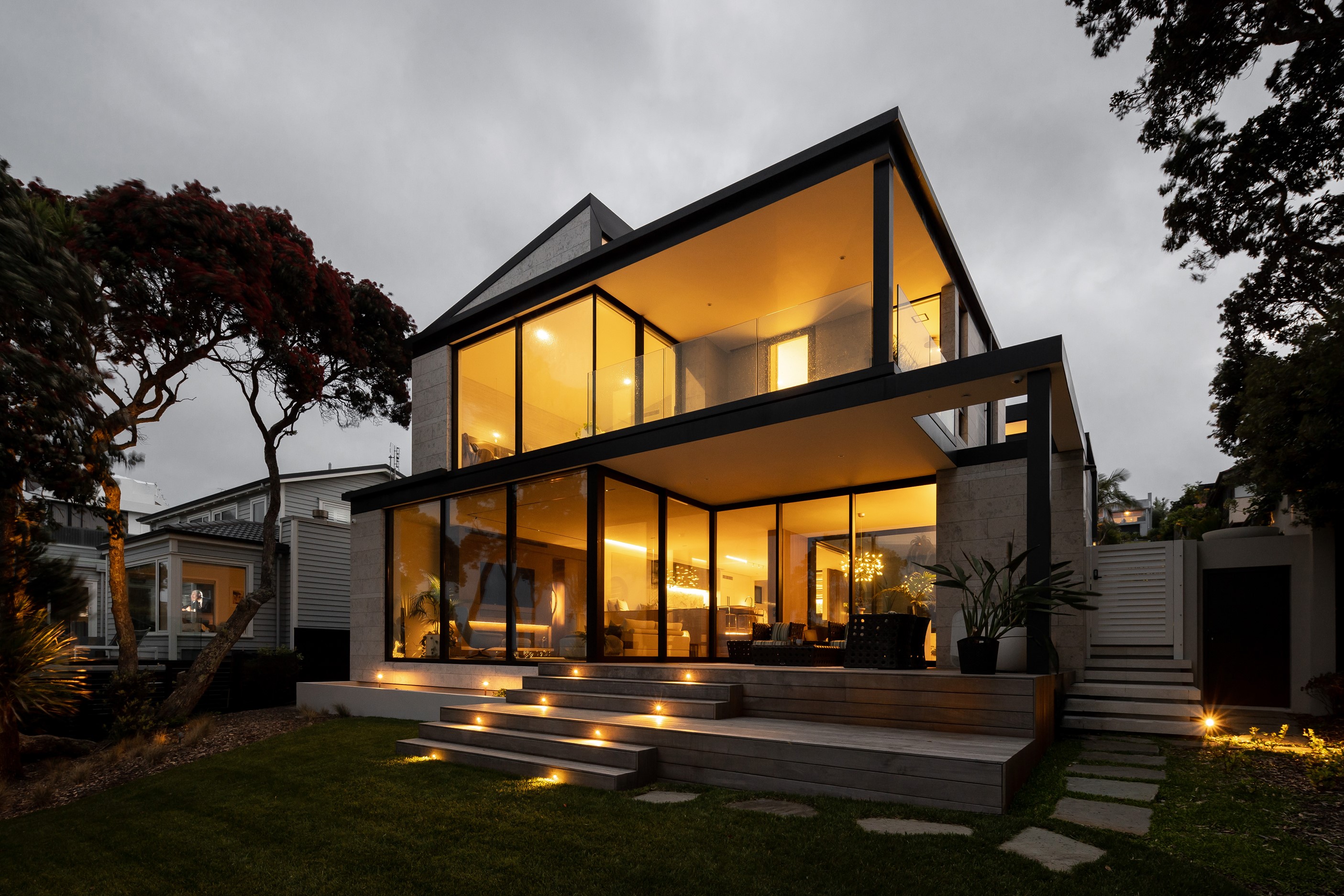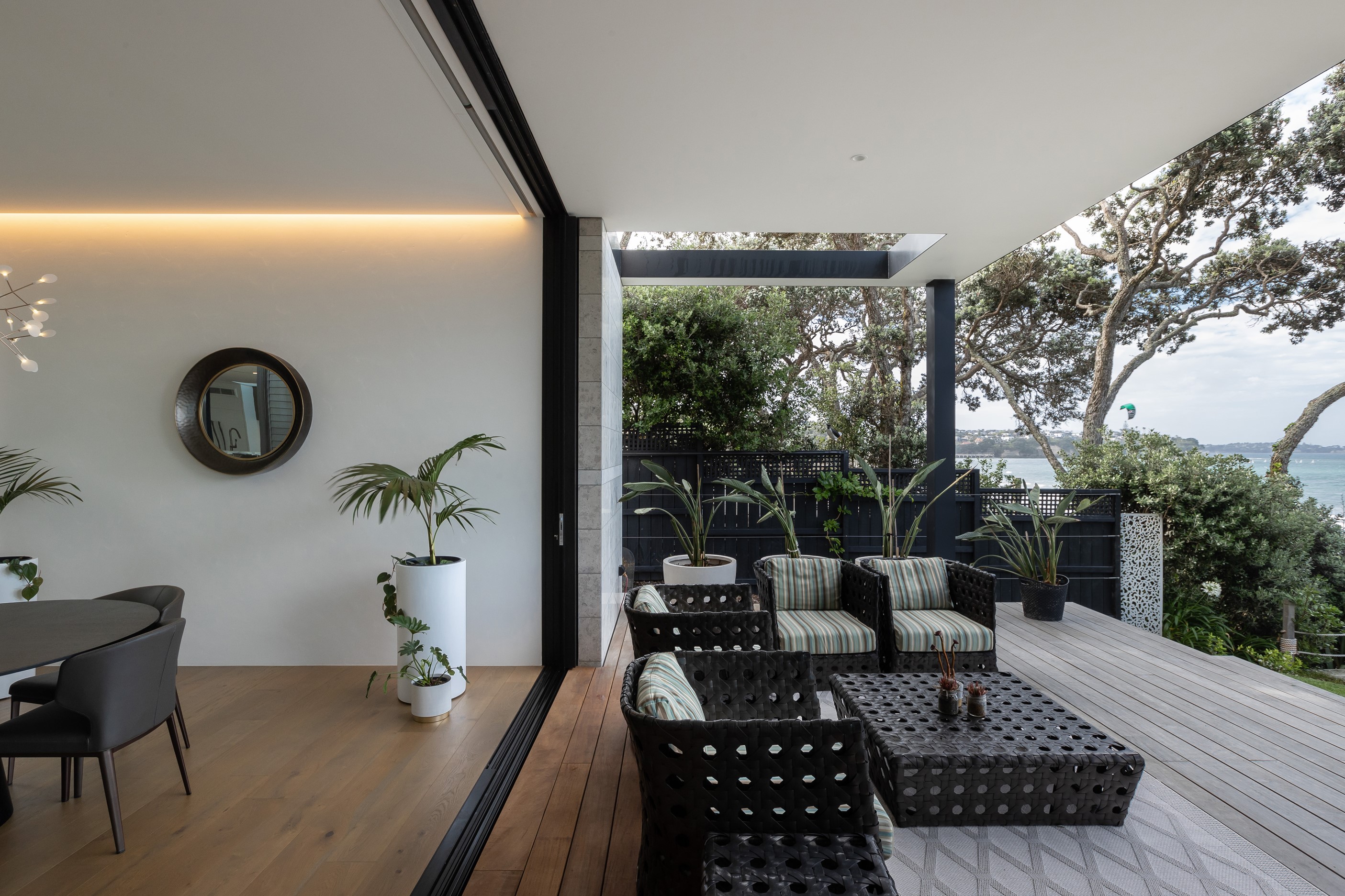 When you own a piece of coastal paradise like this, what you build on it needs to be exceptional. That was certainly the case for the clients who wanted to replace the rundown house on the site with their dream home. Enter the teams from QPC Build Group and award-winning Scarlet Architects who delivered the clients’ vision of a bespoke, luxury cliff-top home. Collaboration was always part of the service – enthusiasm, commitment and assurance, without the stress – even with the tumult of Covid lockdowns and resulting complications. The dream home was completed with minimal delay and maximum expertise. Like many homes of this calibre, it is spacious – four bedrooms, three bathrooms and three living areas in its 369sqm footprint – but that’s not where the magic resides. It’s crafted into the details, thanks to the builders’ care and attention. You’ll find finesse in the way the home drinks in views of the Hauraki Gulf; in the sheltered loggia; in the many timber interior features, including a wall with a secret door; and the sunken living room, which is a study in understated luxury. This two-level, beachfront house clad in Jura Limestone and Vulcan Abodo, and nestled between the pōhutukawa, is a dream home by any measure.