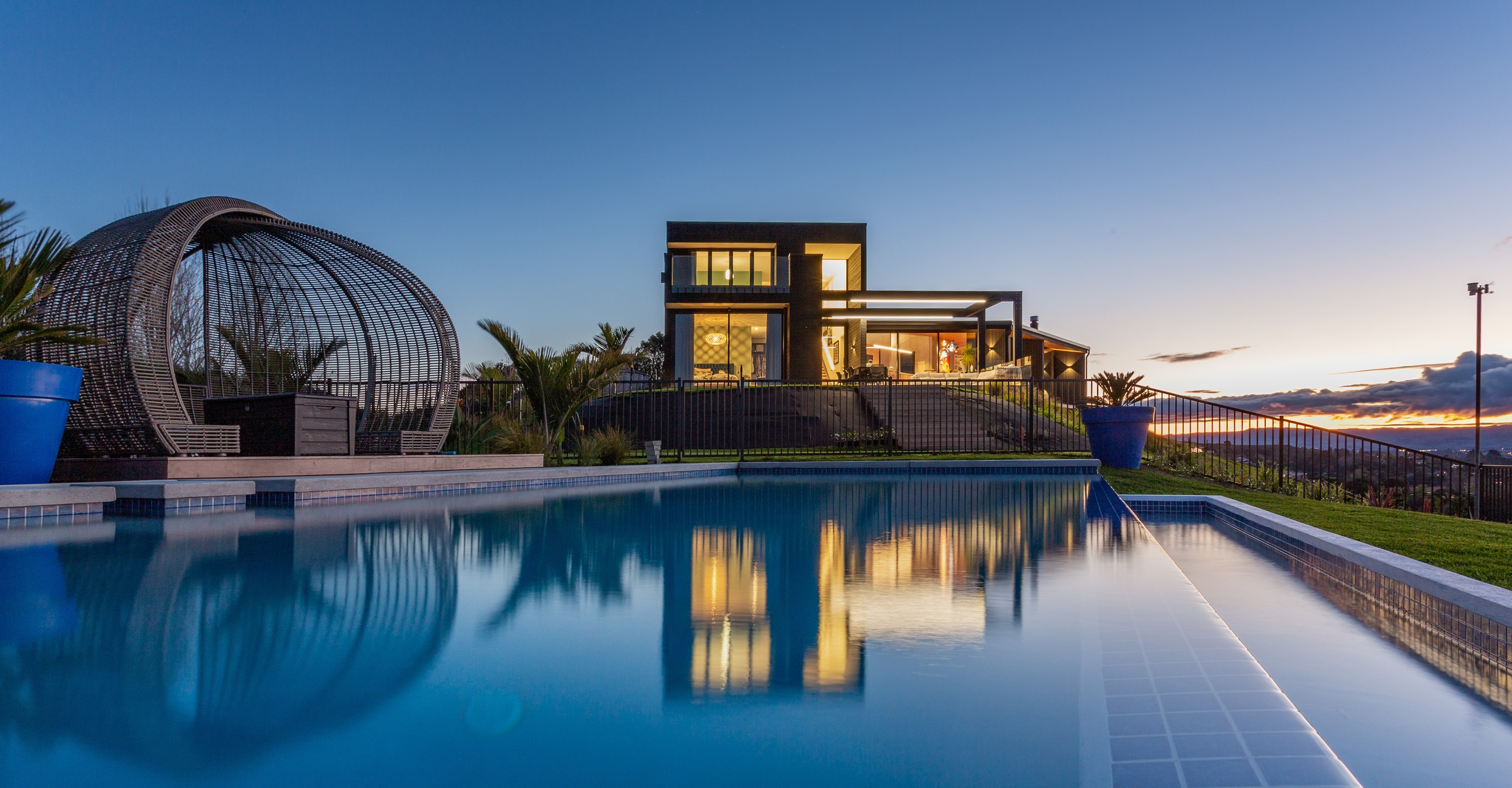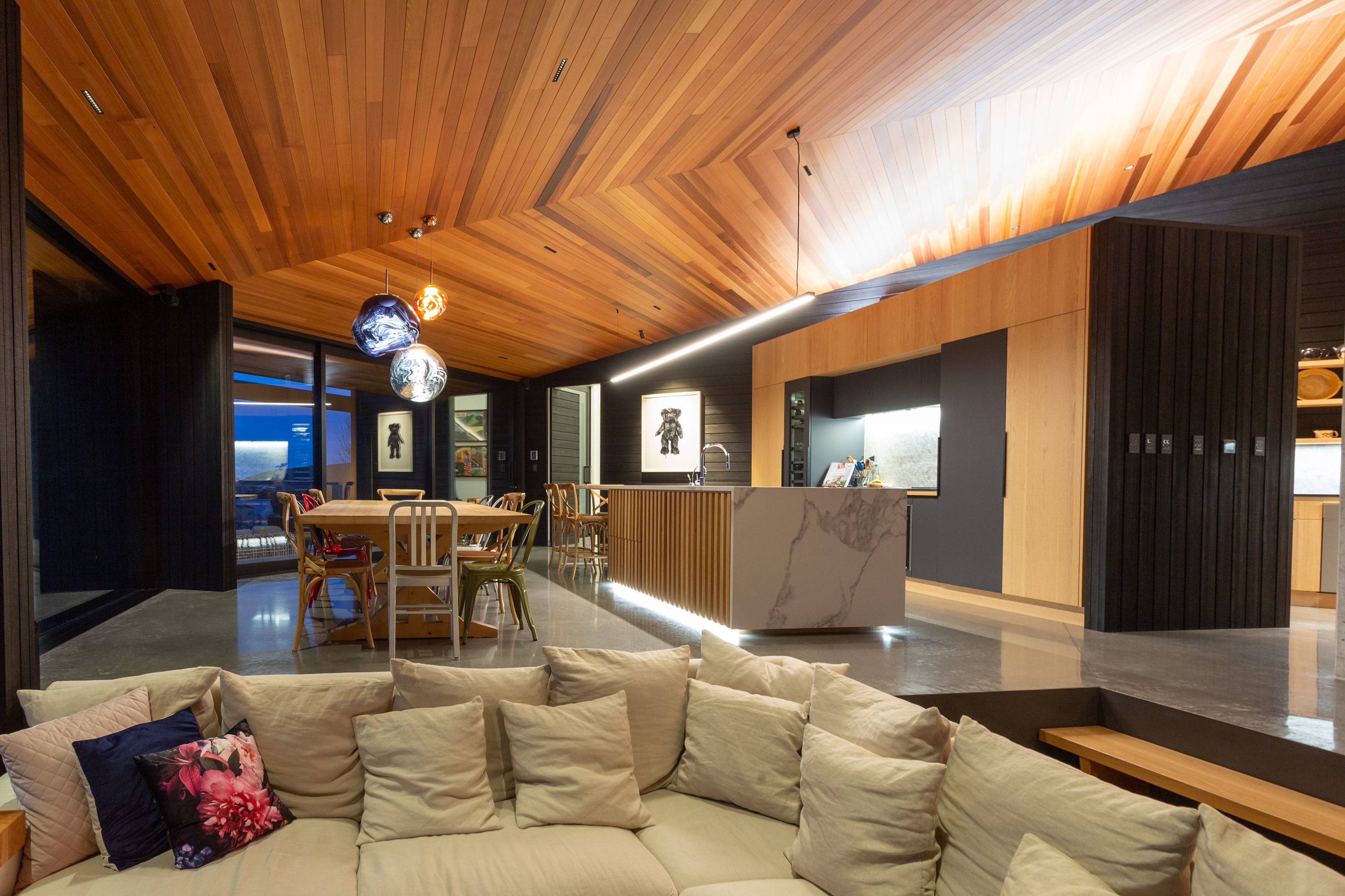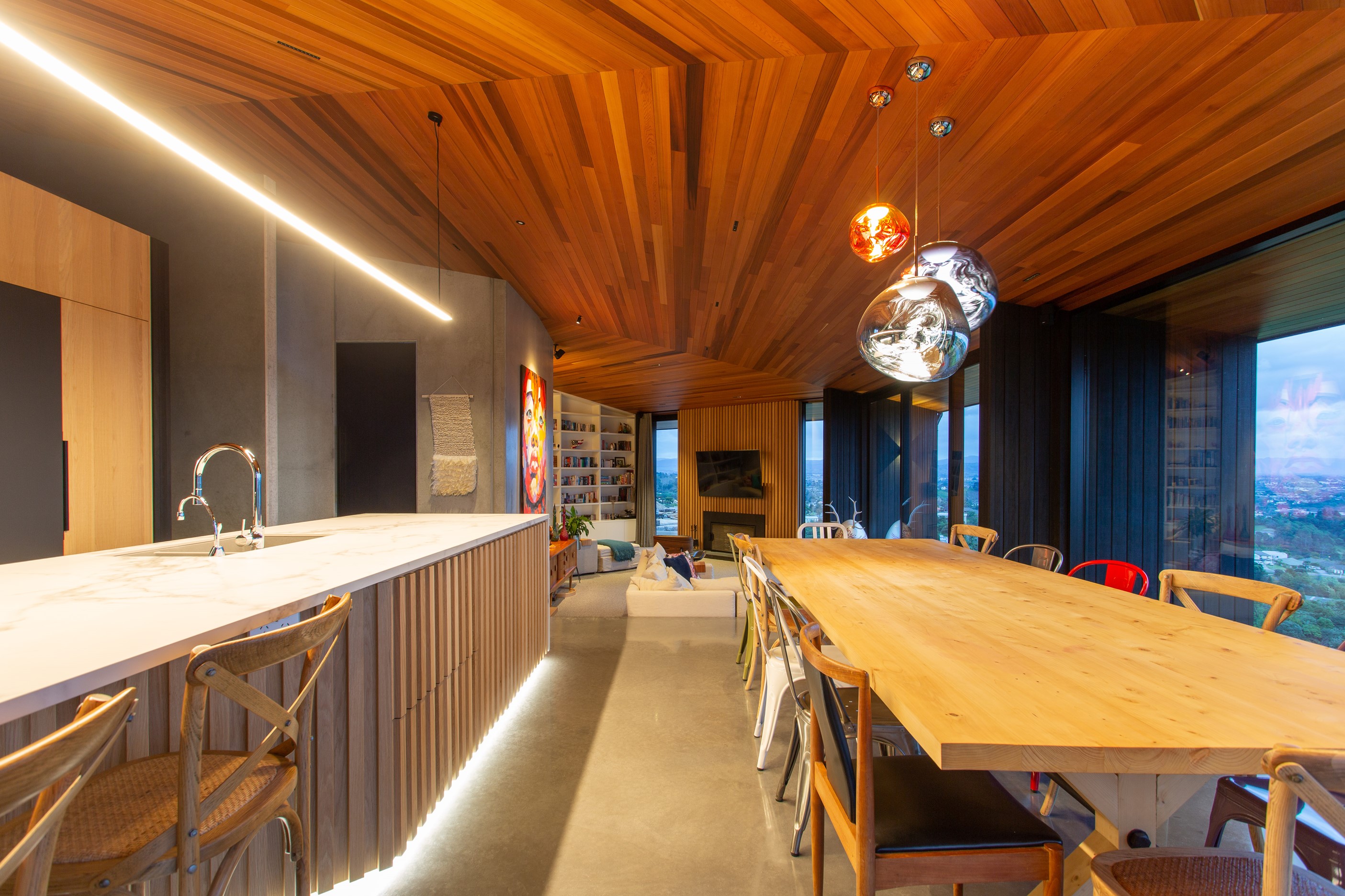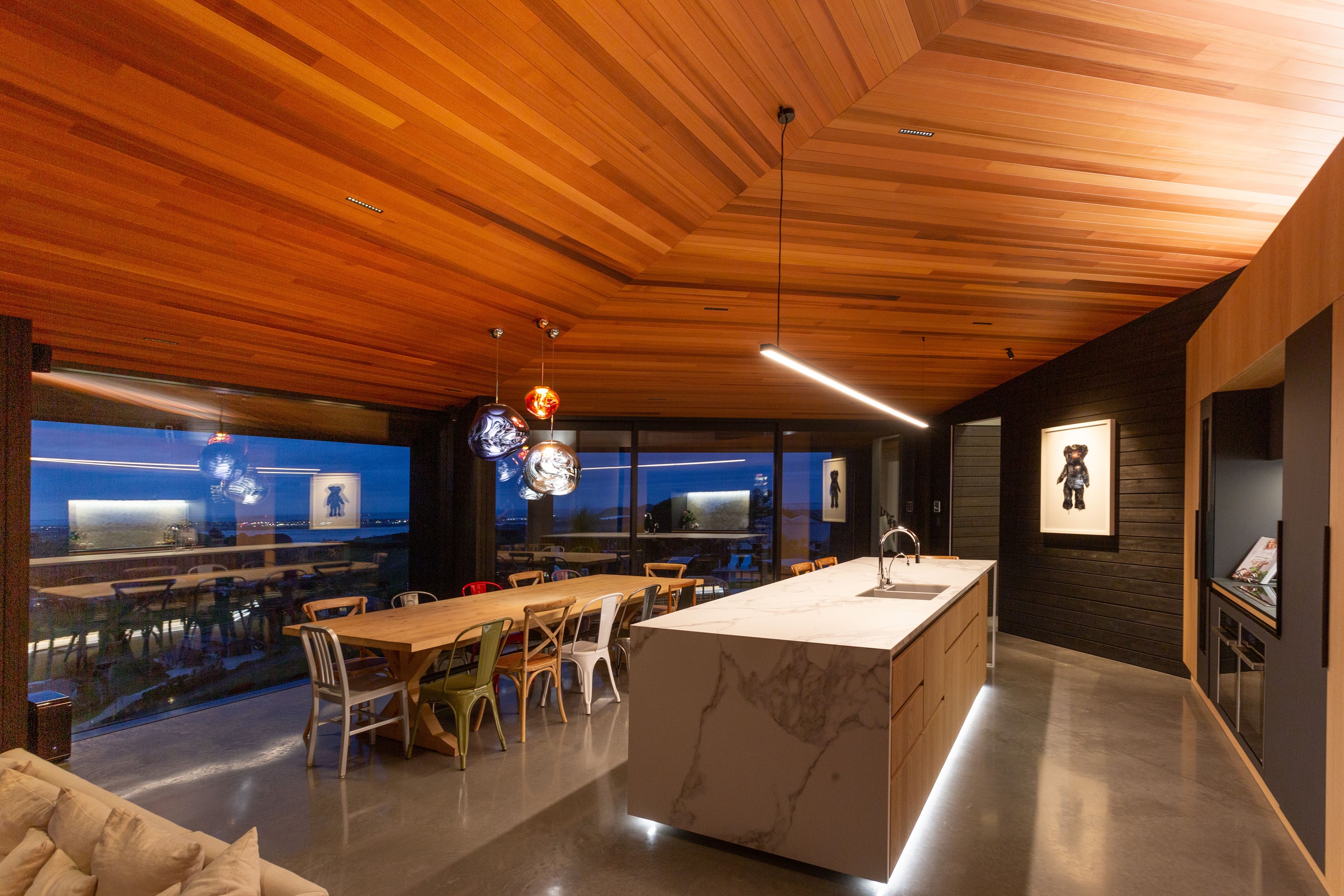 To the north you can see Mount Maunganui, to the east Papamoa. Out west the Kaimai Range looms large and to the south, rolling green hills fill the horizon. The views alone from this site make it special. The house that perches on it, however, is just as impressive. It boasts 475 sqm of scrupulously crafted details, and has a raft of sustainability and energy conservation features.Precast concrete panels anchor the four-bedroom house to its ridge line site, but they also provide architectural definition and texture to the interior. In the open-plan living spaces, angled ceilings are lined in cedar, a task that required weeks of meticulous placement. In the living wing, the sunken lounge makes the most of spectacular views on offer. In contrast, the cinema room is cocooned by the concrete panels, making it a cosy retreat.The connection to the outdoors is also strong with 100 sqm of decking that wraps the living spaces and invites the residents to dine and relax in the fresh air.Sustainability? Passive solar design, a solar hot-water system and thermal and acoustic insulation make the house comfortable all year round. Also, material choices such as Abodo cladding were chosen for their longevity.