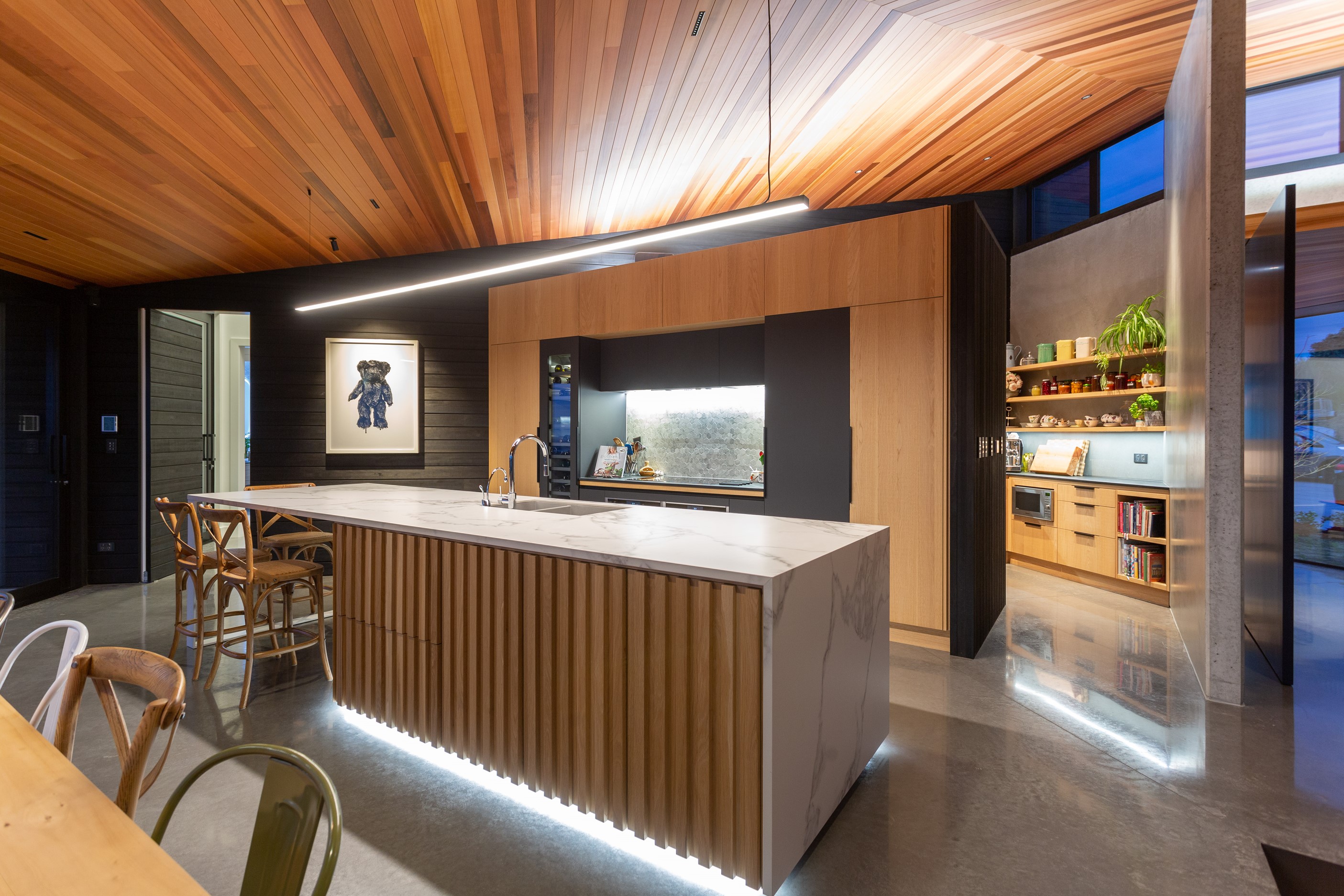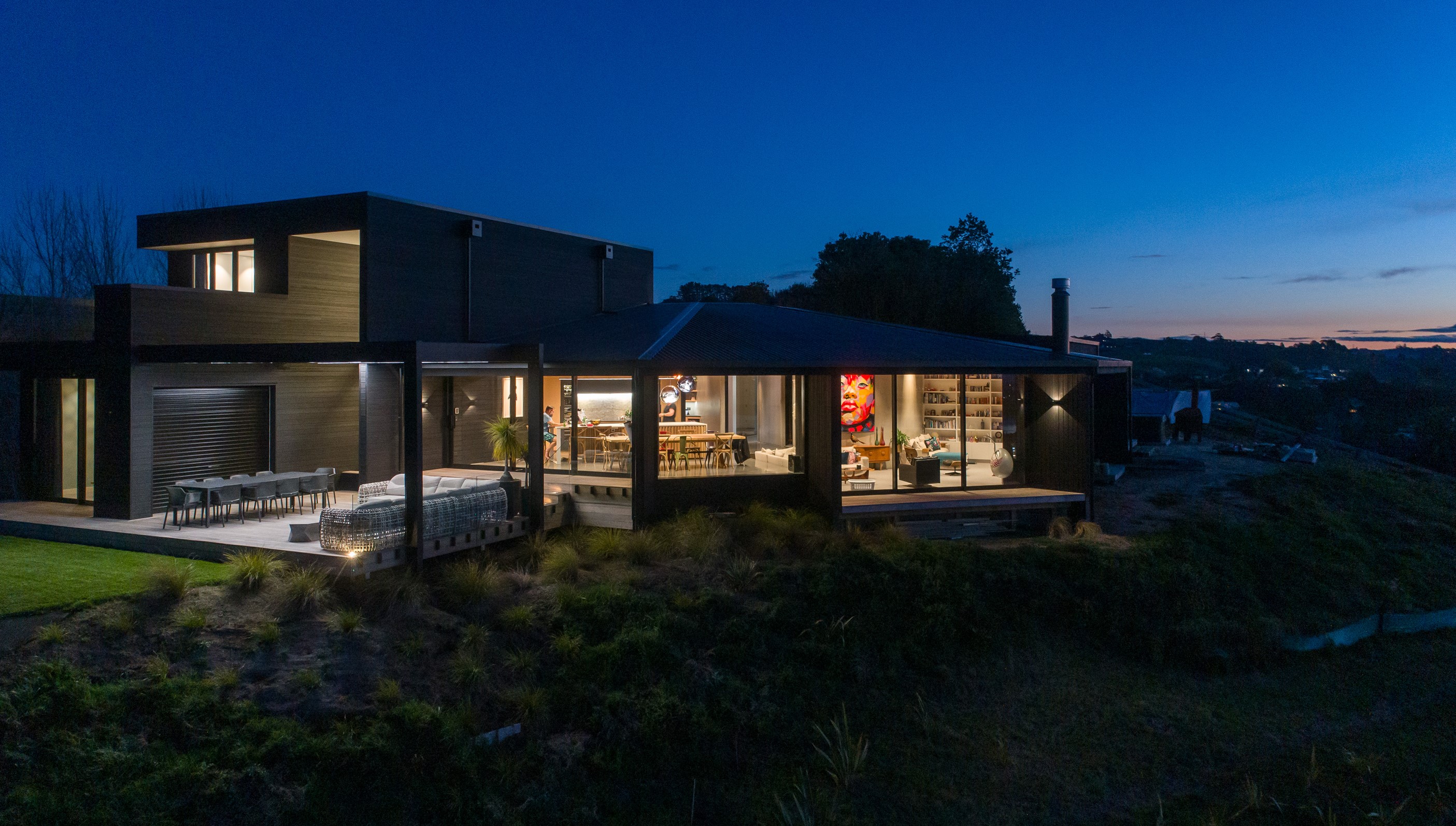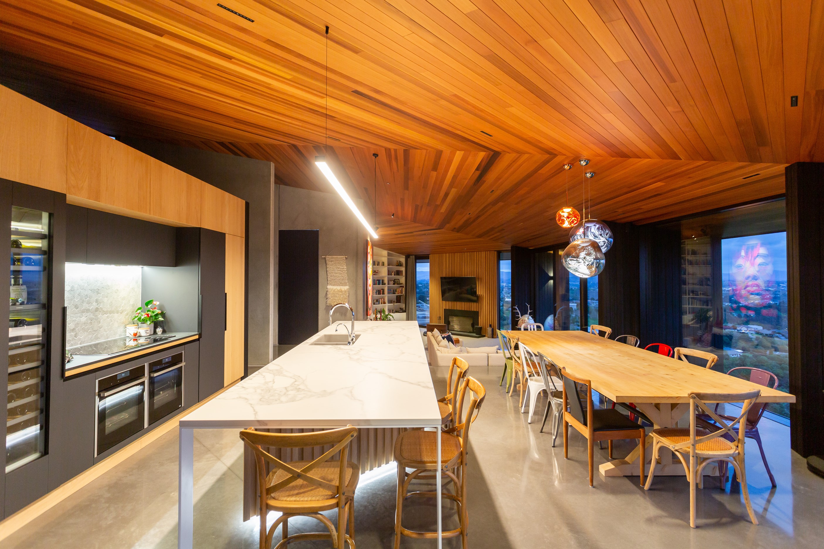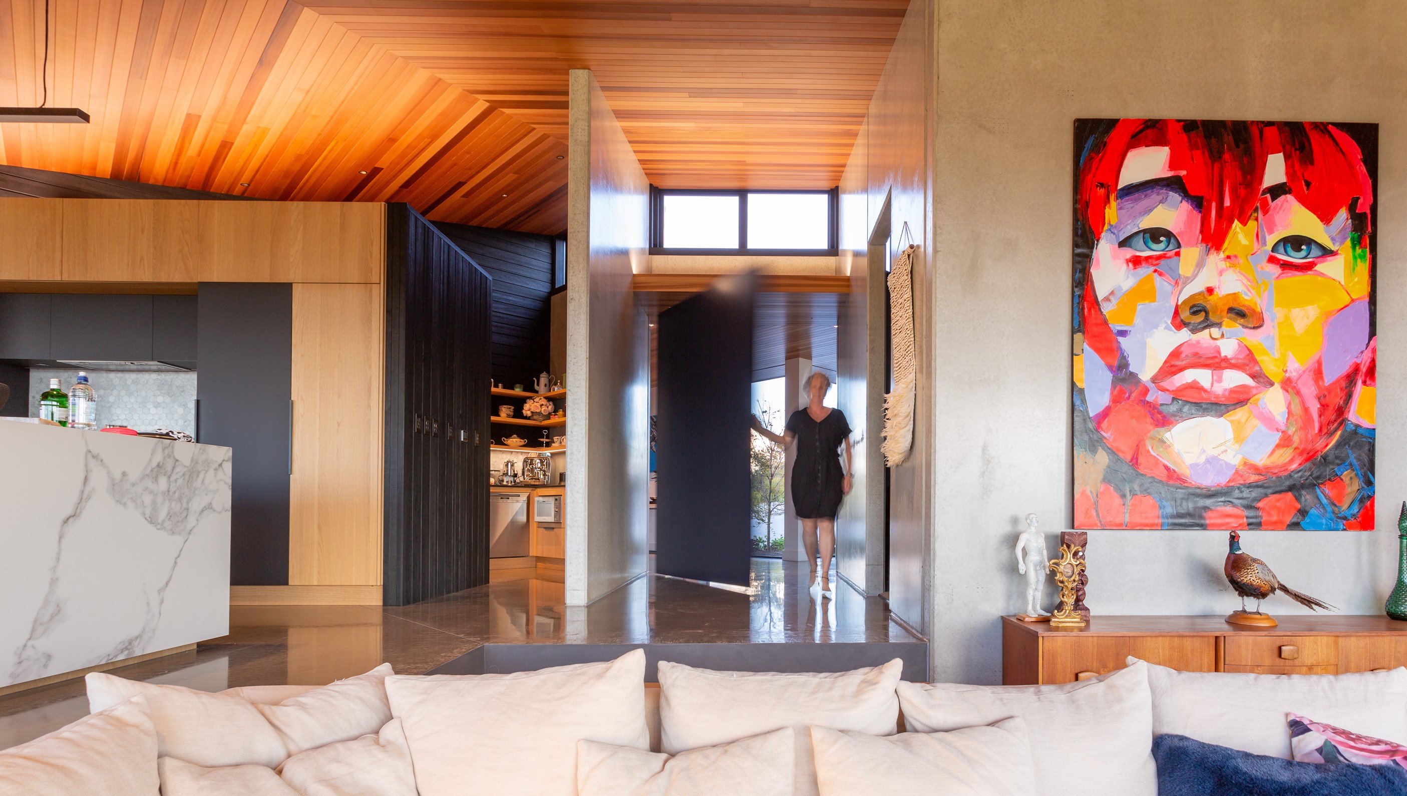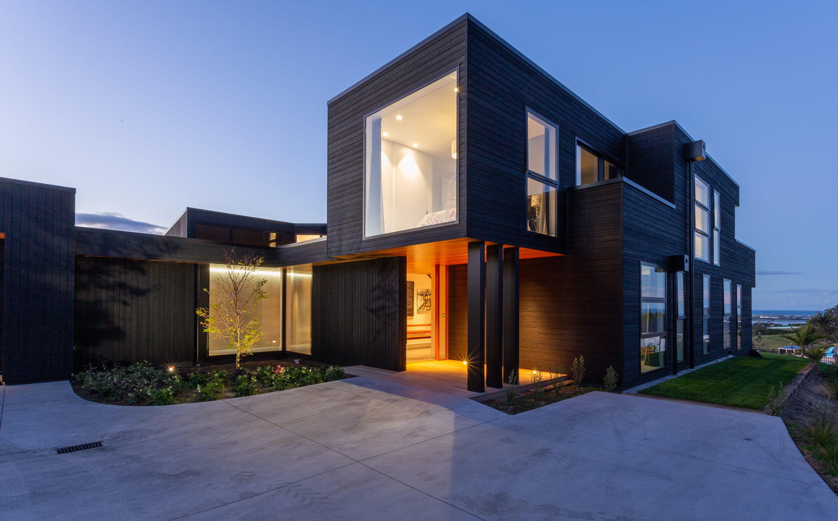 To the north you can see Mount Maunganui, to the east Papamoa. Out west the Kaimai Range looms large and to the south, rolling green hills fill the horizon. The views alone from this site make it special. The house that perches on it, however, is just as impressive. It boasts 475 sqm of scrupulously crafted details, and has a raft of sustainability and energy conservation features.Precast concrete panels anchor the four-bedroom house to its ridge line site, but they also provide architectural definition and texture to the interior. In the open-plan living spaces, angled ceilings are lined in cedar, a task that required weeks of meticulous placement. In the living wing, the sunken lounge makes the most of spectacular views on offer. In contrast, the cinema room is cocooned by the concrete panels, making it a cosy retreat.The connection to the outdoors is also strong with 100 sqm of decking that wraps the living spaces and invites the residents to dine and relax in the fresh air.Sustainability? Passive solar design, a solar hot-water system and thermal and acoustic insulation make the house comfortable all year round. Also, material choices such as Abodo cladding were chosen for their longevity.