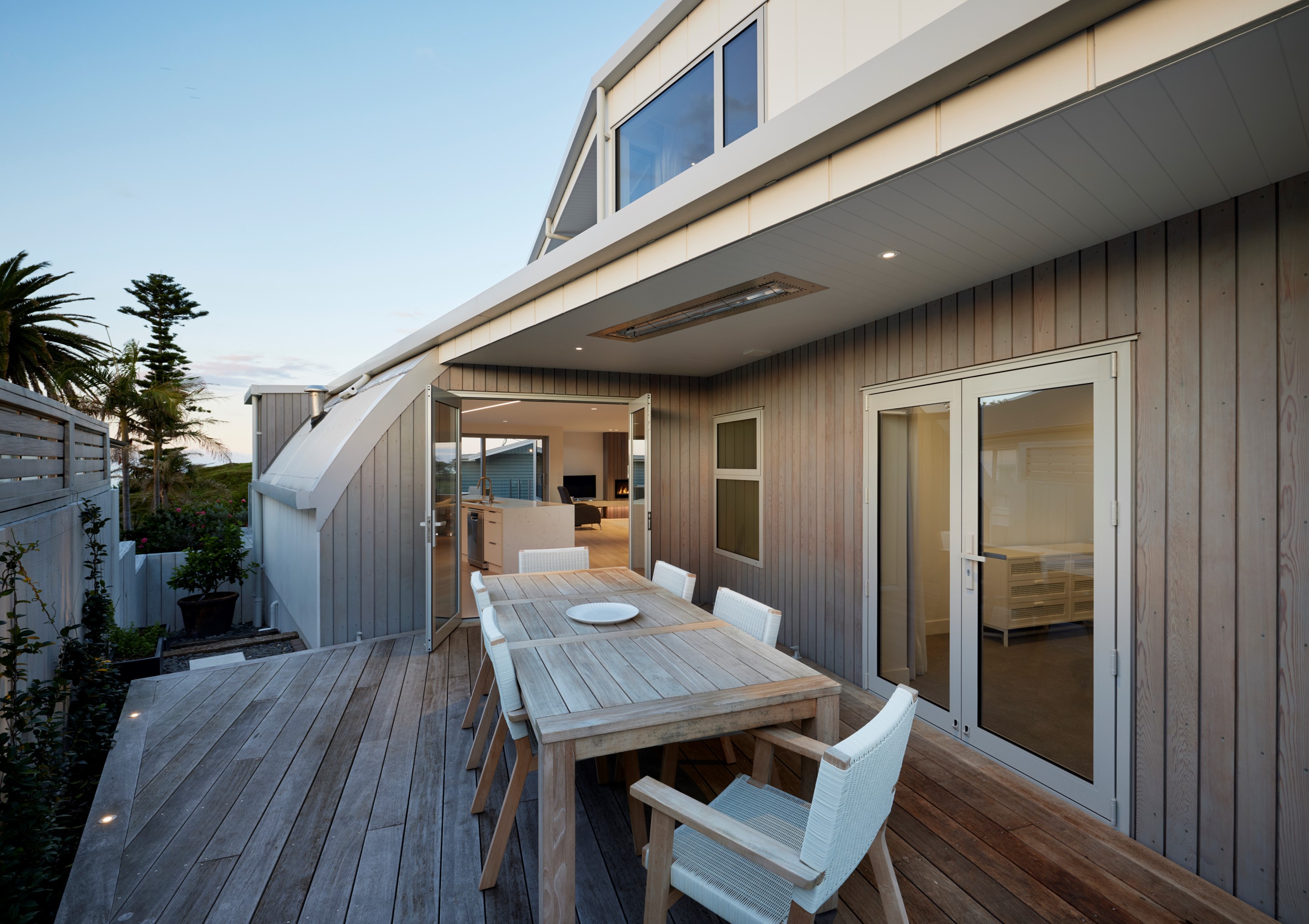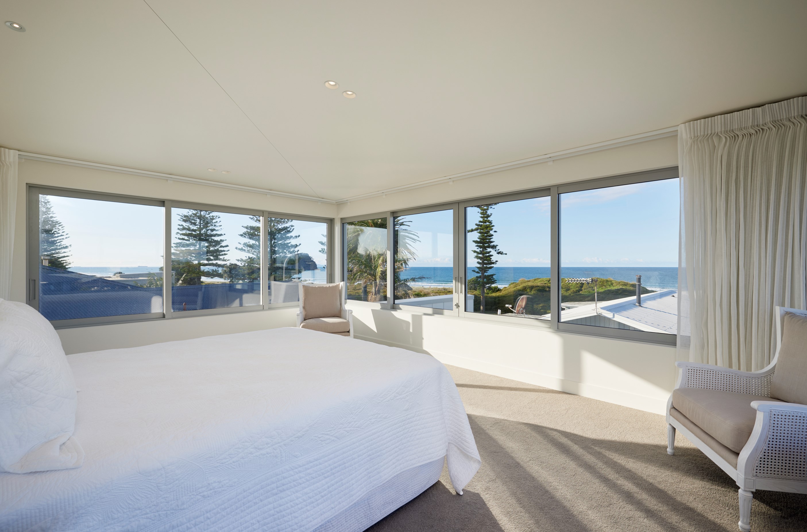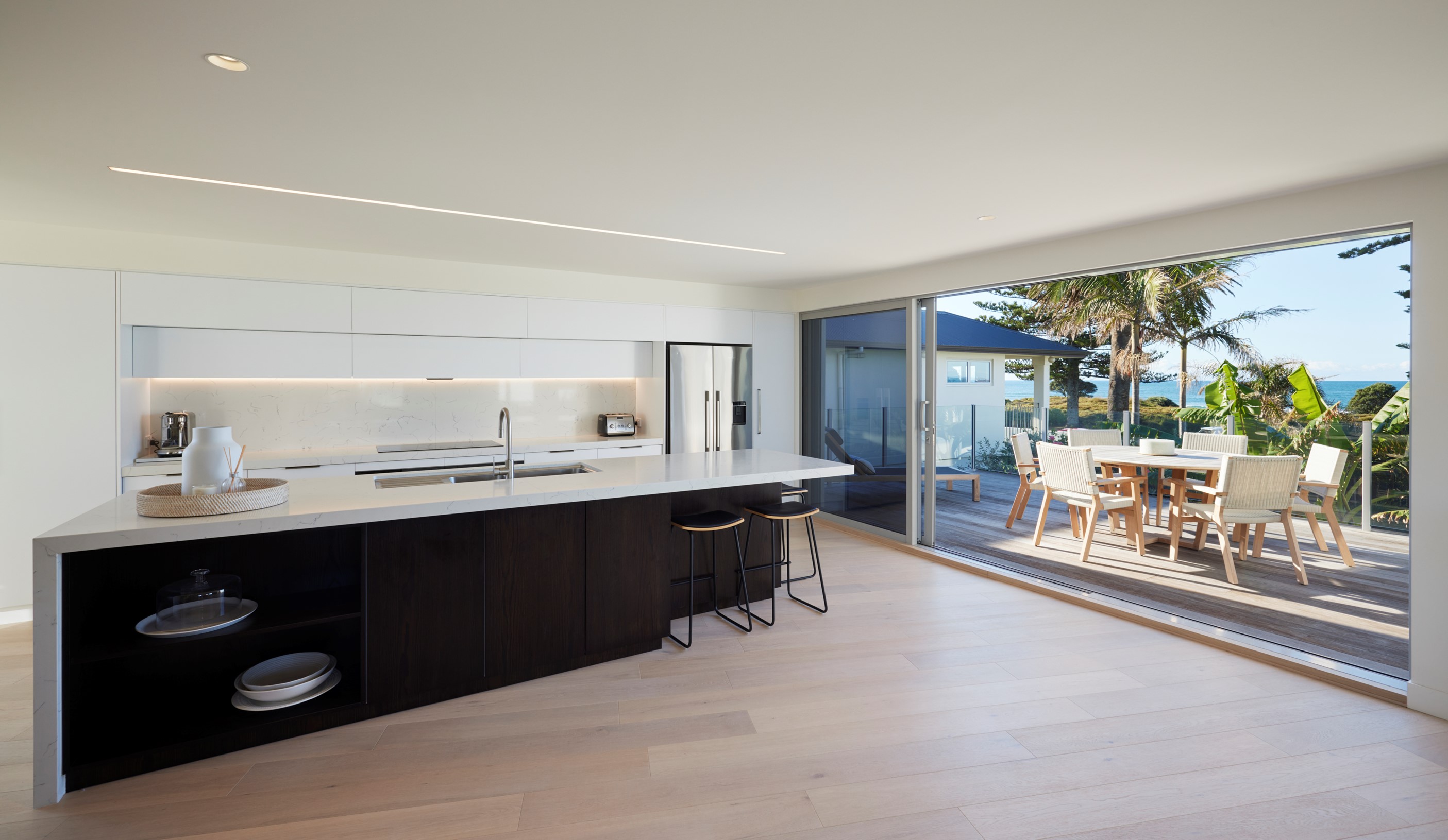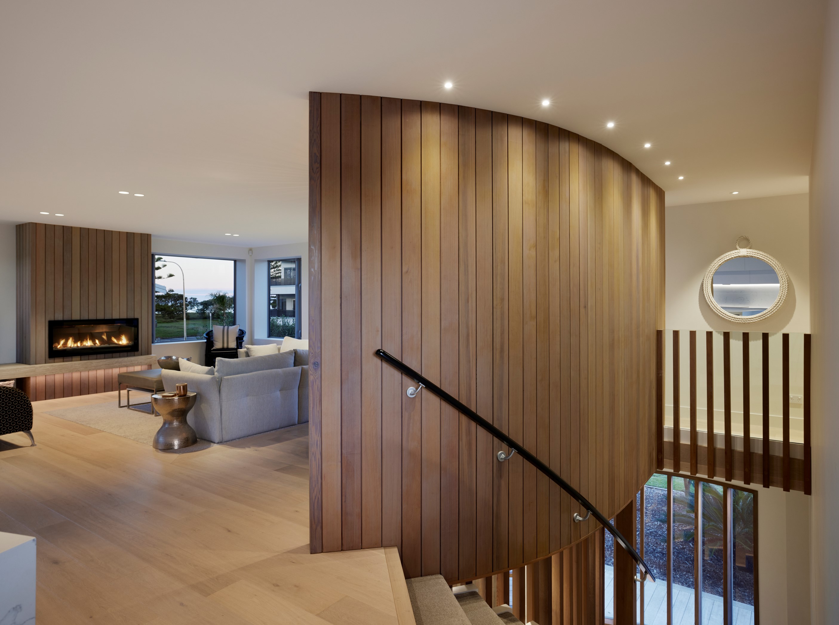 In this substantial renovation, the delight is in the detail. The interior has been given a fresh new beachy feel that perfectly mirrors the three-storey home’s coastal setting. Natural tones, materials and forms can be found throughout, including vertical timber walls, and balusters that curve around the stairwell. These meticulously crafted features are beautiful in their own right, but never distract from ocean views that can be enjoyed from upper floors. It’s clear the interior has undergone a major refurbishment, but what’s not obvious is the expert structural work hidden from view. Existing unispan mid-floor and framing had to be replaced, due to new structural regulations. A new steel PFC ring beam was installed to the perimeter and bolted to existing block walls. This enabled a new timber mid-floor and internal framing to be constructed. Once all the work was finished, the owners were able to enjoy the improvements and upgrades in their five-bedroom seaside retreat, including a sleek new kitchen with waterfall edge at one end of the island and breakfast bar at the other. From there, they can open expansive glass sliders and step out onto decks, one of which enjoys views of the Pacific.