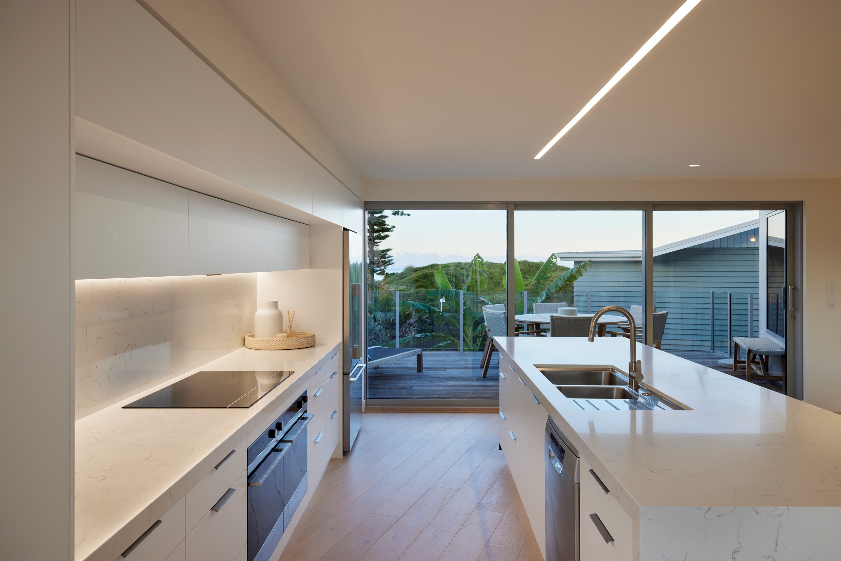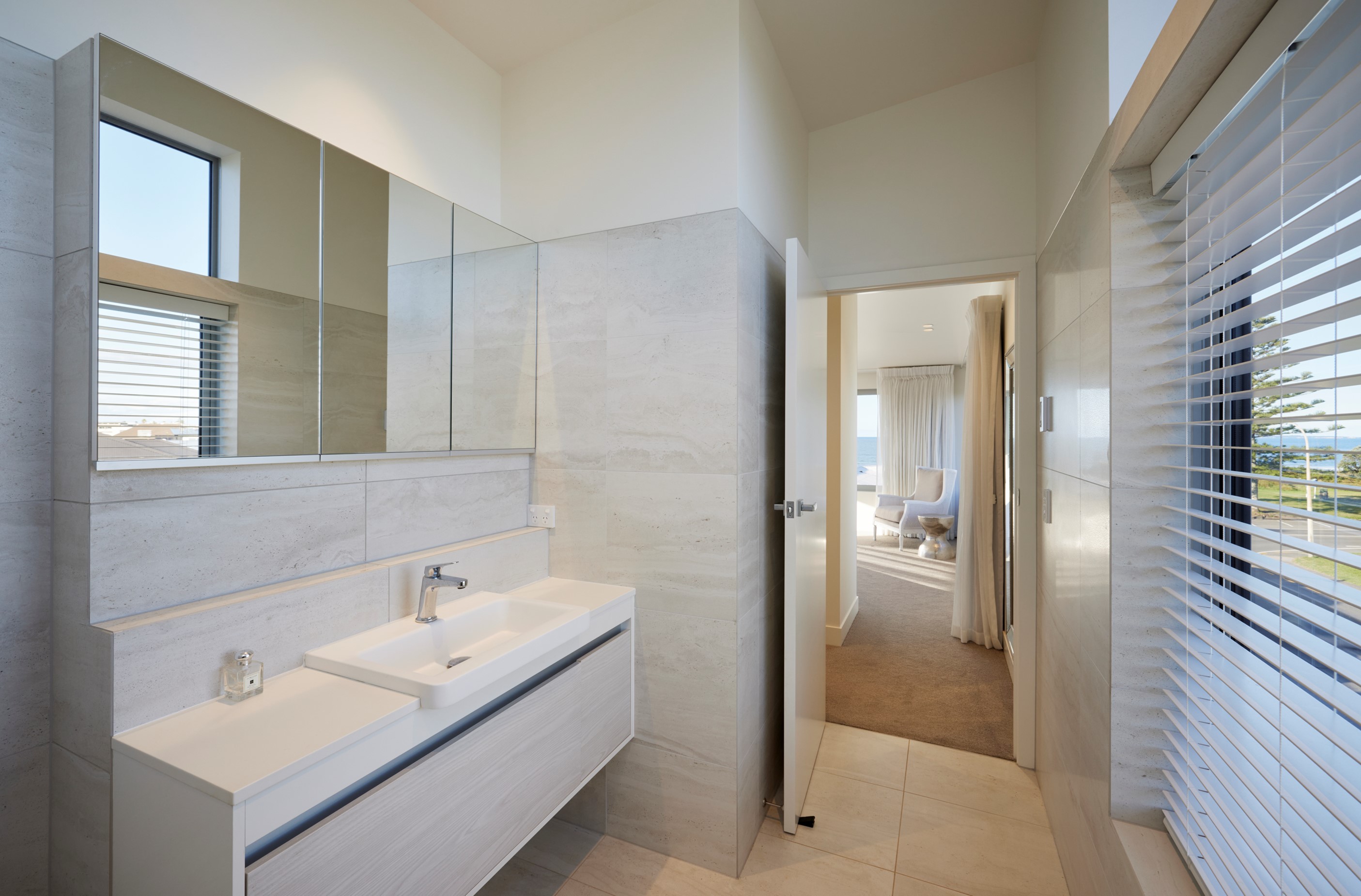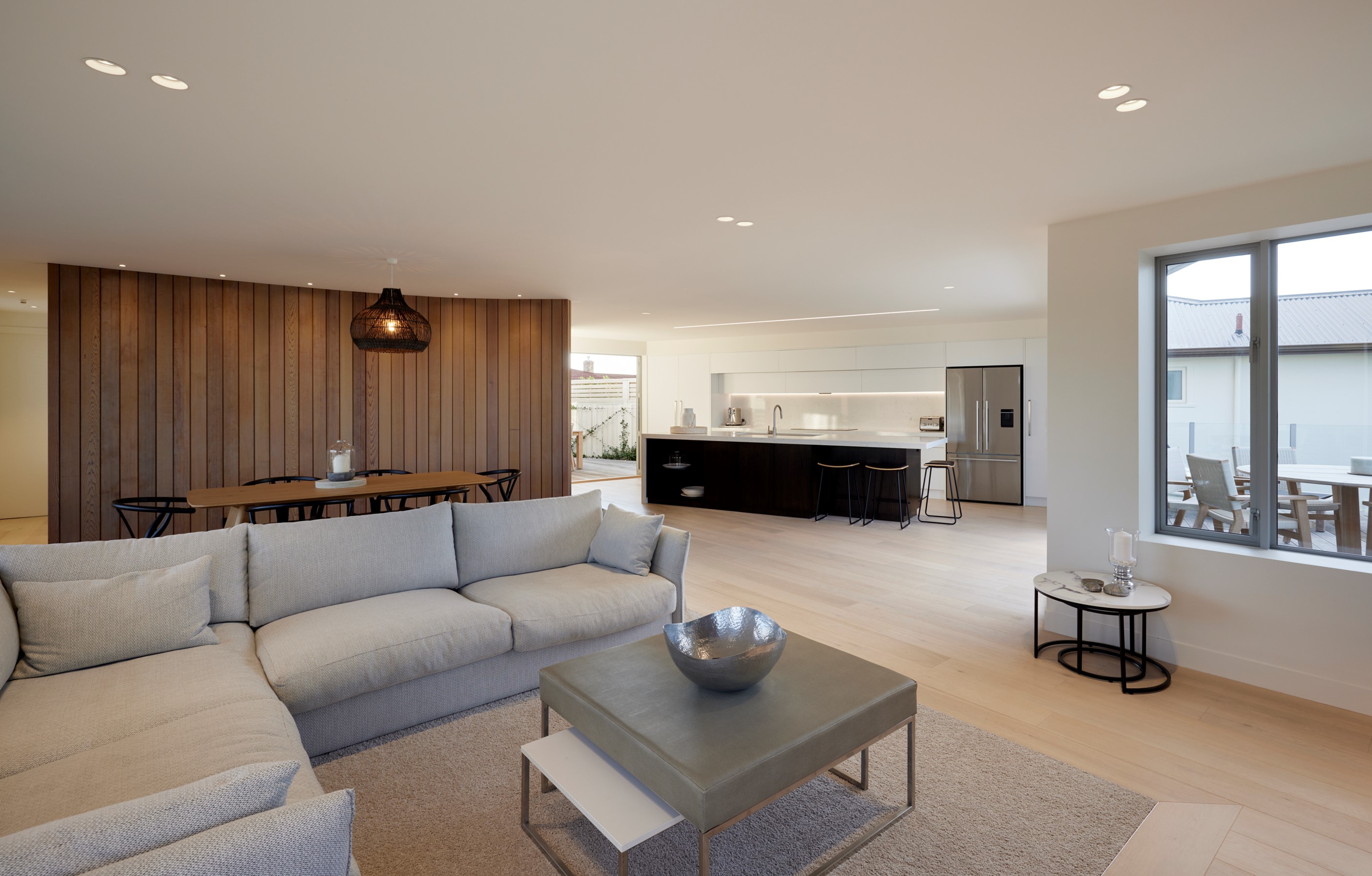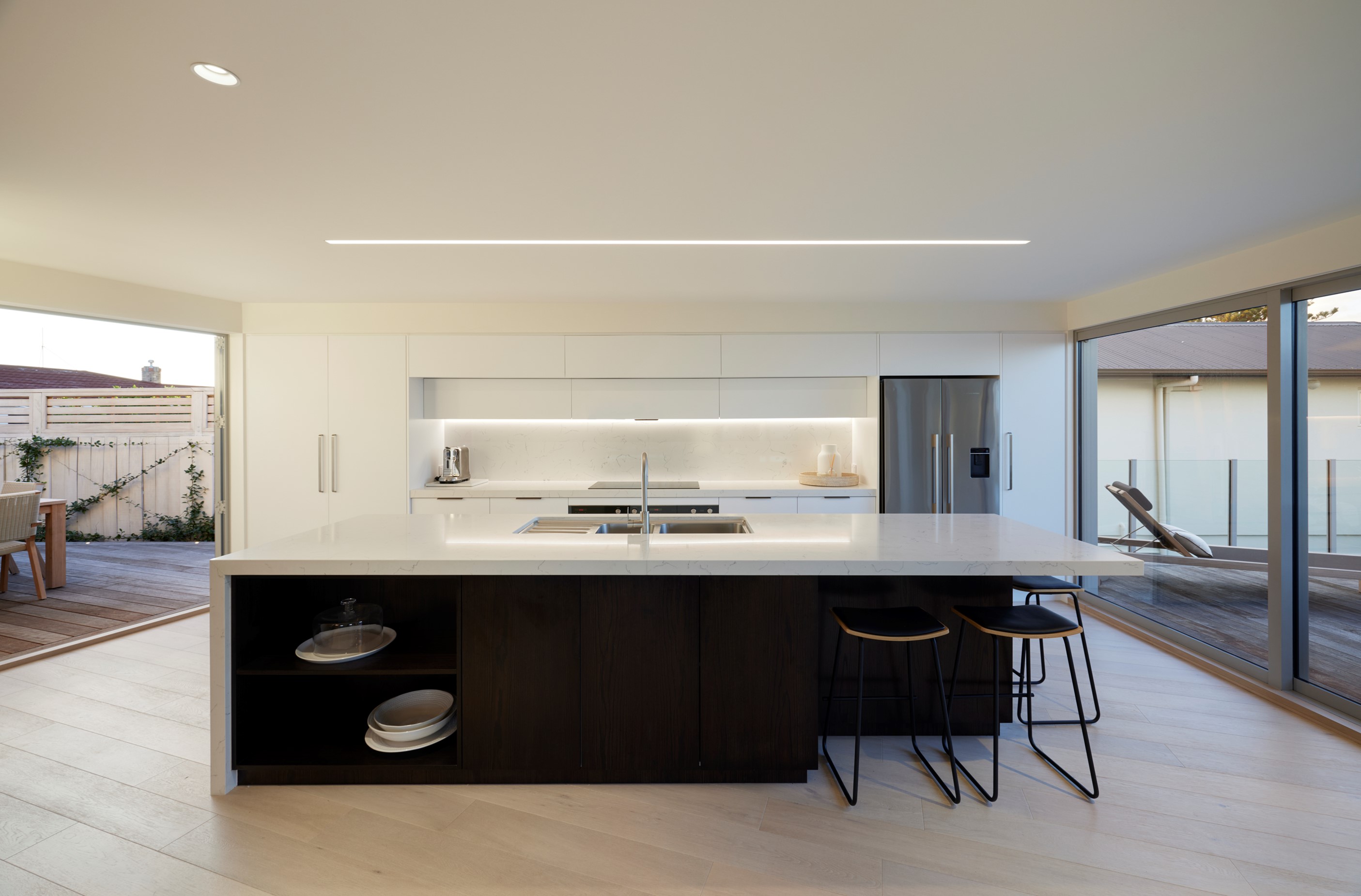 In this substantial renovation, the delight is in the detail. The interior has been given a fresh new beachy feel that perfectly mirrors the three-storey home’s coastal setting. Natural tones, materials and forms can be found throughout, including vertical timber walls, and balusters that curve around the stairwell. These meticulously crafted features are beautiful in their own right, but never distract from ocean views that can be enjoyed from upper floors. It’s clear the interior has undergone a major refurbishment, but what’s not obvious is the expert structural work hidden from view. Existing unispan mid-floor and framing had to be replaced, due to new structural regulations. A new steel PFC ring beam was installed to the perimeter and bolted to existing block walls. This enabled a new timber mid-floor and internal framing to be constructed. Once all the work was finished, the owners were able to enjoy the improvements and upgrades in their five-bedroom seaside retreat, including a sleek new kitchen with waterfall edge at one end of the island and breakfast bar at the other. From there, they can open expansive glass sliders and step out onto decks, one of which enjoys views of the Pacific.