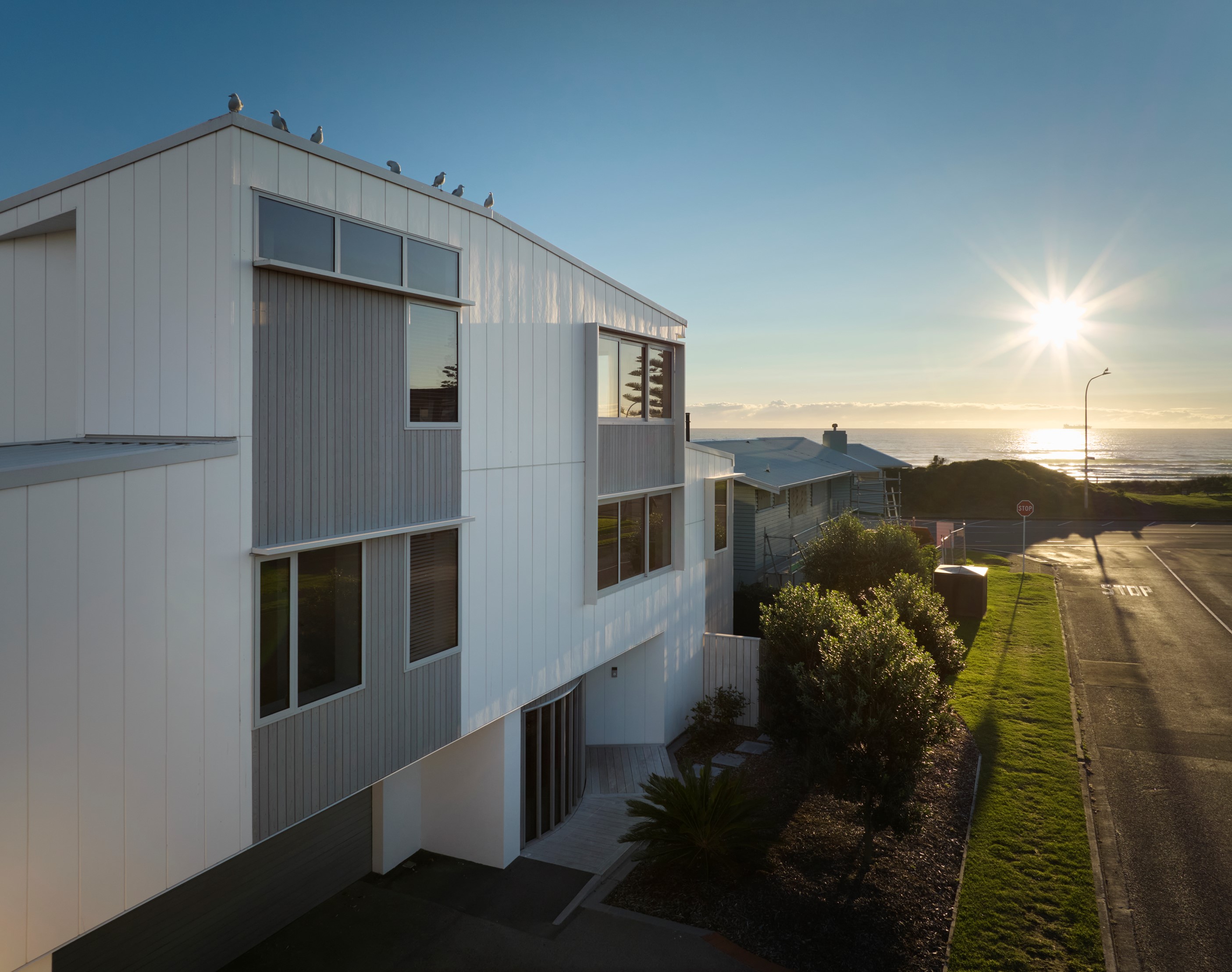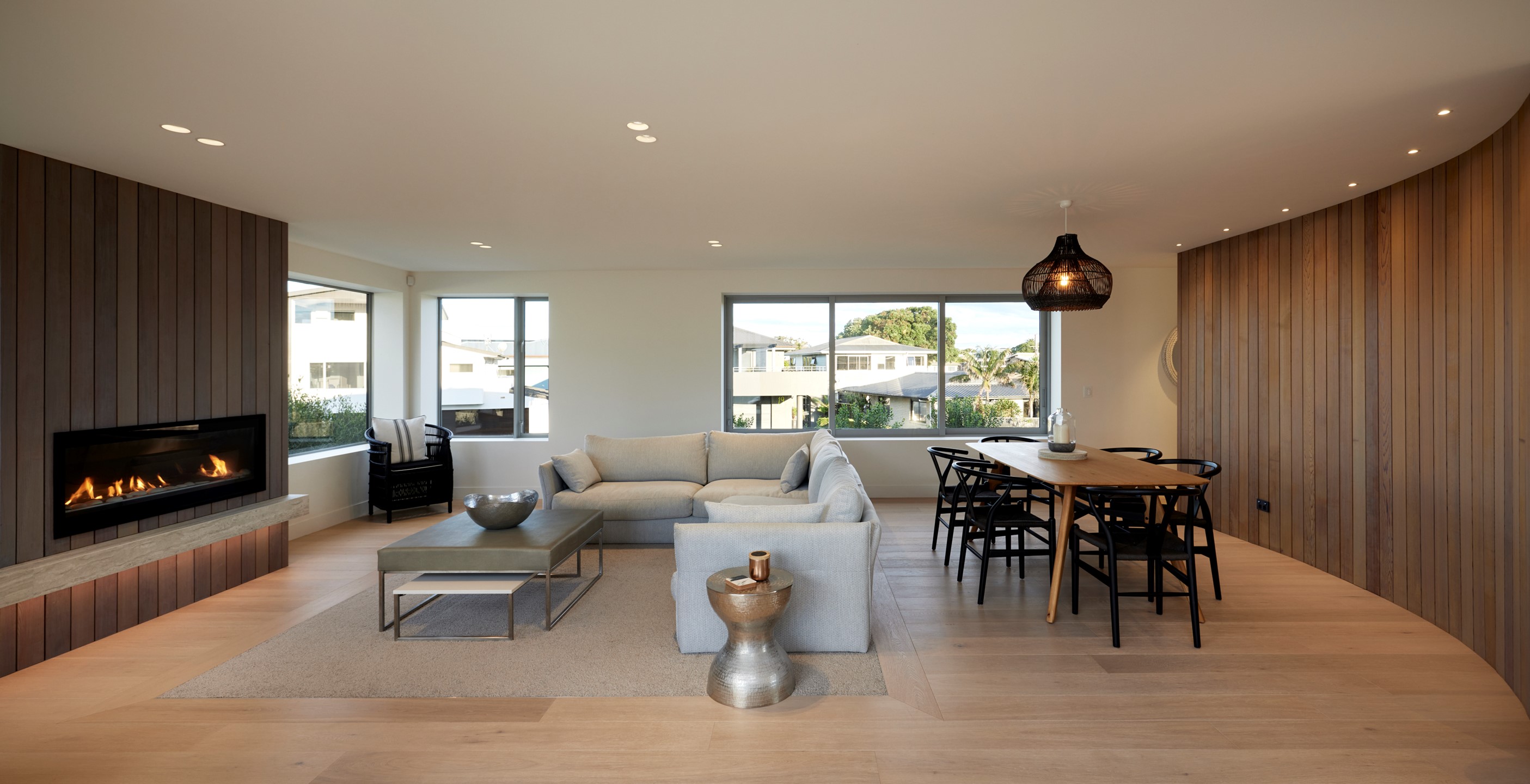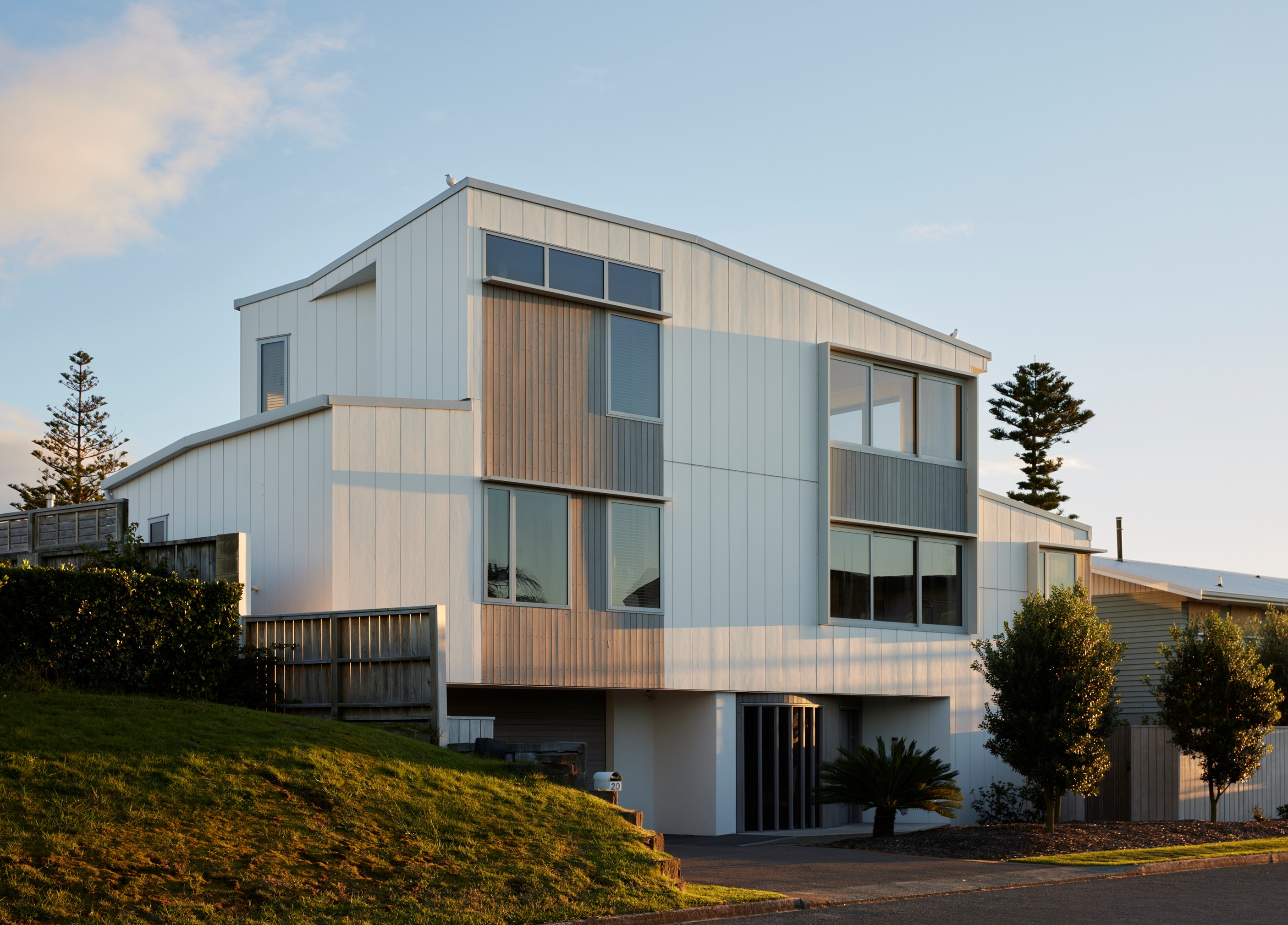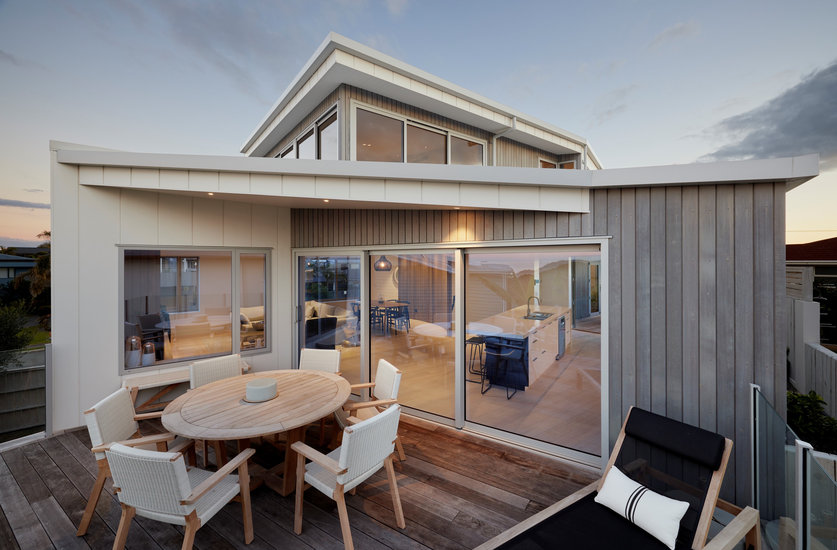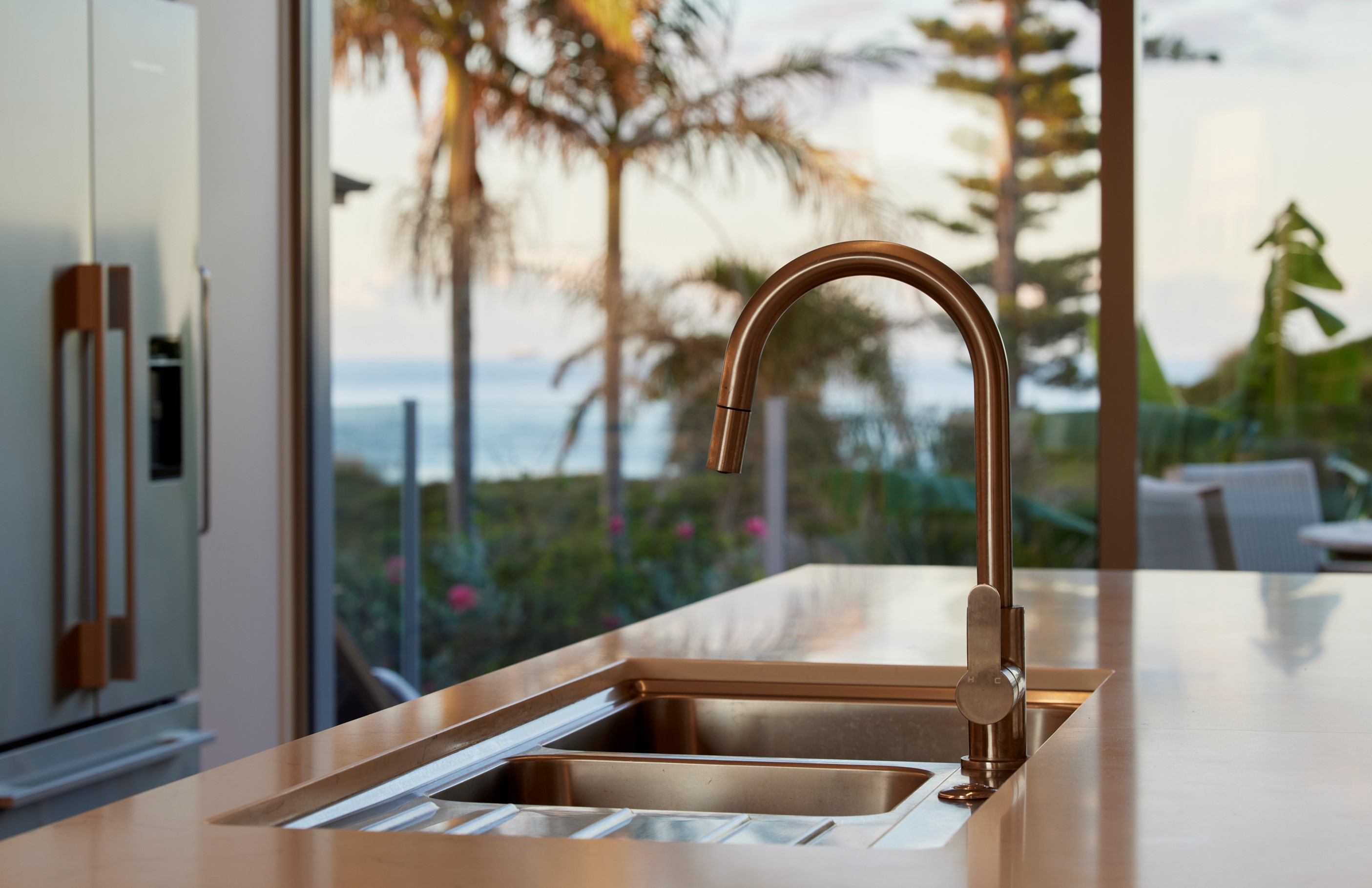 In this substantial renovation, the delight is in the detail. The interior has been given a fresh new beachy feel that perfectly mirrors the three-storey home’s coastal setting. Natural tones, materials and forms can be found throughout, including vertical timber walls, and balusters that curve around the stairwell. These meticulously crafted features are beautiful in their own right, but never distract from ocean views that can be enjoyed from upper floors. It’s clear the interior has undergone a major refurbishment, but what’s not obvious is the expert structural work hidden from view. Existing unispan mid-floor and framing had to be replaced, due to new structural regulations. A new steel PFC ring beam was installed to the perimeter and bolted to existing block walls. This enabled a new timber mid-floor and internal framing to be constructed. Once all the work was finished, the owners were able to enjoy the improvements and upgrades in their five-bedroom seaside retreat, including a sleek new kitchen with waterfall edge at one end of the island and breakfast bar at the other. From there, they can open expansive glass sliders and step out onto decks, one of which enjoys views of the Pacific.