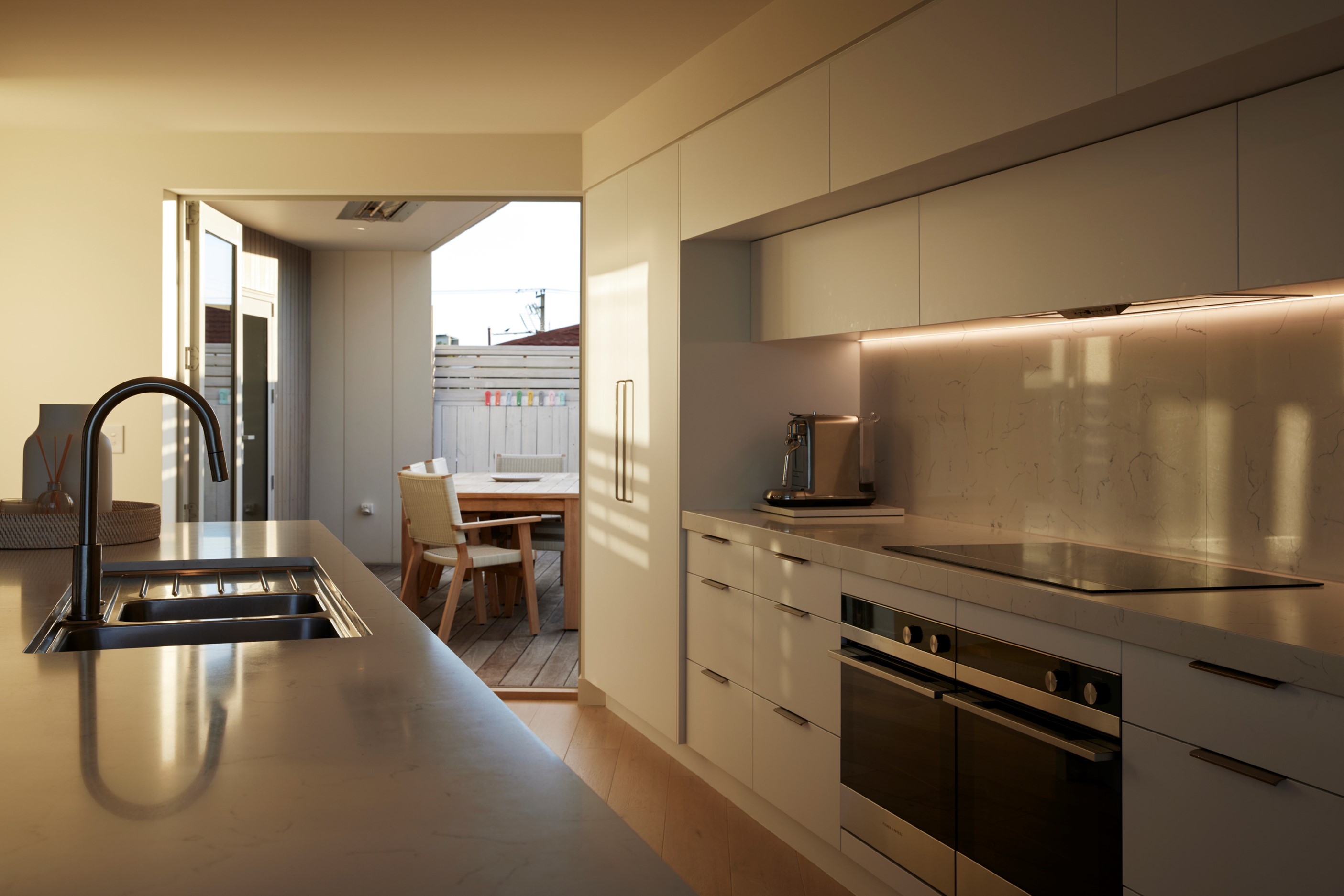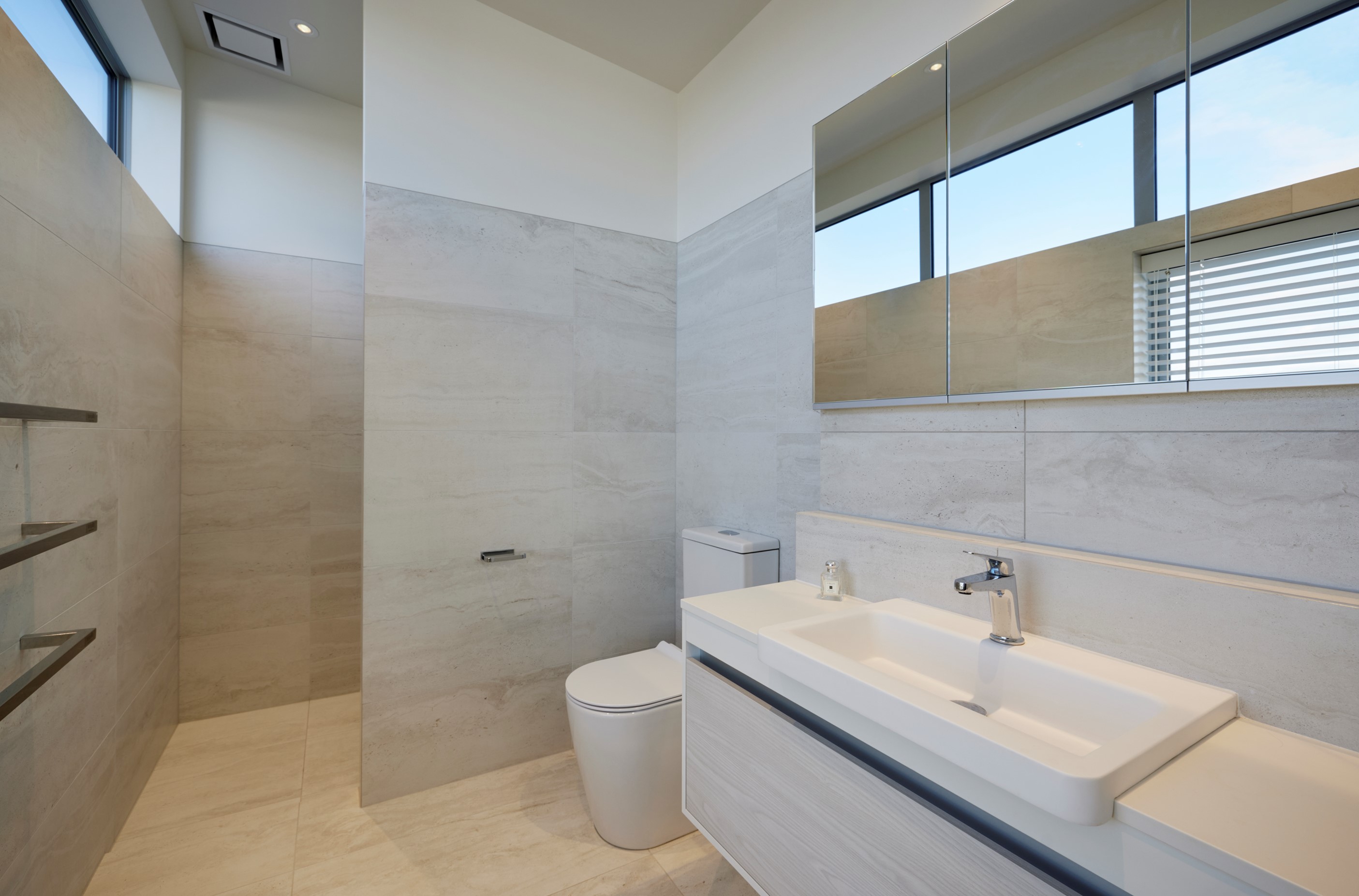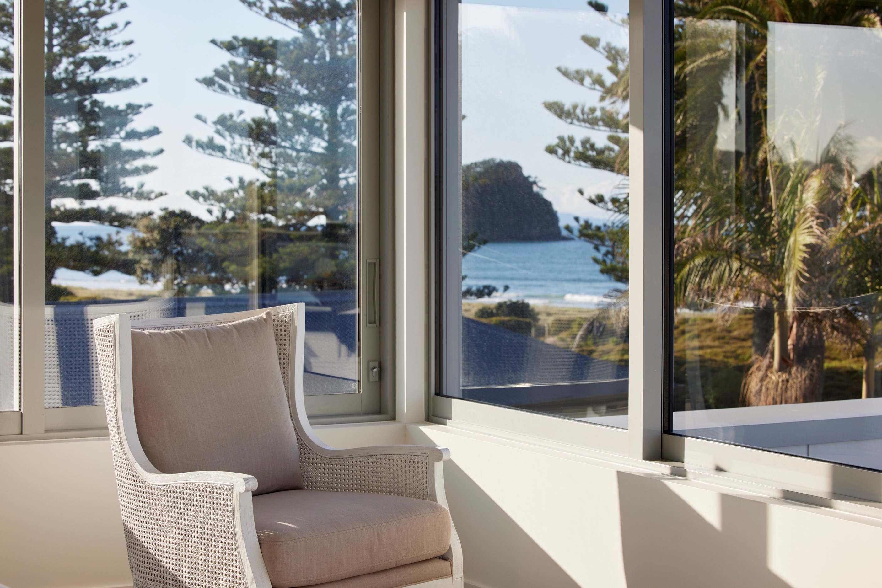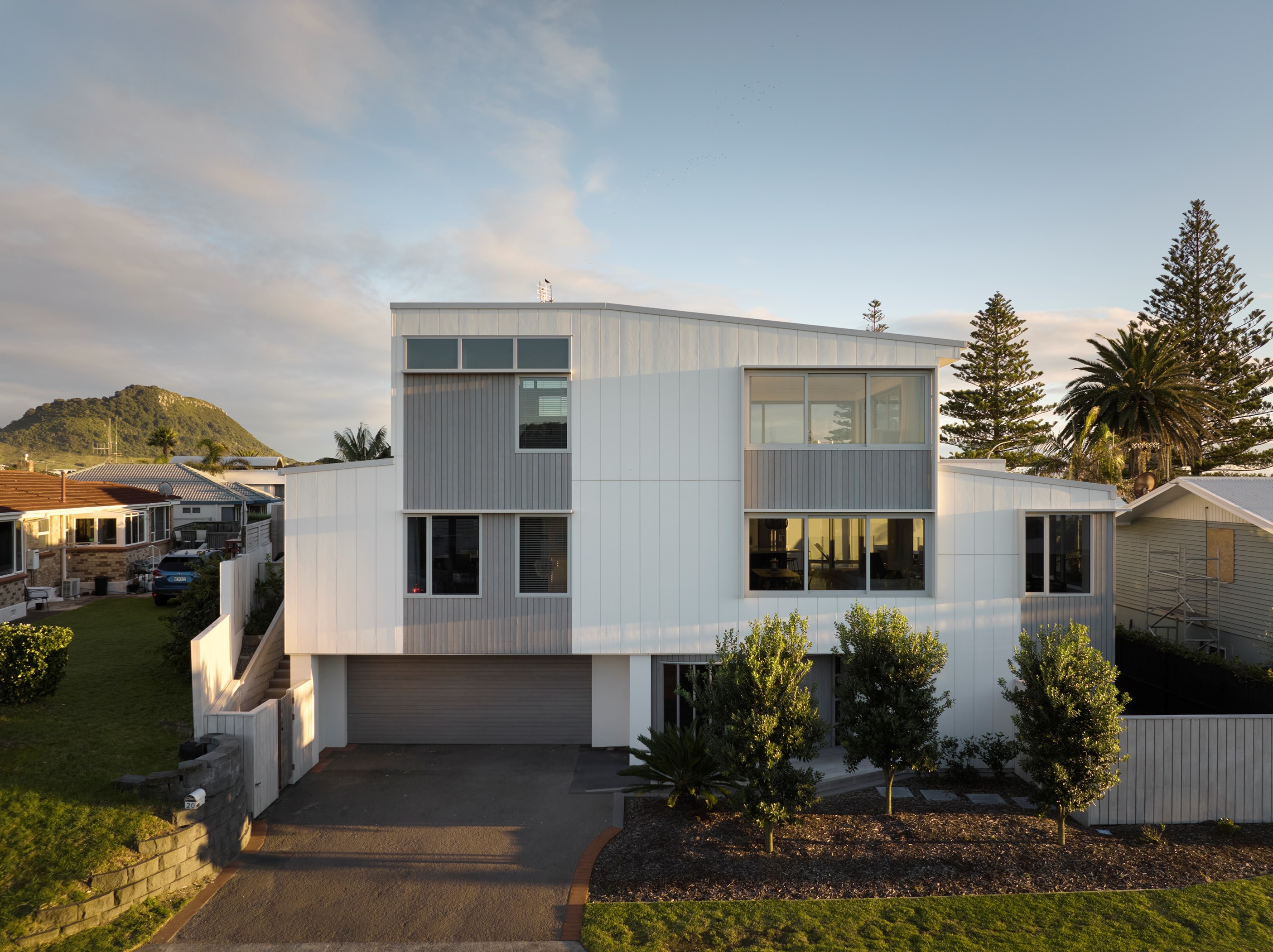 In this substantial renovation, the delight is in the detail. The interior has been given a fresh new beachy feel that perfectly mirrors the three-storey home’s coastal setting. Natural tones, materials and forms can be found throughout, including vertical timber walls, and balusters that curve around the stairwell. These meticulously crafted features are beautiful in their own right, but never distract from ocean views that can be enjoyed from upper floors. It’s clear the interior has undergone a major refurbishment, but what’s not obvious is the expert structural work hidden from view. Existing unispan mid-floor and framing had to be replaced, due to new structural regulations. A new steel PFC ring beam was installed to the perimeter and bolted to existing block walls. This enabled a new timber mid-floor and internal framing to be constructed. Once all the work was finished, the owners were able to enjoy the improvements and upgrades in their five-bedroom seaside retreat, including a sleek new kitchen with waterfall edge at one end of the island and breakfast bar at the other. From there, they can open expansive glass sliders and step out onto decks, one of which enjoys views of the Pacific.