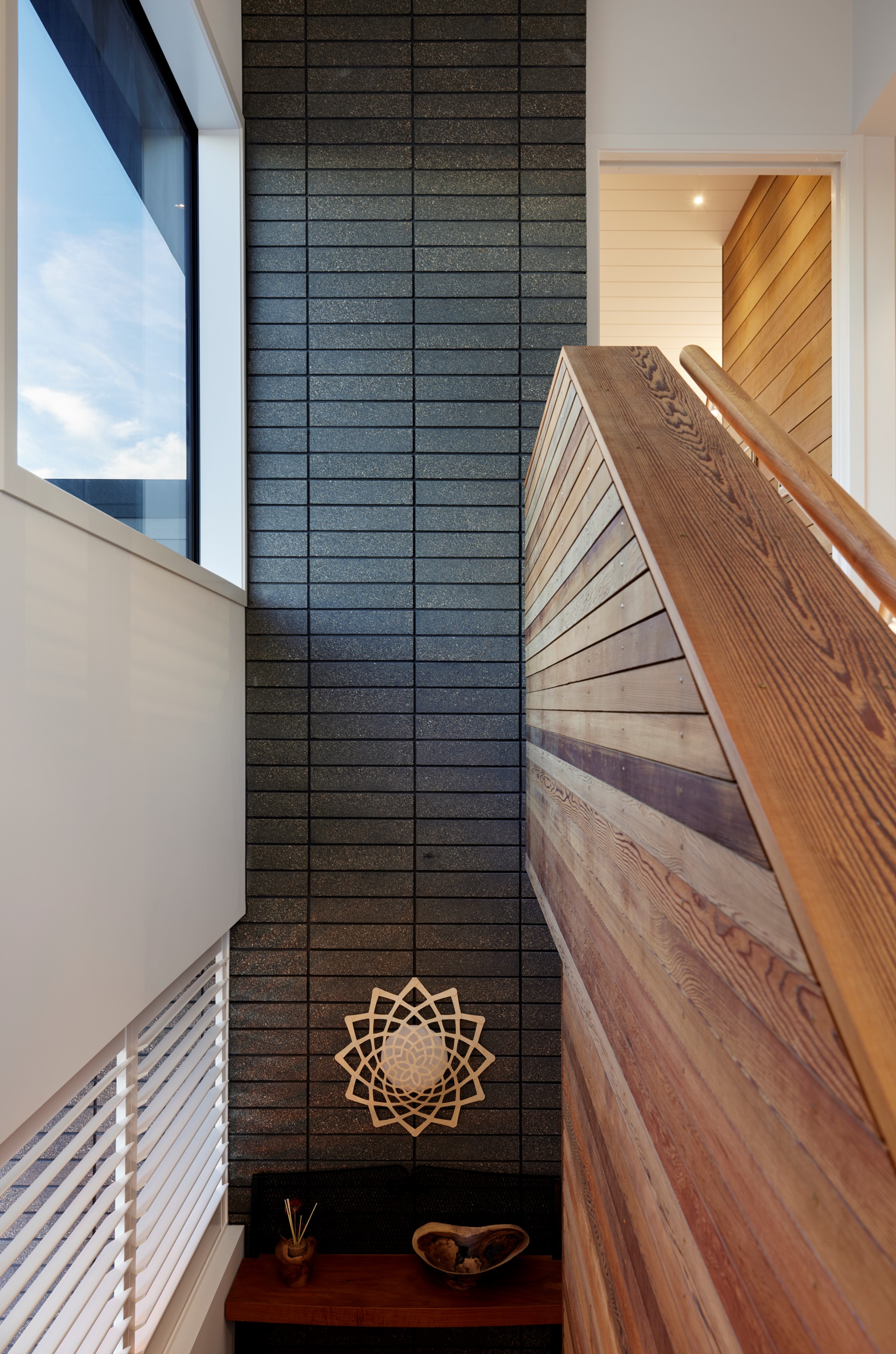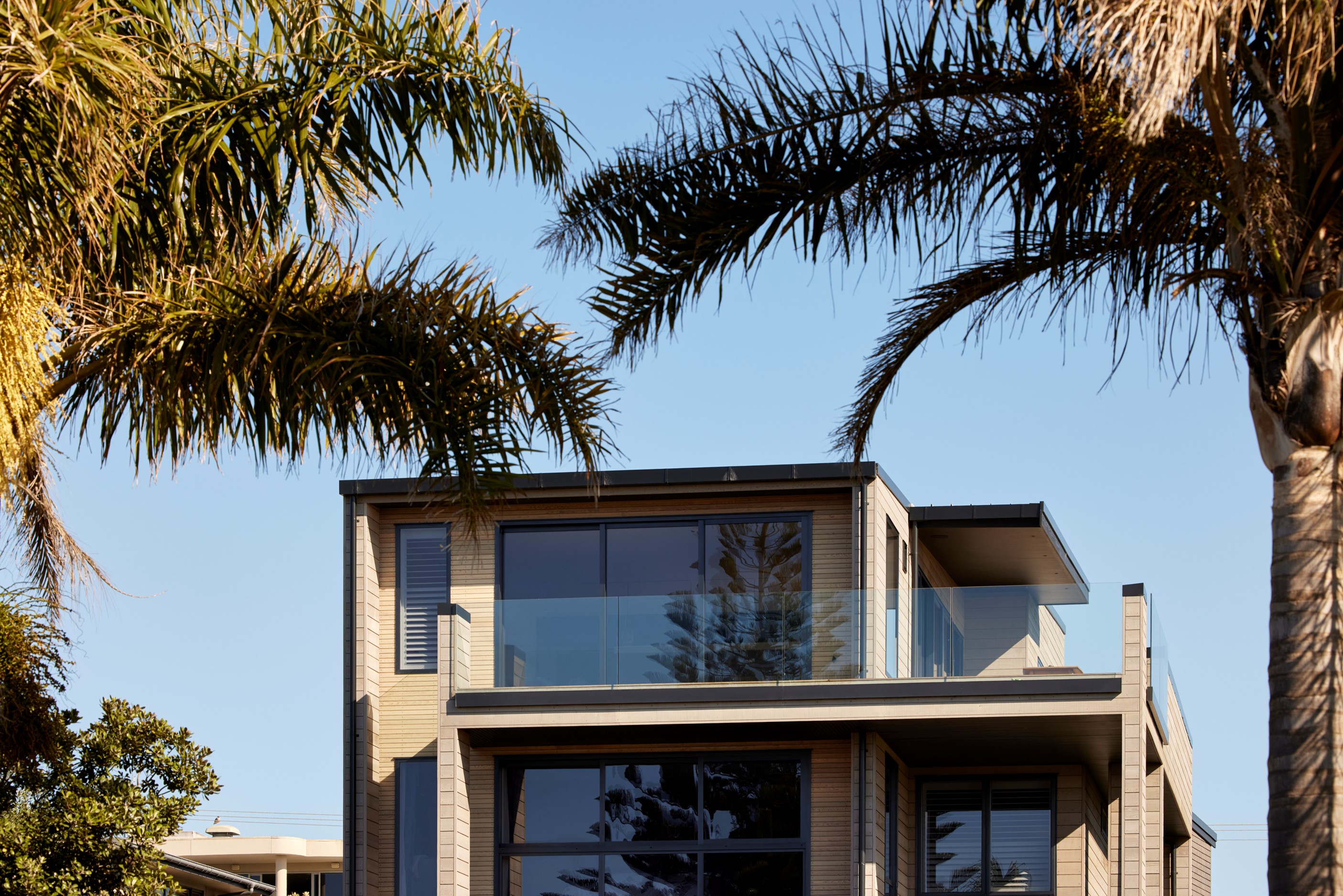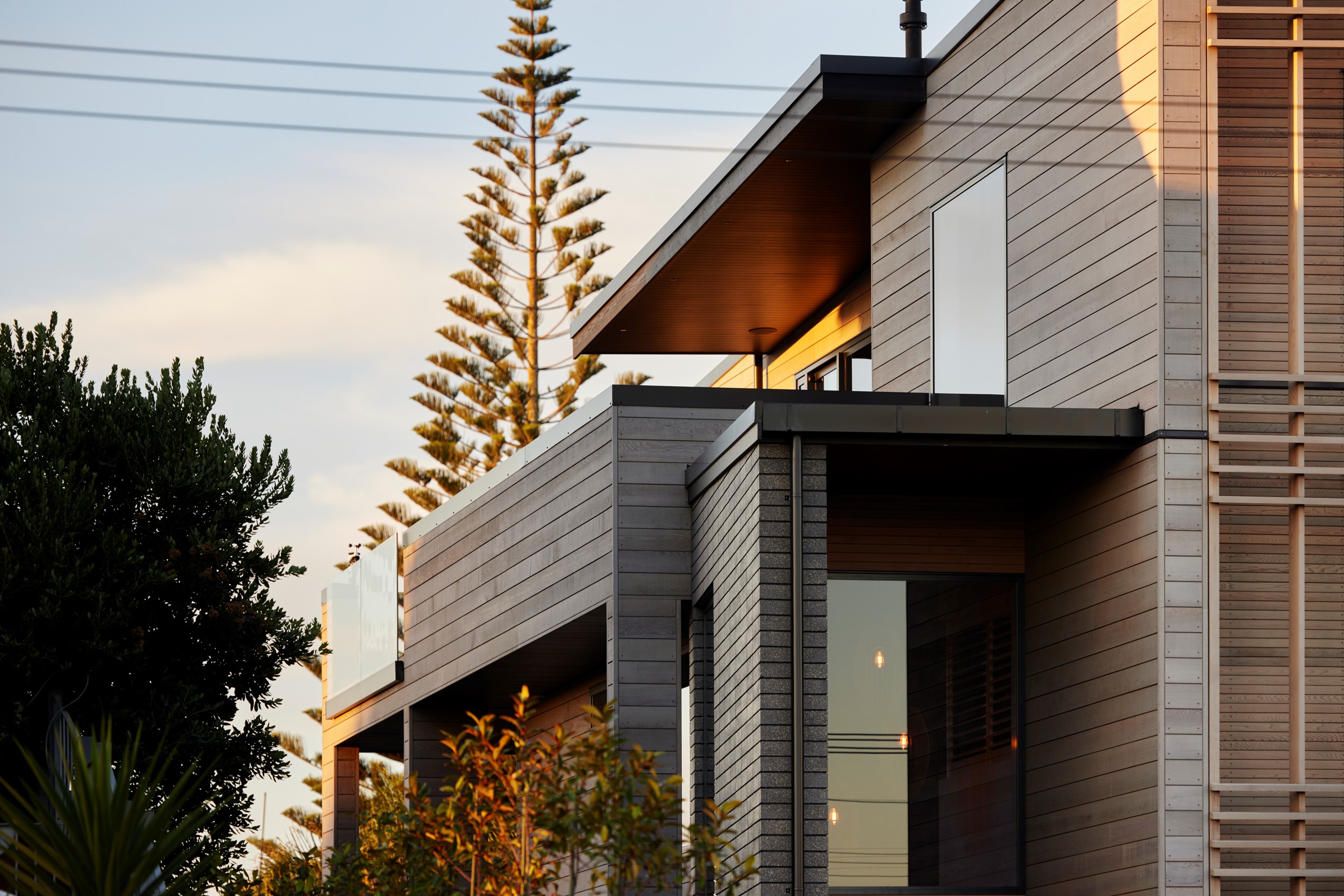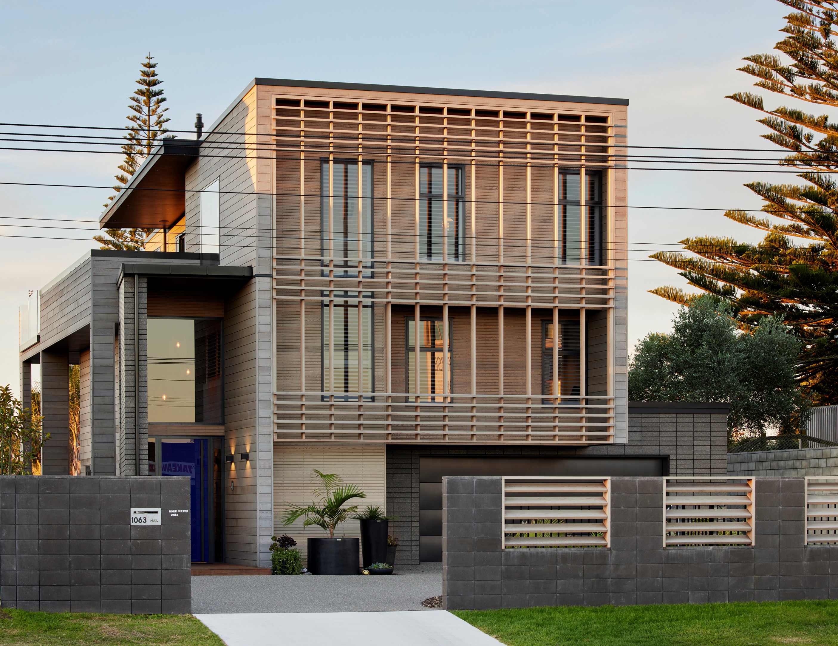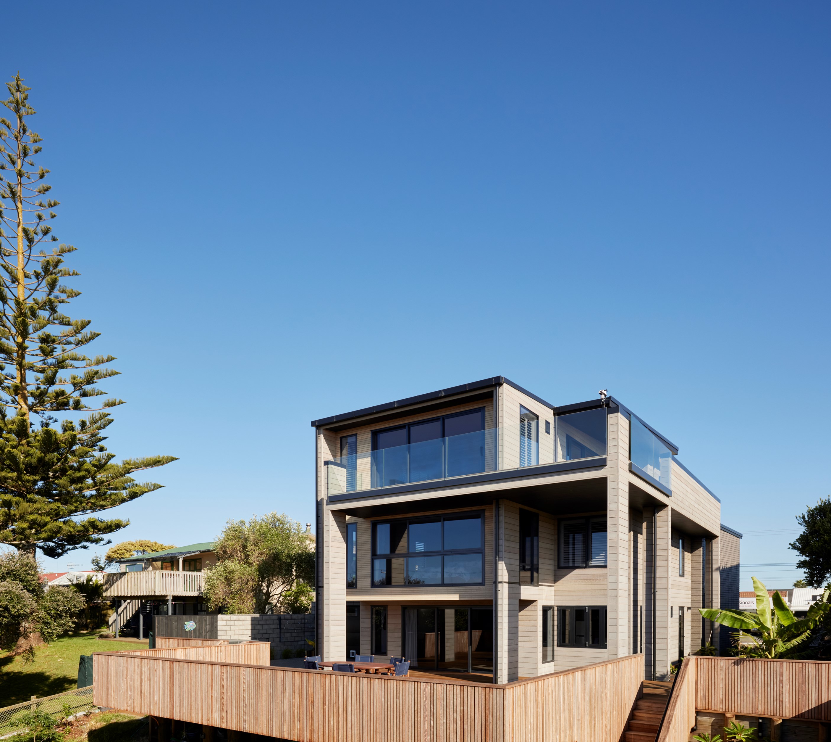 This three-level home at the beach stands out for all the right reasons. Cedar cocoons the entire 383sqm house, making a strong statement at the street side.The intricate screen work is beautiful – and so is the play of shadows it creates inside.The warmth of natural timber is also a strong feature indoors. You’ll find exquisite examples in the kitchen stairwell, entrance and in some of the four bedrooms and bathrooms. Hardwood decking extends the home’s footprint on the top and bottom floors, providing expansive spaces for dining and entertaining, and taking in the coastal views. The basement has a double garage and its own kitchen, a great spot for teenagers, or for staying guests to make themselves at home. The next level is where you’ll find bedrooms and bathrooms, and the top floor is reserved for the main kitchen and living areas. Every detail here has been thought through and executed meticulously, from the striking facade to the pared-back beauty of cement blocks in the entrance feature wall and fireplace surround. Decades of experience in the building industry are on show here. In this instance, standing out translates to outstanding.