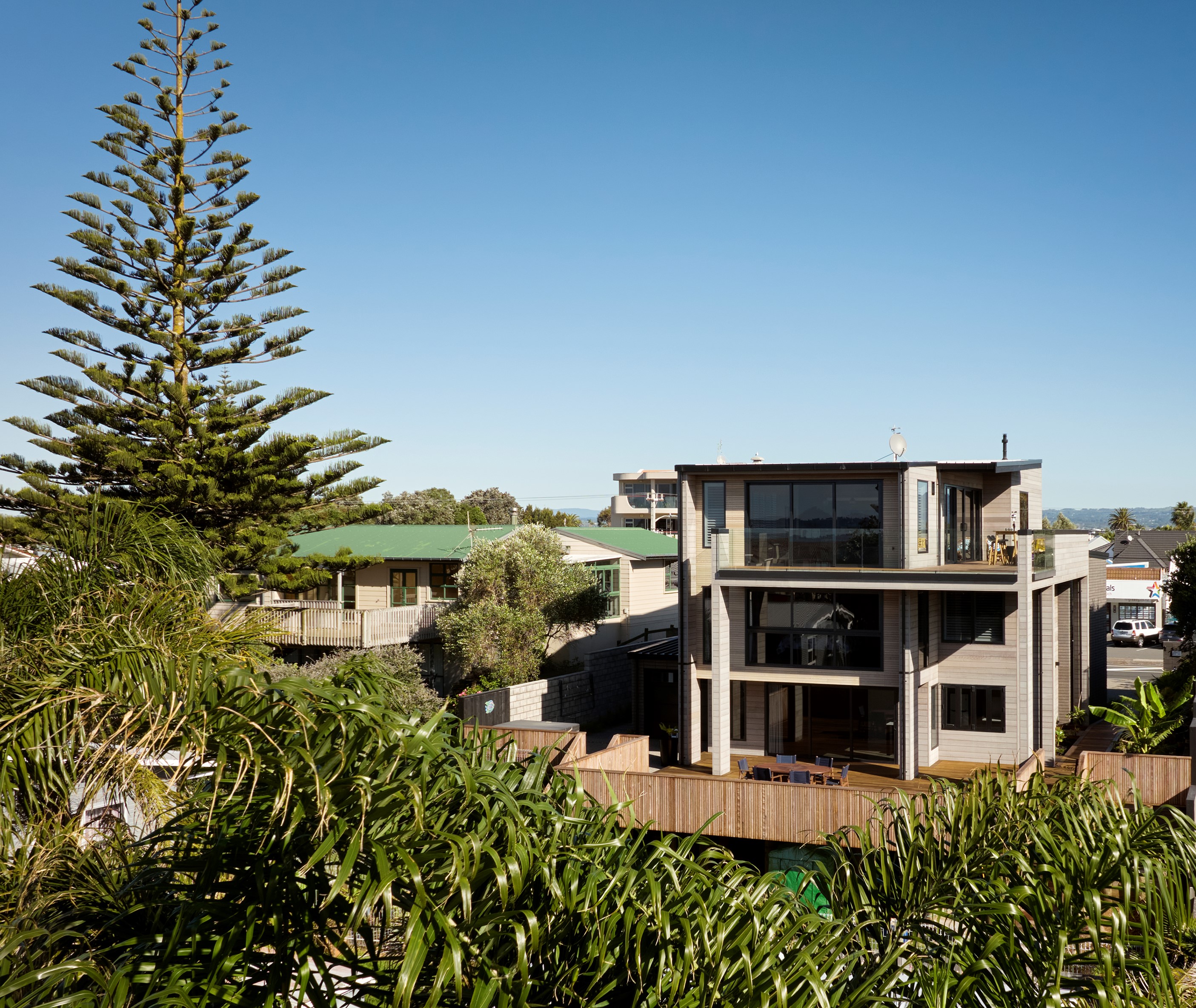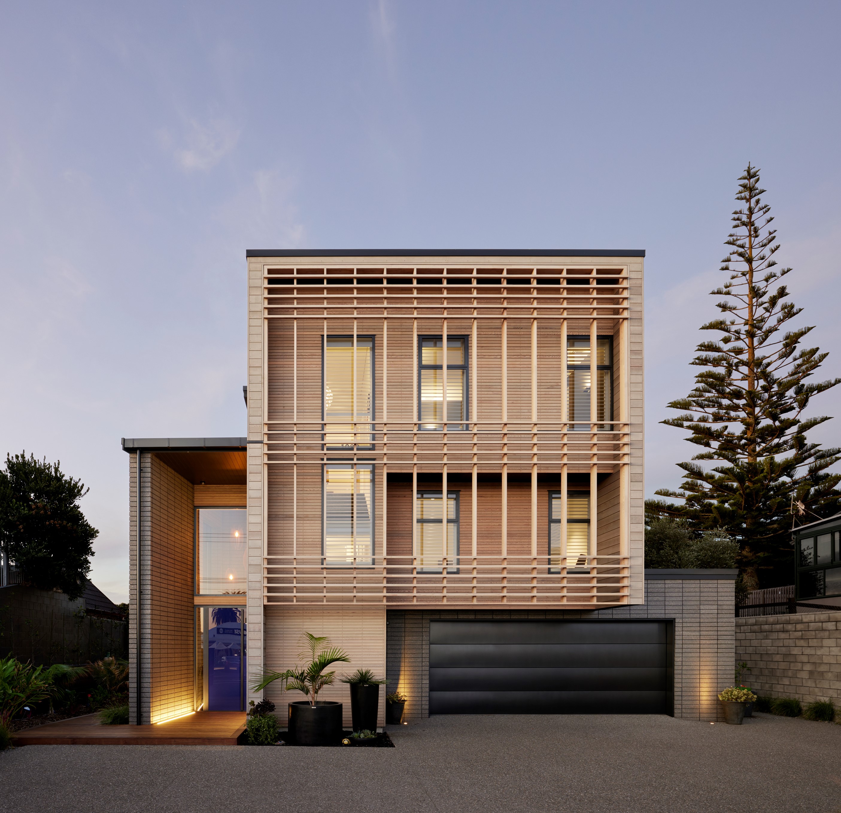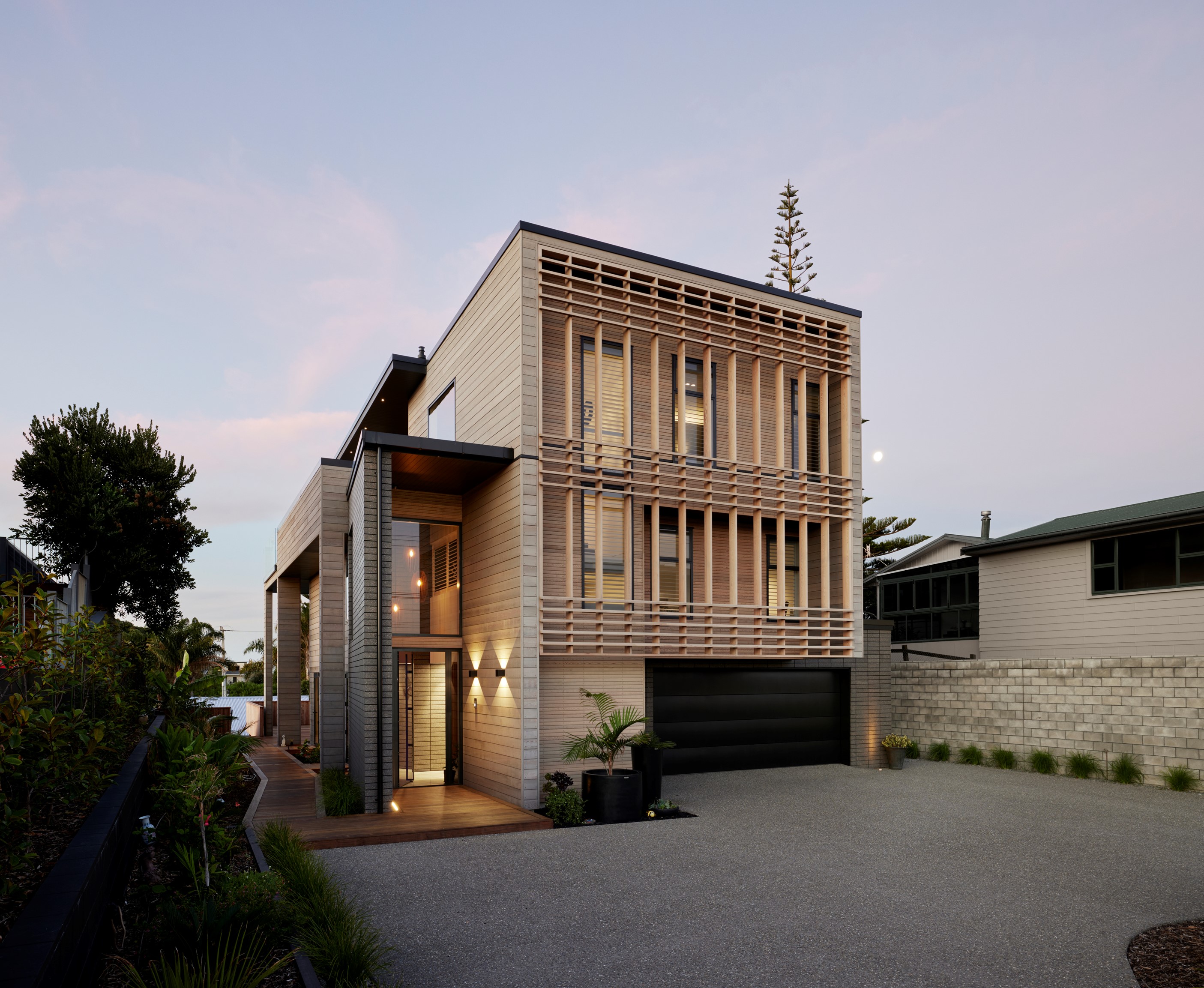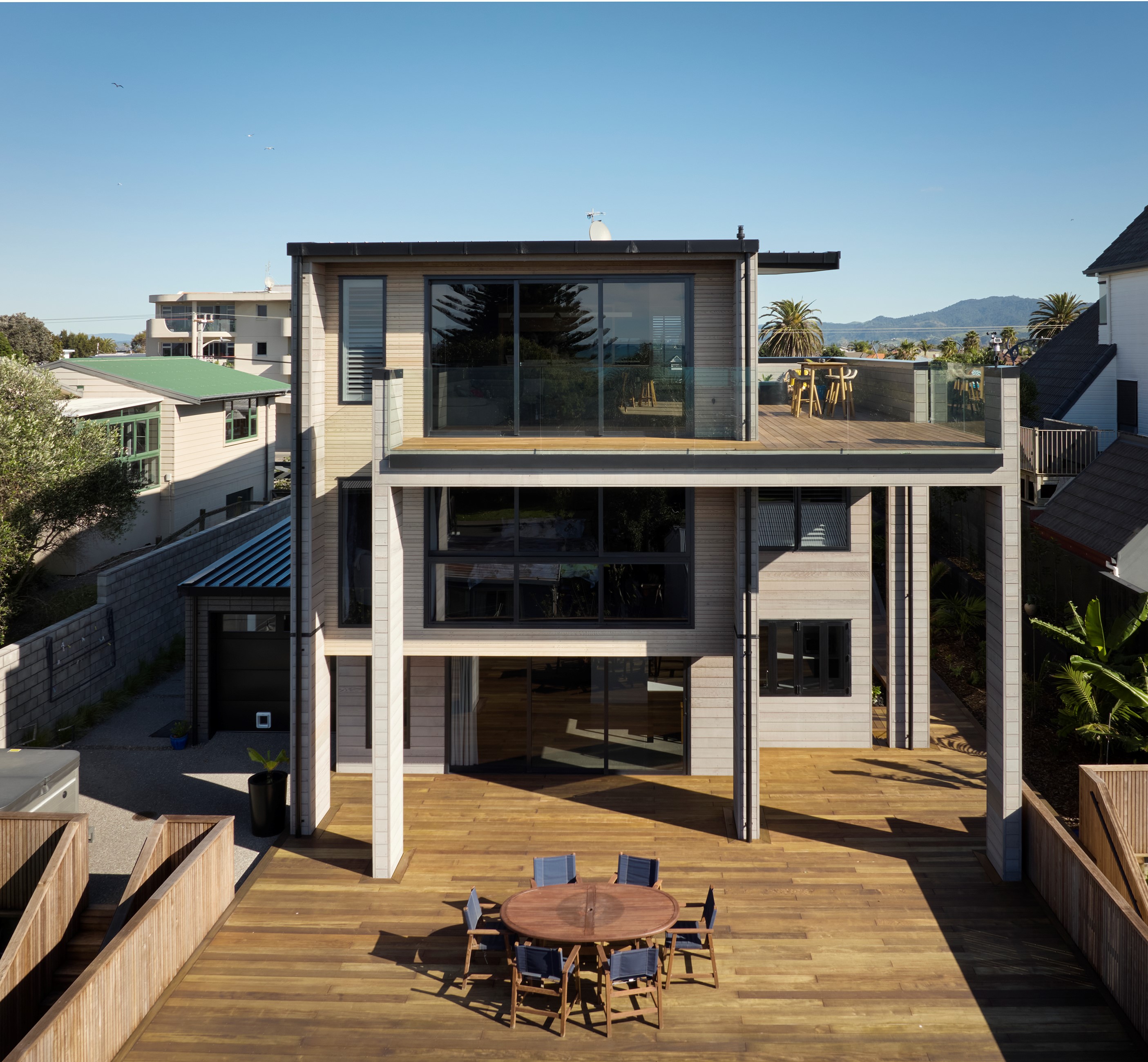 This three-level home at the beach stands out for all the right reasons. Cedar cocoons the entire 383sqm house, making a strong statement at the street side.The intricate screen work is beautiful – and so is the play of shadows it creates inside.The warmth of natural timber is also a strong feature indoors. You’ll find exquisite examples in the kitchen stairwell, entrance and in some of the four bedrooms and bathrooms. Hardwood decking extends the home’s footprint on the top and bottom floors, providing expansive spaces for dining and entertaining, and taking in the coastal views. The basement has a double garage and its own kitchen, a great spot for teenagers, or for staying guests to make themselves at home. The next level is where you’ll find bedrooms and bathrooms, and the top floor is reserved for the main kitchen and living areas. Every detail here has been thought through and executed meticulously, from the striking facade to the pared-back beauty of cement blocks in the entrance feature wall and fireplace surround. Decades of experience in the building industry are on show here. In this instance, standing out translates to outstanding.