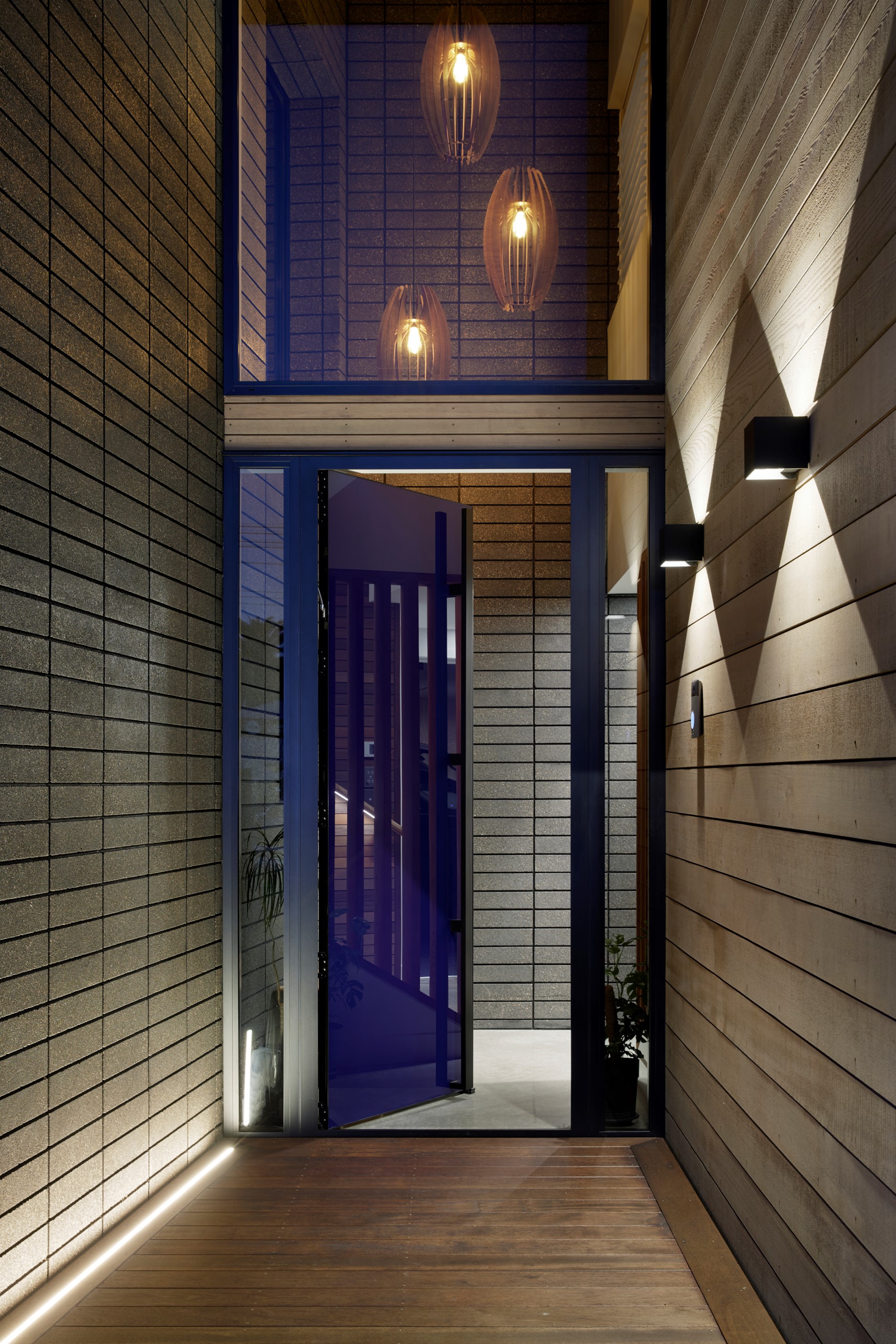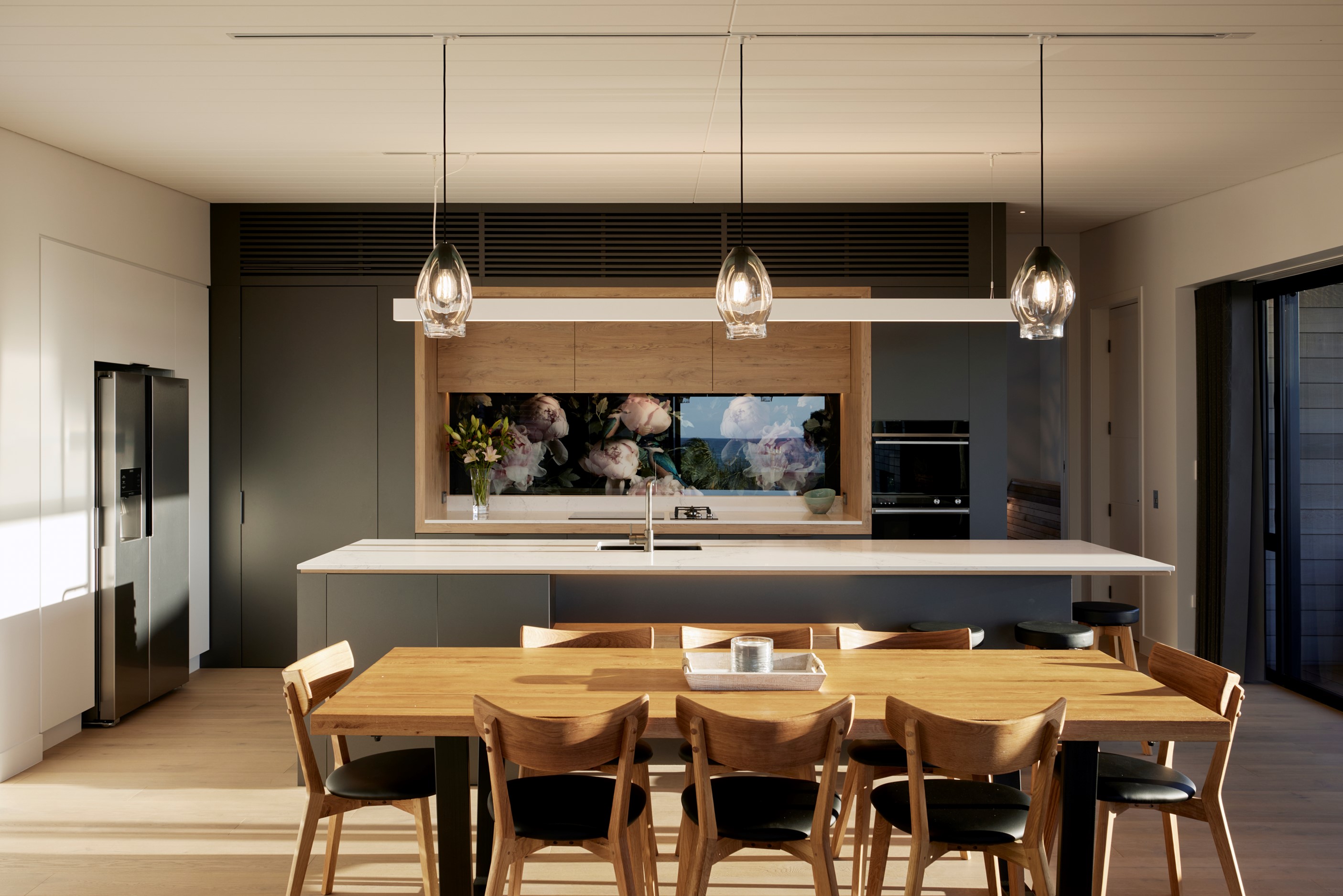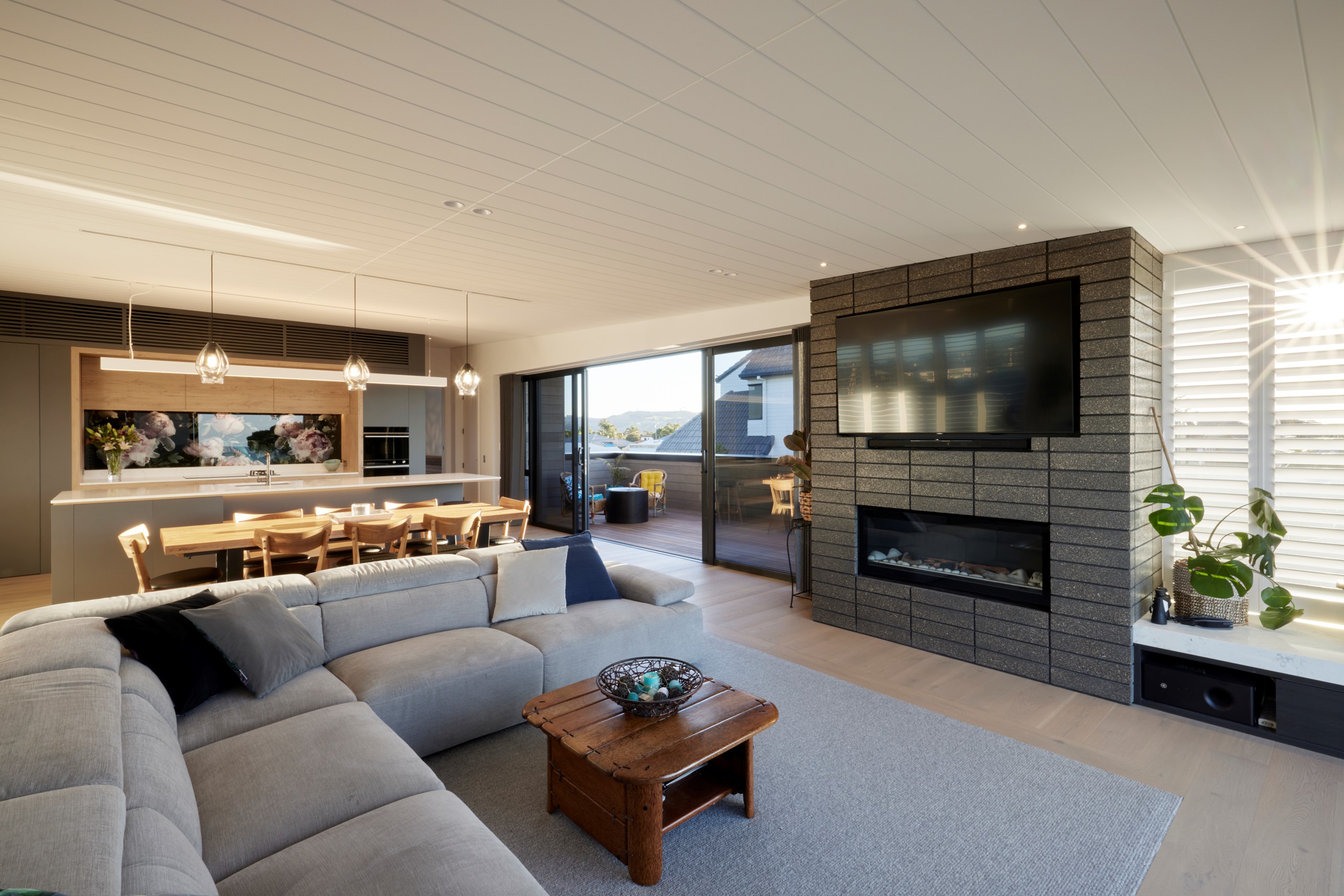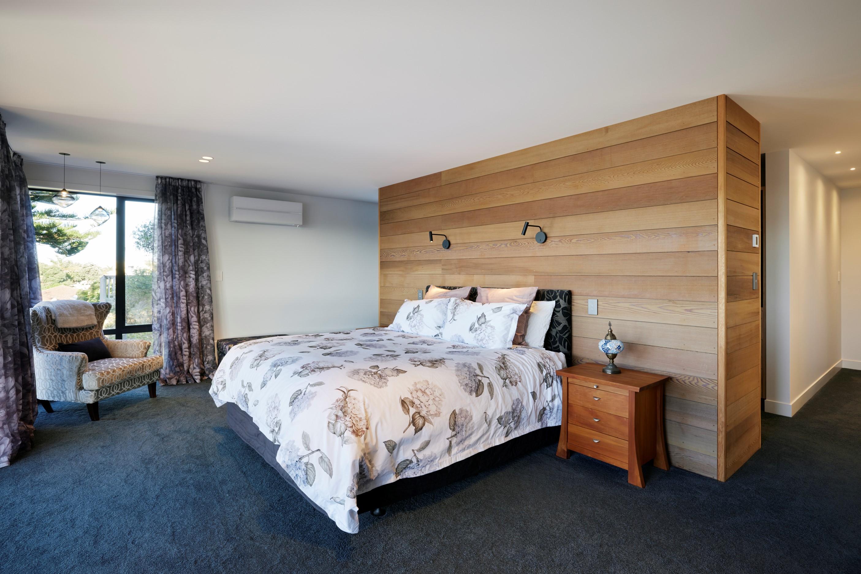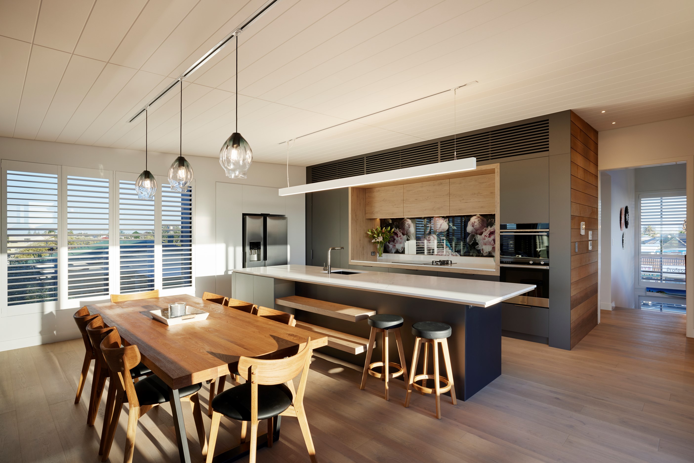 This three-level home at the beach stands out for all the right reasons. Cedar cocoons the entire 383sqm house, making a strong statement at the street side.The intricate screen work is beautiful – and so is the play of shadows it creates inside.The warmth of natural timber is also a strong feature indoors. You’ll find exquisite examples in the kitchen stairwell, entrance and in some of the four bedrooms and bathrooms. Hardwood decking extends the home’s footprint on the top and bottom floors, providing expansive spaces for dining and entertaining, and taking in the coastal views. The basement has a double garage and its own kitchen, a great spot for teenagers, or for staying guests to make themselves at home. The next level is where you’ll find bedrooms and bathrooms, and the top floor is reserved for the main kitchen and living areas. Every detail here has been thought through and executed meticulously, from the striking facade to the pared-back beauty of cement blocks in the entrance feature wall and fireplace surround. Decades of experience in the building industry are on show here. In this instance, standing out translates to outstanding.