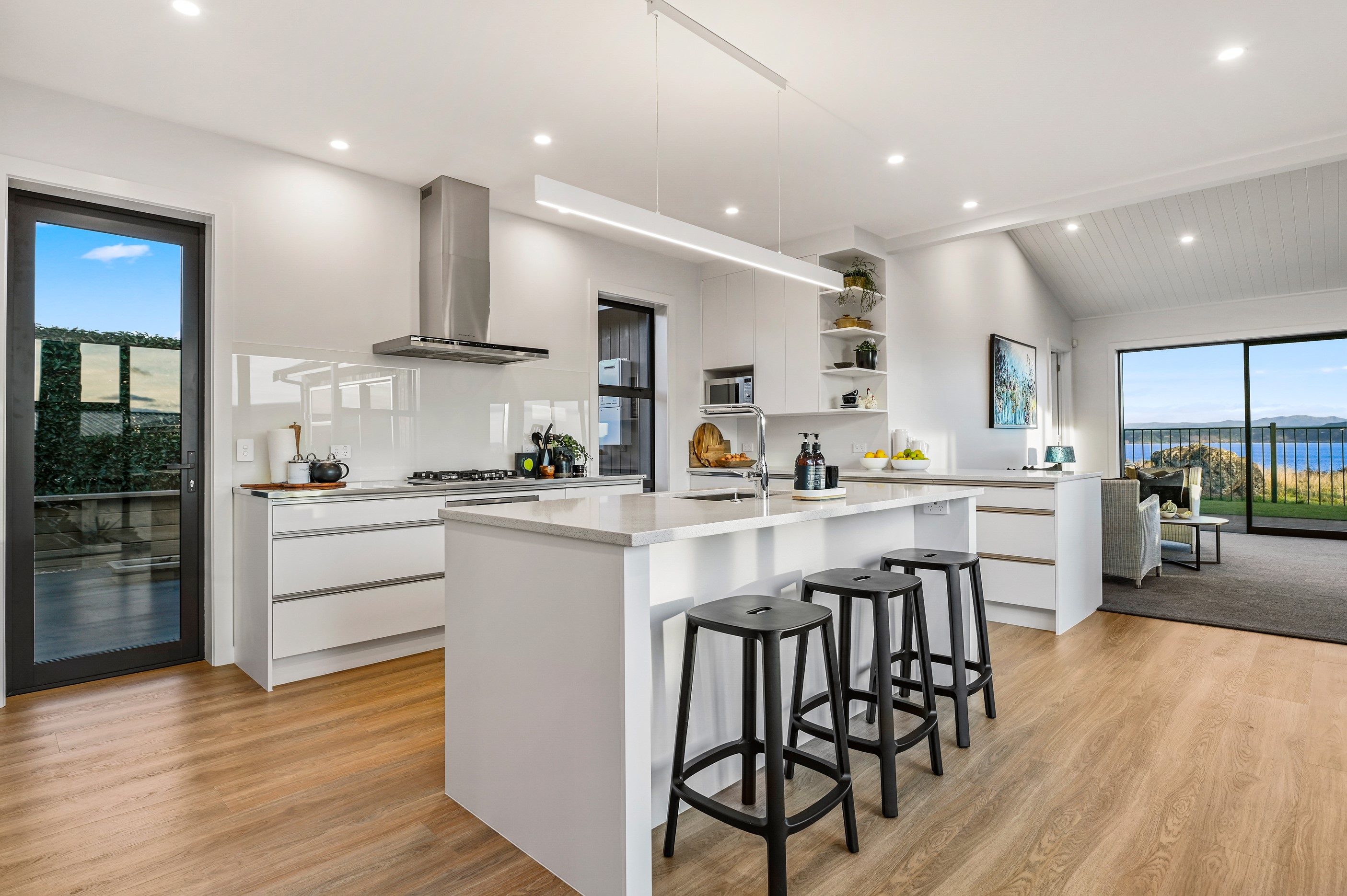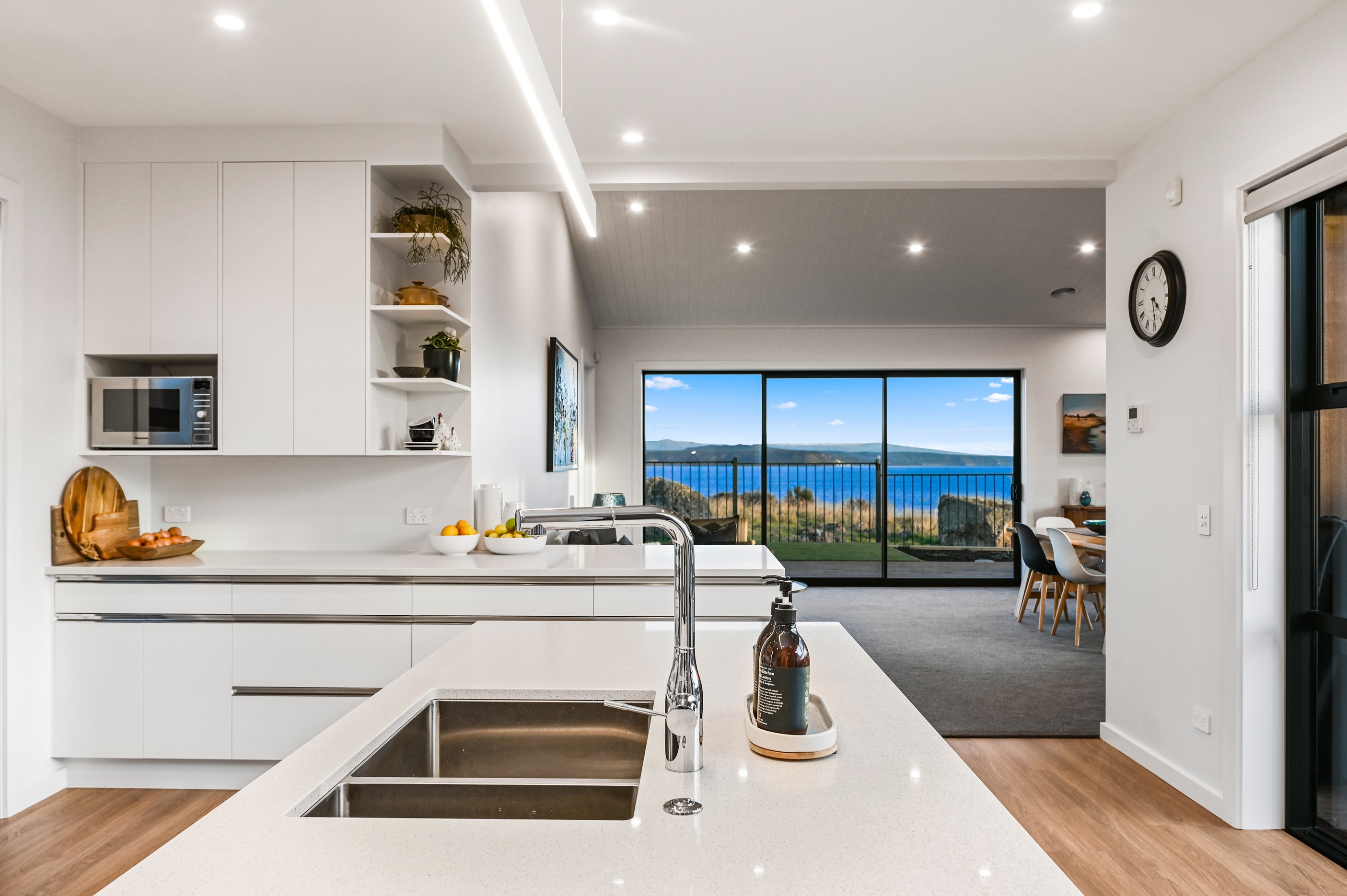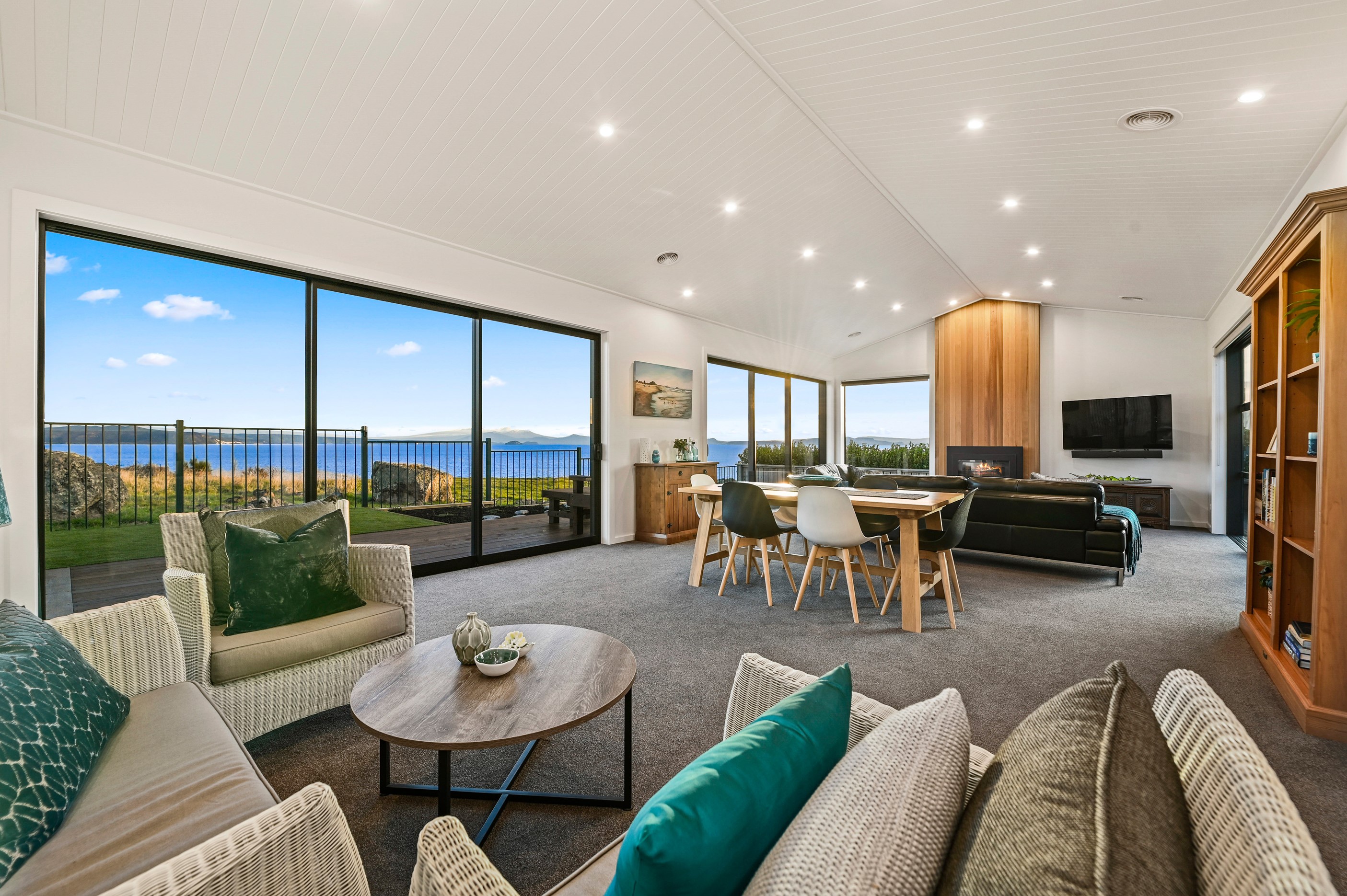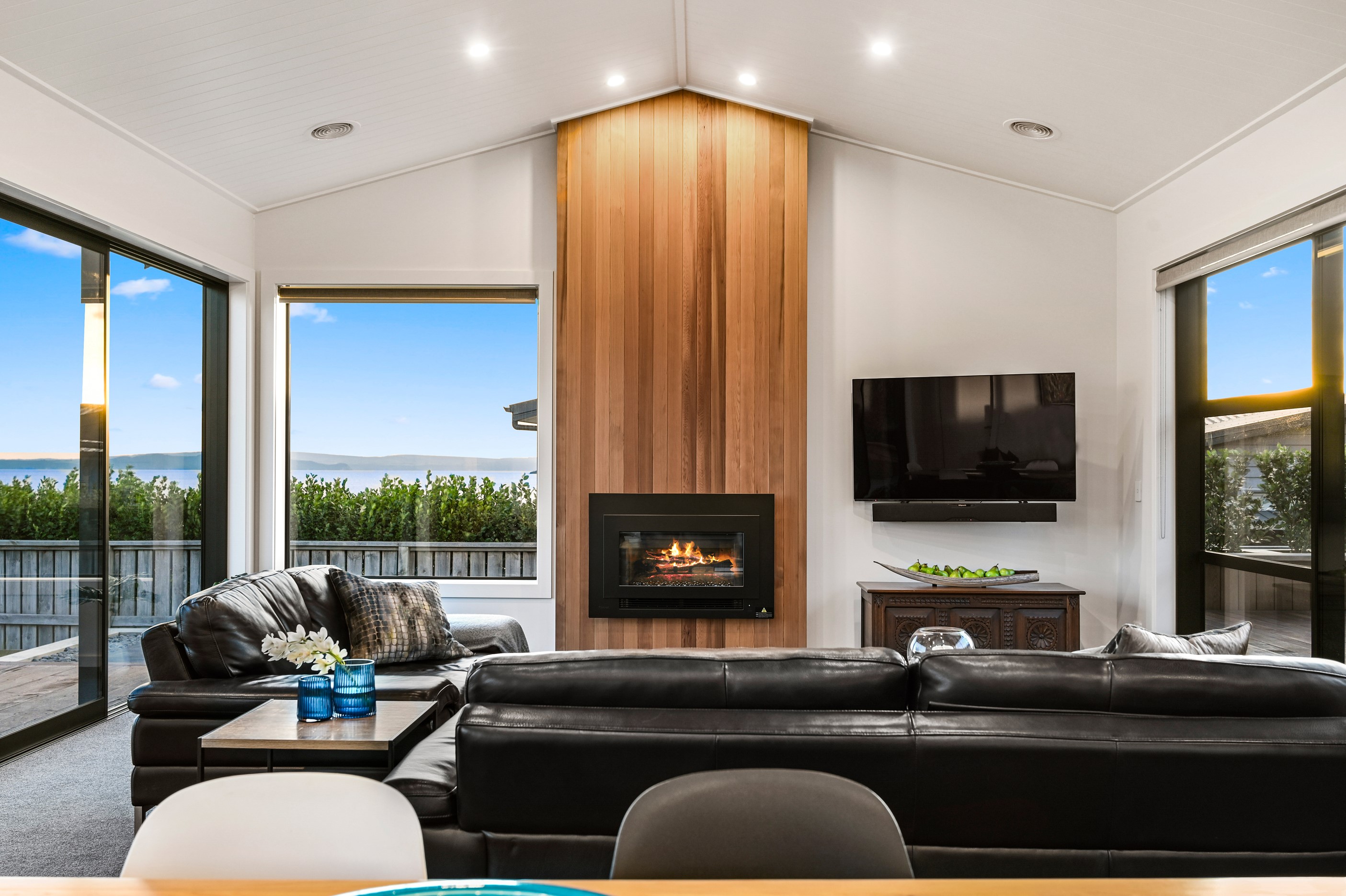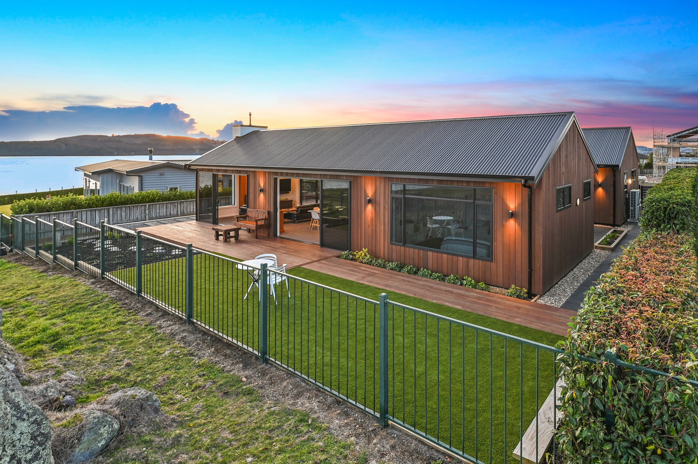 With the shore of Lake Taupō virtually at its doorstep, this project was all about easing the house into its very special environment. Mission accomplished. The single-level house makes a stylish statement in cedar and plaster, yet never detracts from its remarkable setting. With linked twin pavilions, the design ensures the site’s natural assets are enjoyed throughout the home. From morning coffee on the patio to cocktails on the central sheltered deck, the options to engage in the setting are sublime. The interior has a lot to live up to and doesn’t disappoint. Cedar feature walls in the entrance, living room and kitchen provide continuity with the exterior aesthetic. Raking ceilings in the living area add volume and twin sliders open onto the lake-facing deck, offering spectacular views and letting light flood in. The remainder of the 218sqm home also feels light and spacious. Two bathrooms feature tiles that echo the natural tones used elsewhere, and the main bedroom, which has a walk-in robe and ensuite, has raking ceilings. Twin ducted heat pumps and a gas fire make the four-bedroom residence a delight to inhabit, even during those crisp winter Taupō evenings.
