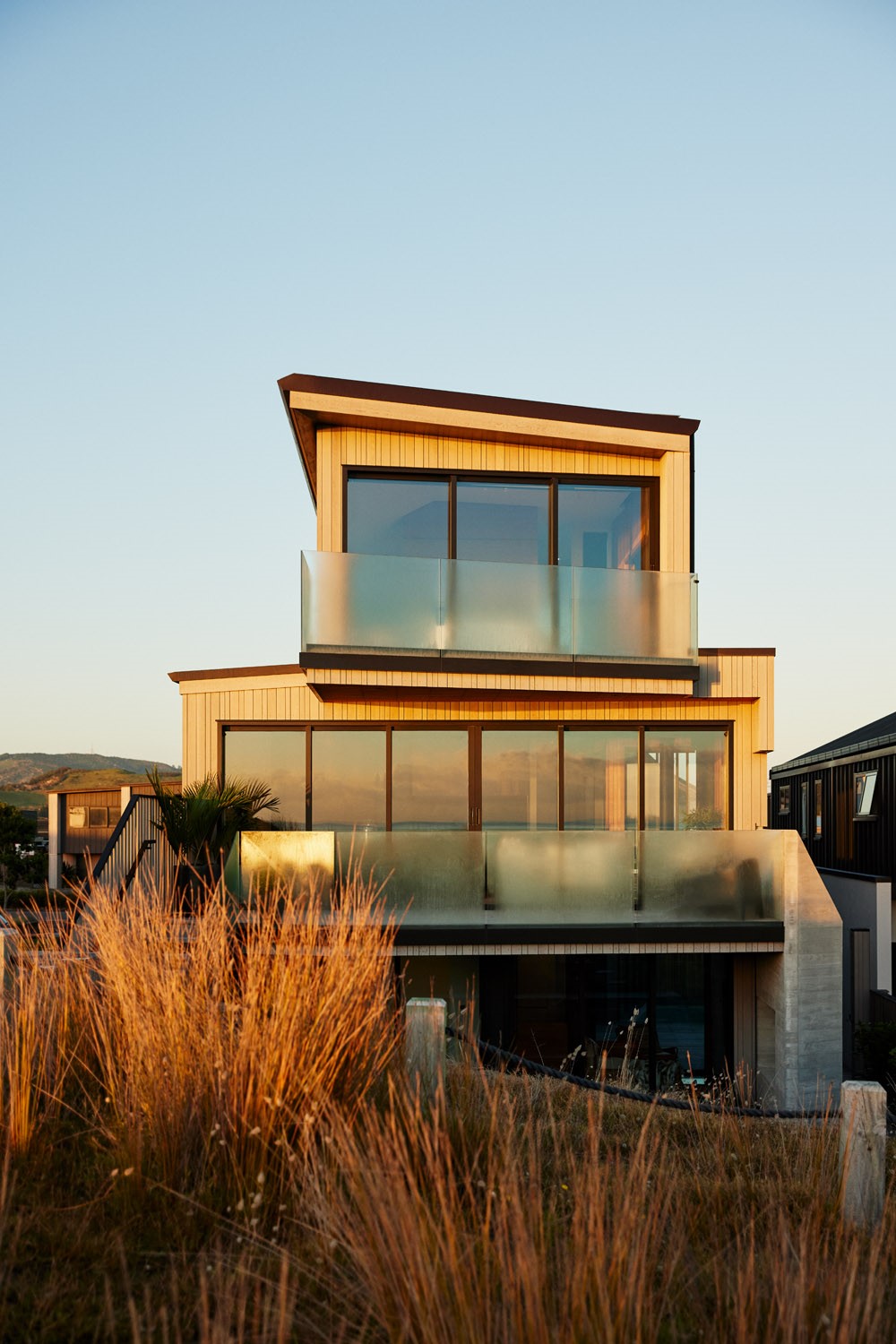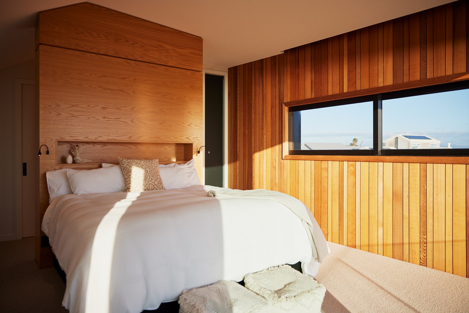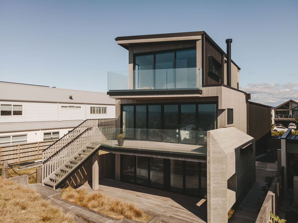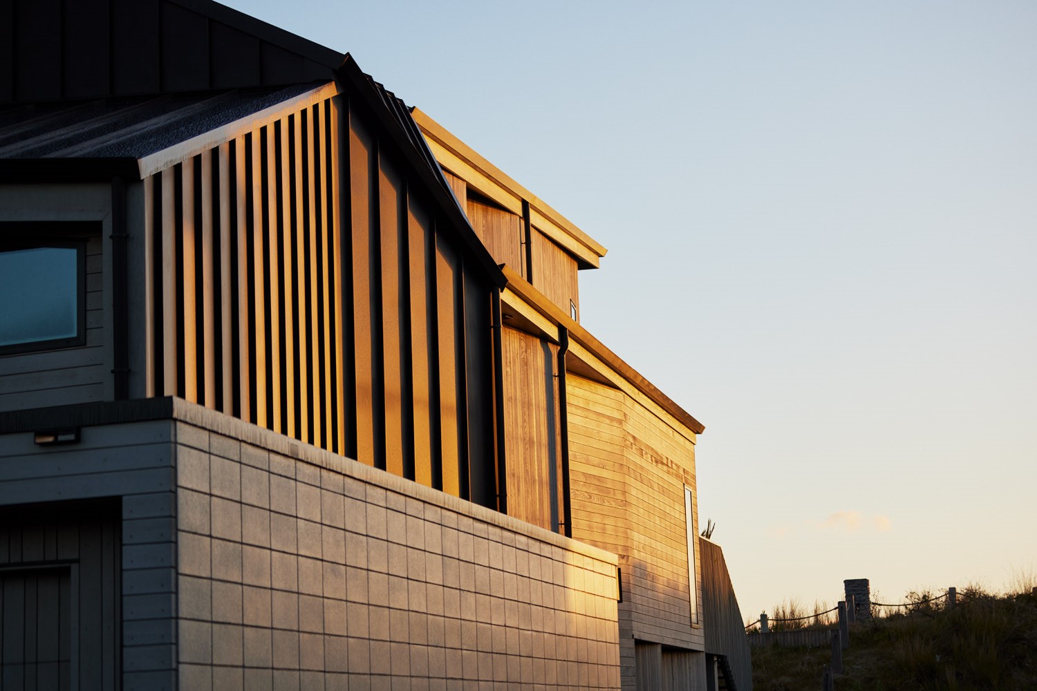 This project was the “game-changer” the builders had always dreamed of. When an out-of-town architect contacted the team wanting them to build a special home on a beachfront section, they jumped at the chance. The results bear testimony to the enthusiasm, skills and craftsmanship shown by Framed Builders, who have constructed a remarkable, bespoke four-bedroom home with views over the dunes to the Pacific Ocean. “Colossal amounts” of cedar clad all three levels of the home. Placed at varying angles, they create a striking exterior aesthetic. Each of the three levels is designed to capture natural light and the expansive outlook. As the 312sqm project developed, so did the budget– a result of owner-requested extras, such as a swimming pool. The pool was a challenging last-minute addition for the team, who took it all in their stride. Fitted out with natural materials and organic hues, the interior is in harmony with its environment. Dovetailed timber features, swathes of glass, accents of concrete and black, and framed views of sea and surf leave you in no doubt that this is luxury beachside living. Low-e glass and solar roof panels ensure this impressive home is economical to run.