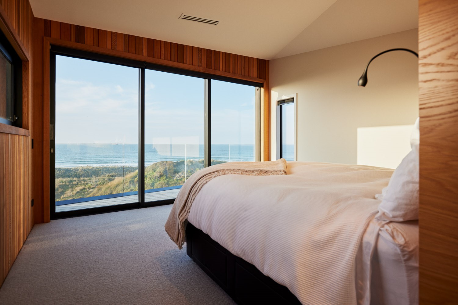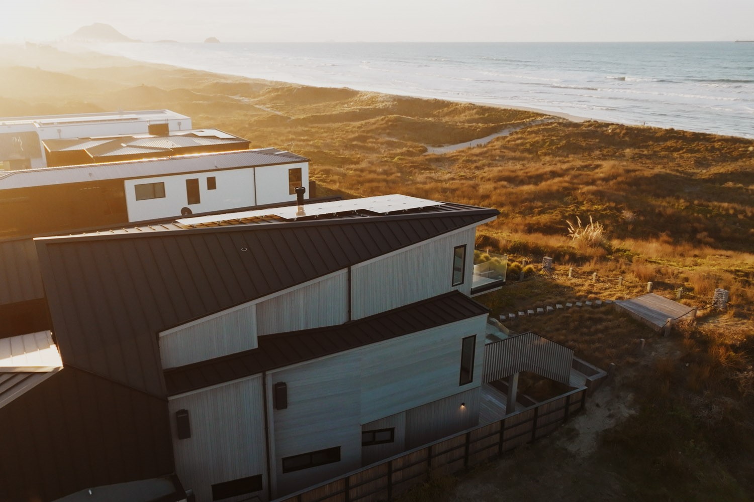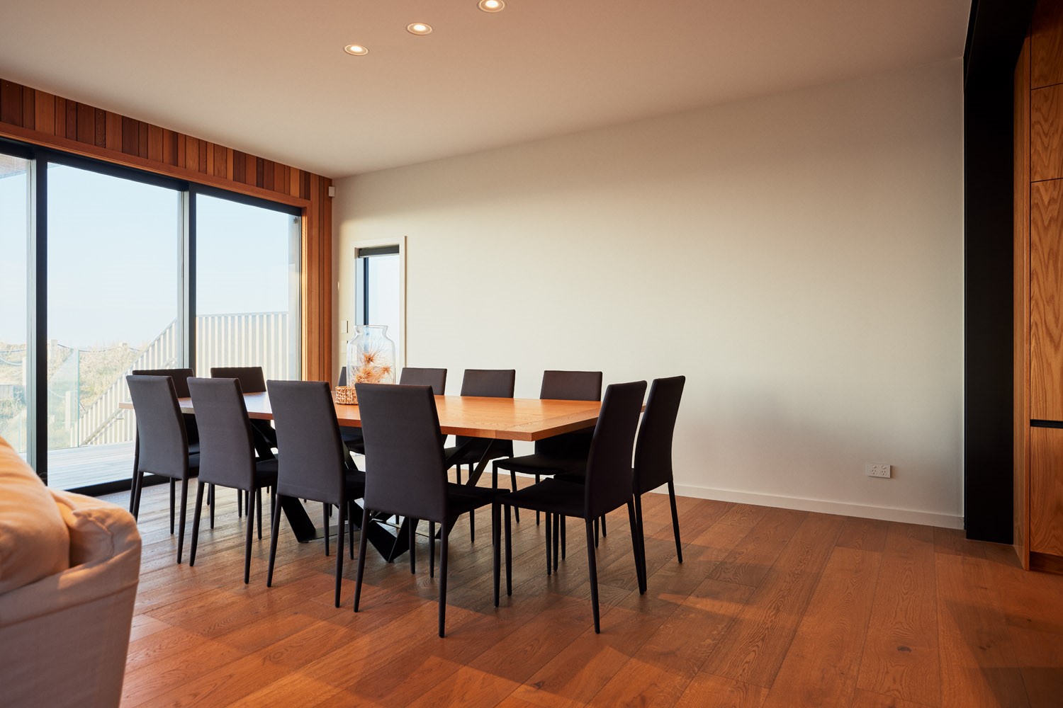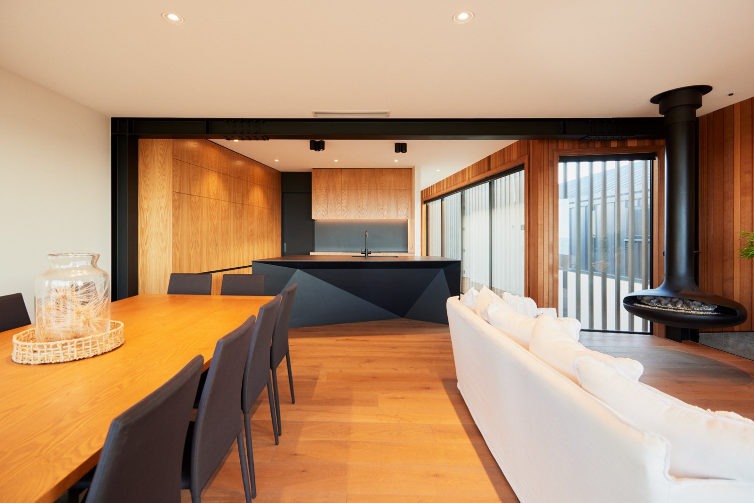 This project was the “game-changer” the builders had always dreamed of. When an out-of-town architect contacted the team wanting them to build a special home on a beachfront section, they jumped at the chance. The results bear testimony to the enthusiasm, skills and craftsmanship shown by Framed Builders, who have constructed a remarkable, bespoke four-bedroom home with views over the dunes to the Pacific Ocean. “Colossal amounts” of cedar clad all three levels of the home. Placed at varying angles, they create a striking exterior aesthetic. Each of the three levels is designed to capture natural light and the expansive outlook. As the 312sqm project developed, so did the budget– a result of owner-requested extras, such as a swimming pool. The pool was a challenging last-minute addition for the team, who took it all in their stride. Fitted out with natural materials and organic hues, the interior is in harmony with its environment. Dovetailed timber features, swathes of glass, accents of concrete and black, and framed views of sea and surf leave you in no doubt that this is luxury beachside living. Low-e glass and solar roof panels ensure this impressive home is economical to run.
