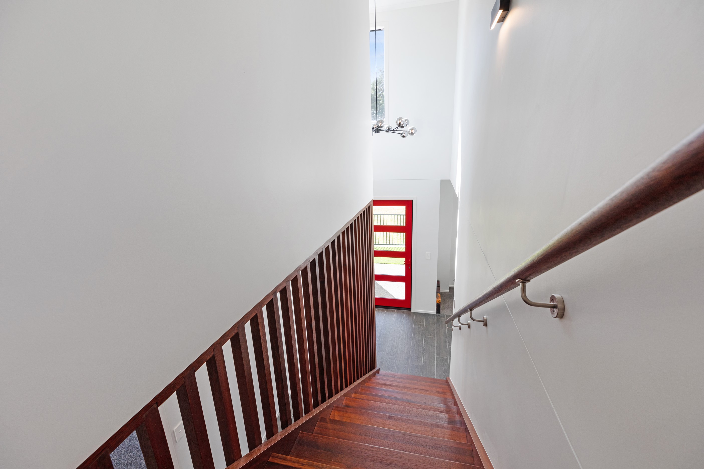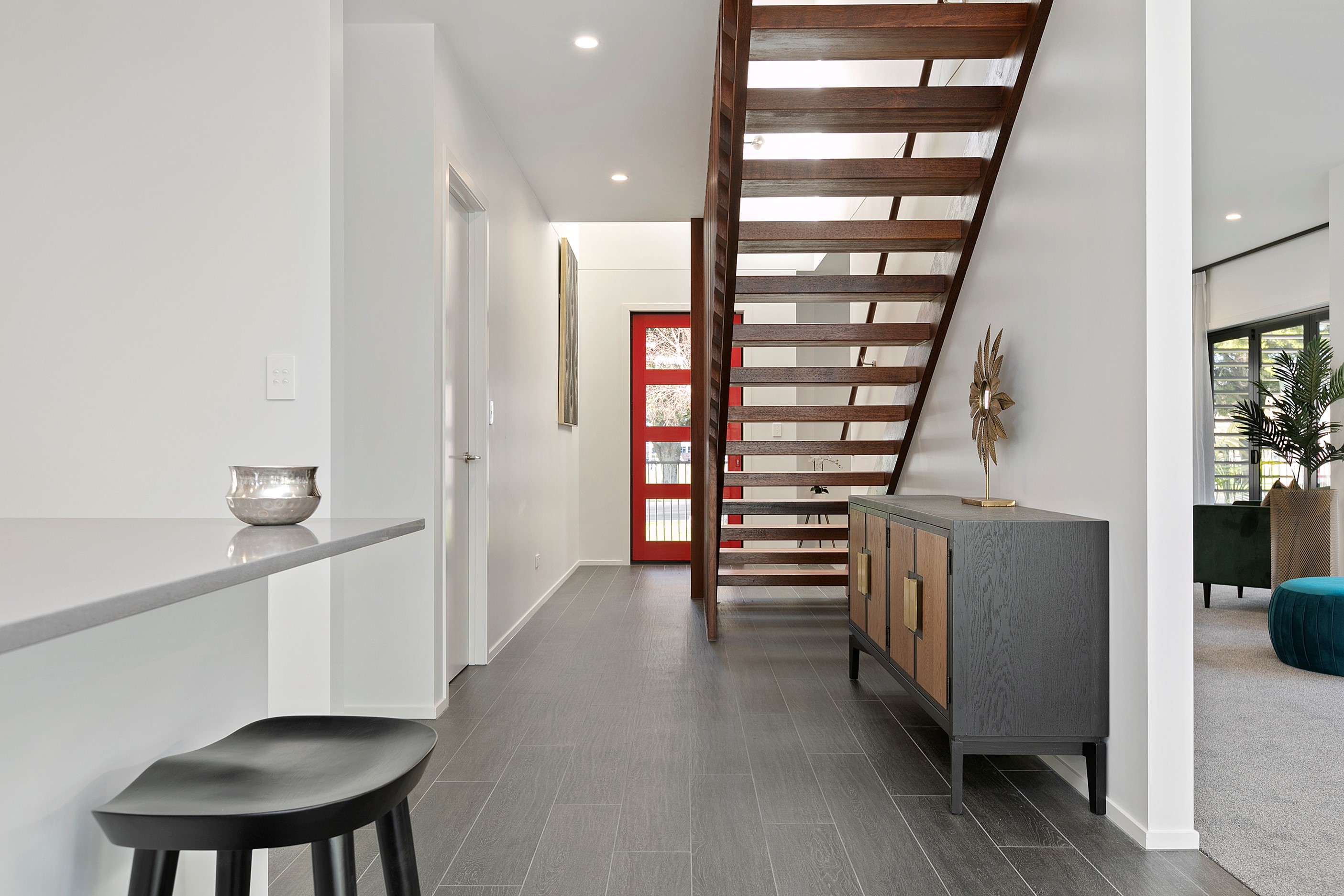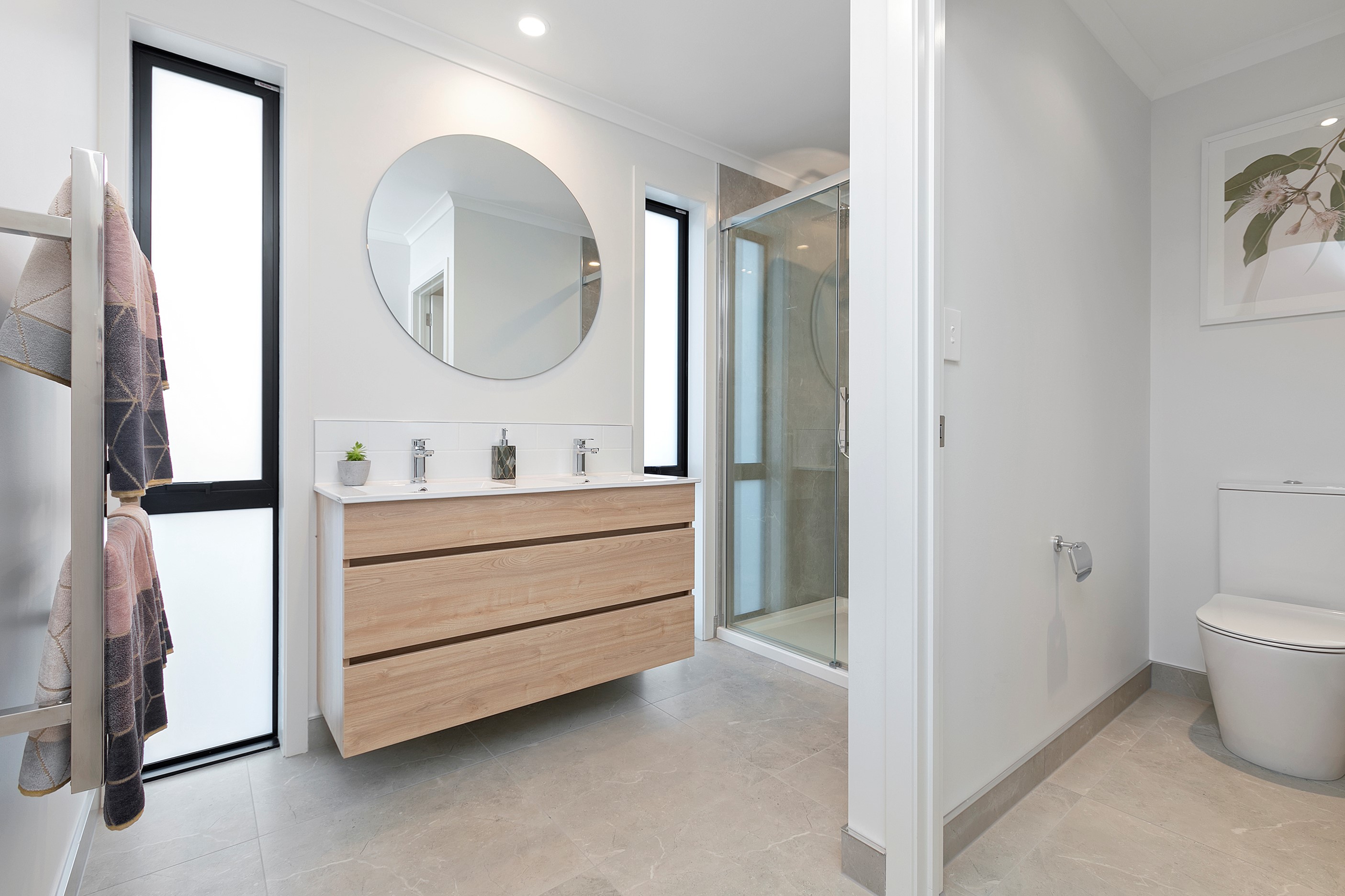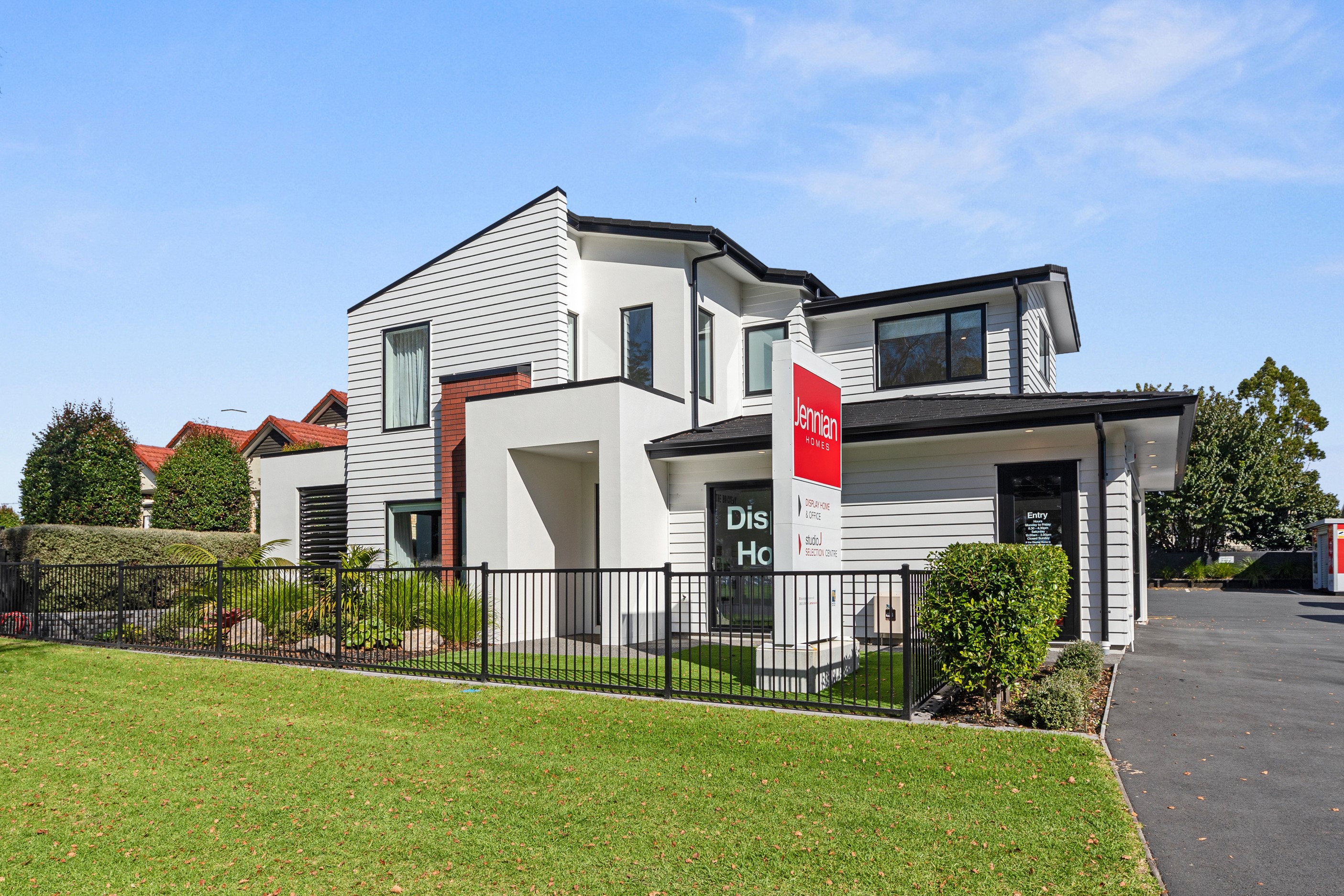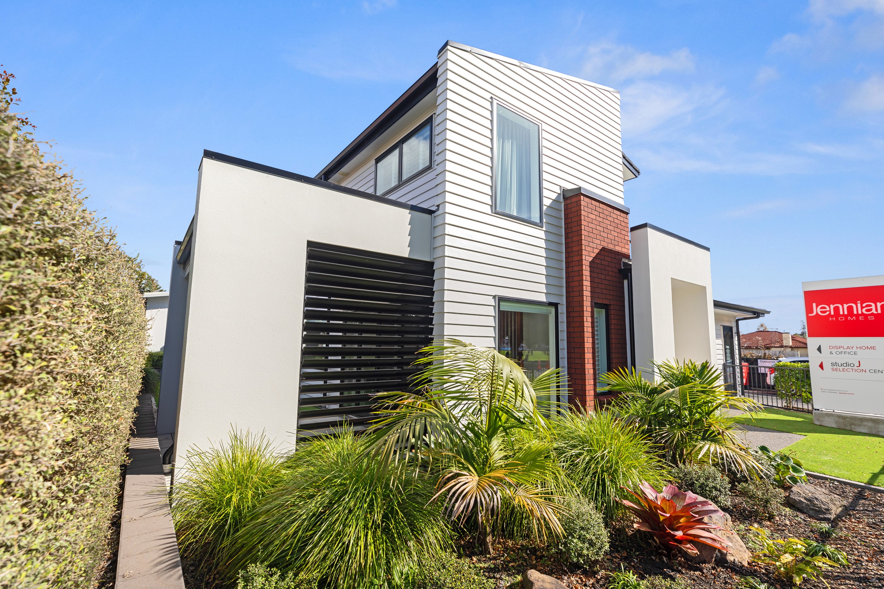 A house with presence was required as Jennian’s shopfront and show home. Located on busy Fifteenth Ave, it needed to appeal to past, current and prospective clients, as well as provide office space and parking for the franchise. Rising up from the land is this bold 218sqm home clad in Linea weatherboard and topped with tiles. Immediately striking from the street are the varied rooflines and postbox-red front door. Inside, home buyers can inspect Jennian’s standard fittings, as well as upgrade options. To illustrate the point: the main bathroom is straight from the plans, while the ensuite has been given special treatment. Whether standard or upgraded, design features abound– the timber staircase has a floor-to-ceiling timber screen, a covered patio is accessed through stacking doors and a feature pendant light illuminates the stairwell. Downstairs is all about relaxed living in the L-shaped open-plan dining, lounge and kitchen zone. The latter has a scullery, which connects directly to the double garage – ideal for unpacking groceries. You’ll find four roomy bedrooms upstairs, plus a family bathroom, main bedroom ensuite and toilets. There’s presence aplenty here, and also serious panache.