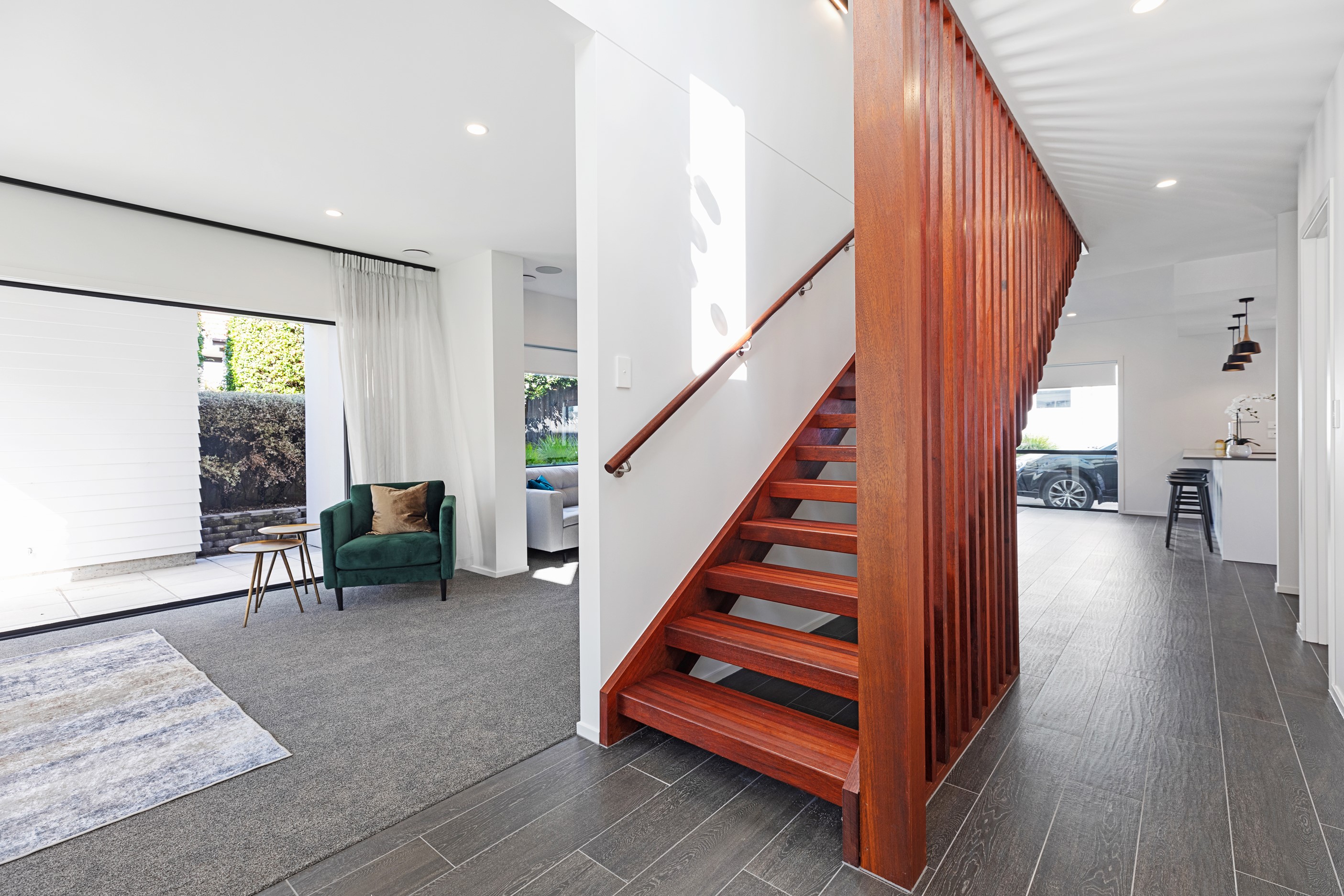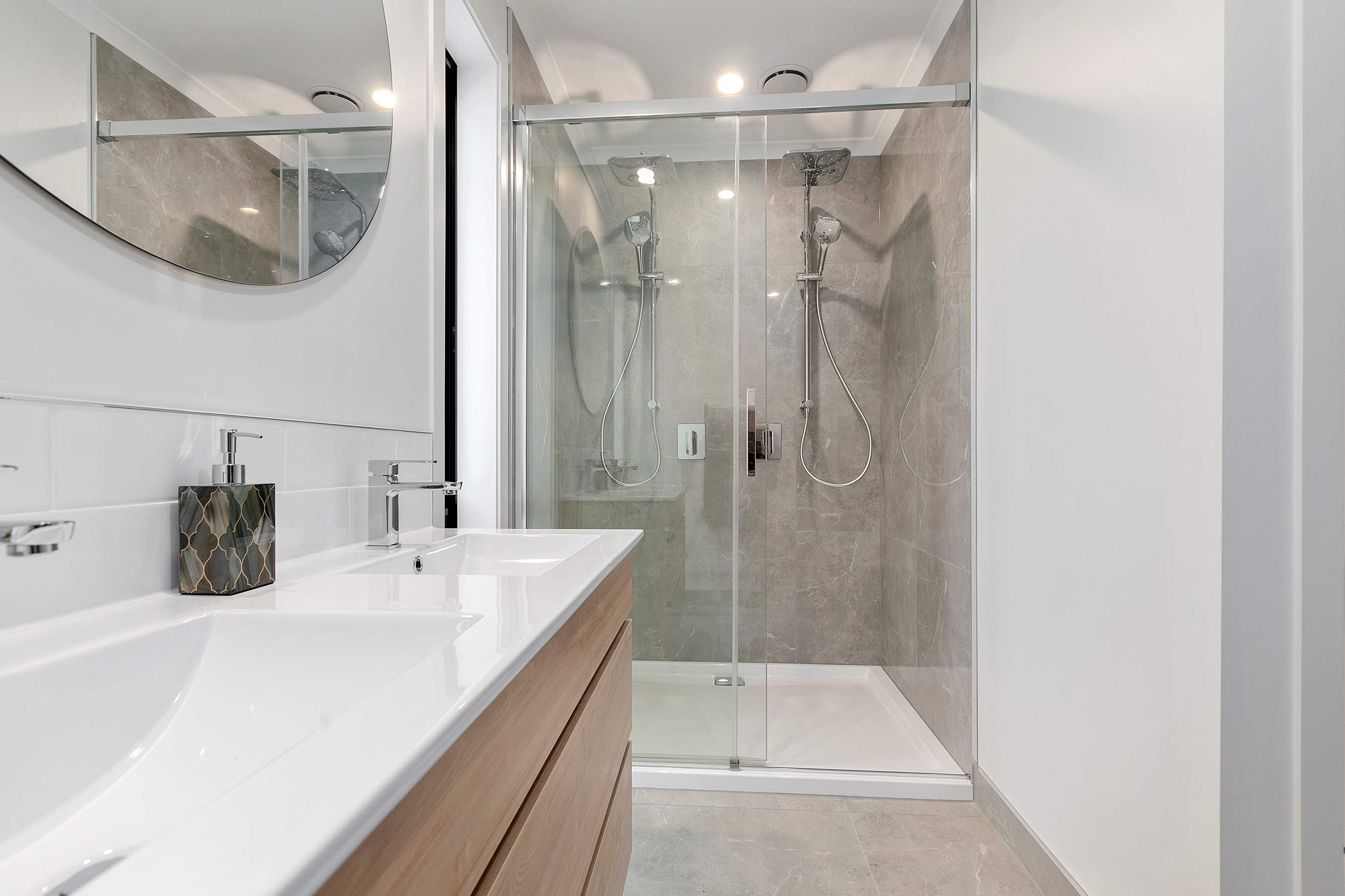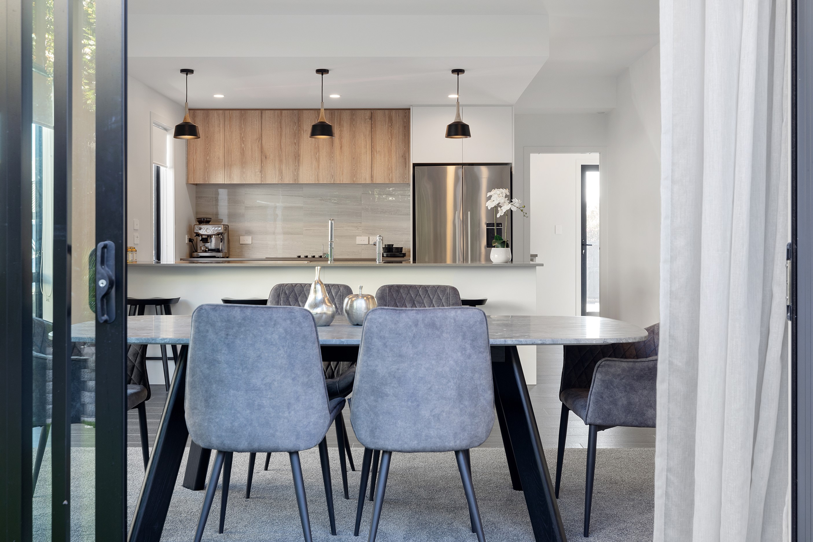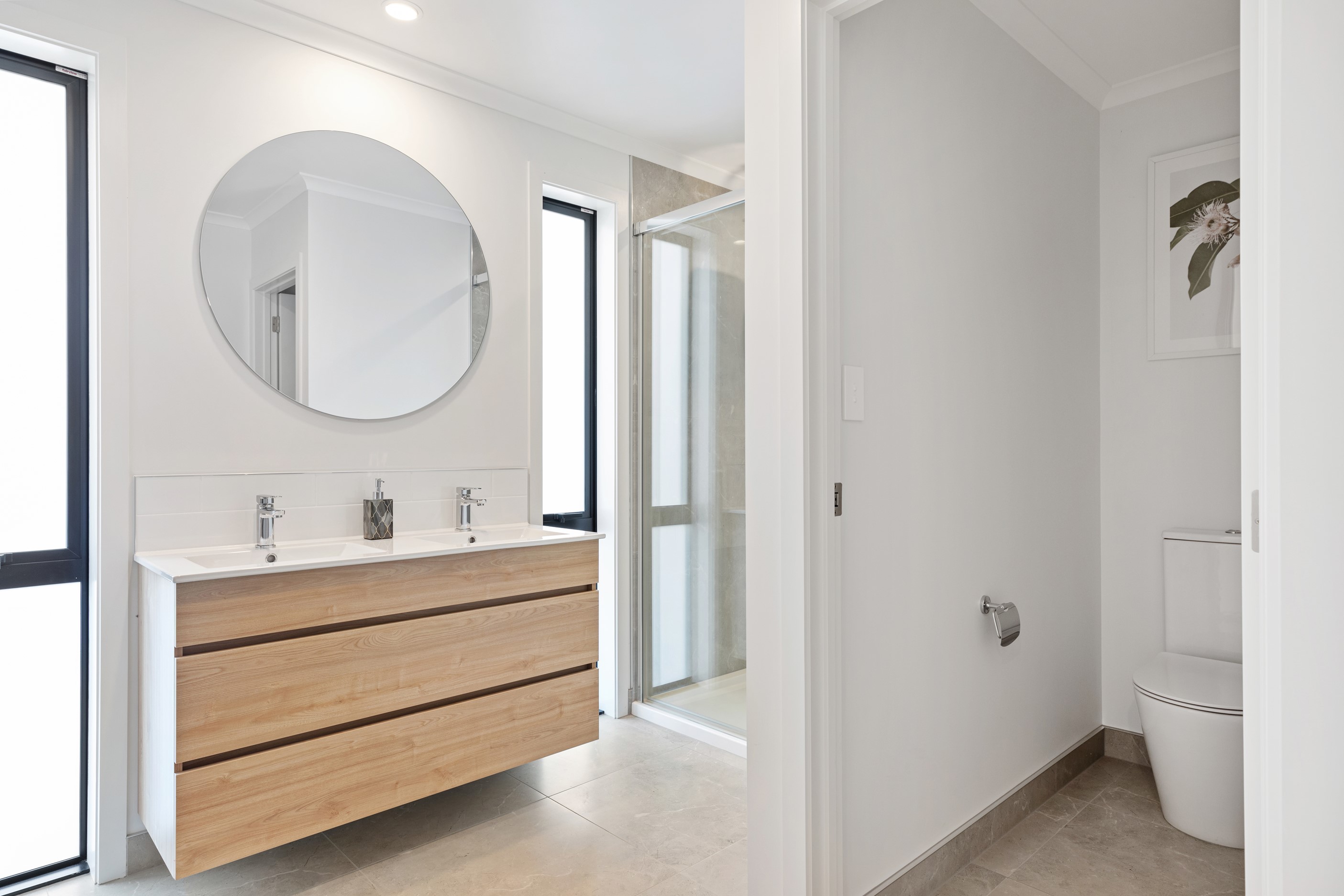 A house with presence was required as Jennian’s shopfront and show home. Located on busy Fifteenth Ave, it needed to appeal to past, current and prospective clients, as well as provide office space and parking for the franchise. Rising up from the land is this bold 218sqm home clad in Linea weatherboard and topped with tiles. Immediately striking from the street are the varied rooflines and postbox-red front door. Inside, home buyers can inspect Jennian’s standard fittings, as well as upgrade options. To illustrate the point: the main bathroom is straight from the plans, while the ensuite has been given special treatment. Whether standard or upgraded, design features abound– the timber staircase has a floor-to-ceiling timber screen, a covered patio is accessed through stacking doors and a feature pendant light illuminates the stairwell. Downstairs is all about relaxed living in the L-shaped open-plan dining, lounge and kitchen zone. The latter has a scullery, which connects directly to the double garage – ideal for unpacking groceries. You’ll find four roomy bedrooms upstairs, plus a family bathroom, main bedroom ensuite and toilets. There’s presence aplenty here, and also serious panache.
