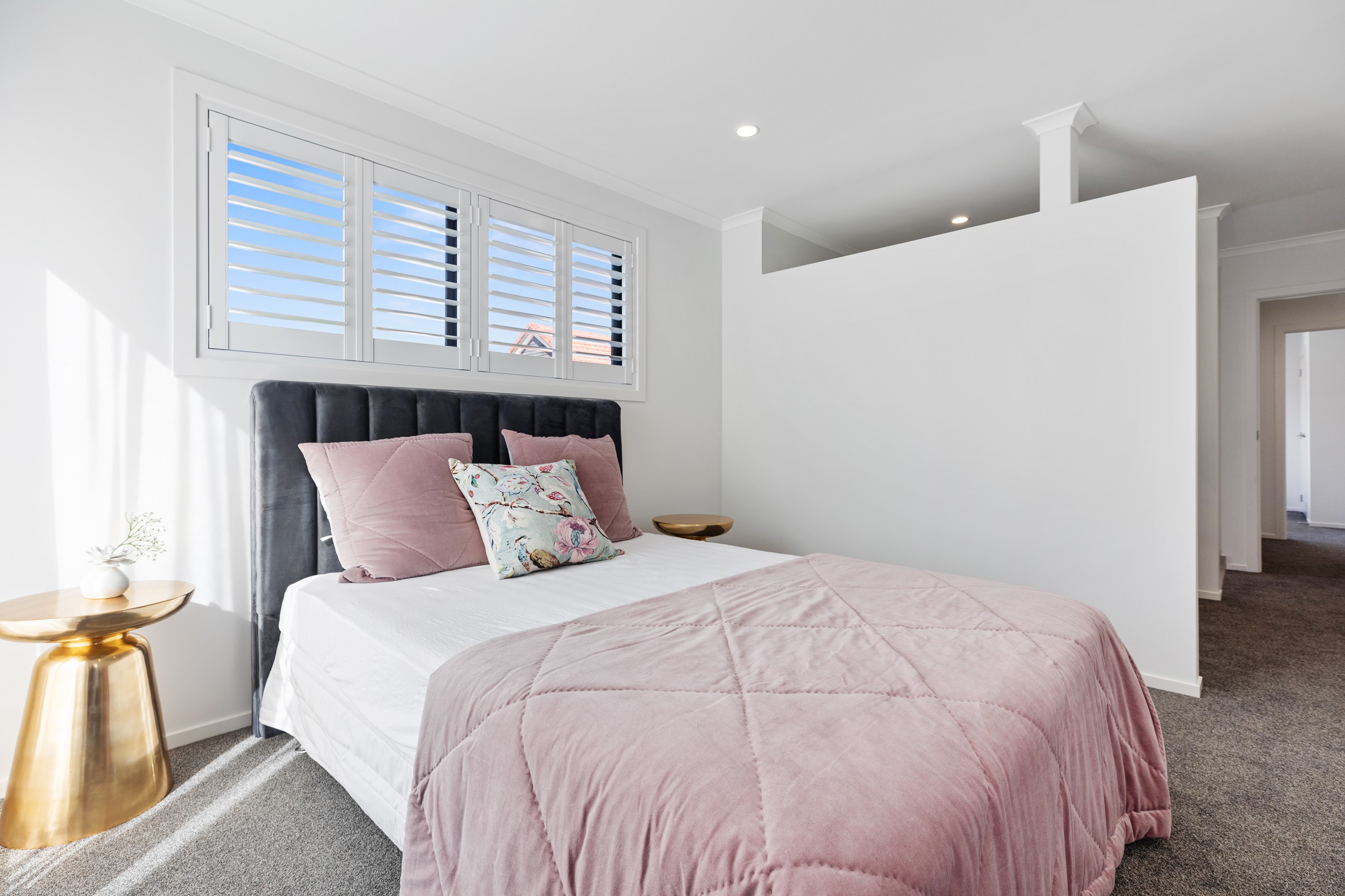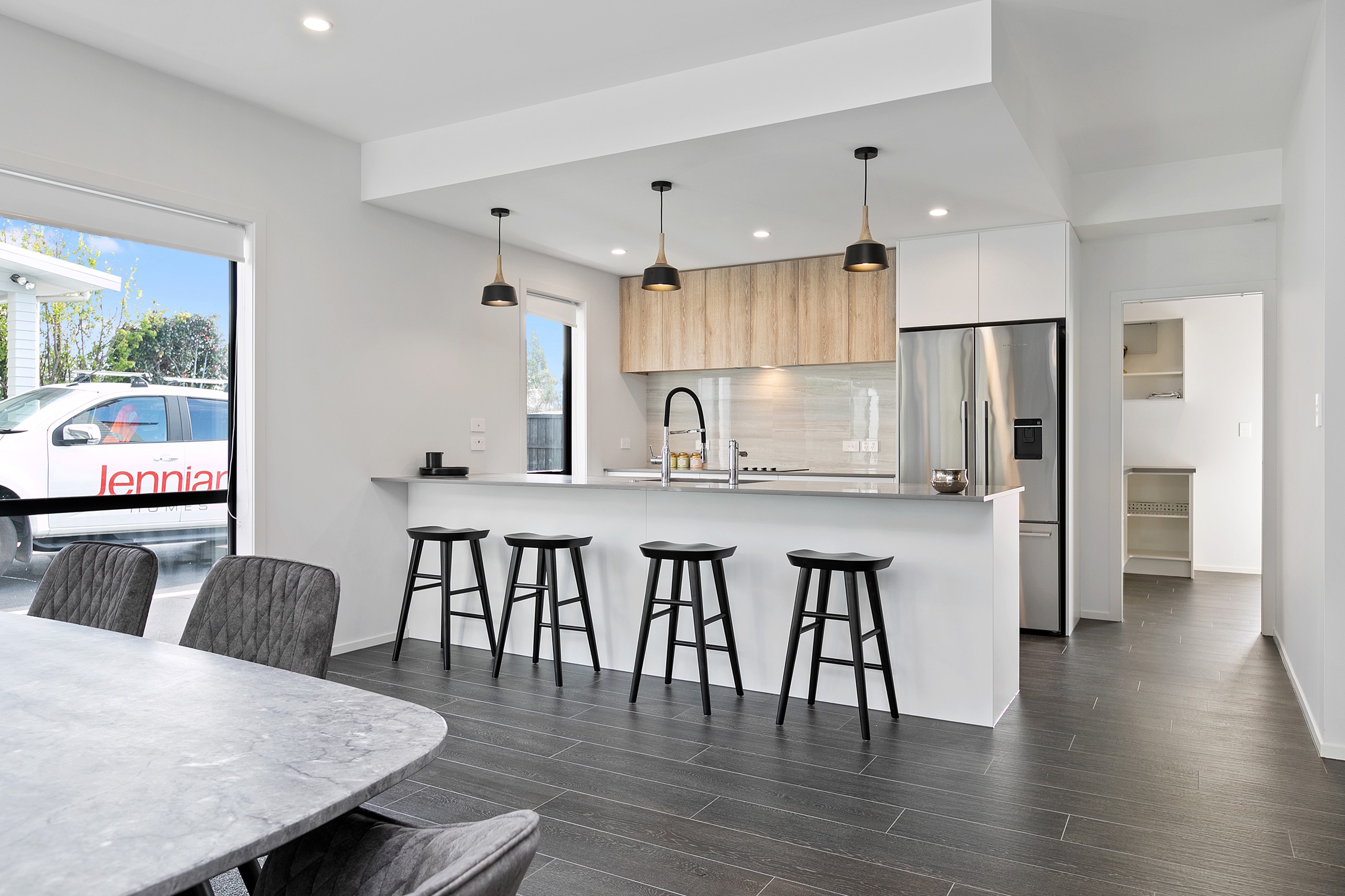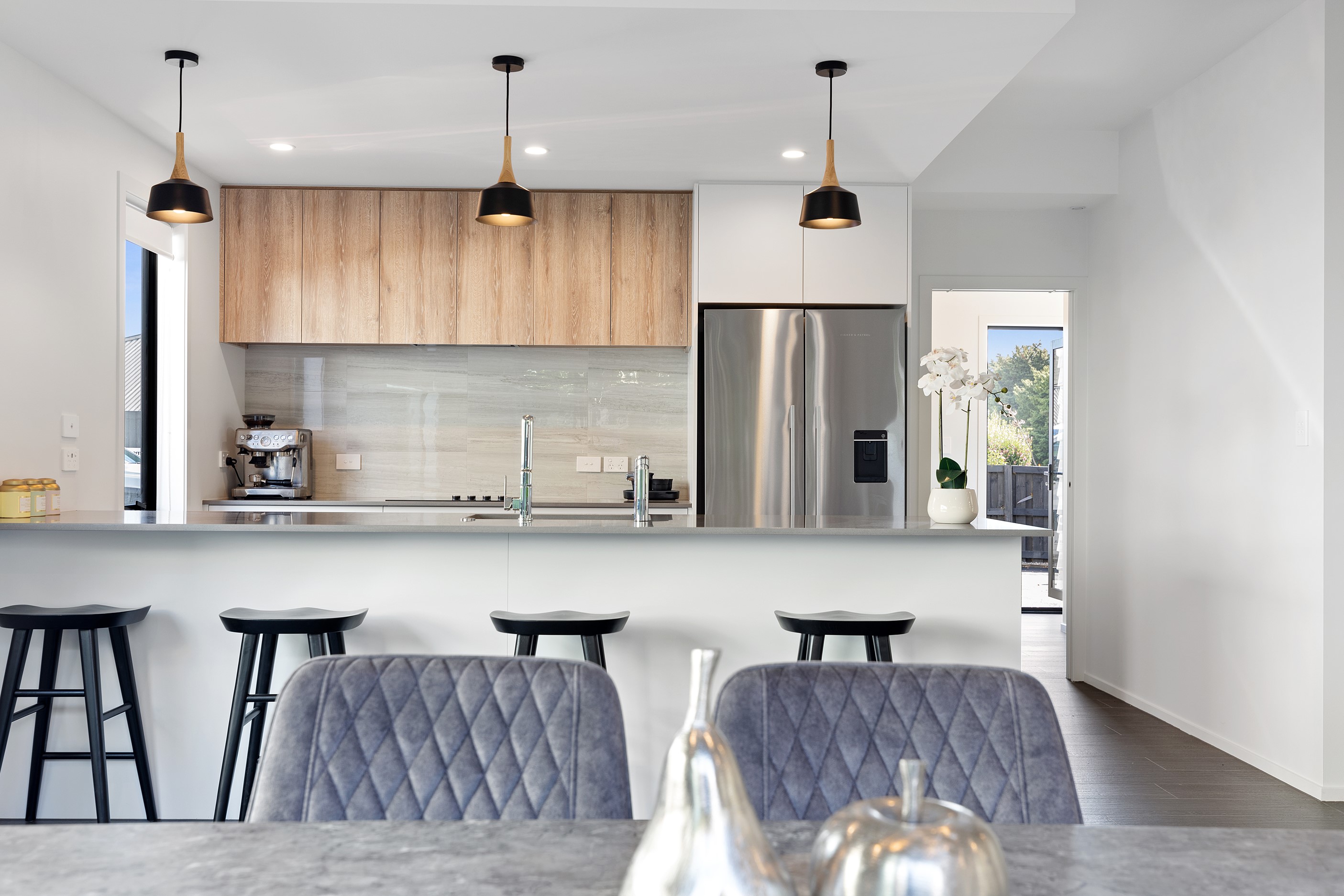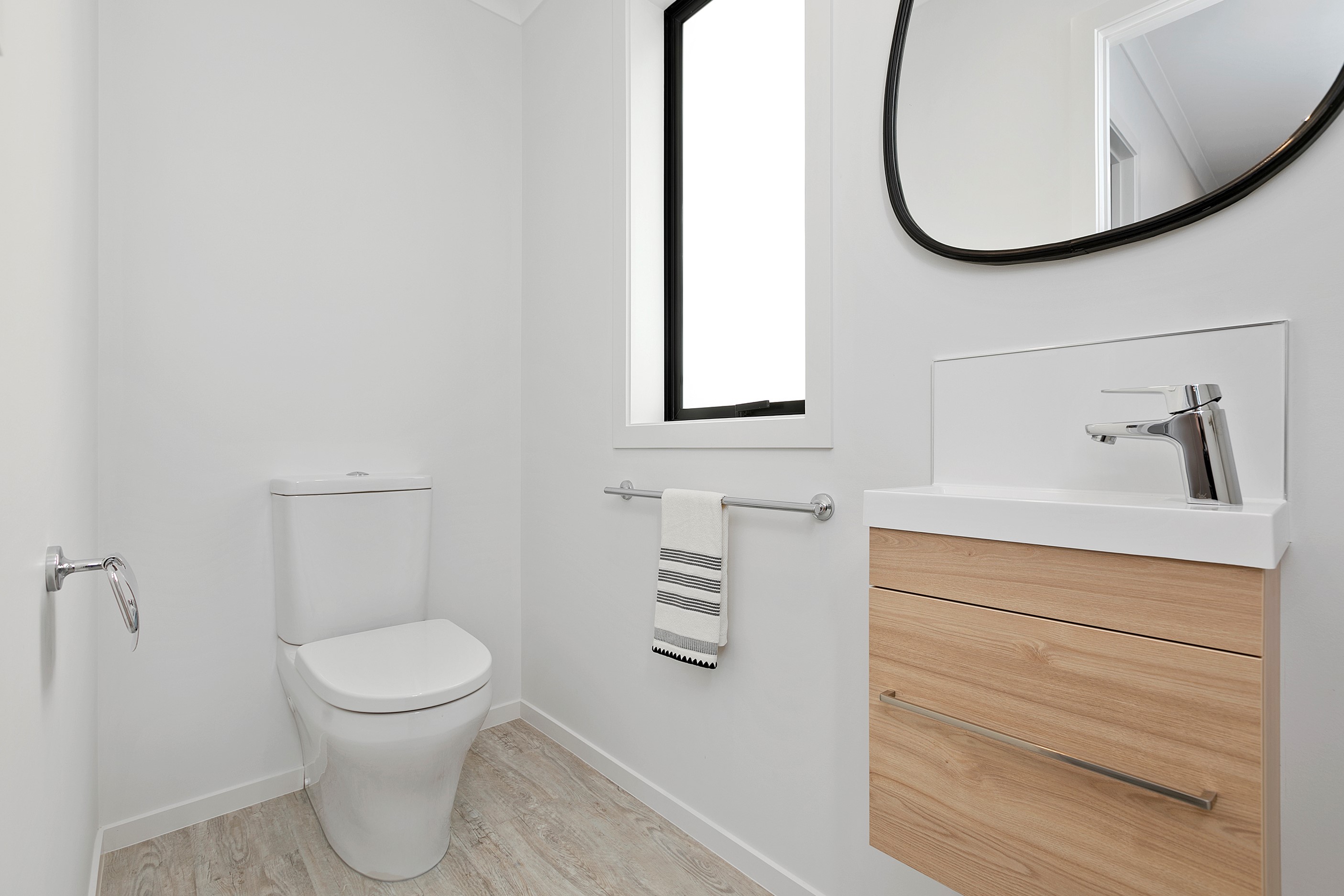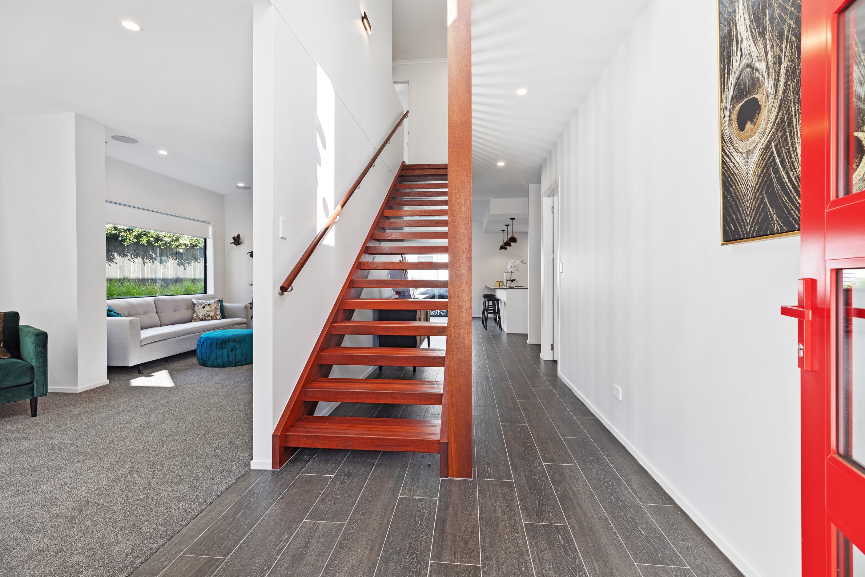 A house with presence was required as Jennian’s shopfront and show home. Located on busy Fifteenth Ave, it needed to appeal to past, current and prospective clients, as well as provide office space and parking for the franchise. Rising up from the land is this bold 218sqm home clad in Linea weatherboard and topped with tiles. Immediately striking from the street are the varied rooflines and postbox-red front door. Inside, home buyers can inspect Jennian’s standard fittings, as well as upgrade options. To illustrate the point: the main bathroom is straight from the plans, while the ensuite has been given special treatment. Whether standard or upgraded, design features abound– the timber staircase has a floor-to-ceiling timber screen, a covered patio is accessed through stacking doors and a feature pendant light illuminates the stairwell. Downstairs is all about relaxed living in the L-shaped open-plan dining, lounge and kitchen zone. The latter has a scullery, which connects directly to the double garage – ideal for unpacking groceries. You’ll find four roomy bedrooms upstairs, plus a family bathroom, main bedroom ensuite and toilets. There’s presence aplenty here, and also serious panache.