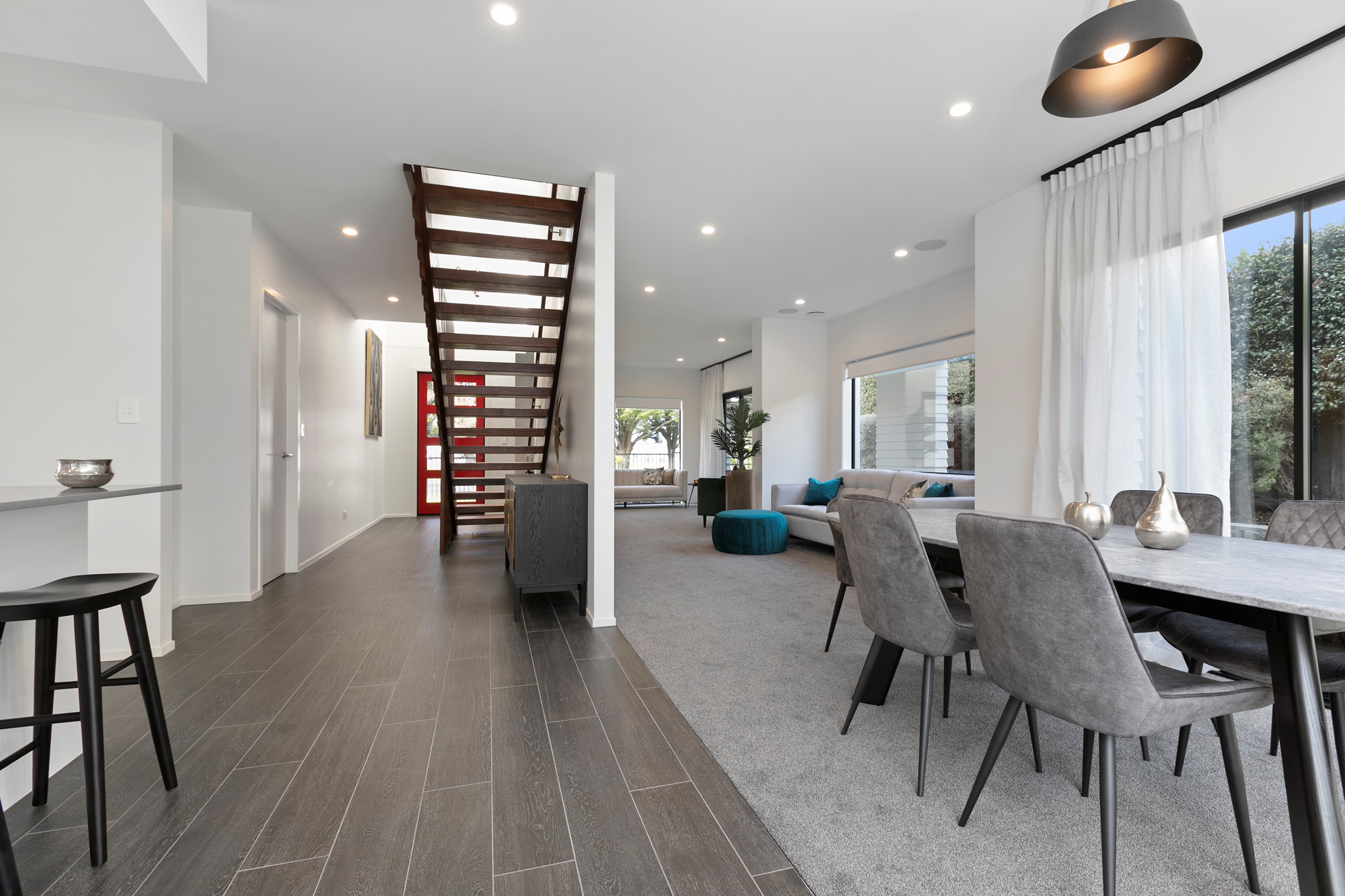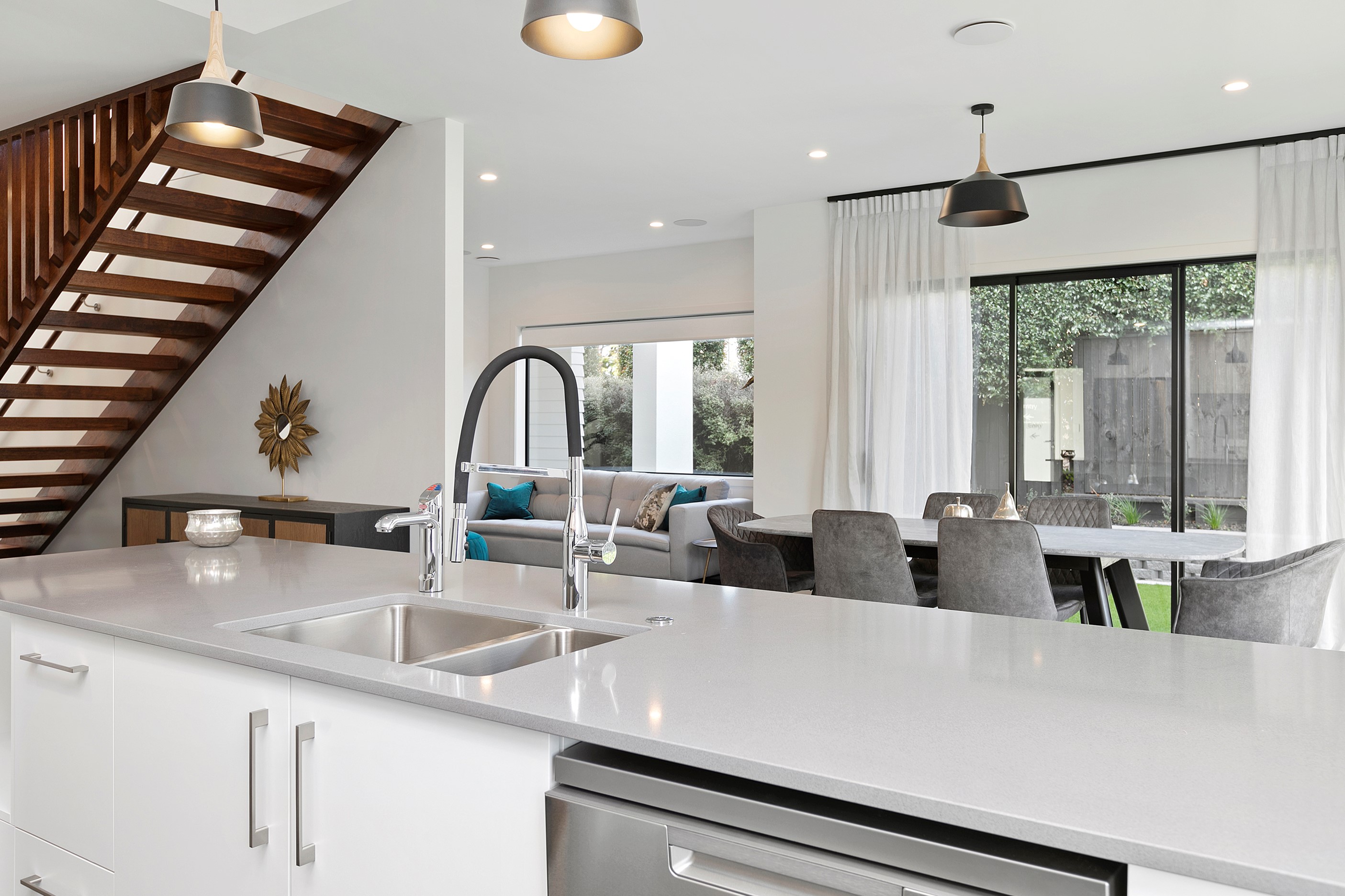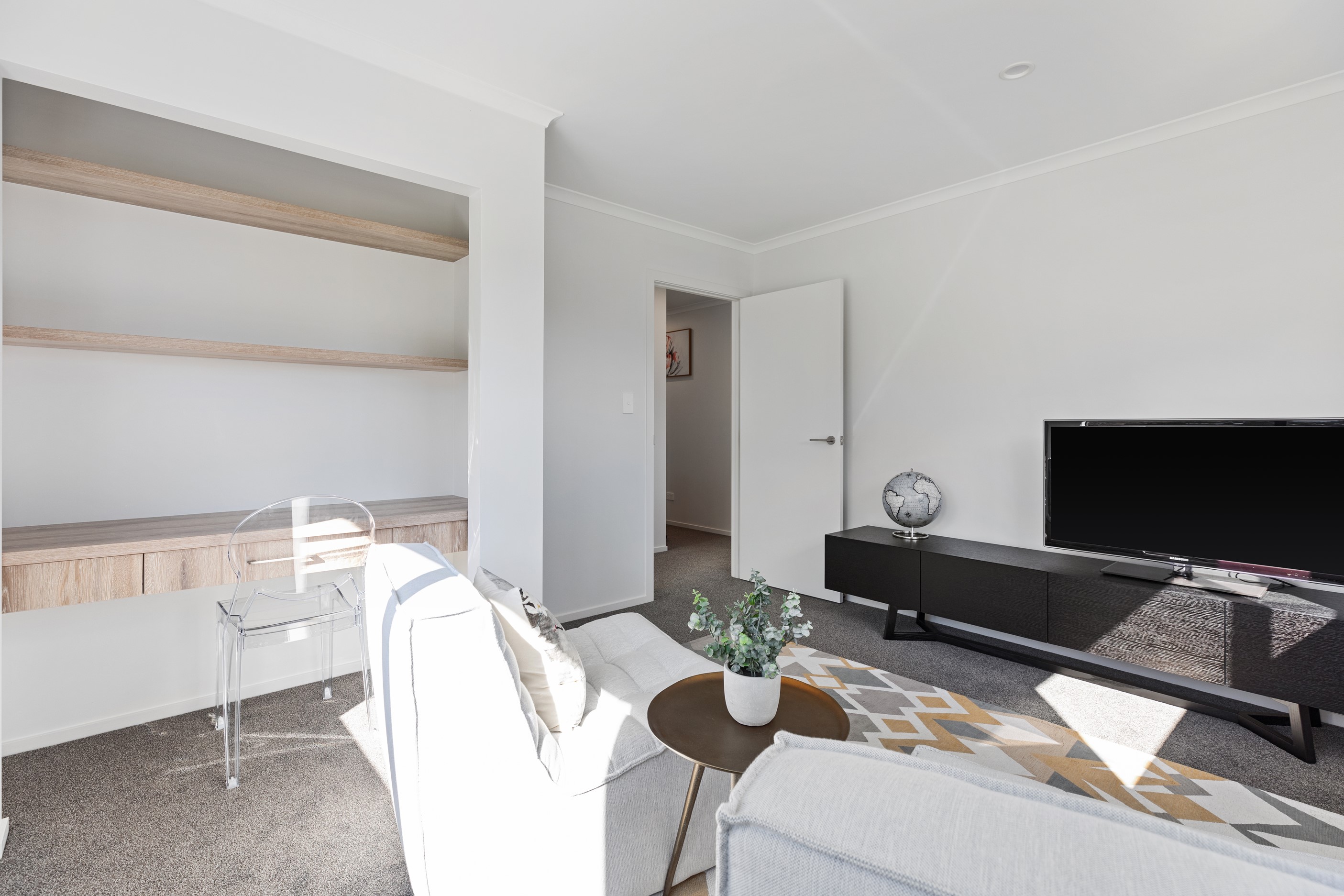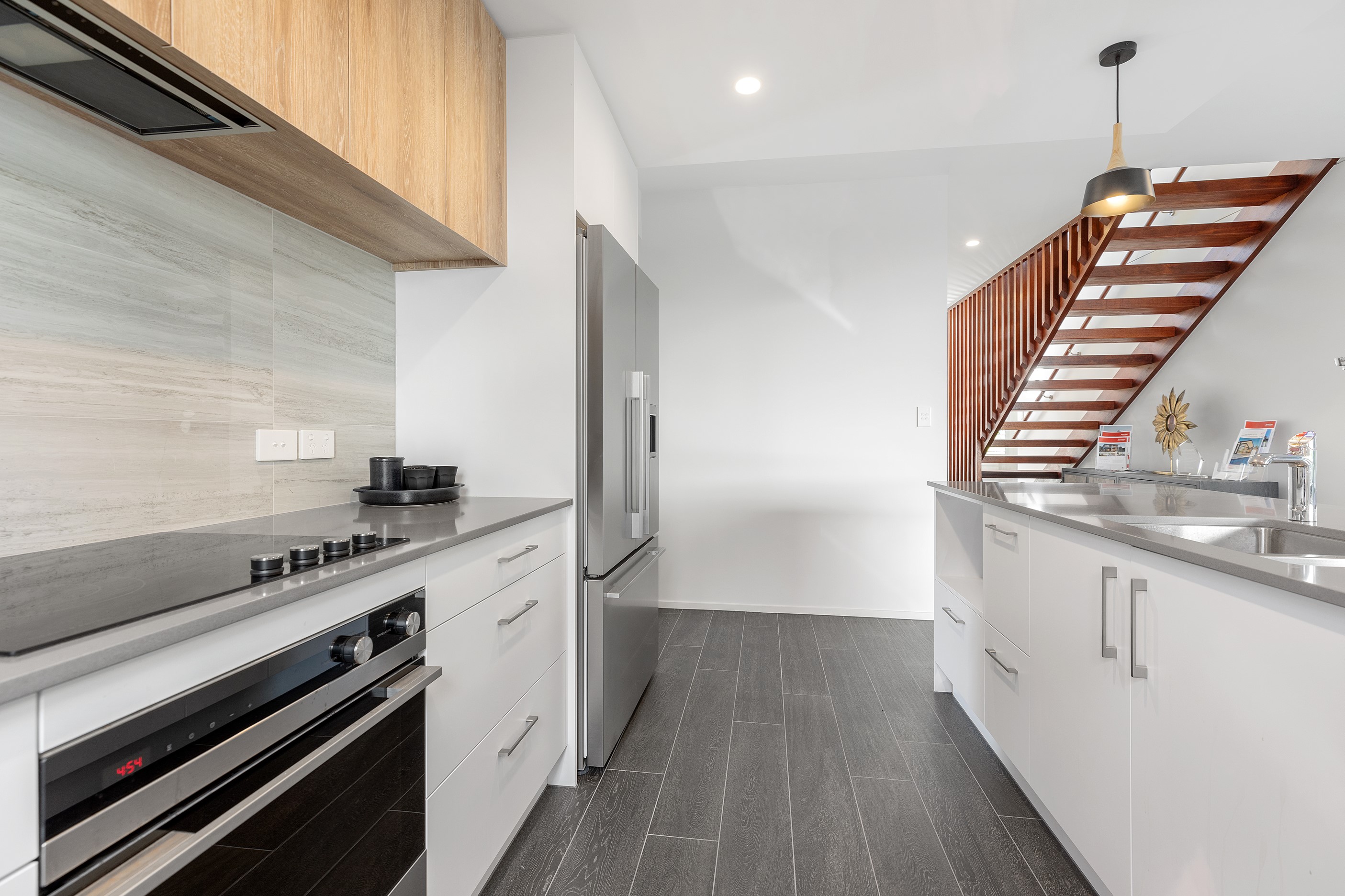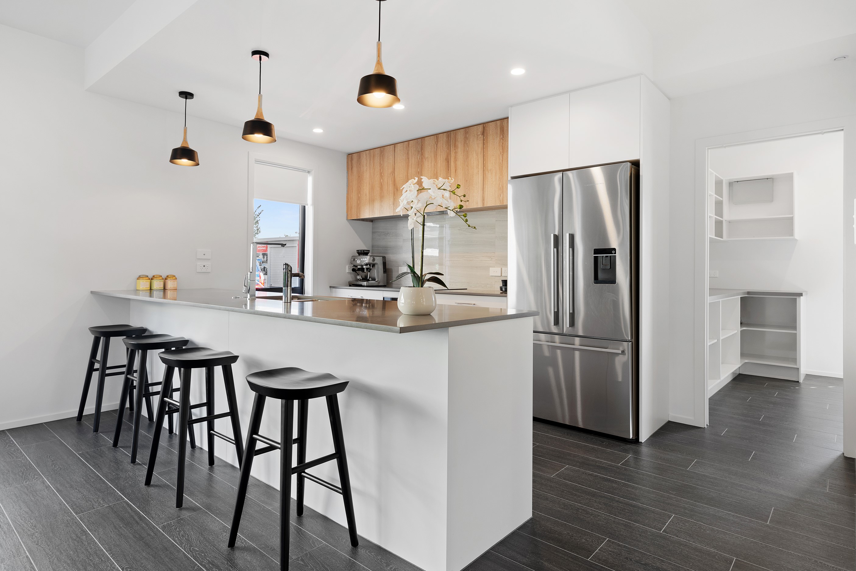 A house with presence was required as Jennian’s shopfront and show home. Located on busy Fifteenth Ave, it needed to appeal to past, current and prospective clients, as well as provide office space and parking for the franchise. Rising up from the land is this bold 218sqm home clad in Linea weatherboard and topped with tiles. Immediately striking from the street are the varied rooflines and postbox-red front door. Inside, home buyers can inspect Jennian’s standard fittings, as well as upgrade options. To illustrate the point: the main bathroom is straight from the plans, while the ensuite has been given special treatment. Whether standard or upgraded, design features abound– the timber staircase has a floor-to-ceiling timber screen, a covered patio is accessed through stacking doors and a feature pendant light illuminates the stairwell. Downstairs is all about relaxed living in the L-shaped open-plan dining, lounge and kitchen zone. The latter has a scullery, which connects directly to the double garage – ideal for unpacking groceries. You’ll find four roomy bedrooms upstairs, plus a family bathroom, main bedroom ensuite and toilets. There’s presence aplenty here, and also serious panache.