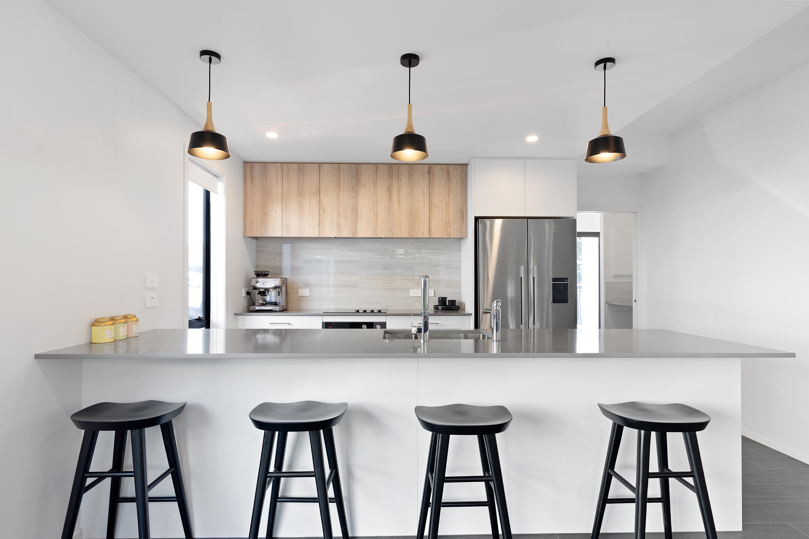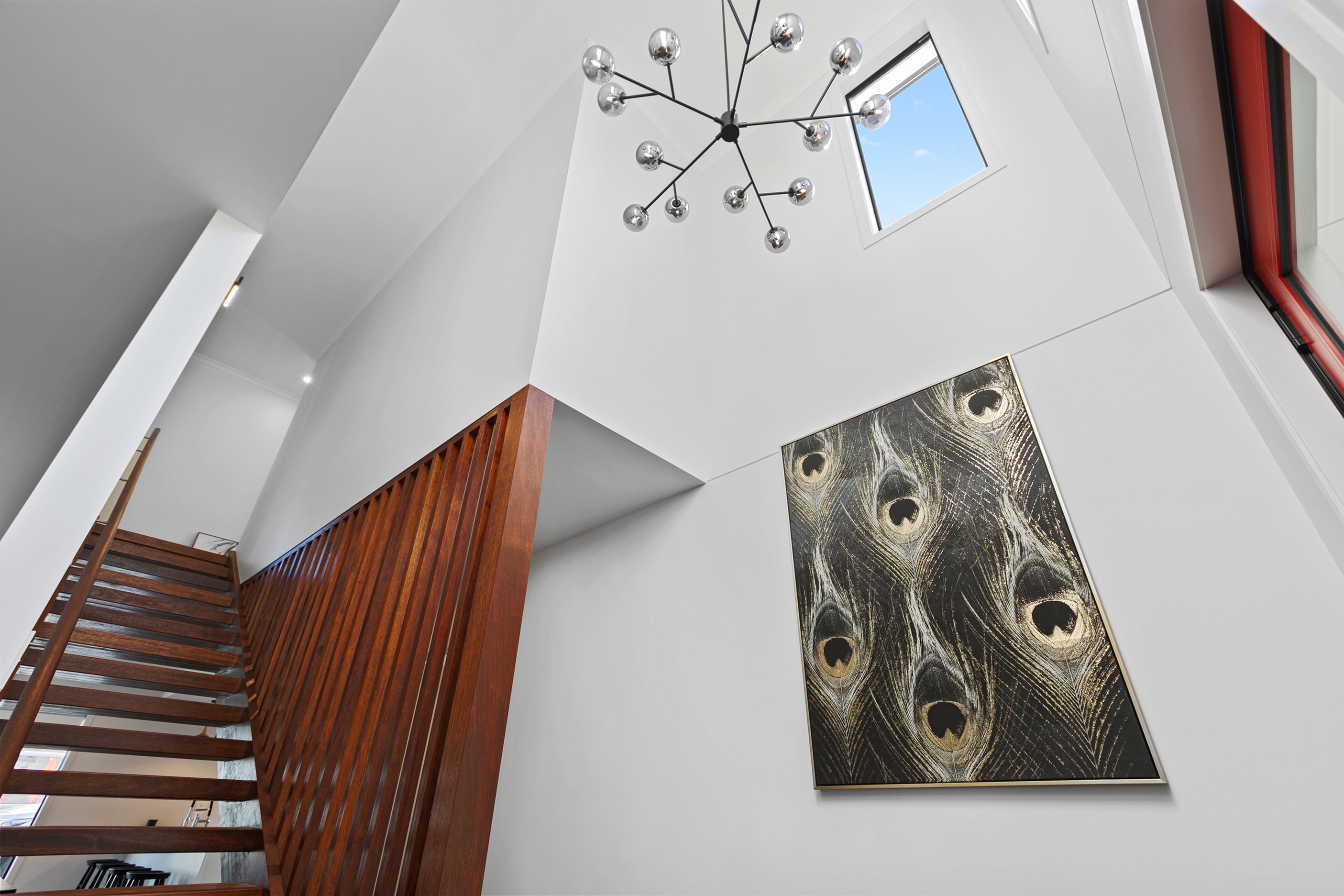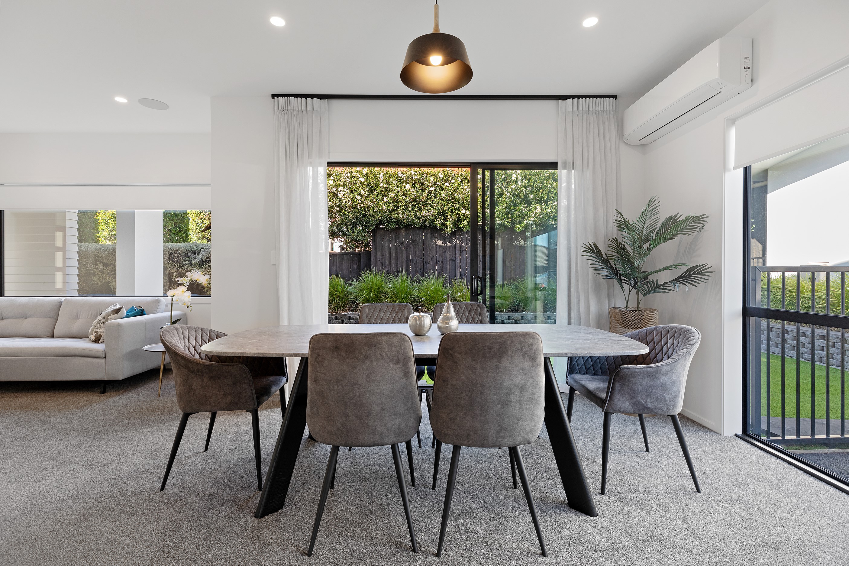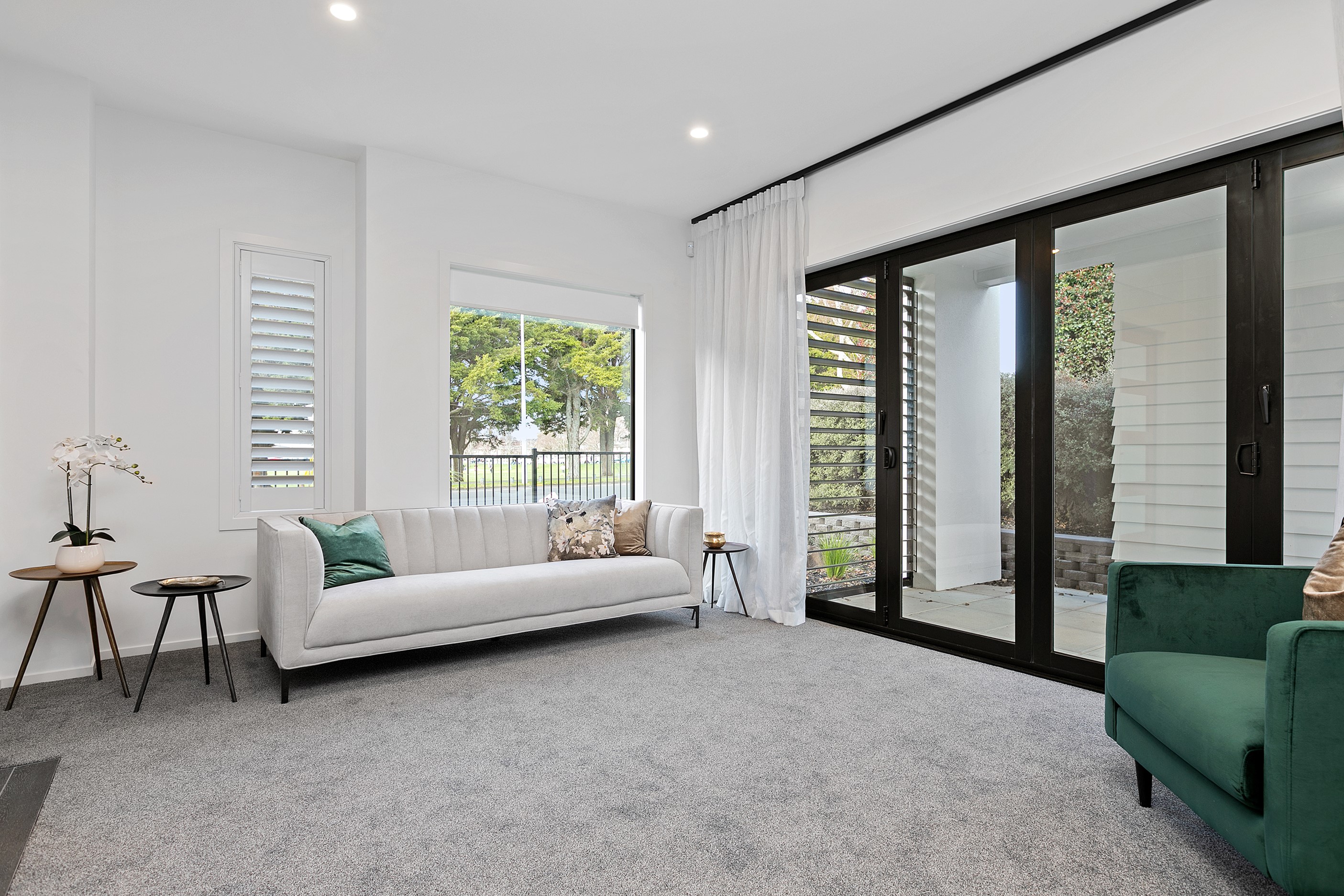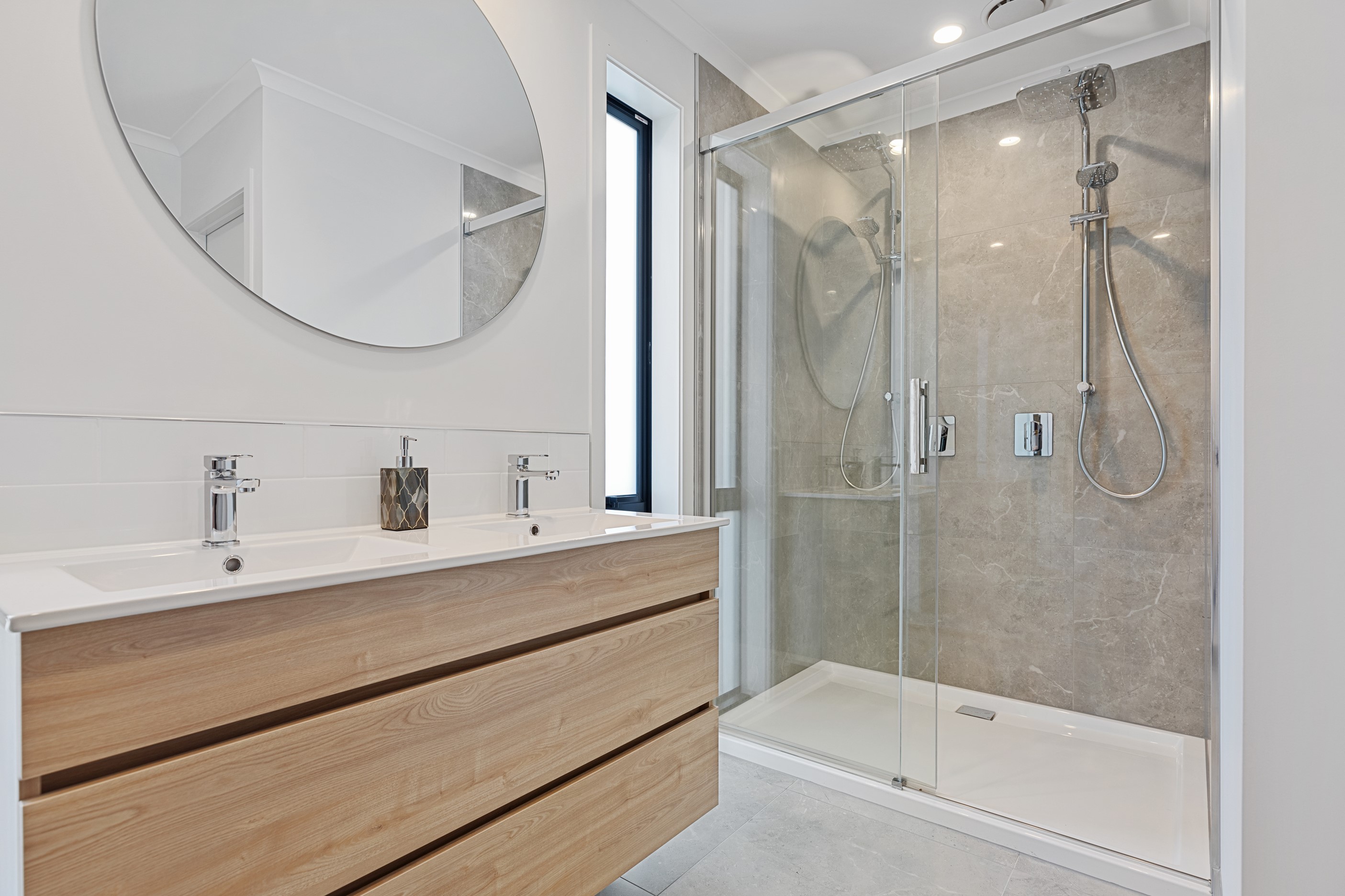 A house with presence was required as Jennian’s shopfront and show home. Located on busy Fifteenth Ave, it needed to appeal to past, current and prospective clients, as well as provide office space and parking for the franchise. Rising up from the land is this bold 218sqm home clad in Linea weatherboard and topped with tiles. Immediately striking from the street are the varied rooflines and postbox-red front door. Inside, home buyers can inspect Jennian’s standard fittings, as well as upgrade options. To illustrate the point: the main bathroom is straight from the plans, while the ensuite has been given special treatment. Whether standard or upgraded, design features abound– the timber staircase has a floor-to-ceiling timber screen, a covered patio is accessed through stacking doors and a feature pendant light illuminates the stairwell. Downstairs is all about relaxed living in the L-shaped open-plan dining, lounge and kitchen zone. The latter has a scullery, which connects directly to the double garage – ideal for unpacking groceries. You’ll find four roomy bedrooms upstairs, plus a family bathroom, main bedroom ensuite and toilets. There’s presence aplenty here, and also serious panache.