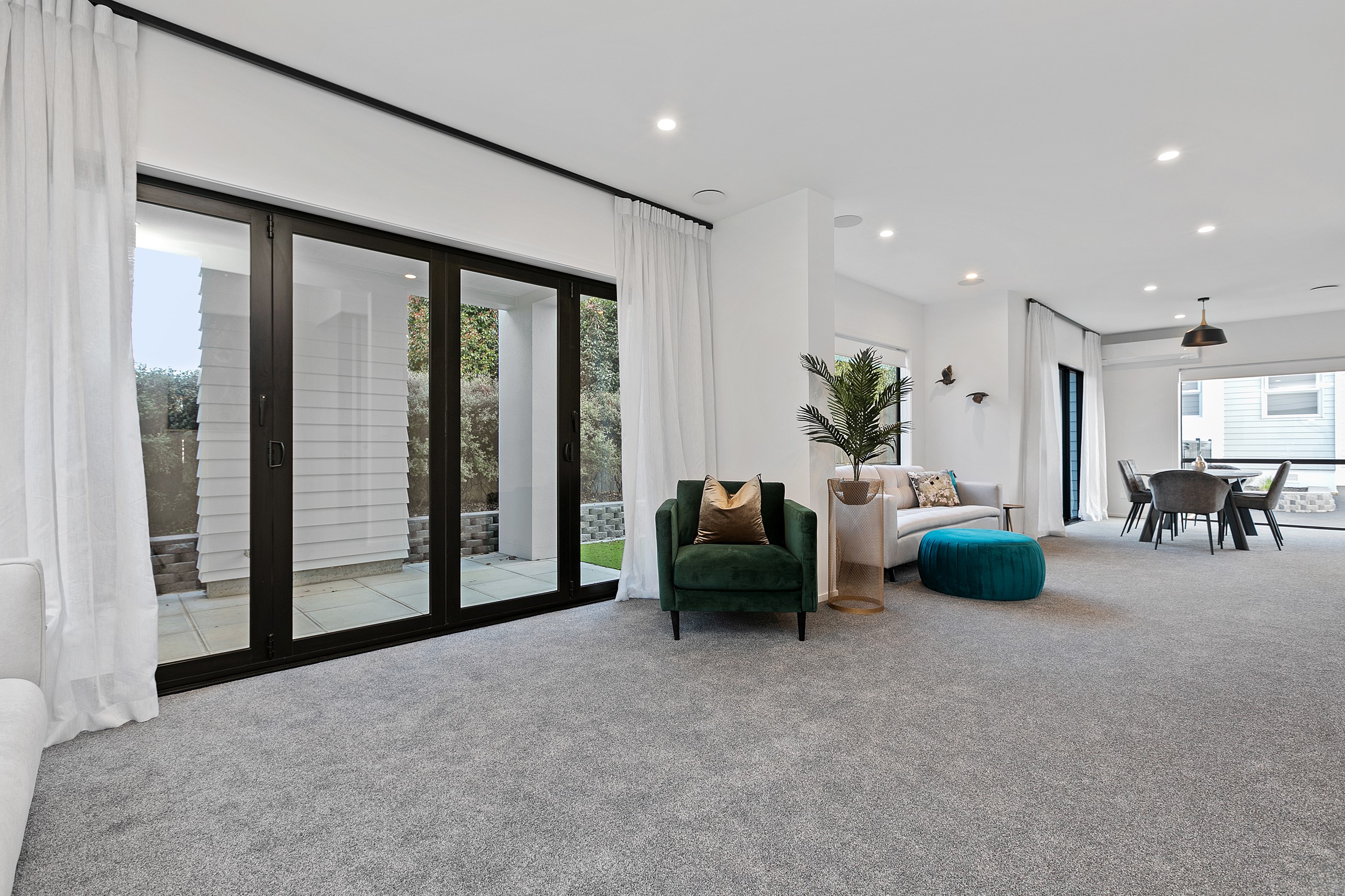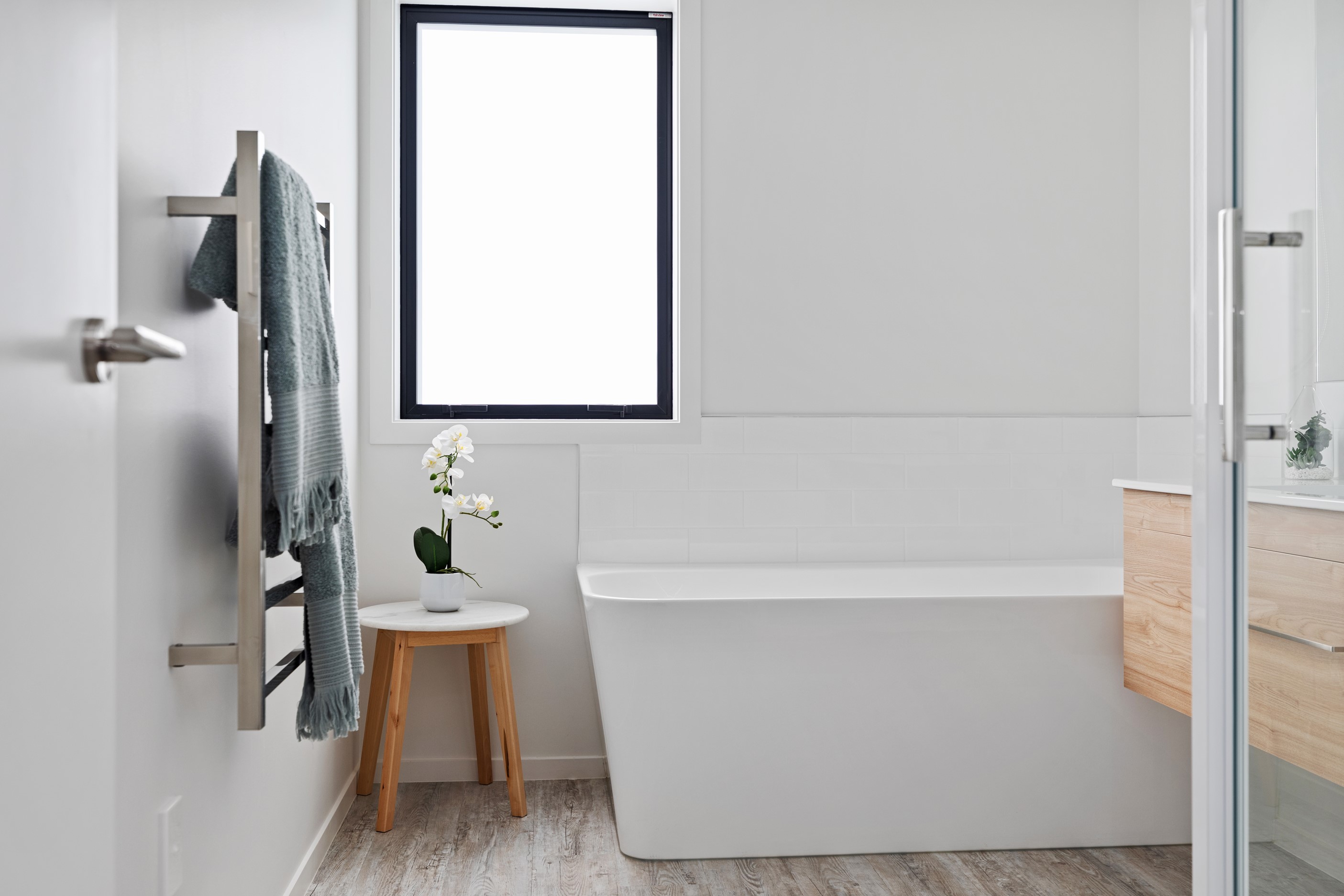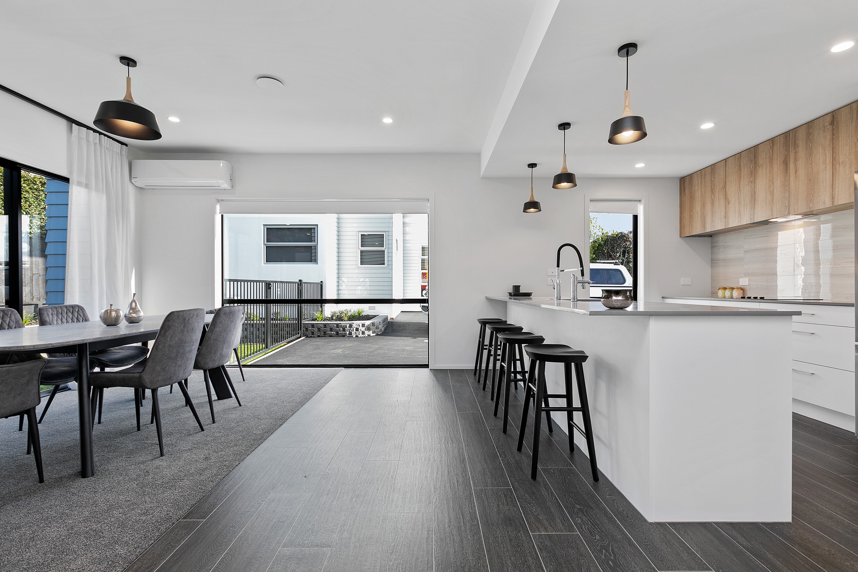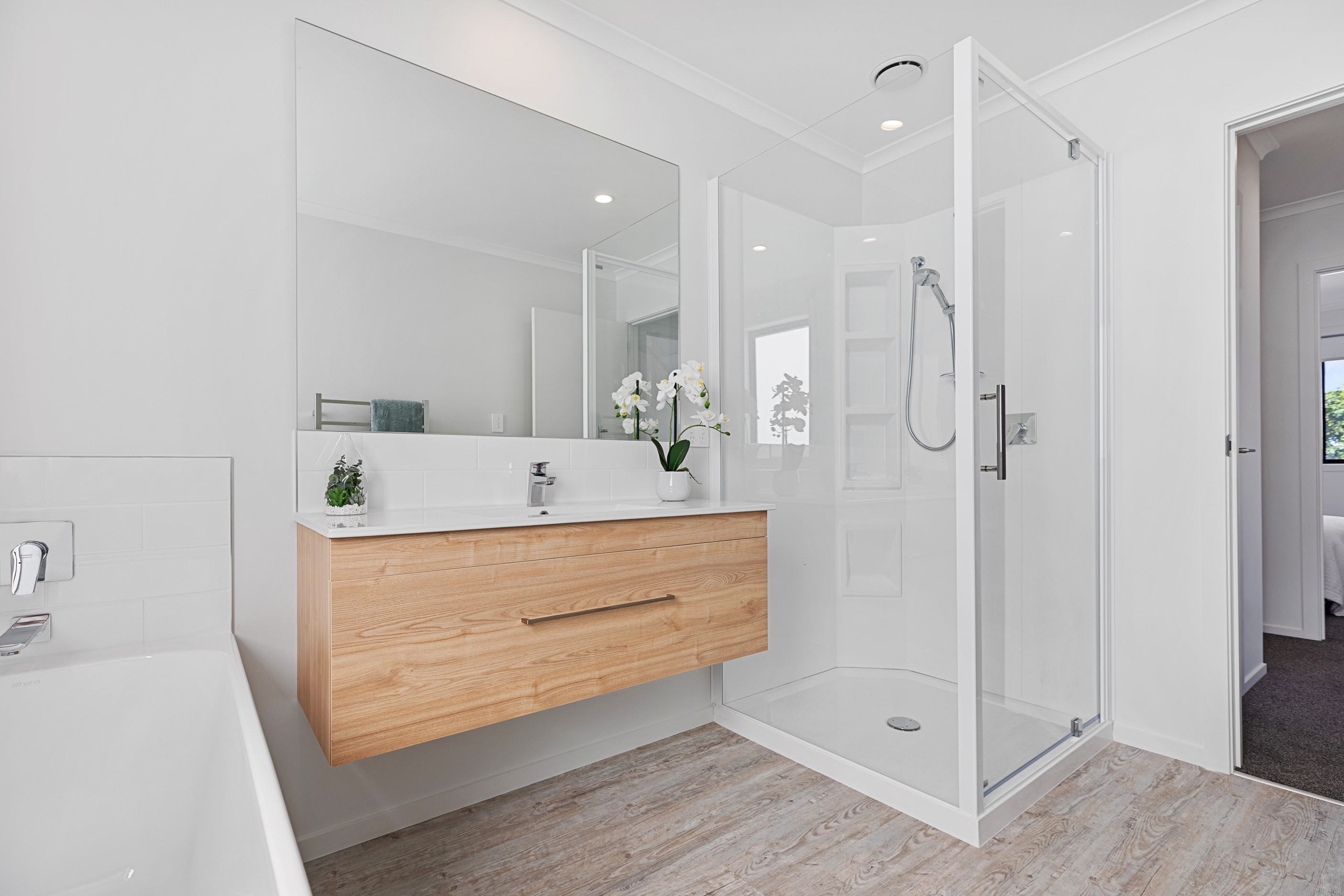 A house with presence was required as Jennian’s shopfront and show home. Located on busy Fifteenth Ave, it needed to appeal to past, current and prospective clients, as well as provide office space and parking for the franchise. Rising up from the land is this bold 218sqm home clad in Linea weatherboard and topped with tiles. Immediately striking from the street are the varied rooflines and postbox-red front door. Inside, home buyers can inspect Jennian’s standard fittings, as well as upgrade options. To illustrate the point: the main bathroom is straight from the plans, while the ensuite has been given special treatment. Whether standard or upgraded, design features abound– the timber staircase has a floor-to-ceiling timber screen, a covered patio is accessed through stacking doors and a feature pendant light illuminates the stairwell. Downstairs is all about relaxed living in the L-shaped open-plan dining, lounge and kitchen zone. The latter has a scullery, which connects directly to the double garage – ideal for unpacking groceries. You’ll find four roomy bedrooms upstairs, plus a family bathroom, main bedroom ensuite and toilets. There’s presence aplenty here, and also serious panache.